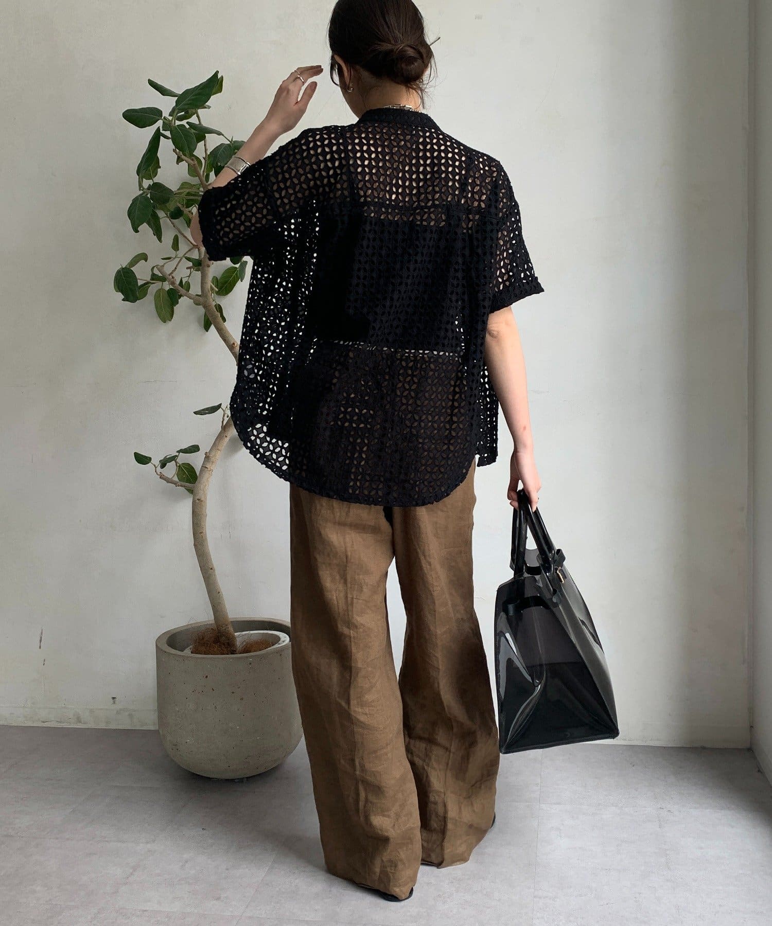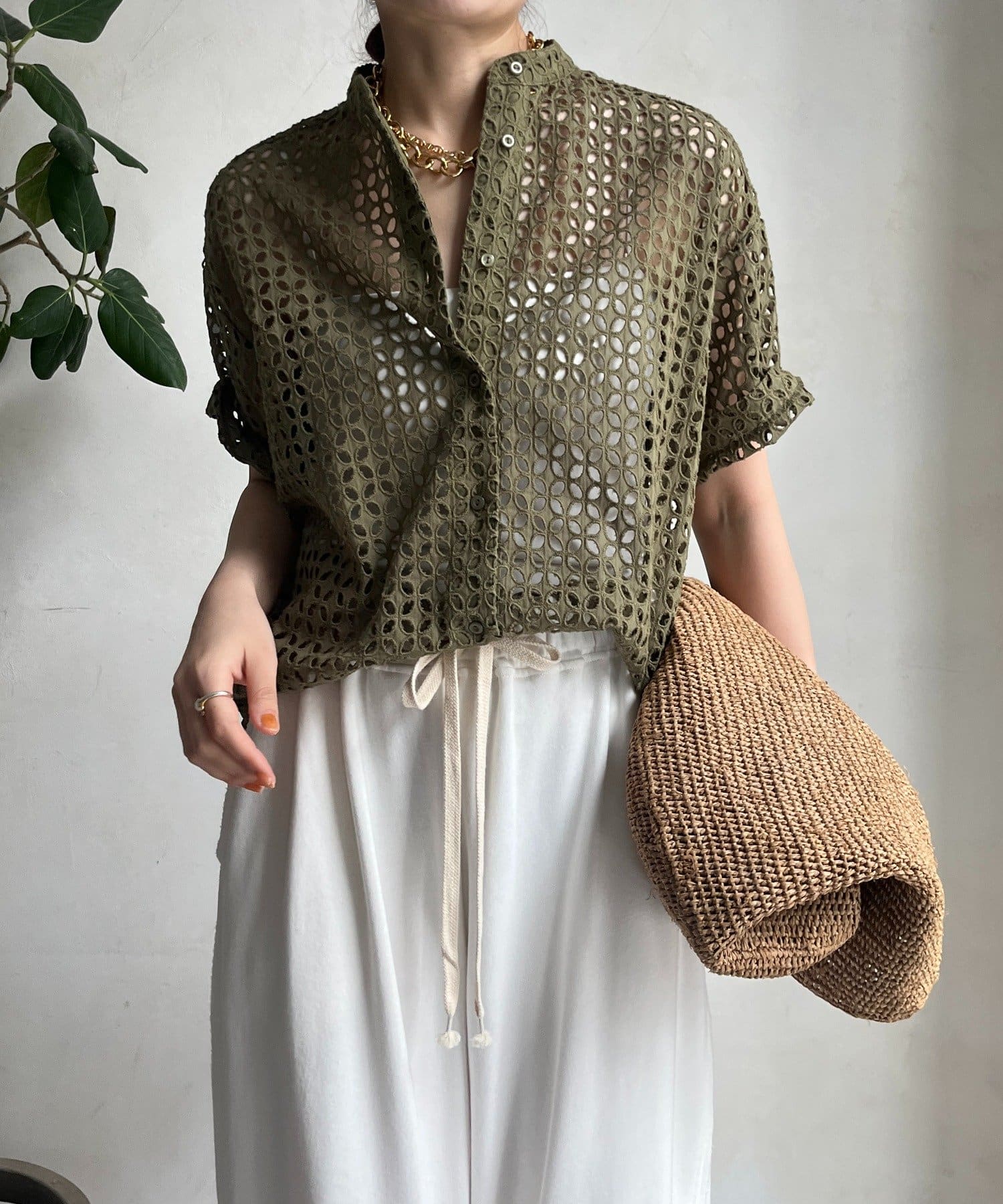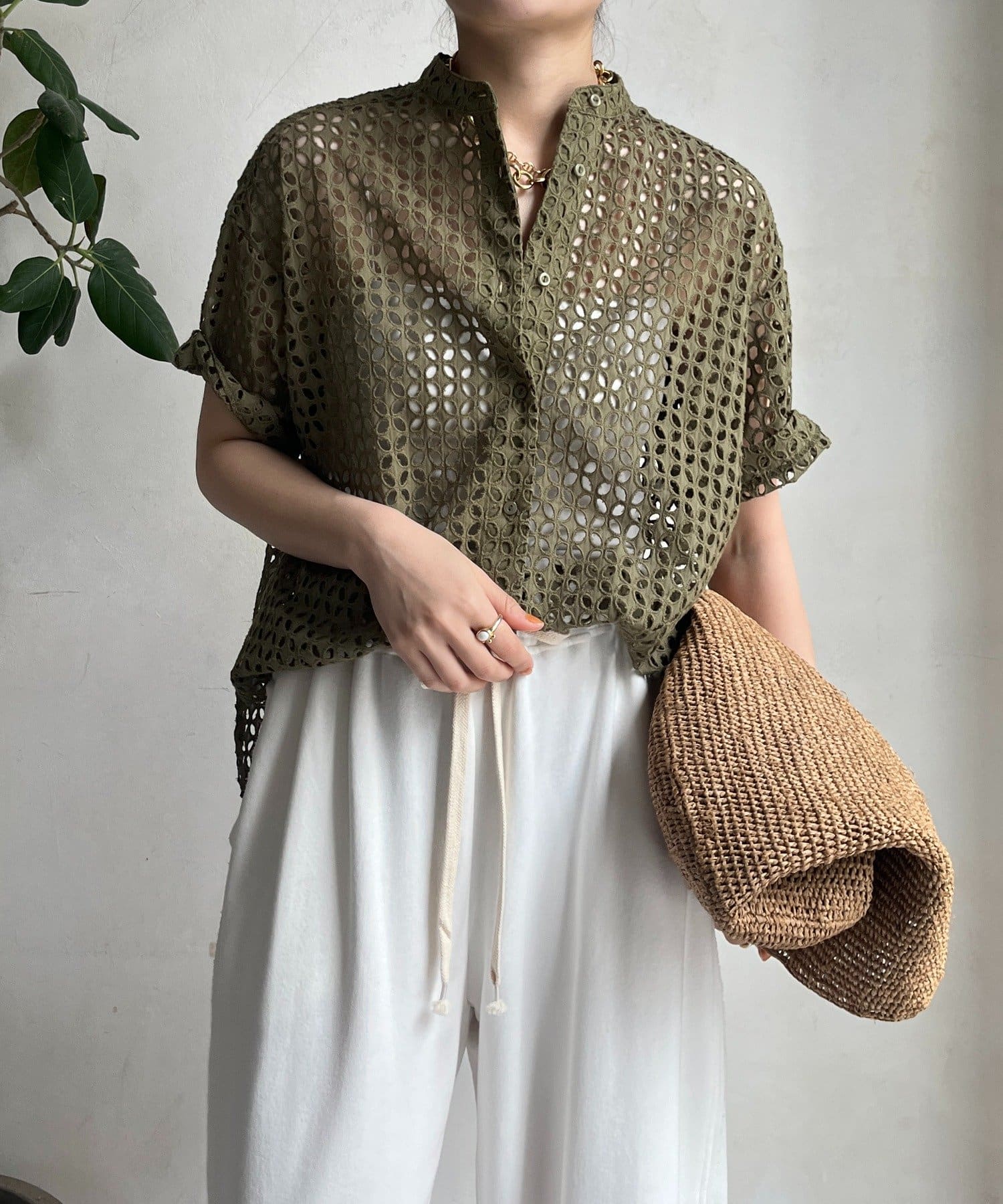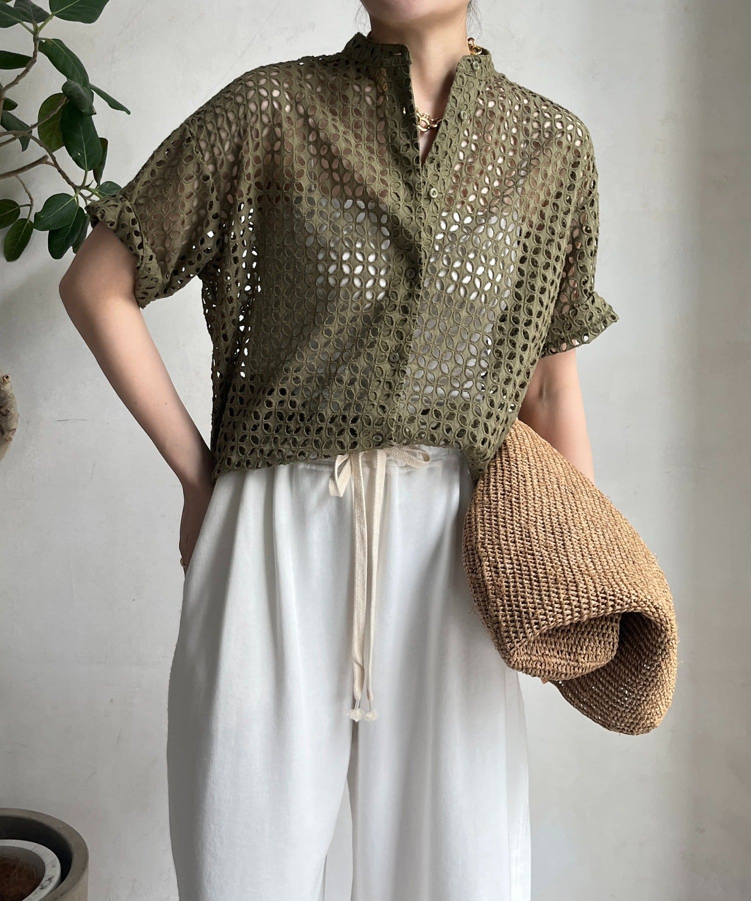 まるでアンティークレースのような繊細なカットワークが目を惹く、ハーフスリーブシャツ。