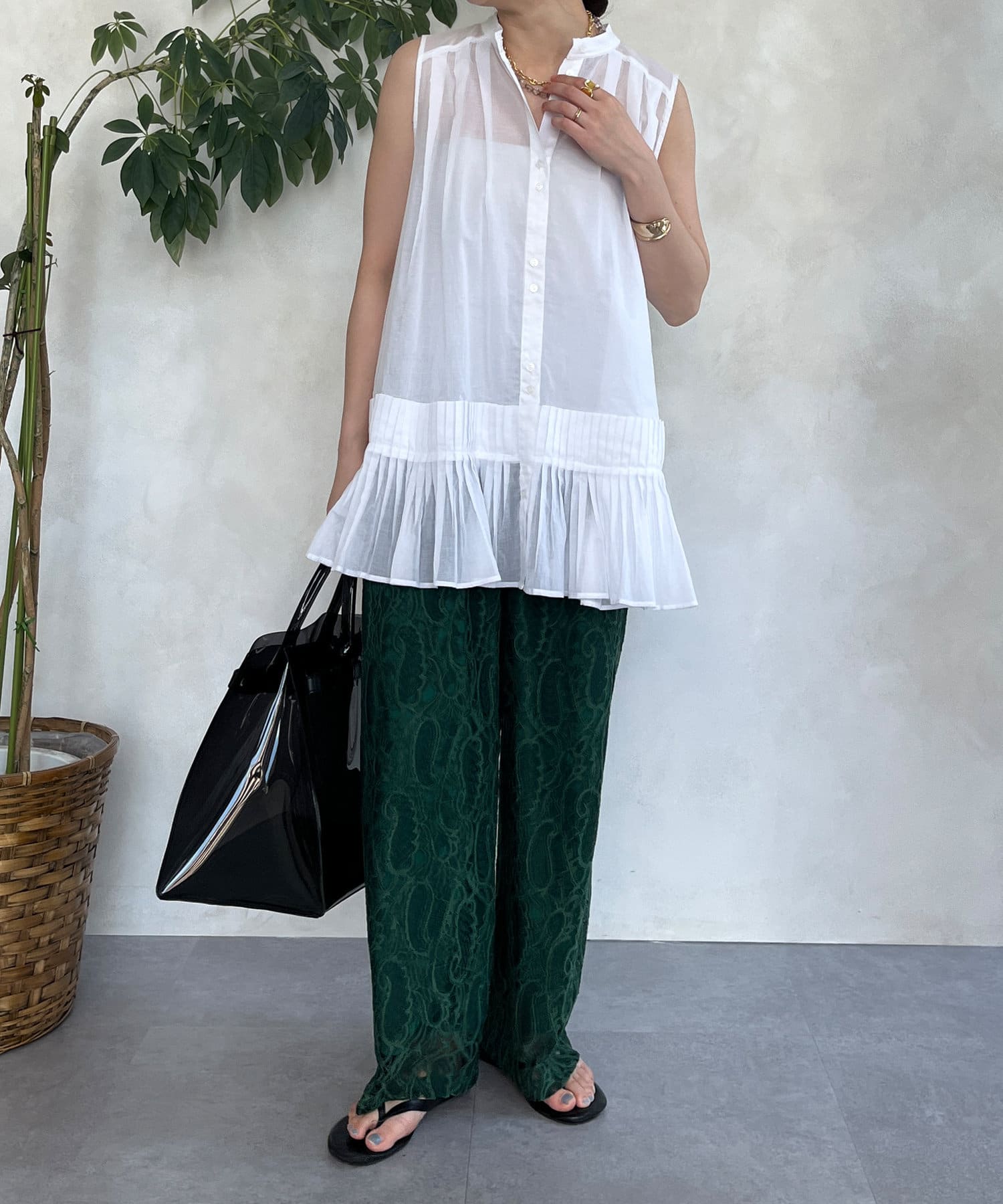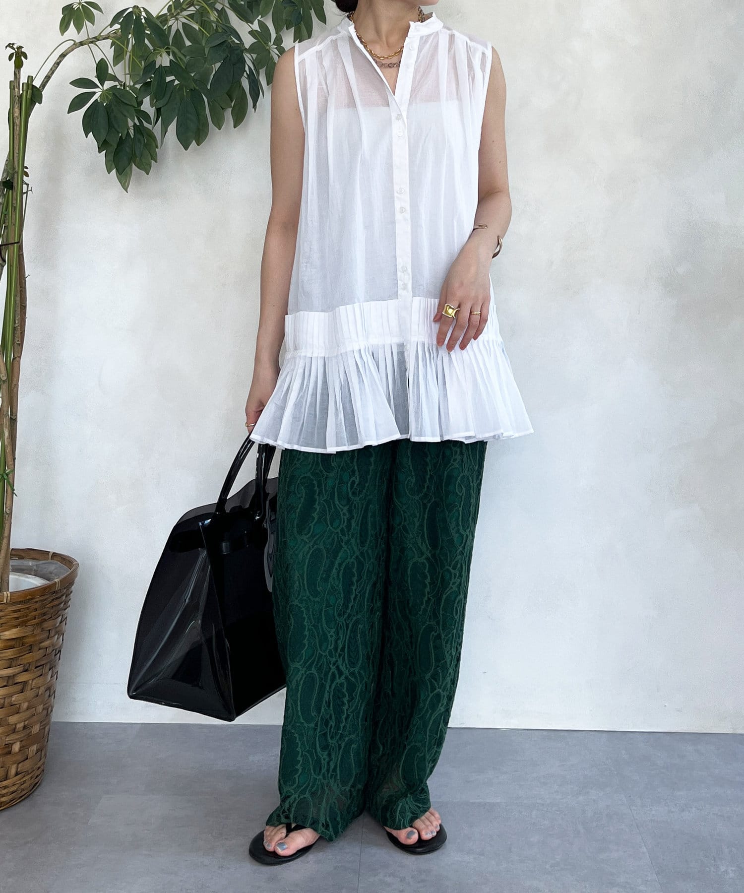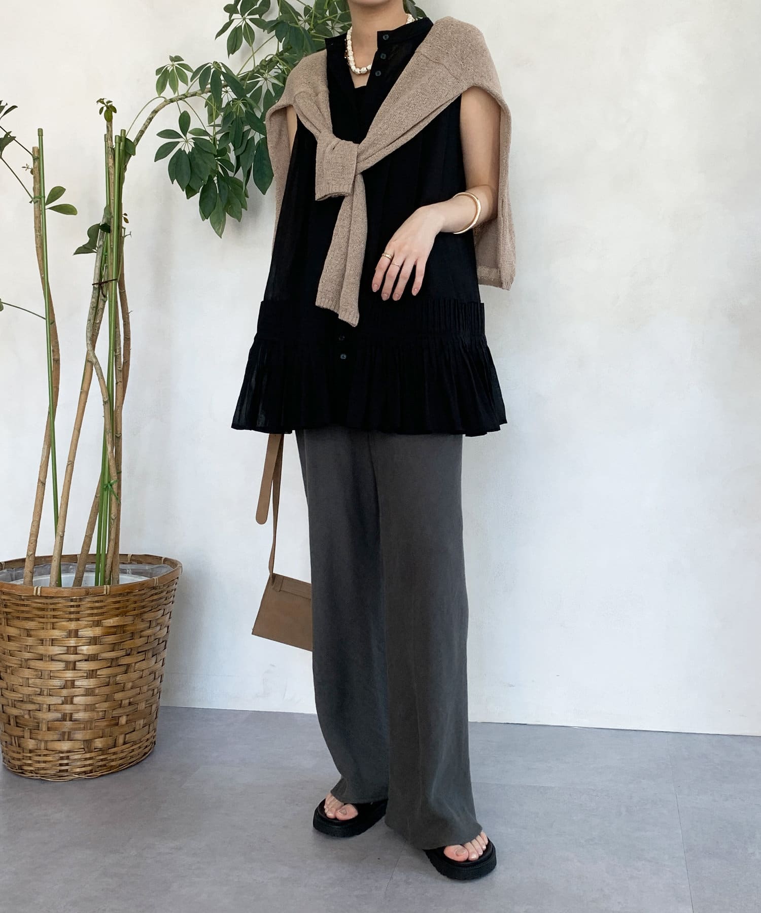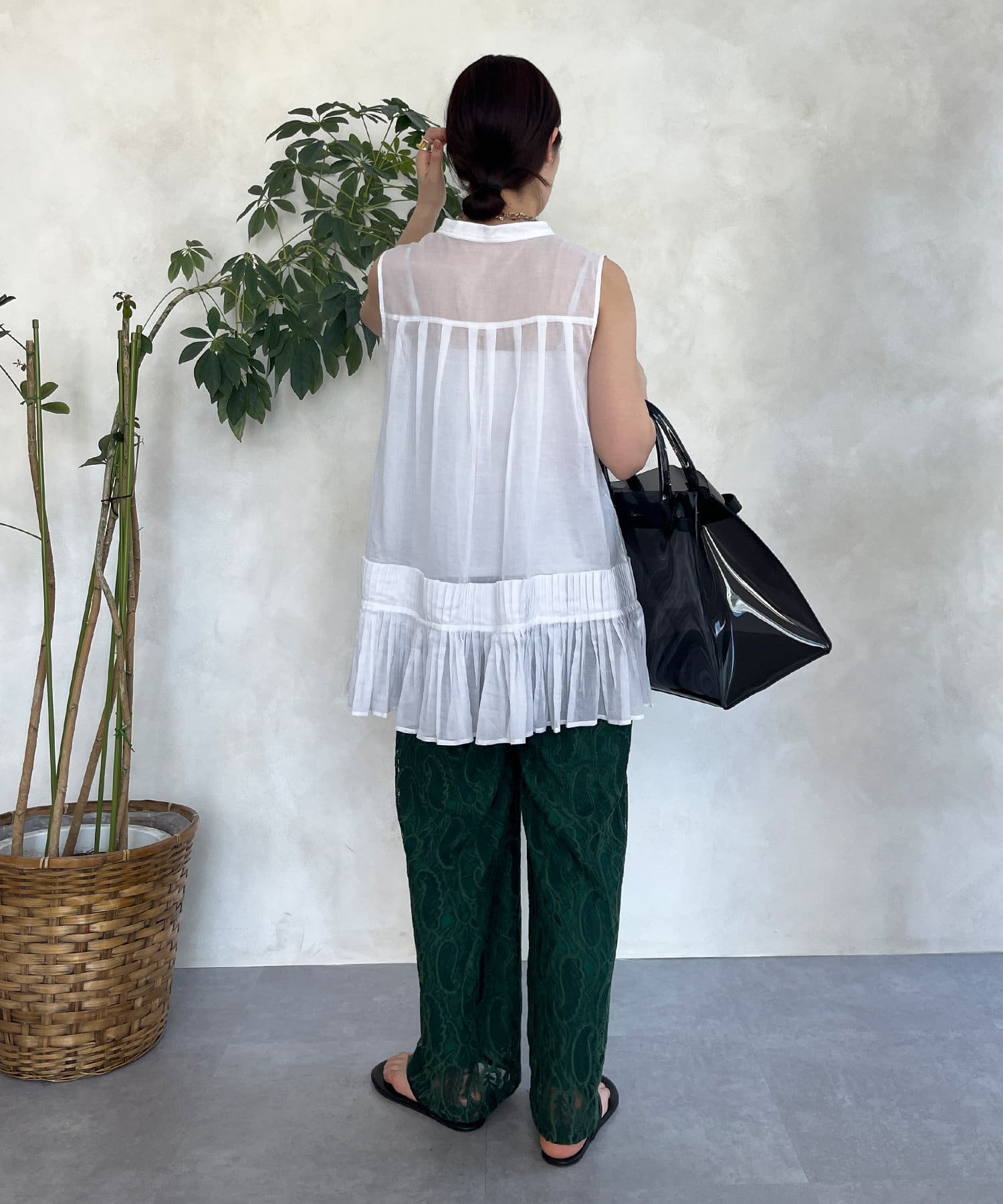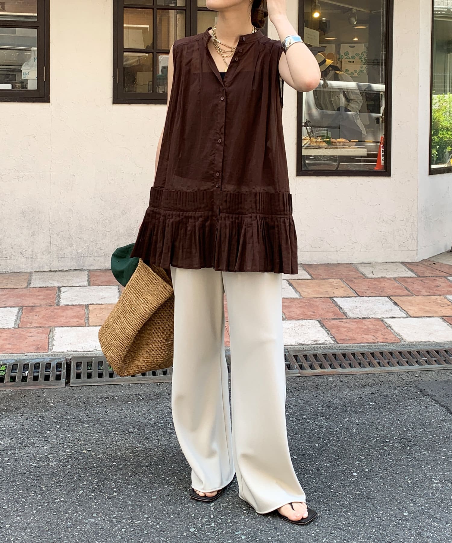 シアー感のある素材と、風通しのいいシルエットで真夏も快適に着られる1着に。