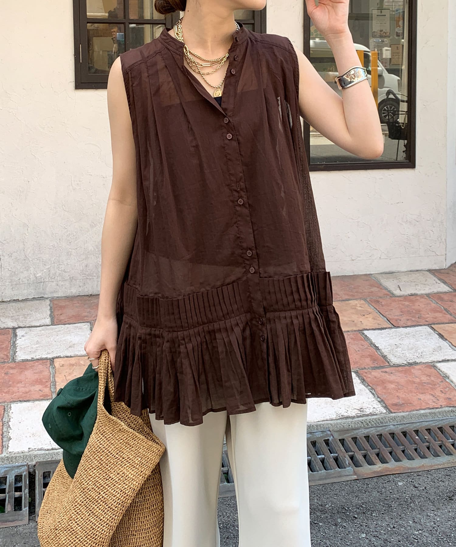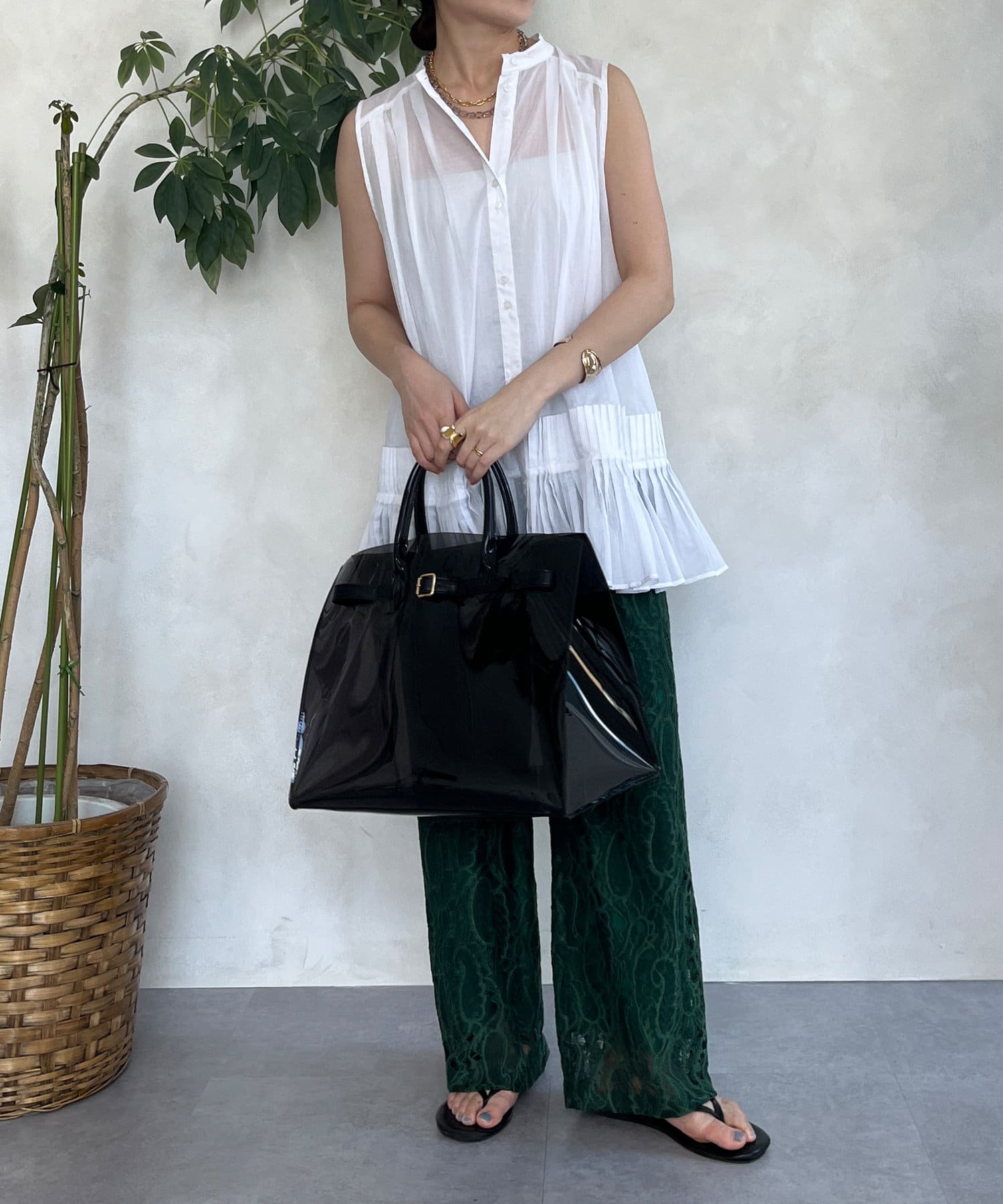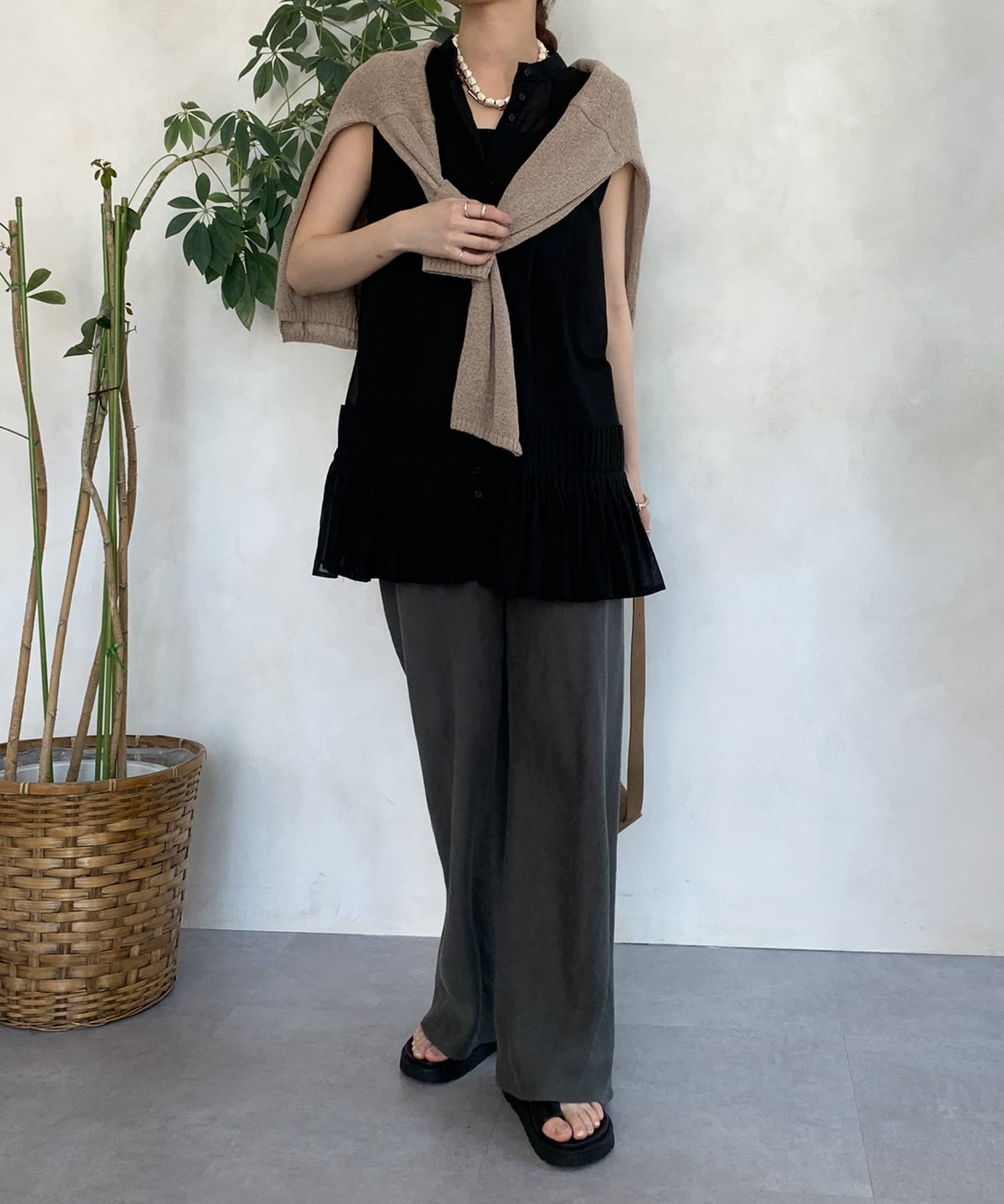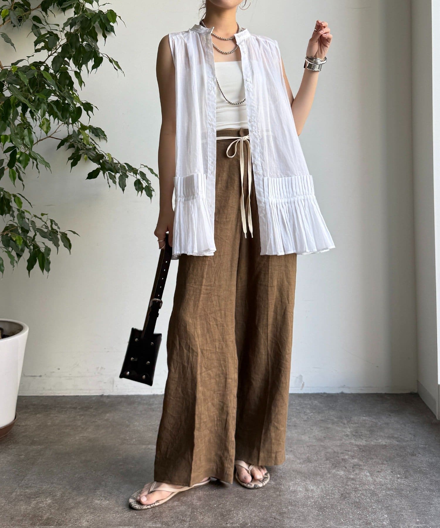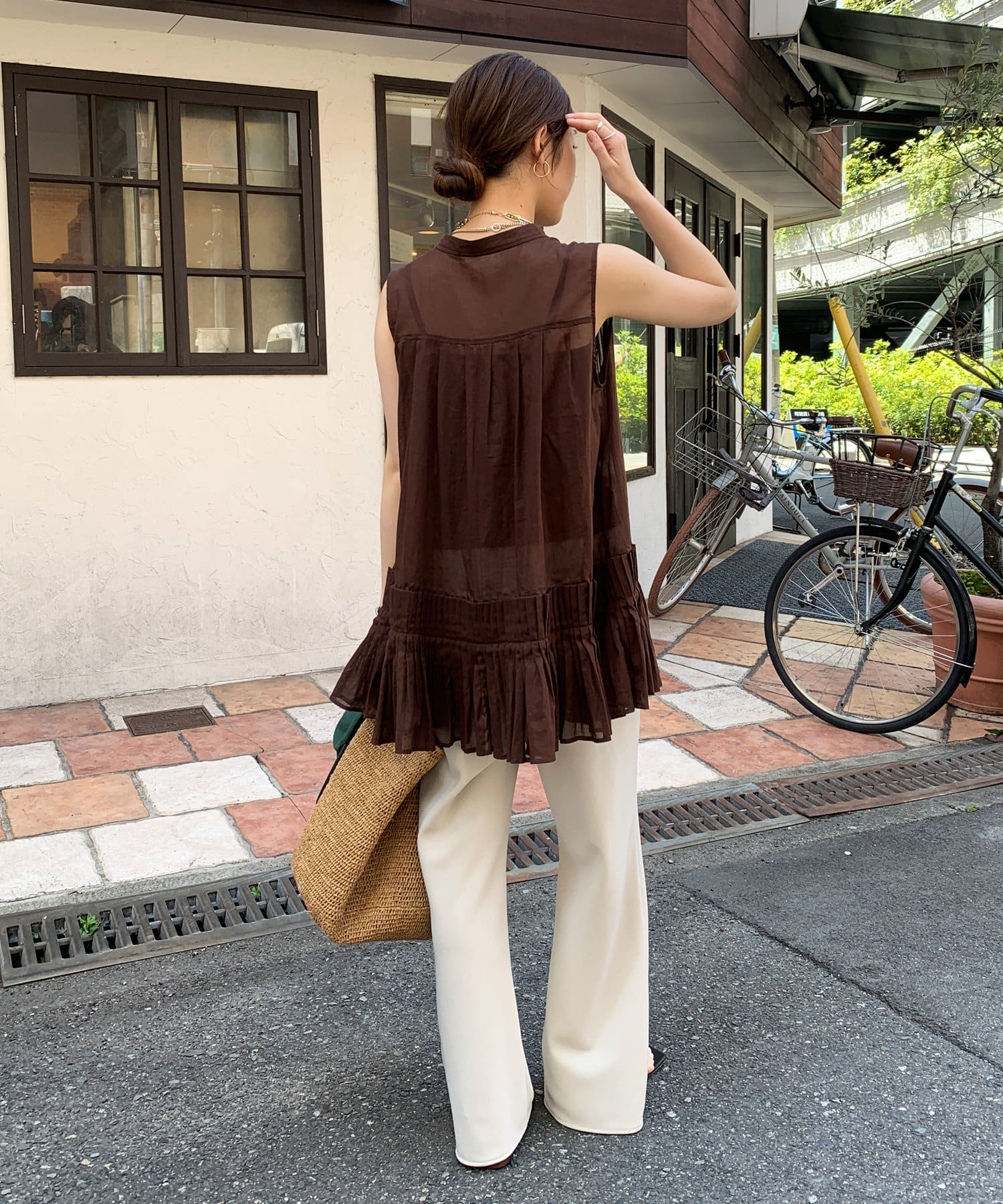 シアー感のある素材と、風通しのいいシルエットで真夏も快適に着られる1着に。