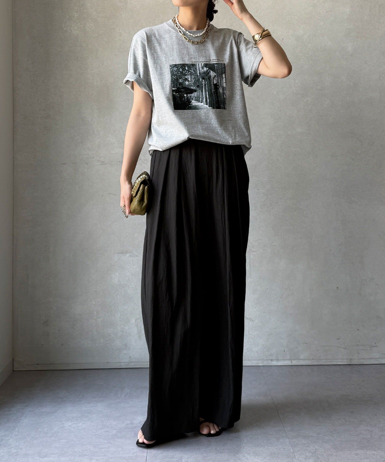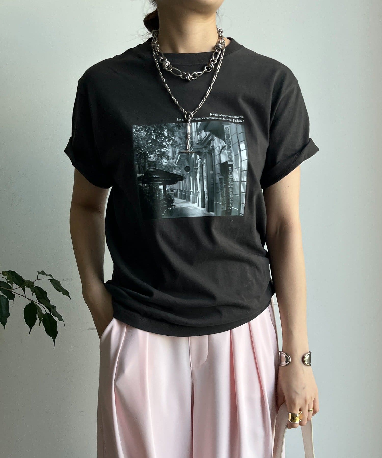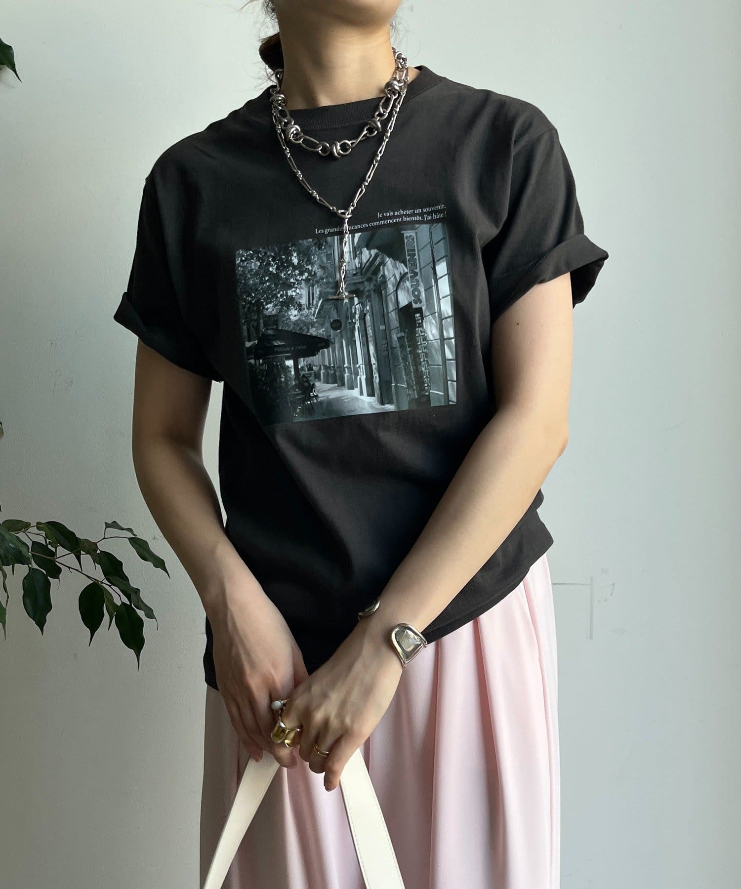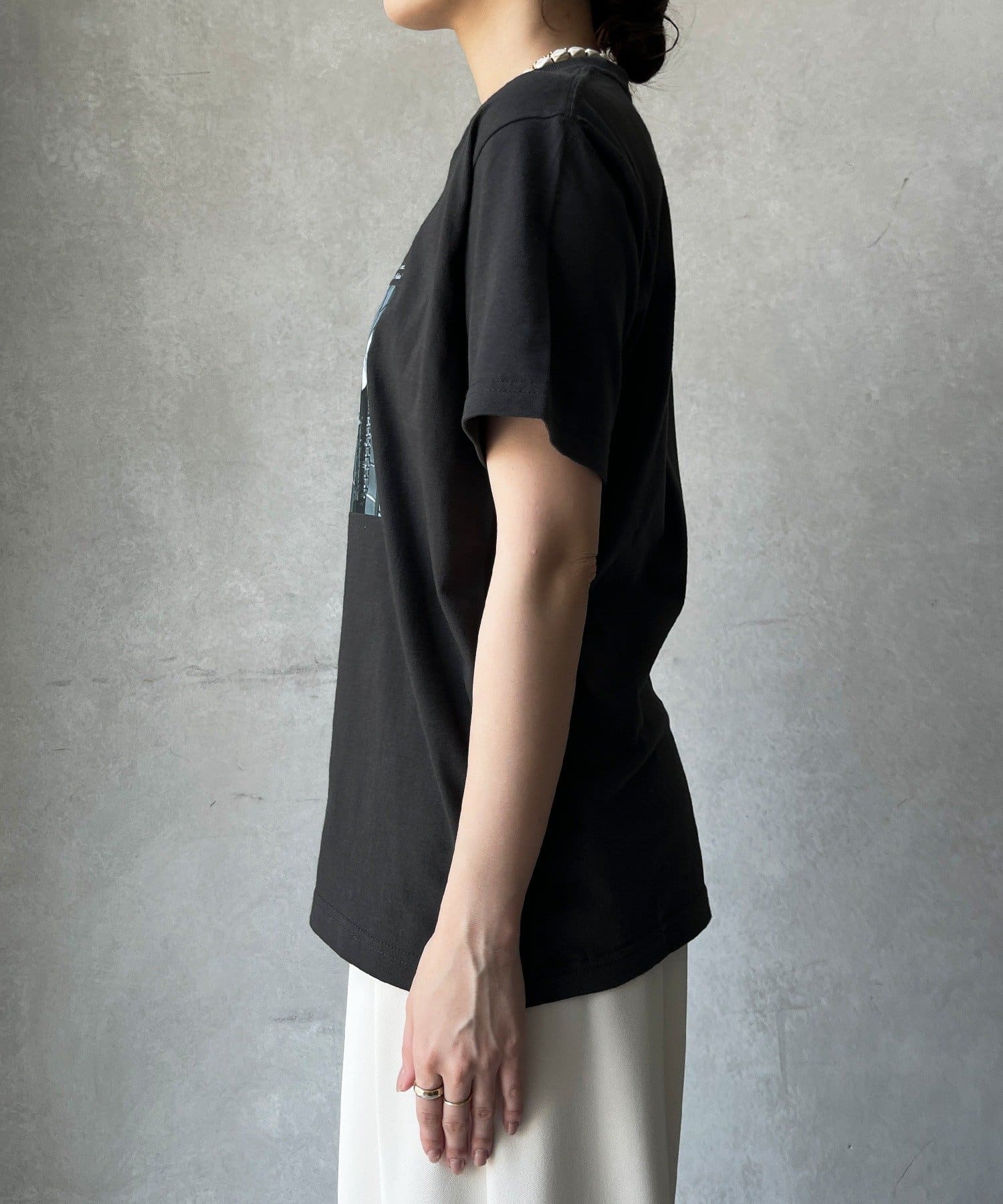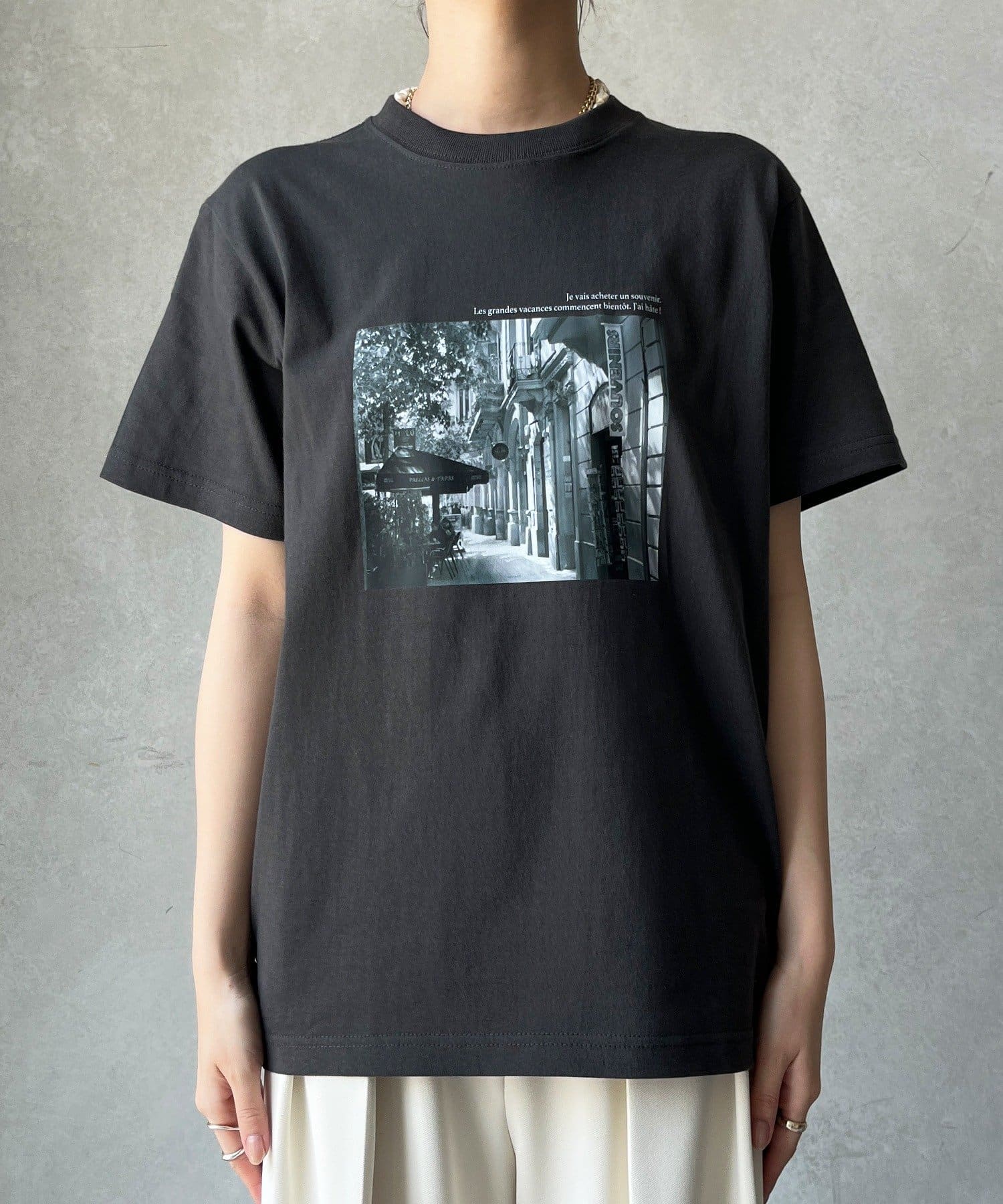 モノトーンの風景プリントなので、カジュアルの中にもどこかモードな印象を与えてくれる1枚です。