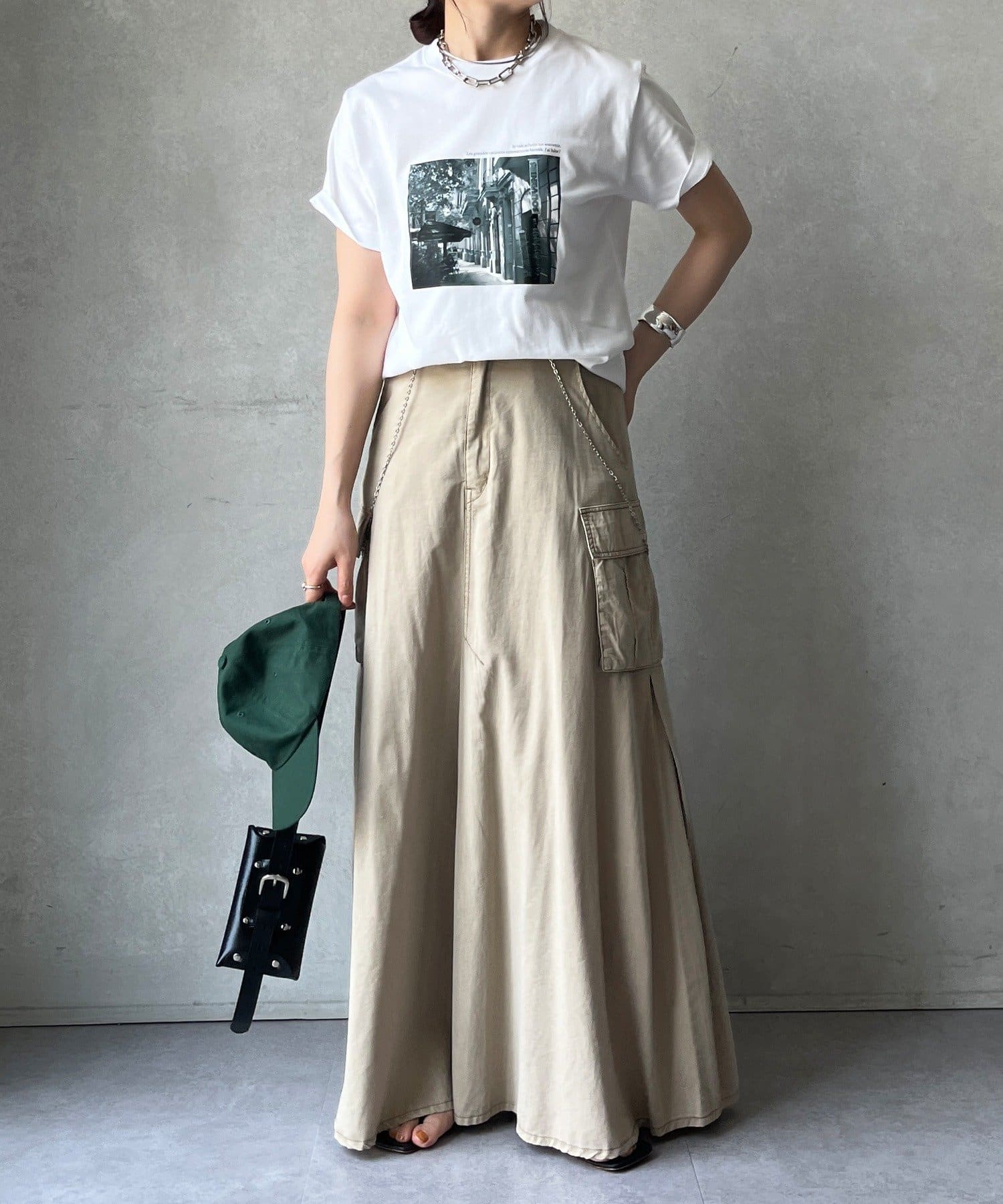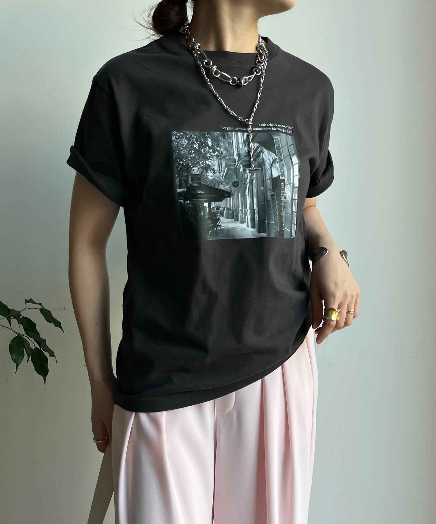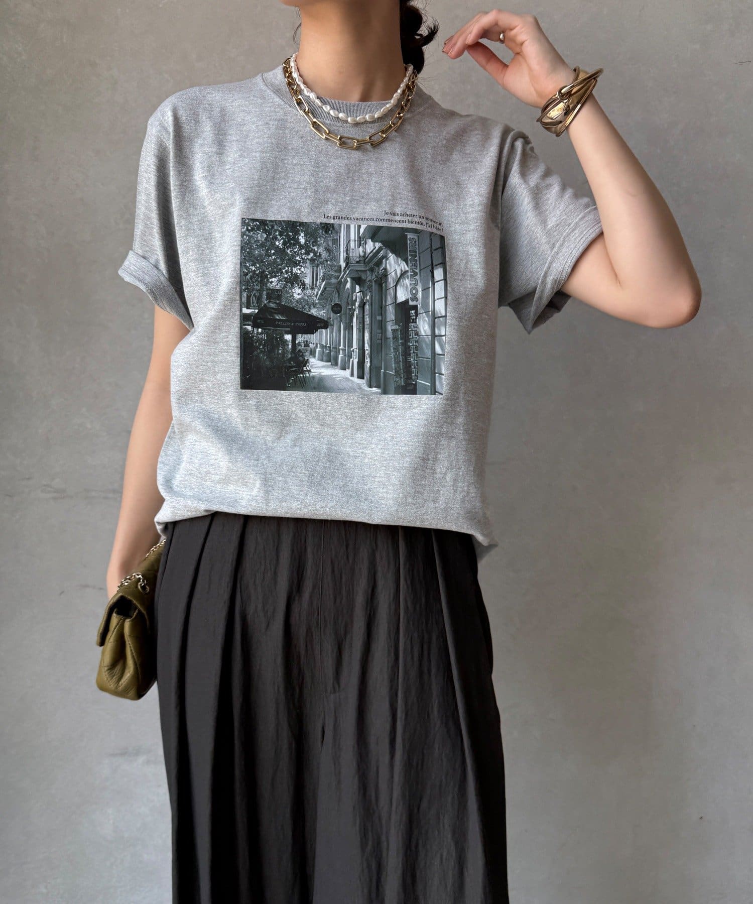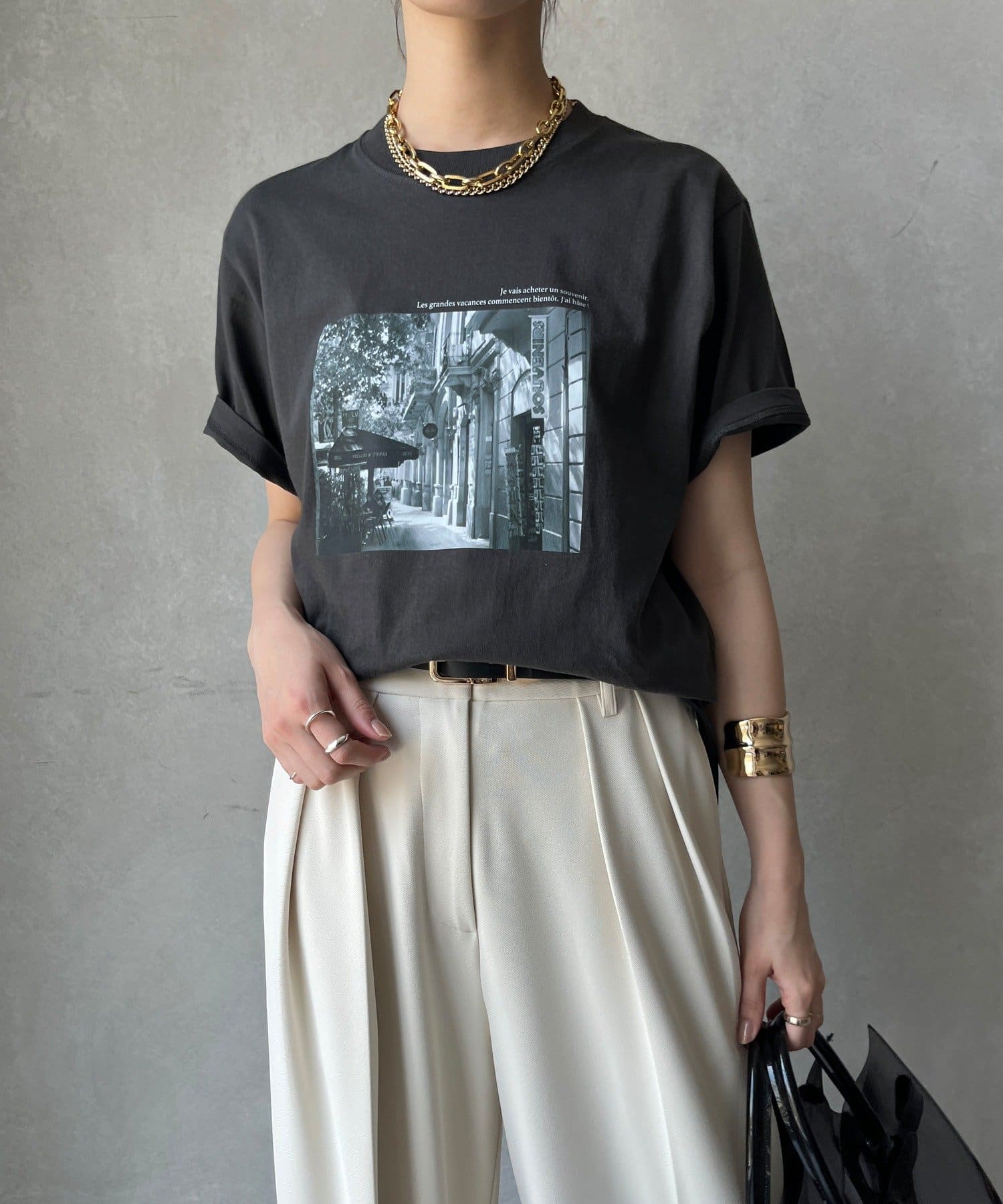 モノトーンの風景プリントなので、カジュアルの中にもどこかモードな印象を与えてくれる1枚です。