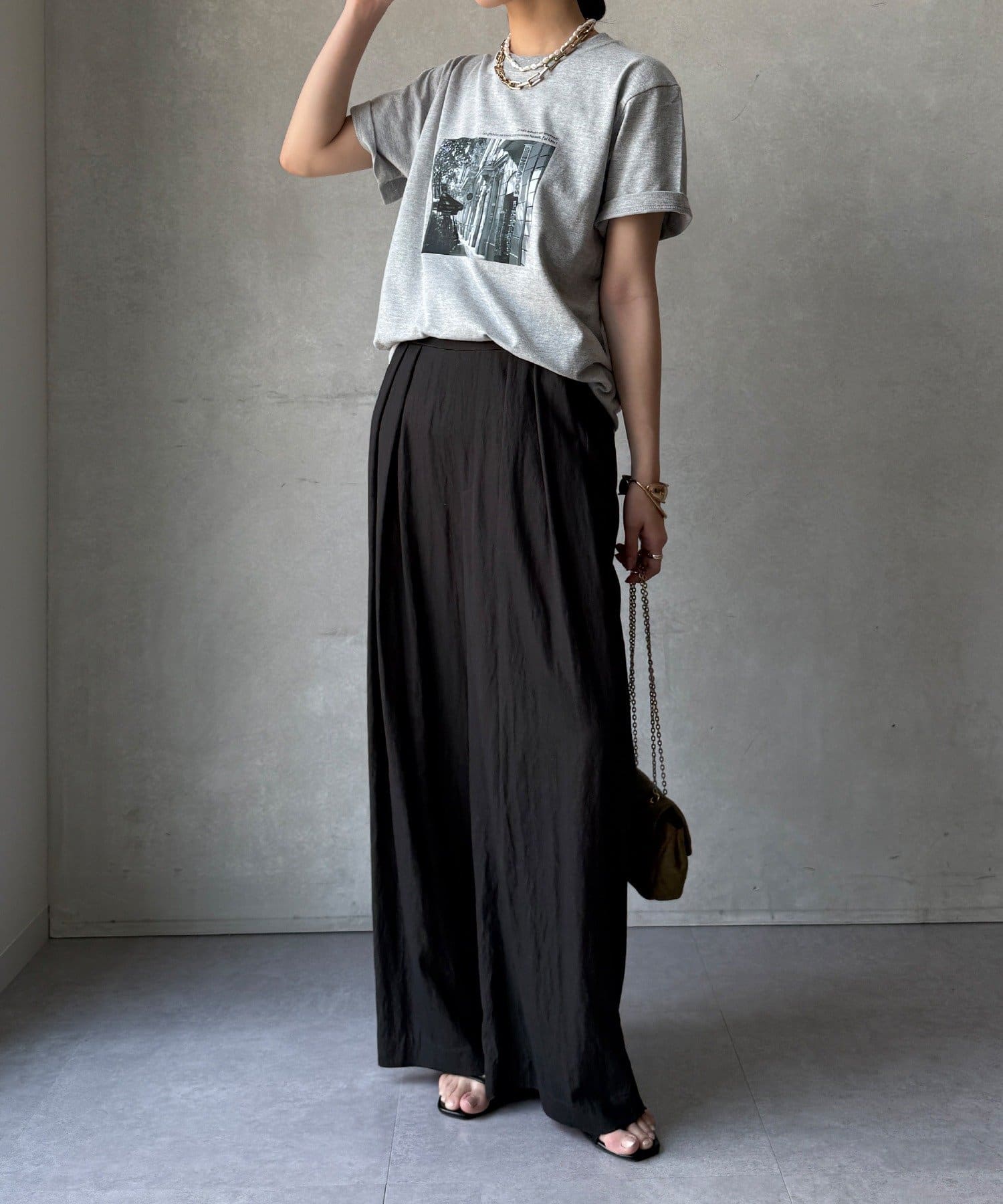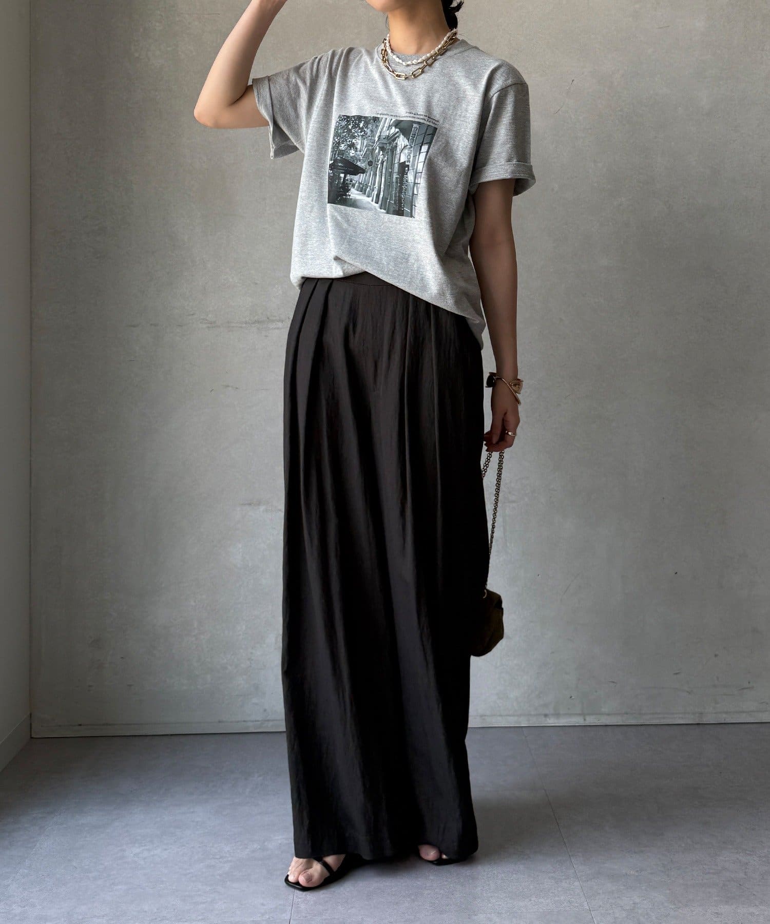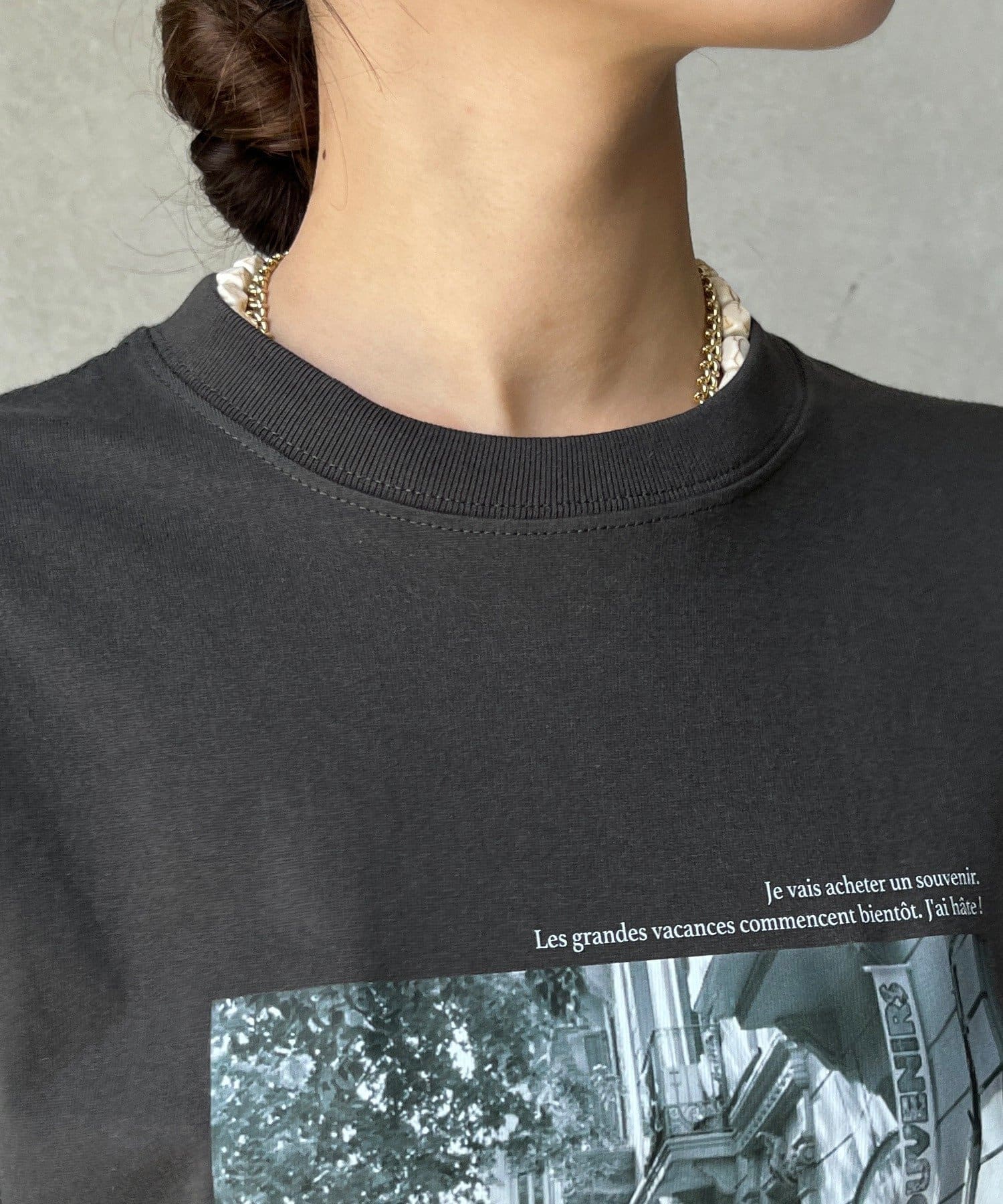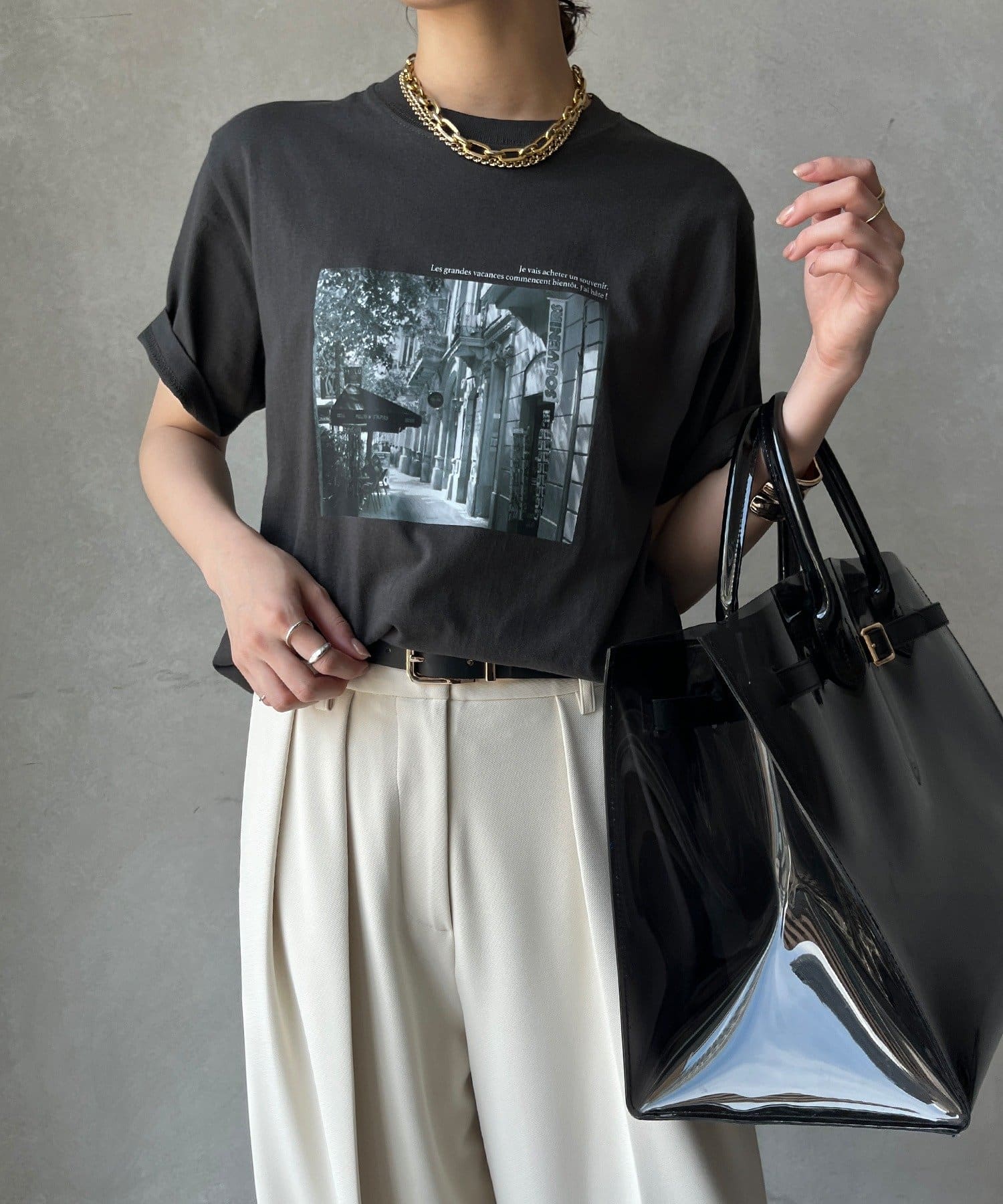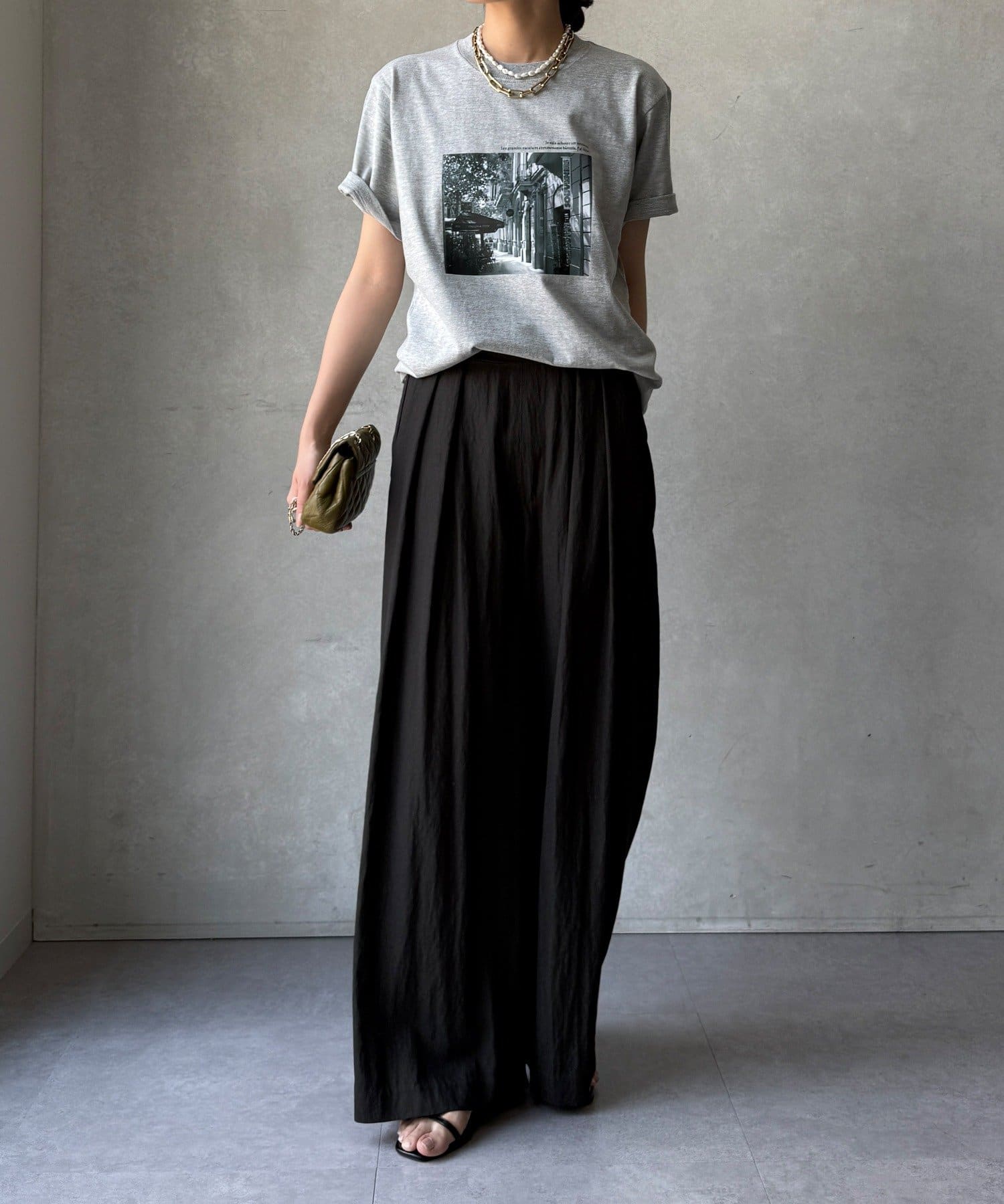 モノトーンの風景プリントなので、カジュアルの中にもどこかモードな印象を与えてくれる1枚です。