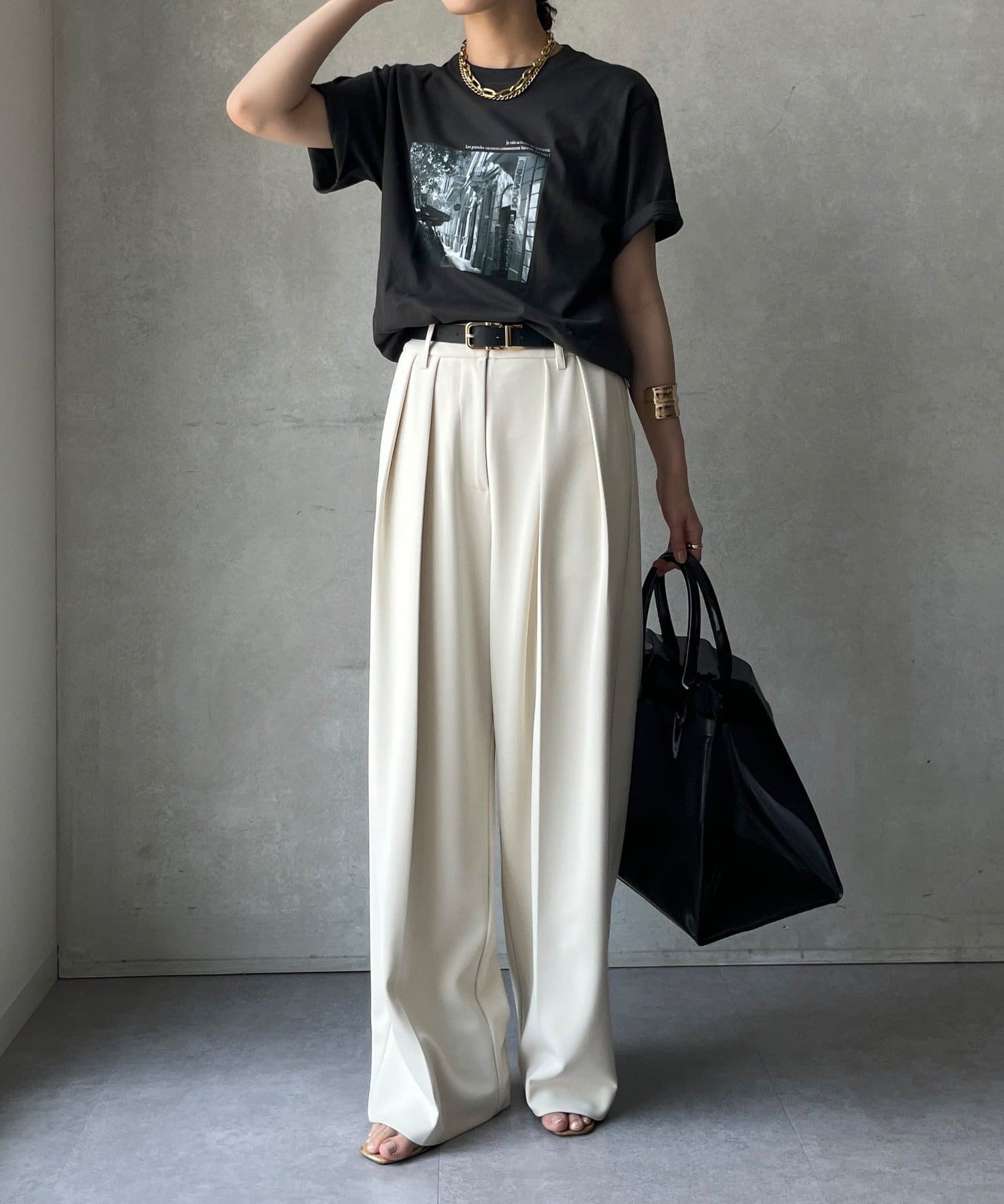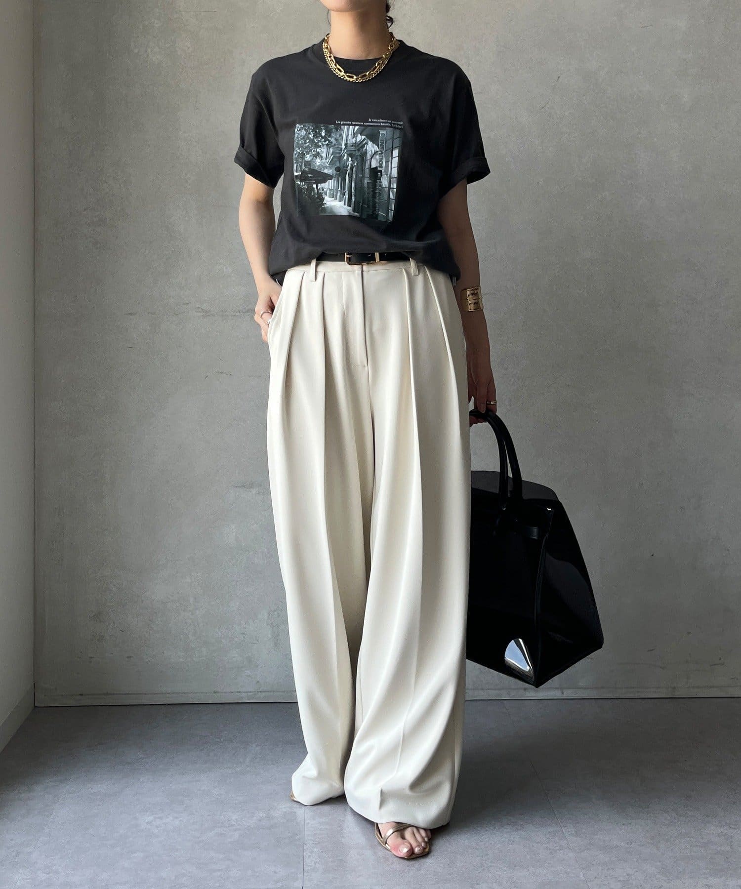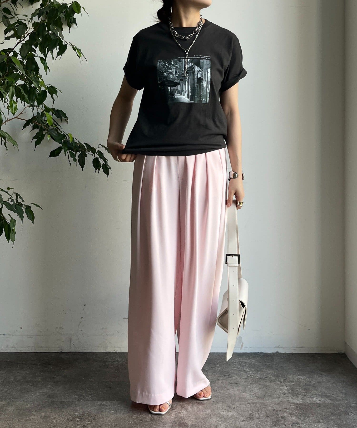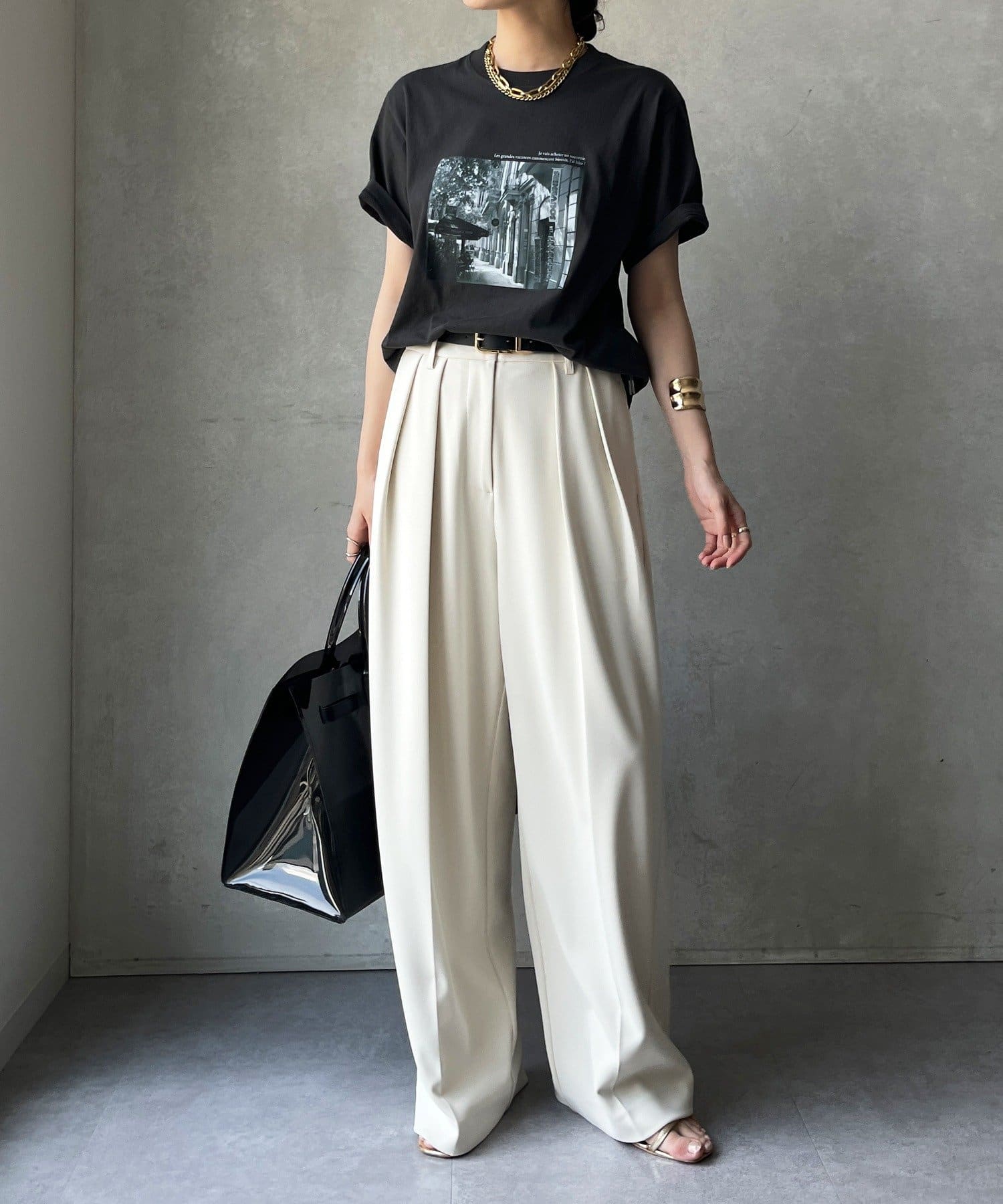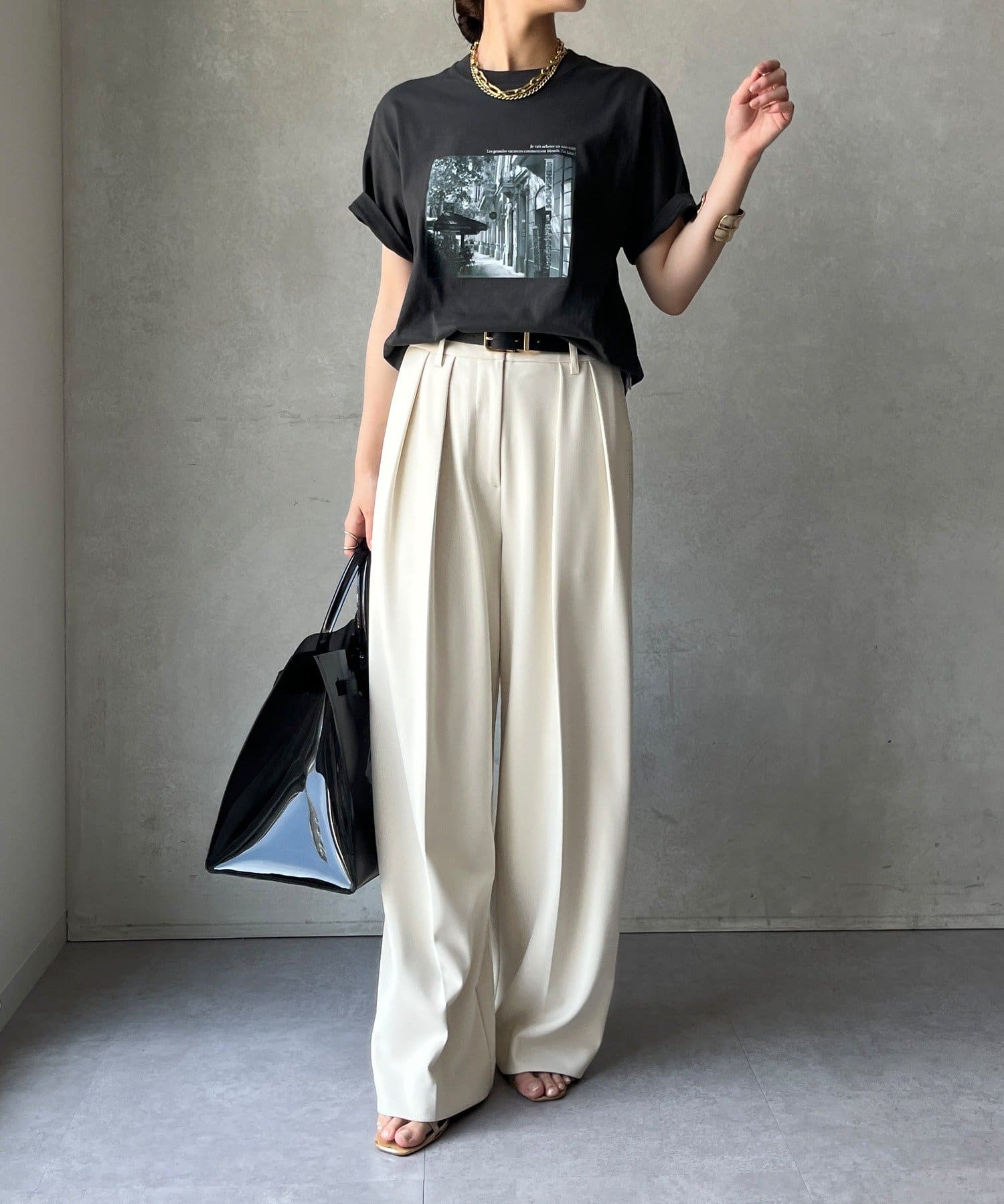 モノトーンの風景プリントなので、カジュアルの中にもどこかモードな印象を与えてくれる1枚です。
