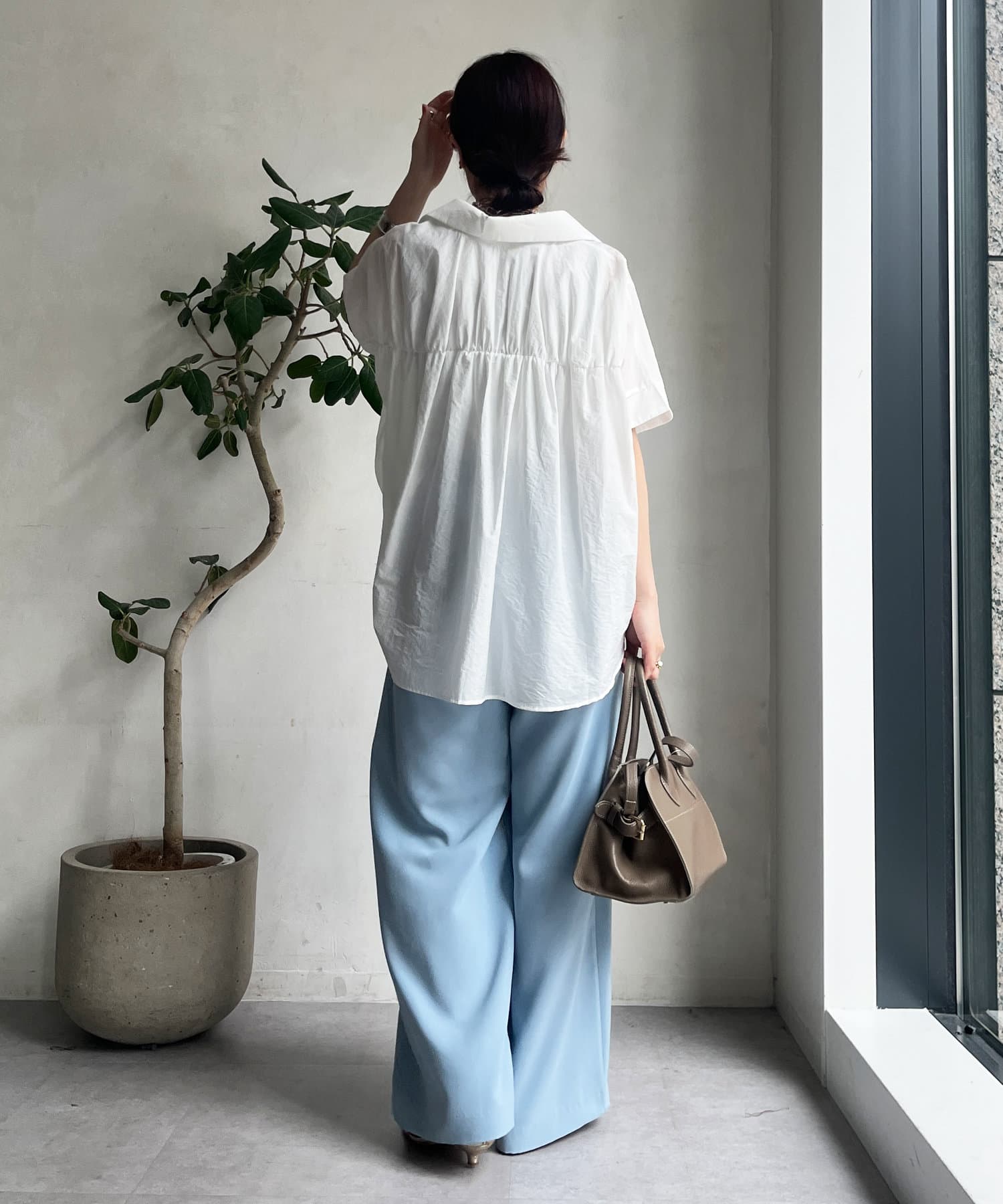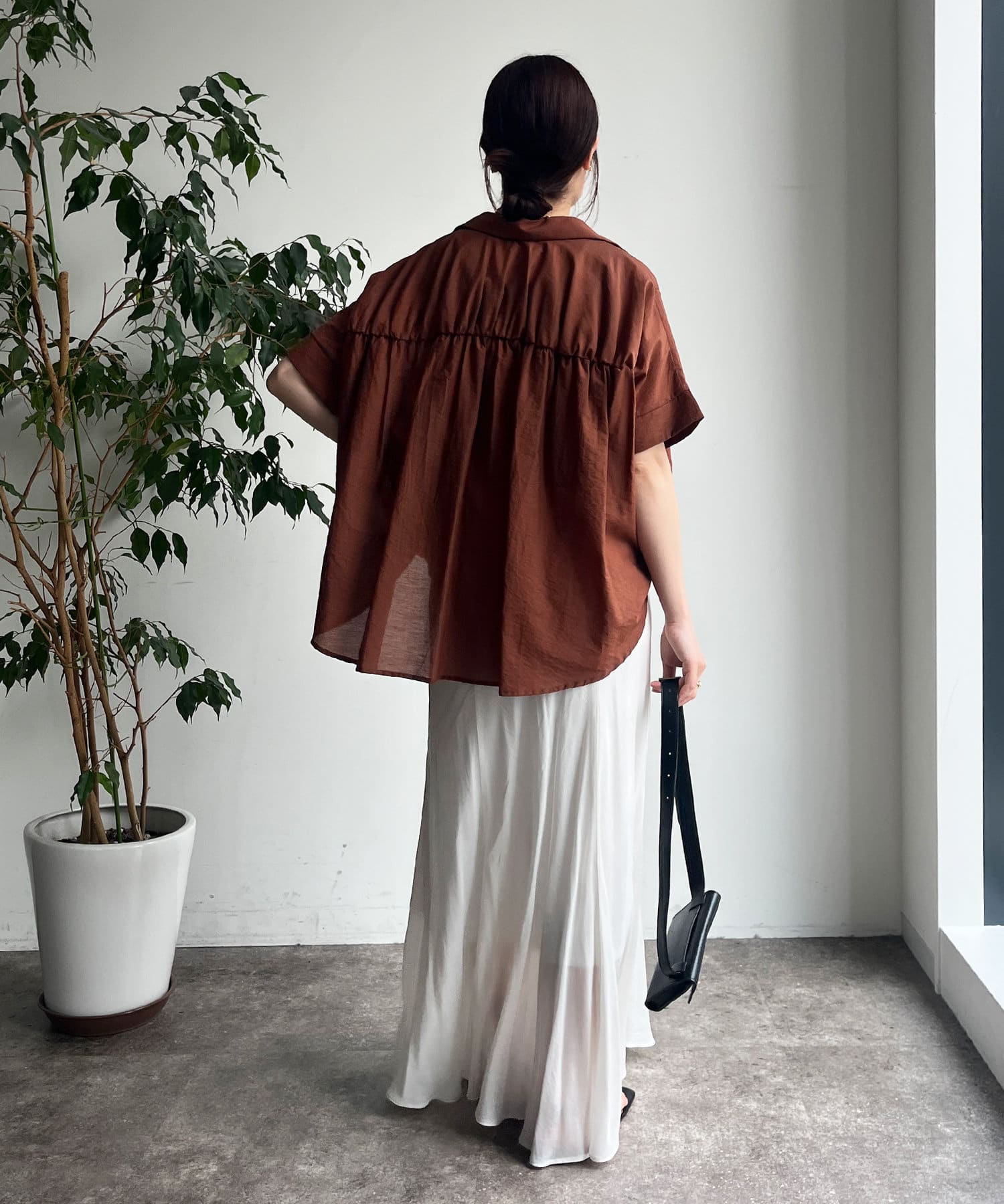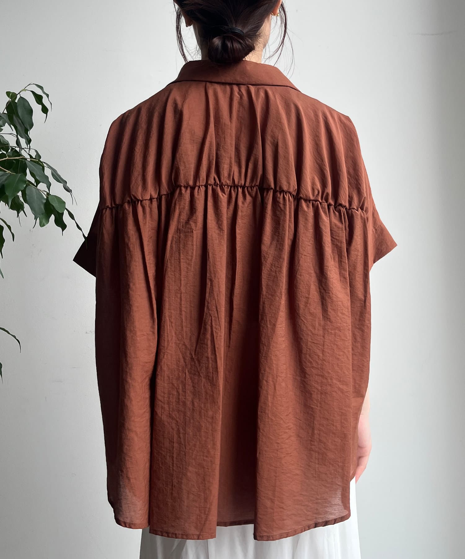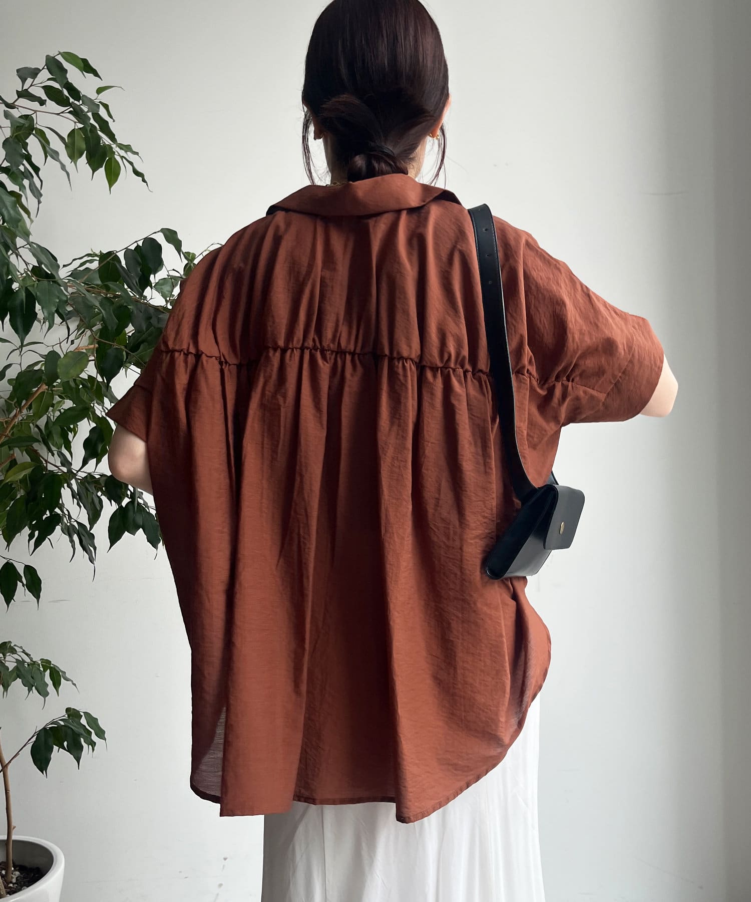 バックにたっぷりとシャーリングを寄せたスキッパーシャツ。