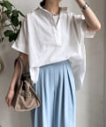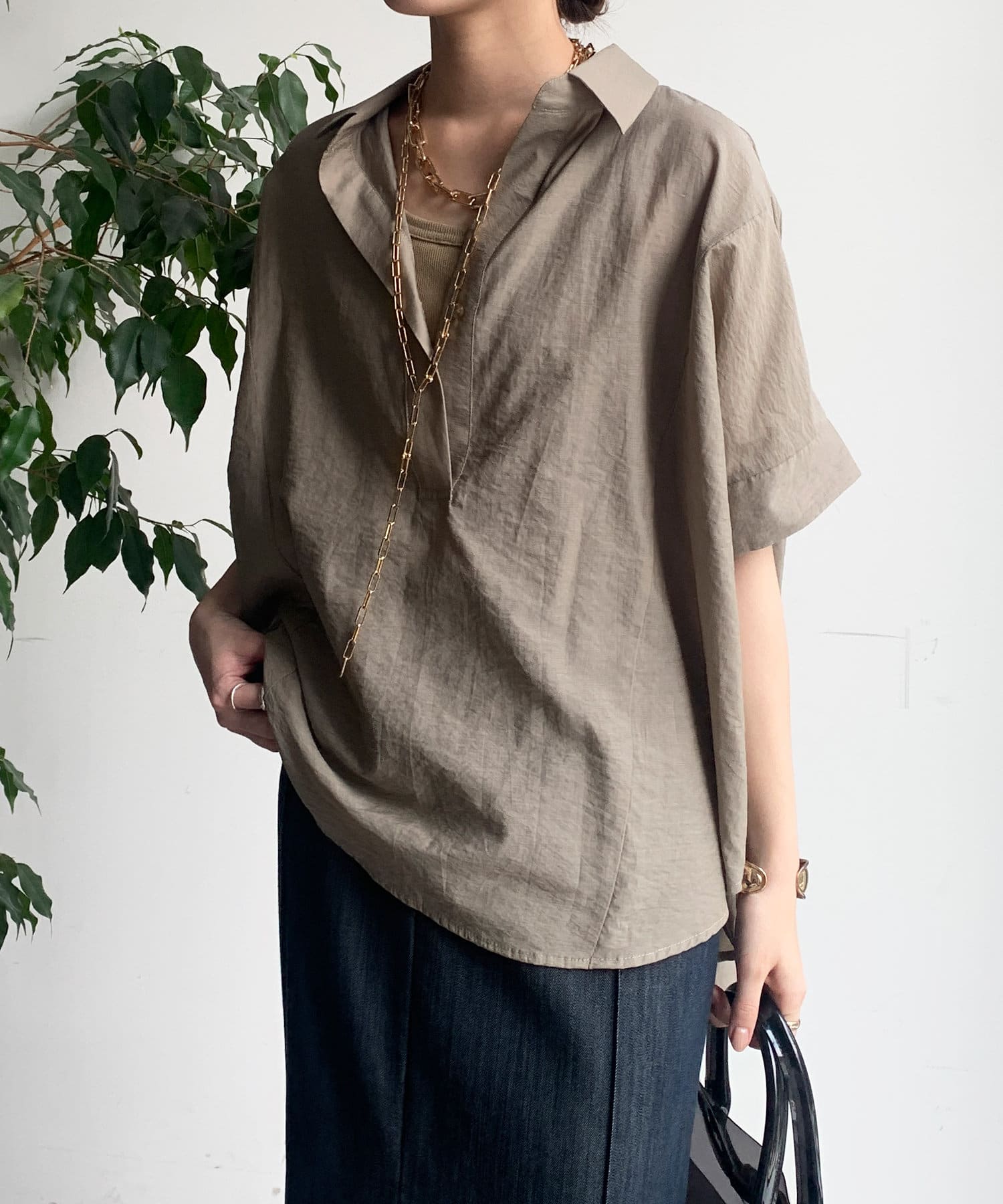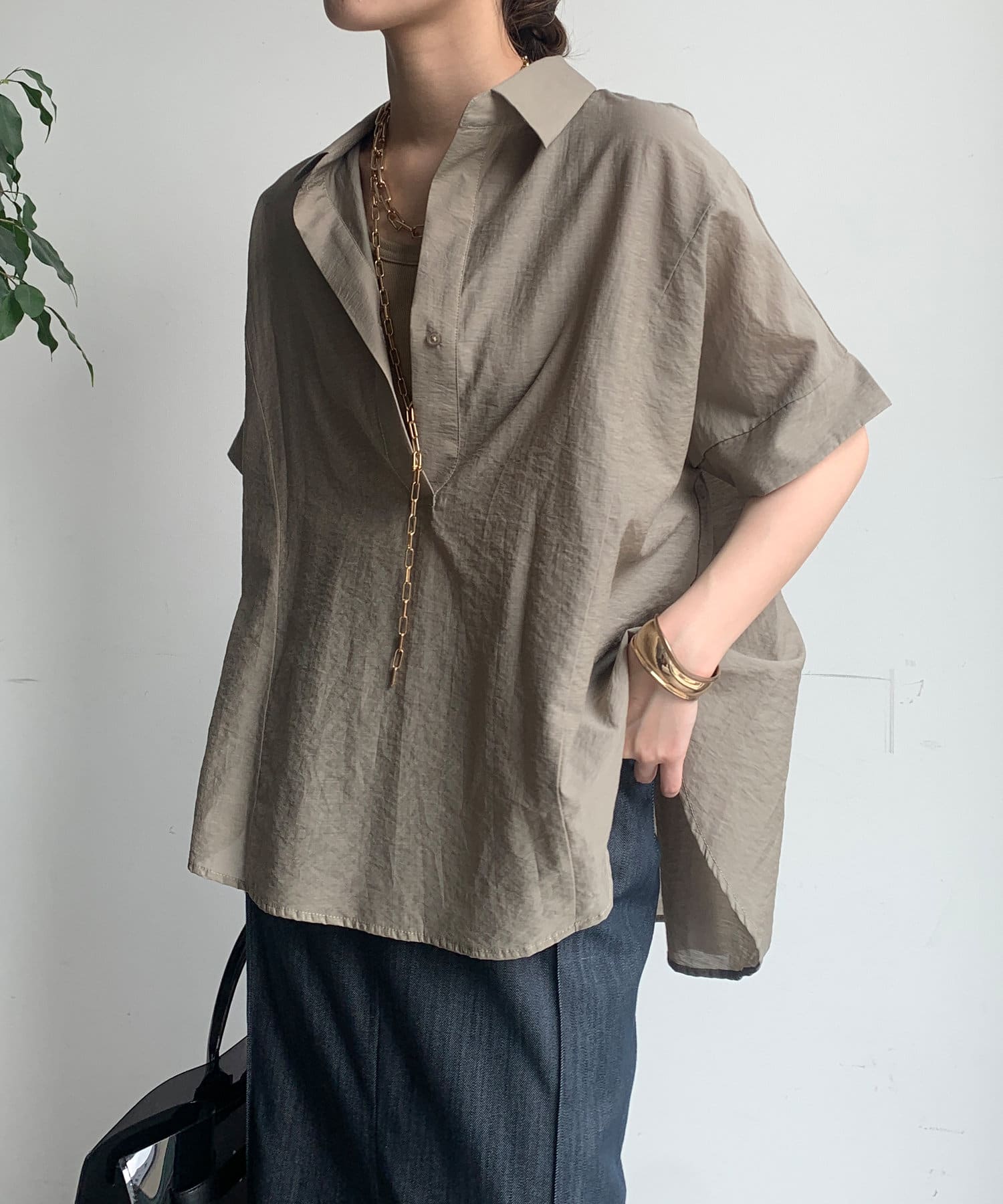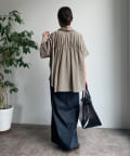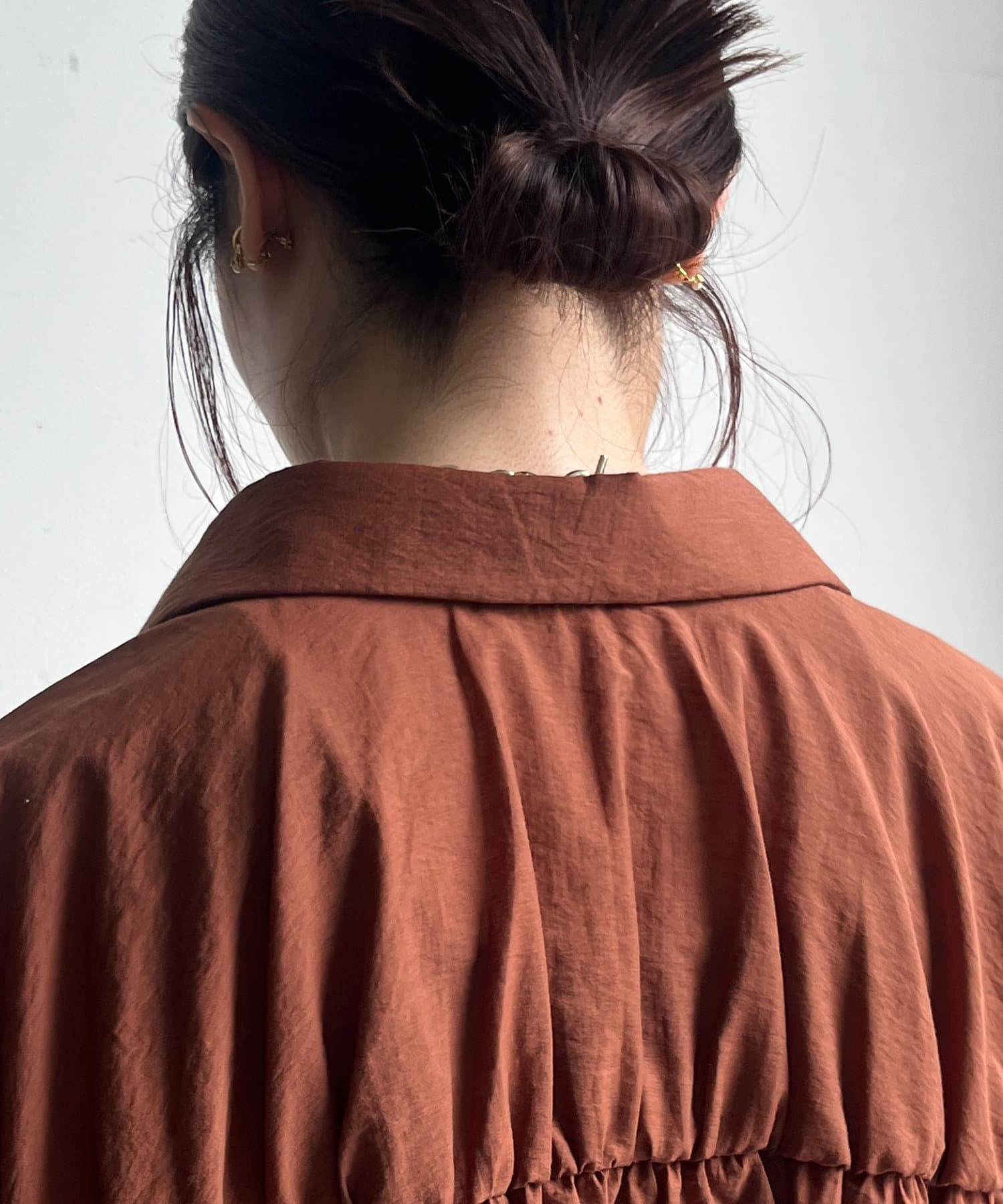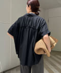 バックにたっぷりとシャーリングを寄せたスキッパーシャツ。