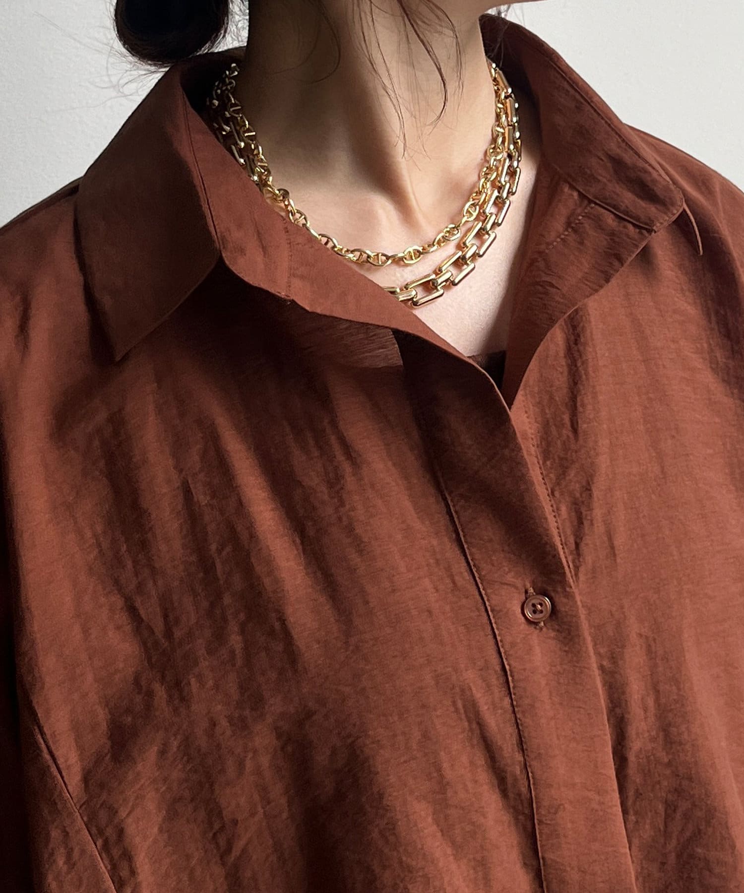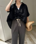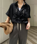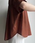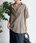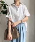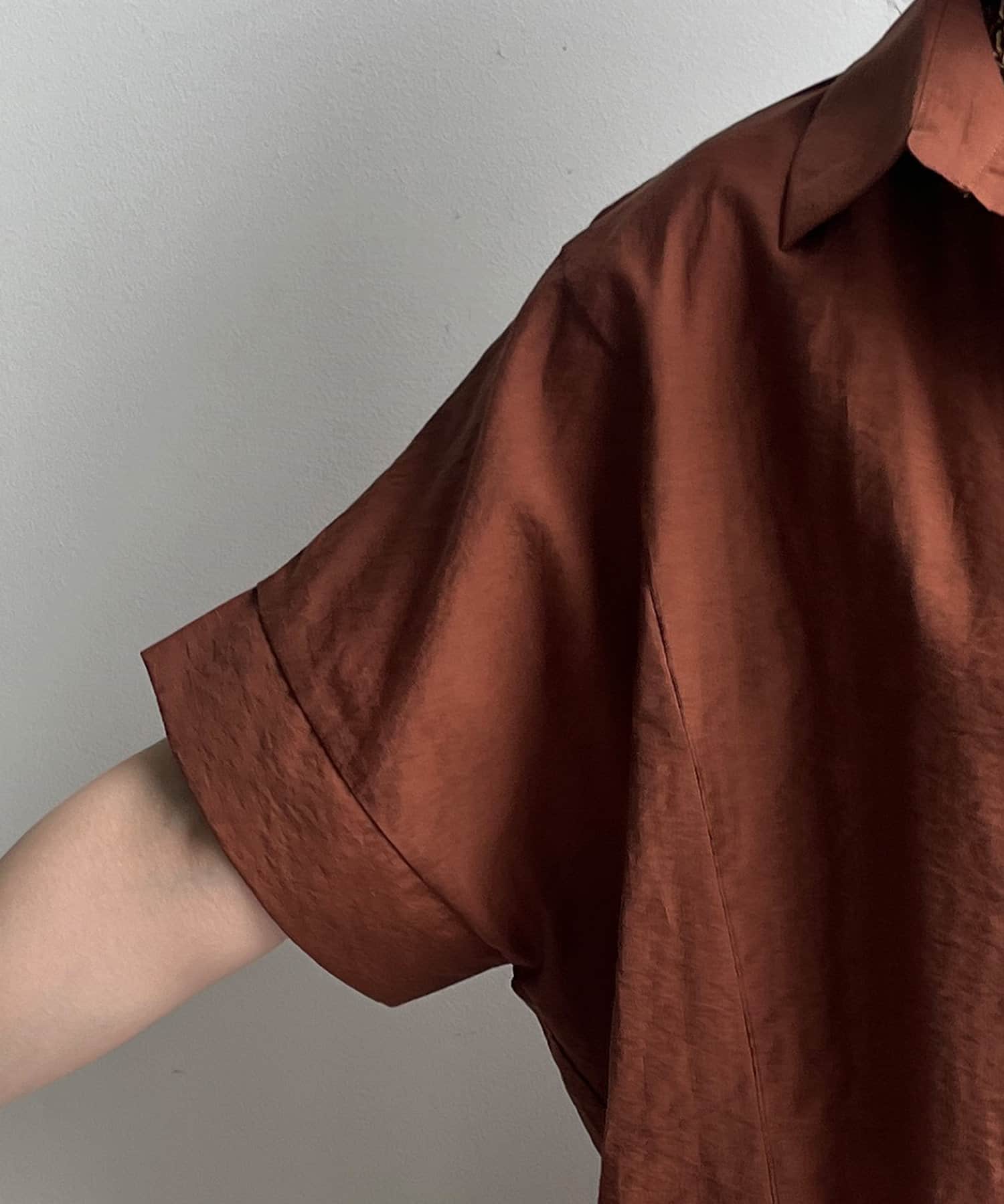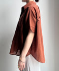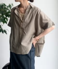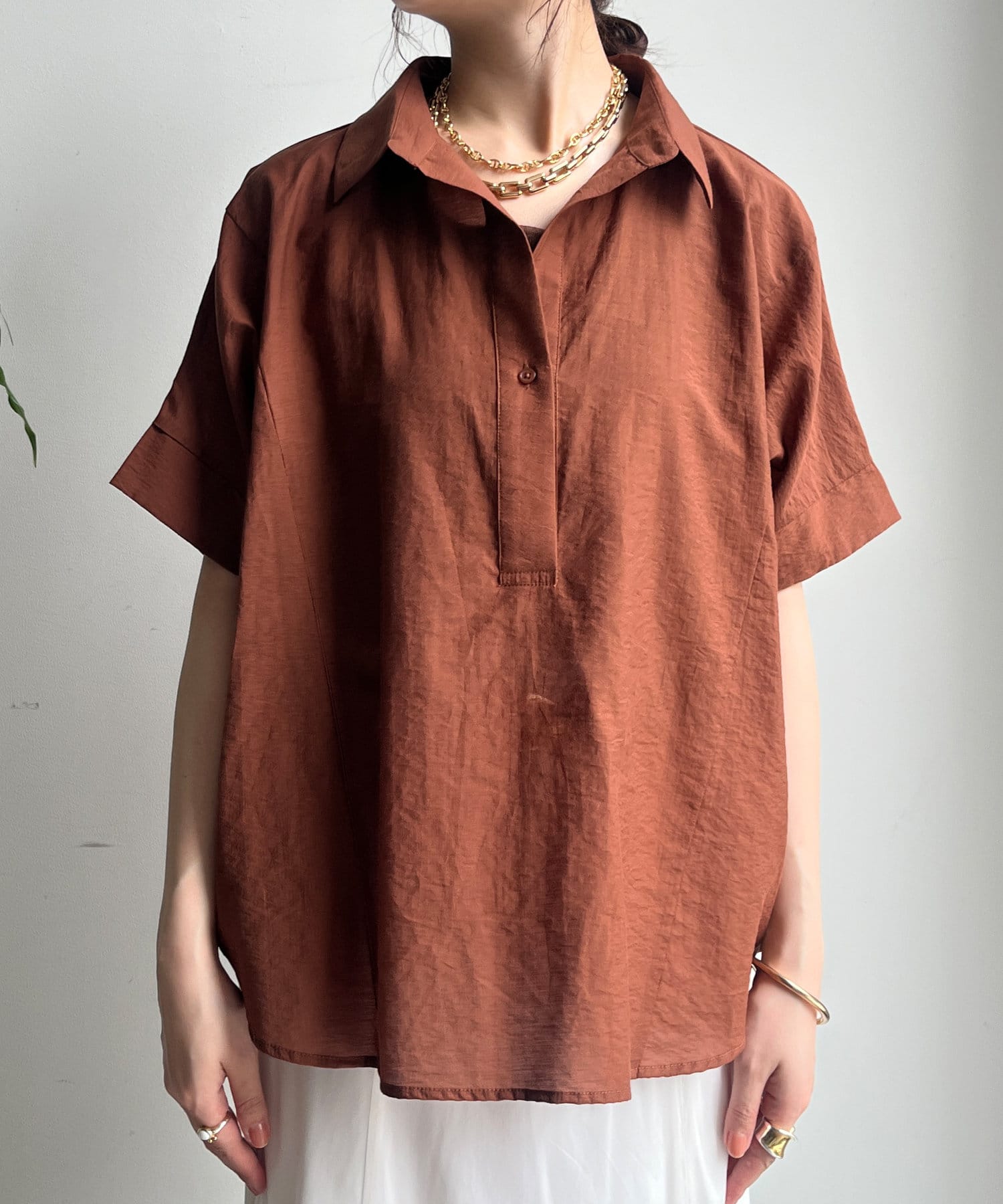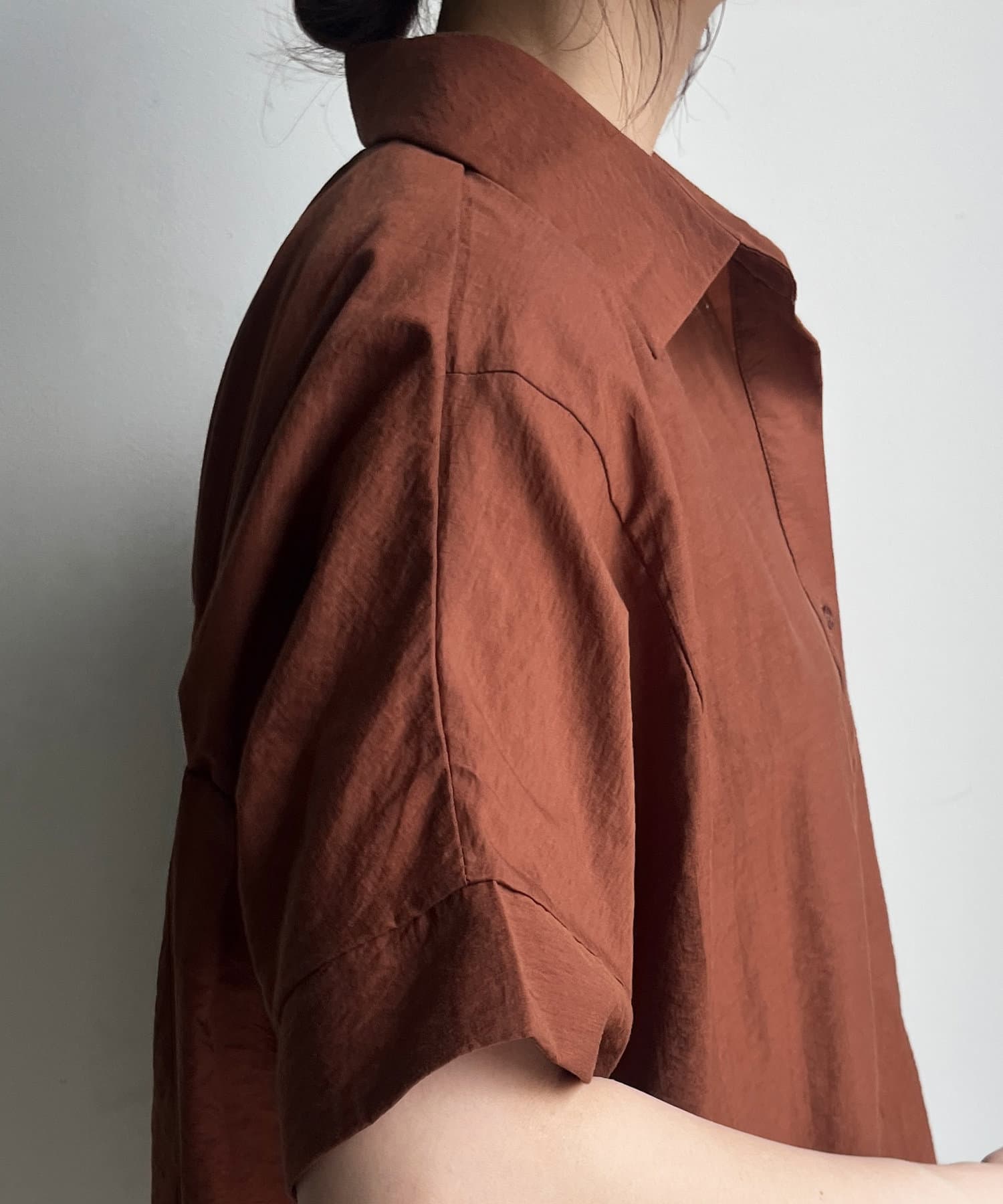 バックにたっぷりとシャーリングを寄せたスキッパーシャツ。