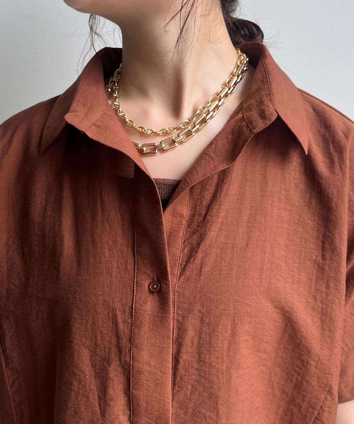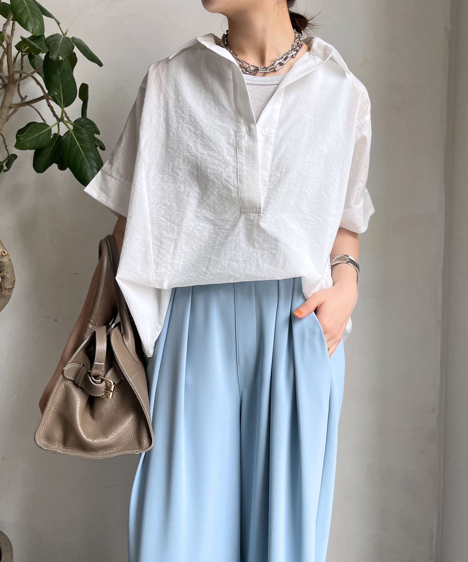 襟元はお顔周りがすっきりと見えるスキッパーのデザインで、真夏にも快適。