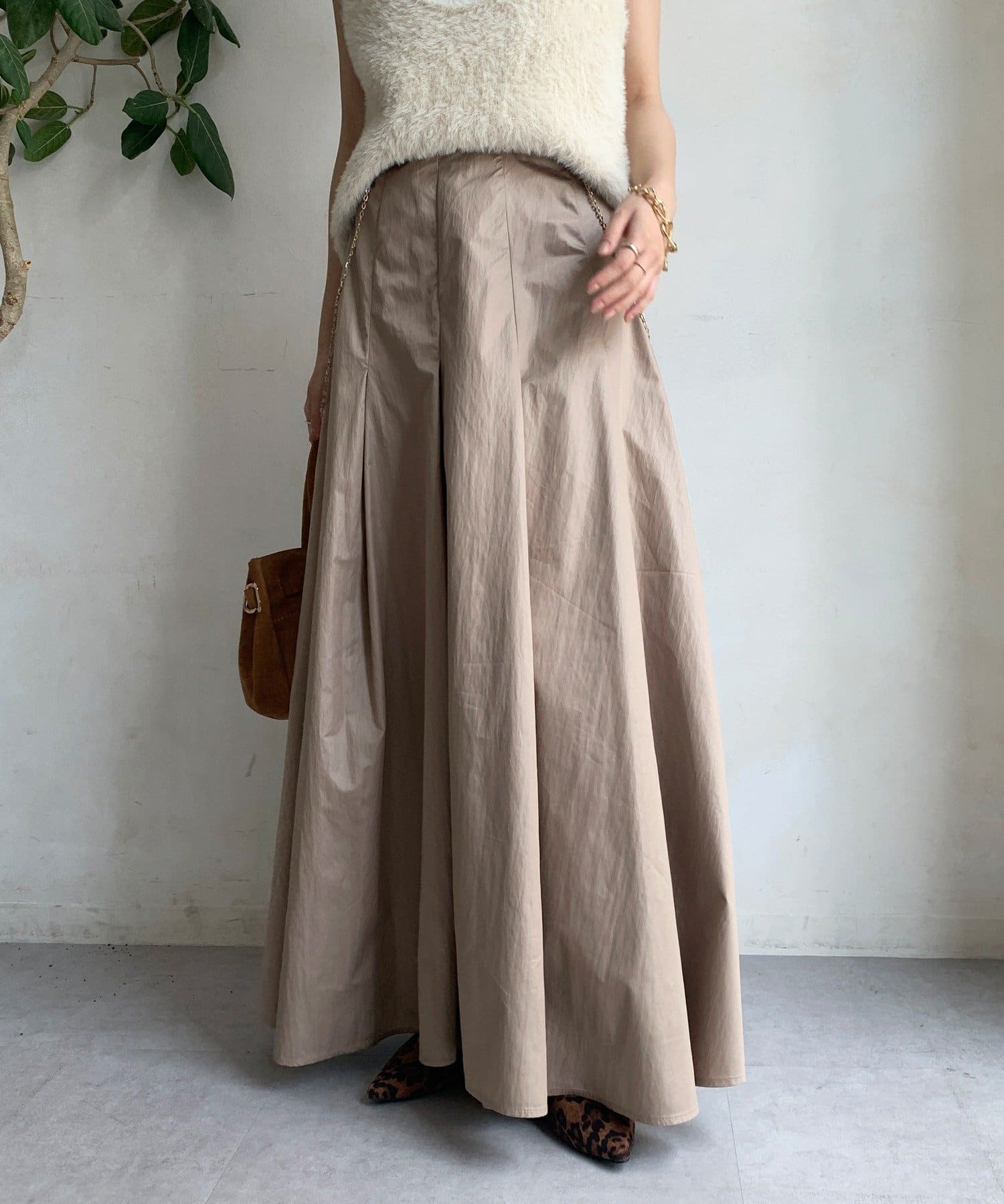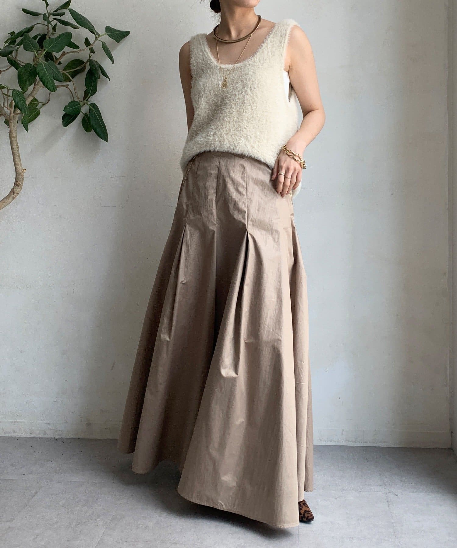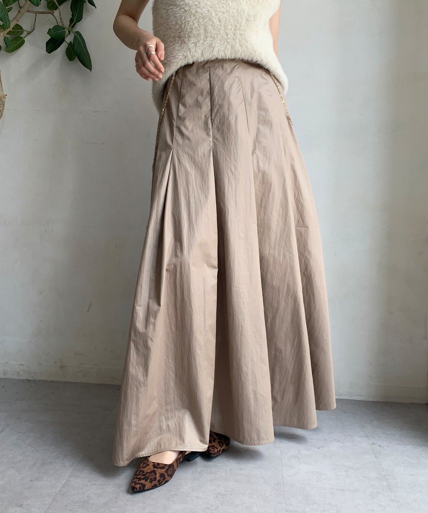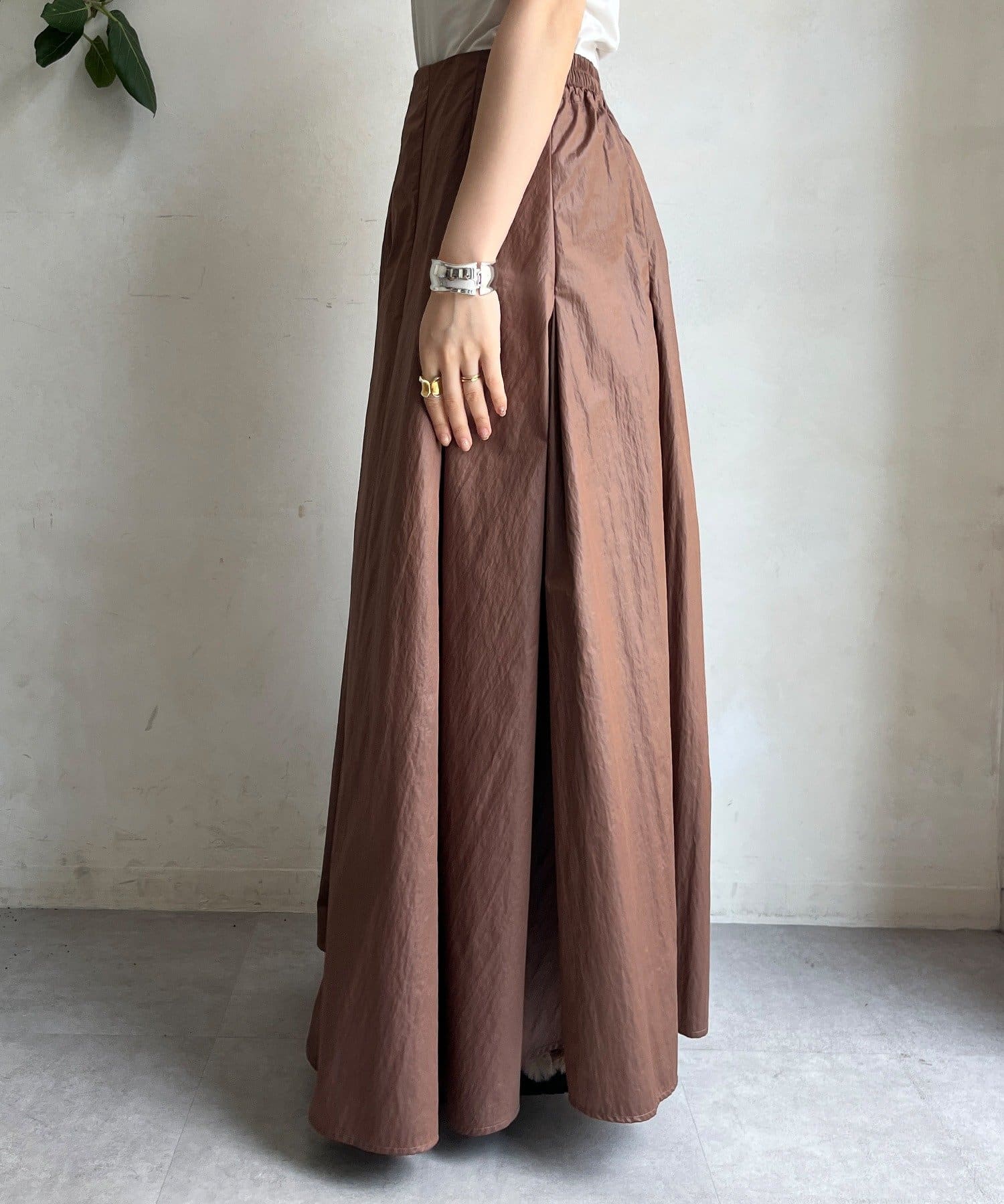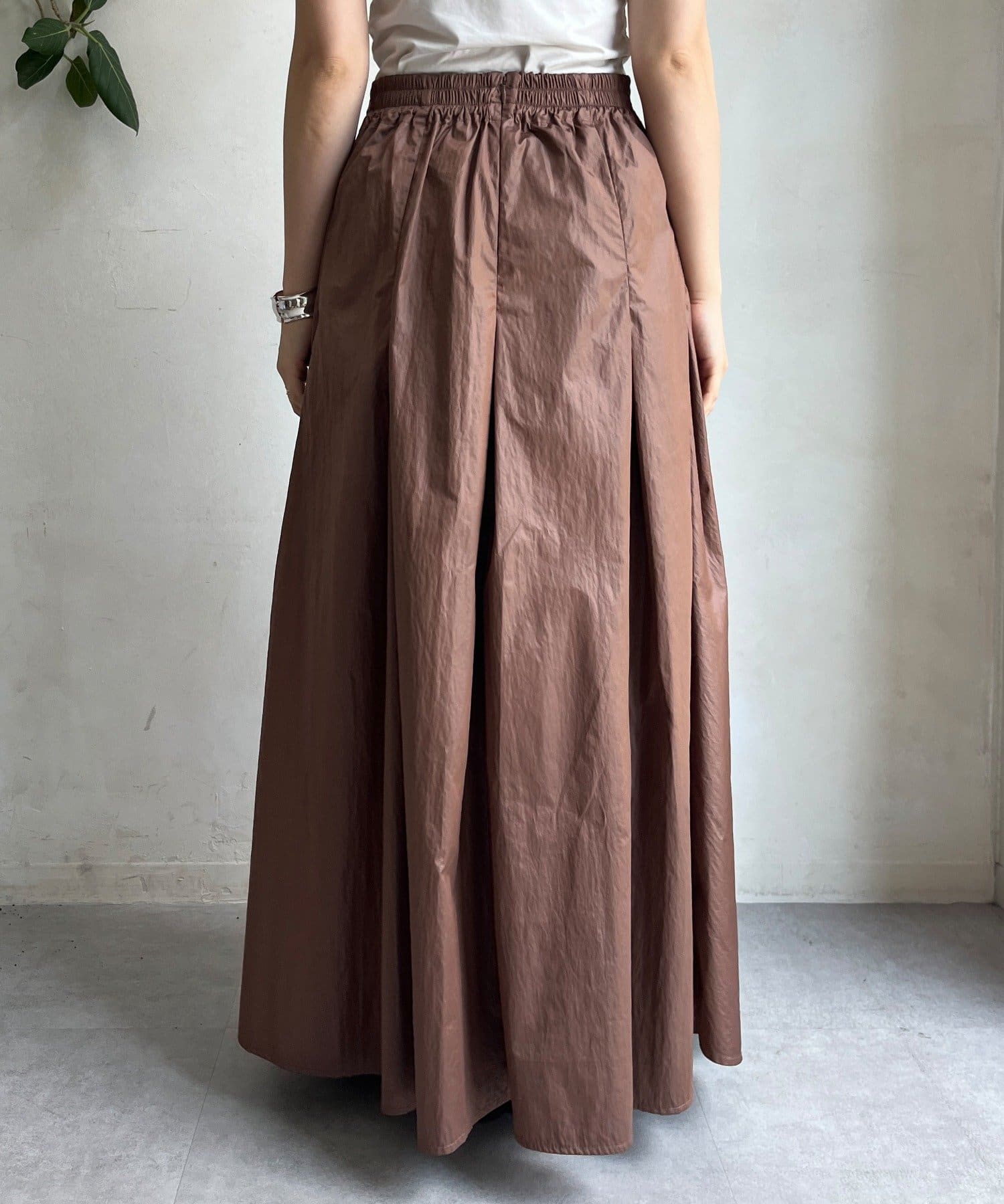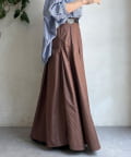 生地をふんだんに使い、タックを入れることで生まれるフレアシルエットが最大の魅力です。