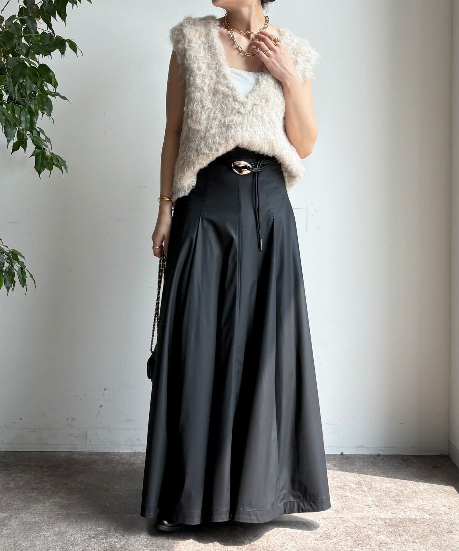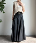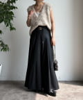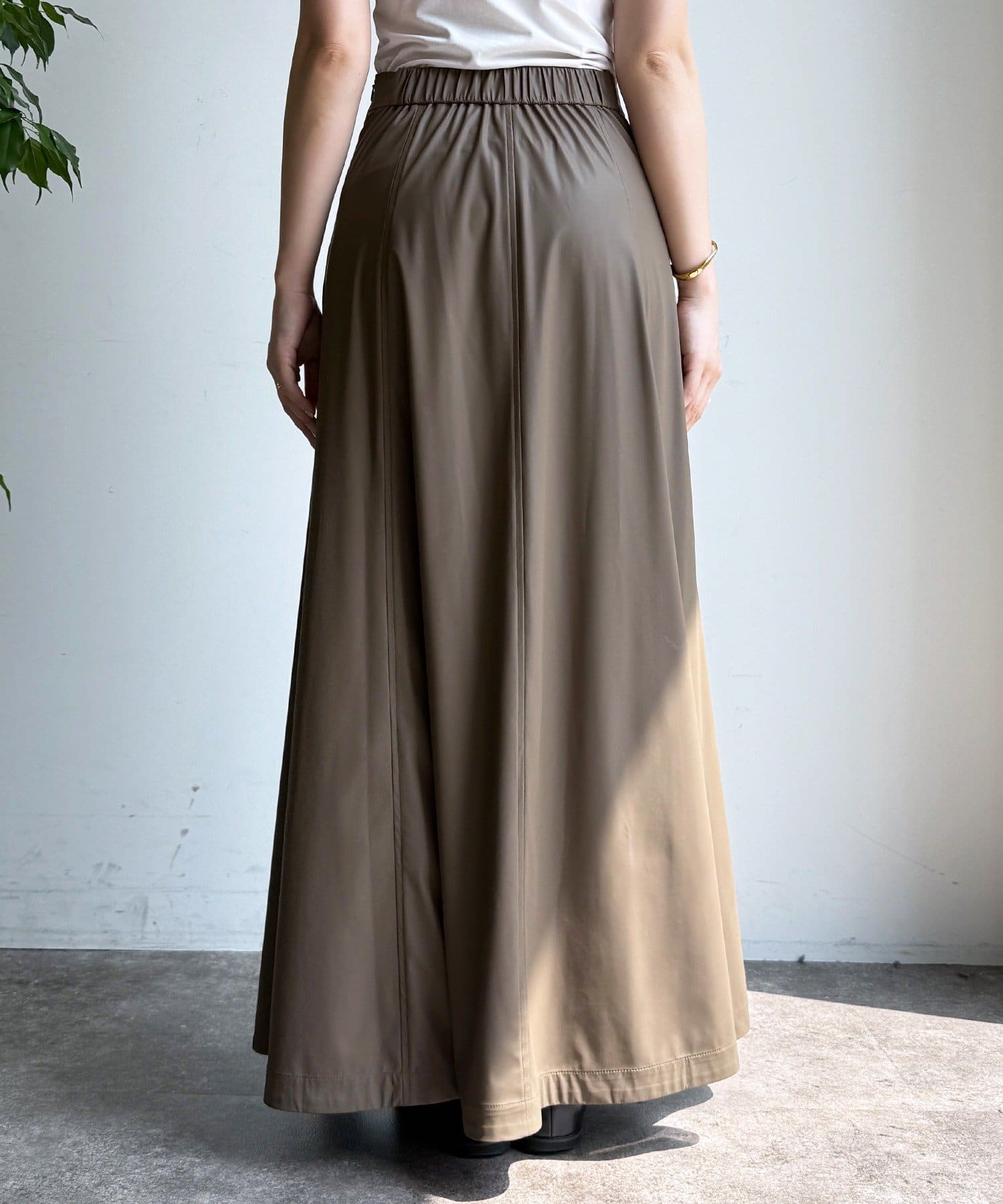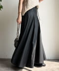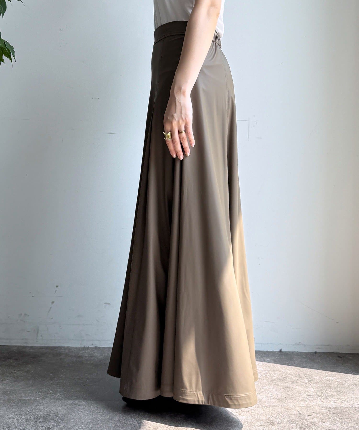 腰回りはすっきりと、裾に向かってしっかりと広がるシルエットがポイントの1着。