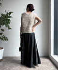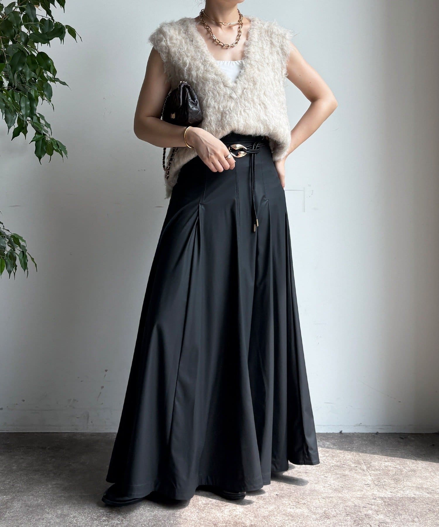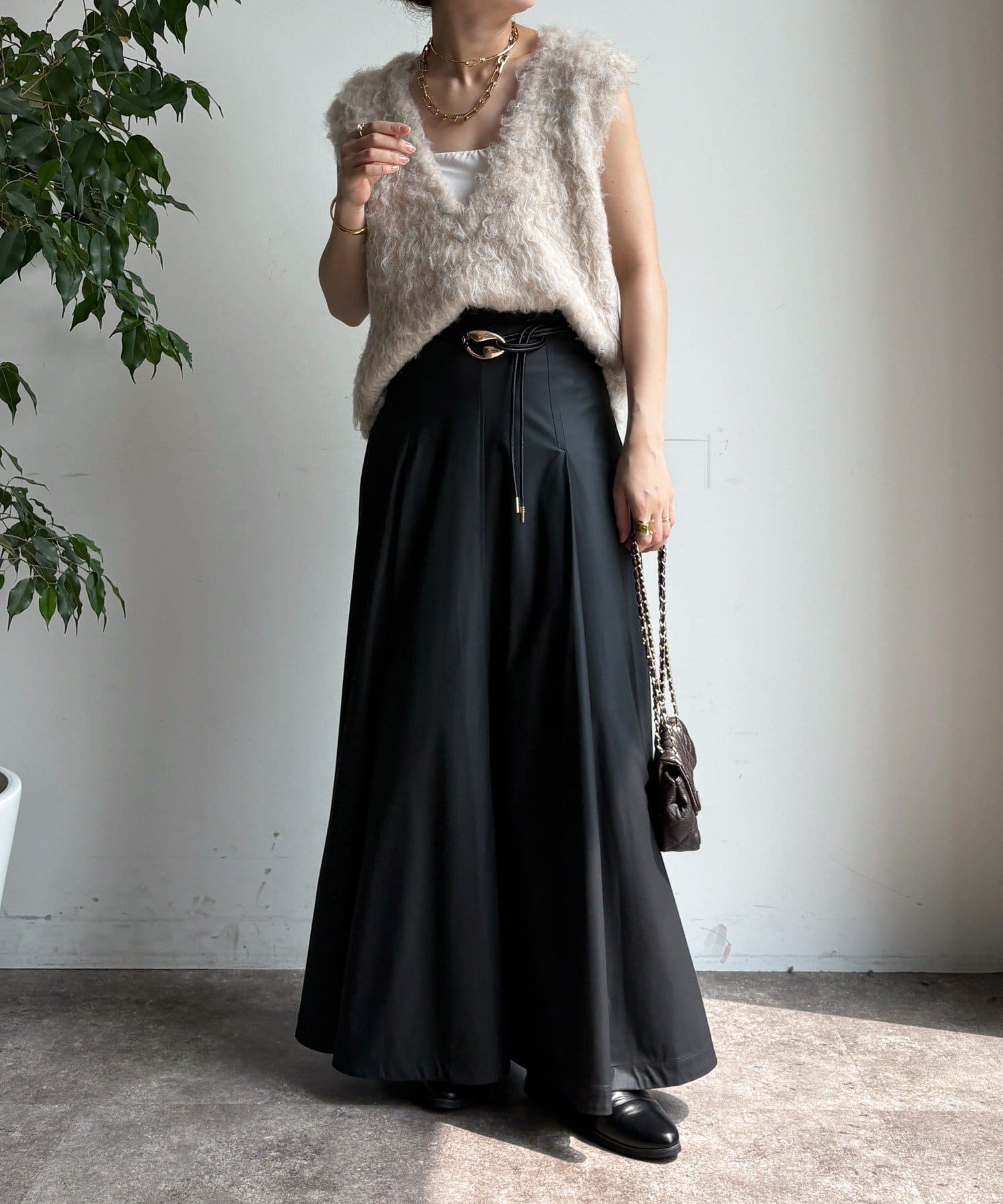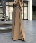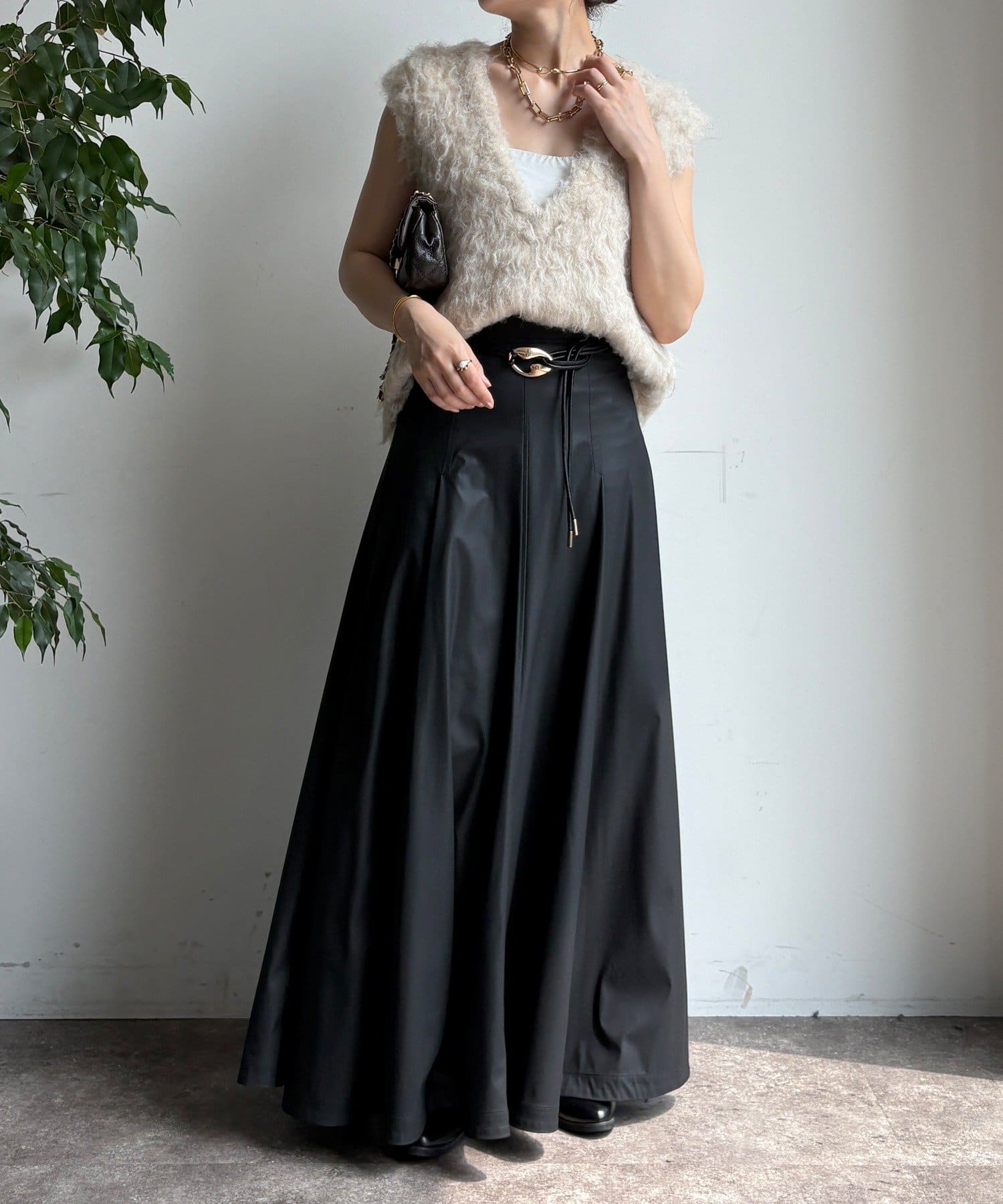 腰回りはすっきりと、裾に向かってしっかりと広がるシルエットがポイントの1着。