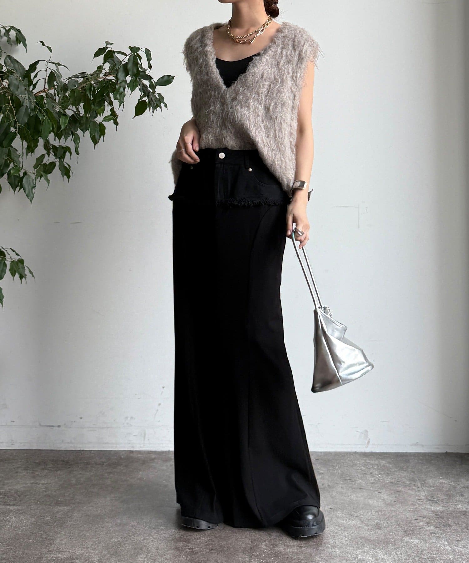 きれいめな印象のマーメイドスカートを、ウエストデニム切替で、デイリーユースしやすいデザインにアップデート。