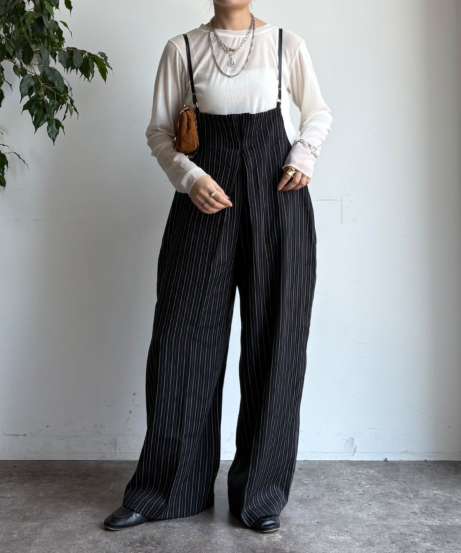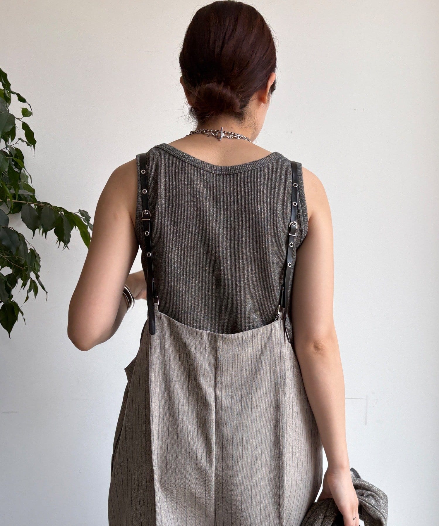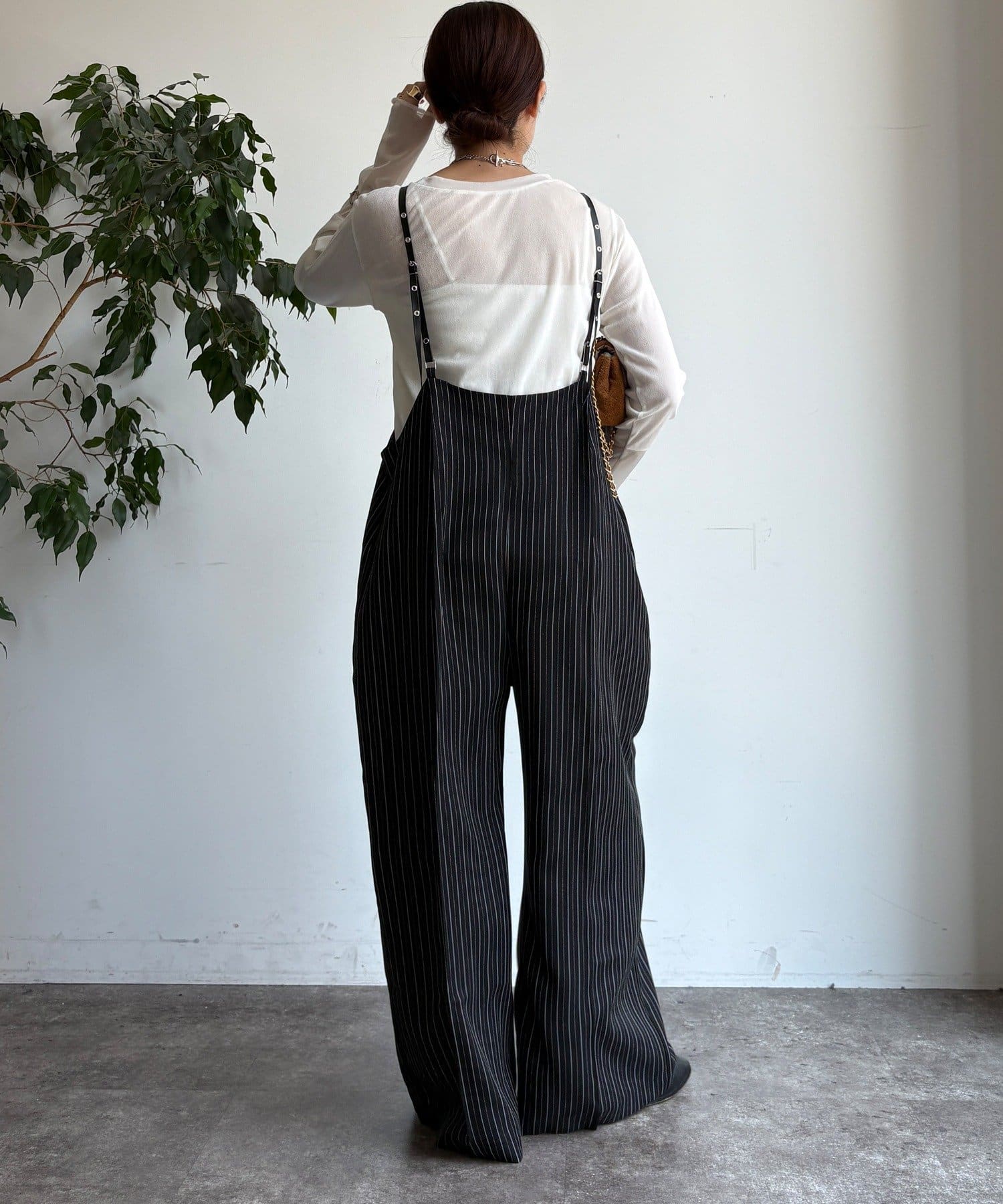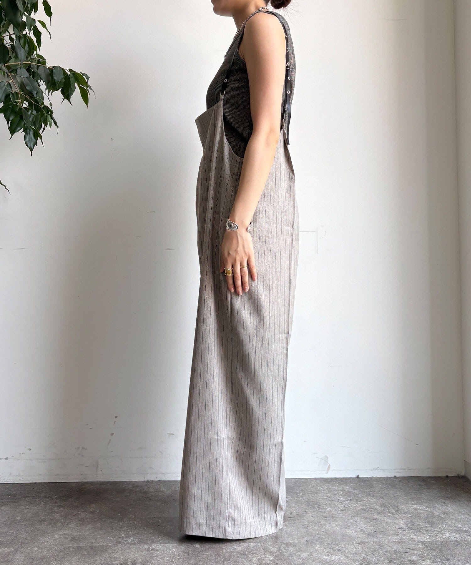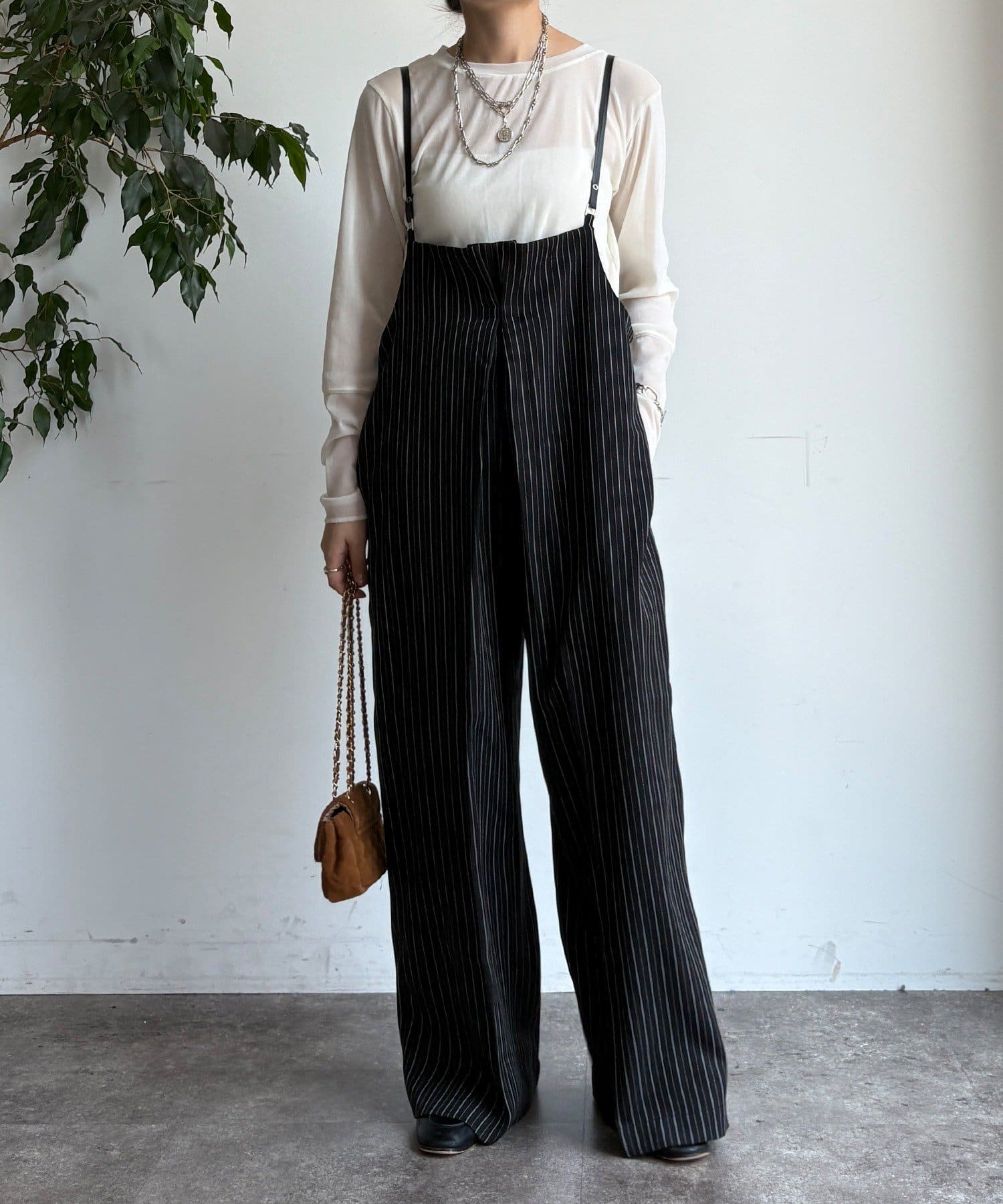 細めのお洒落なサスペンダーは、カジュアルになりすぎず、上品な印象。