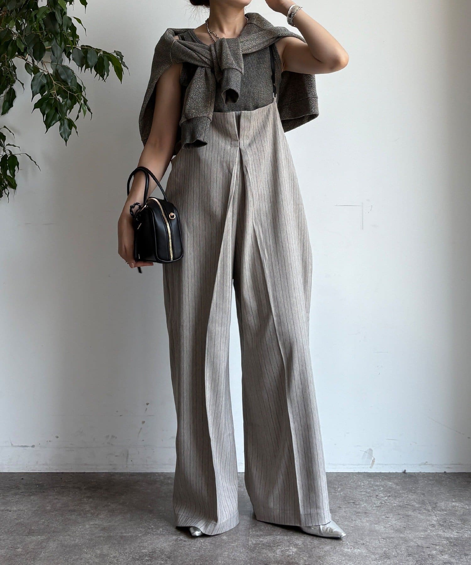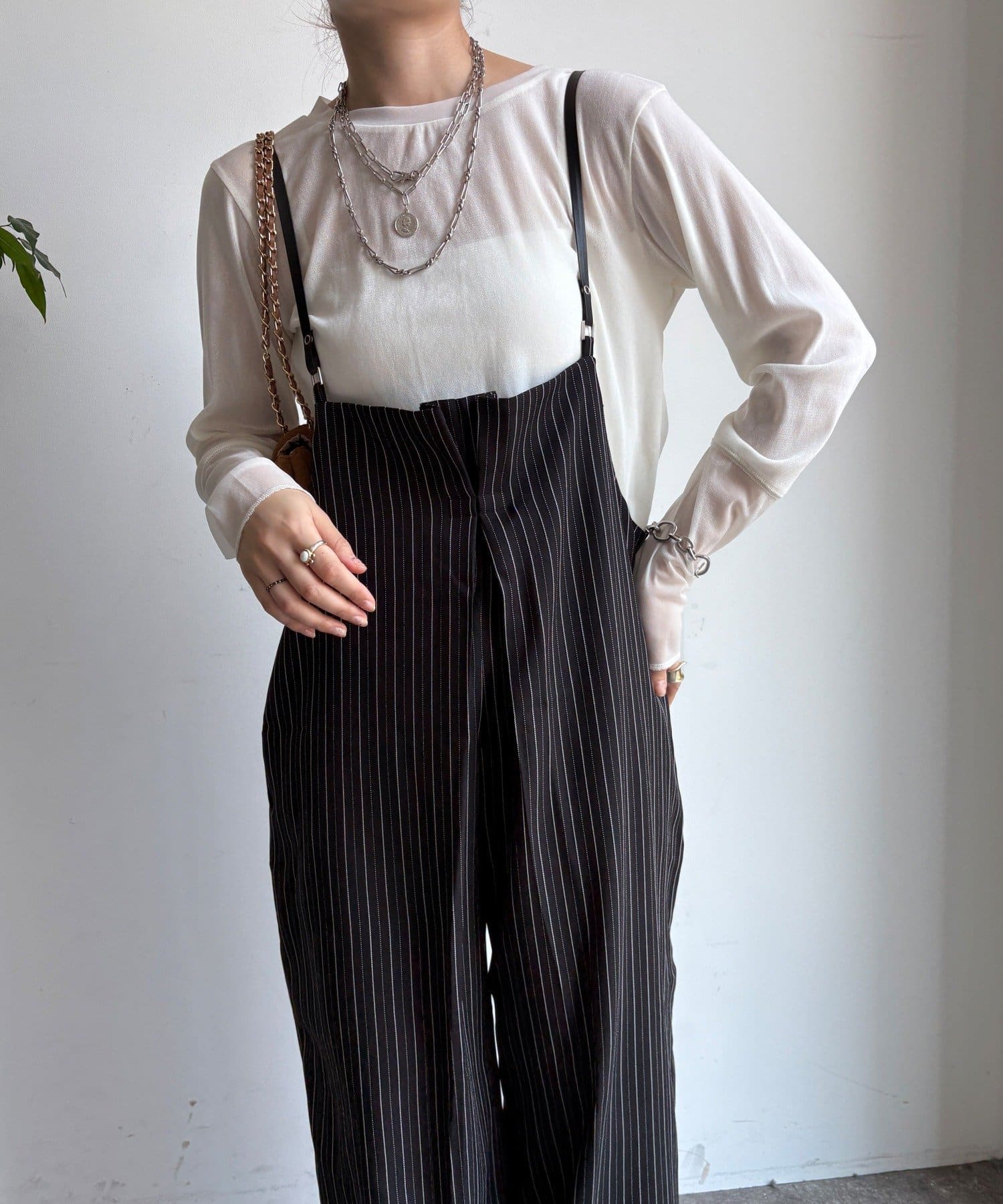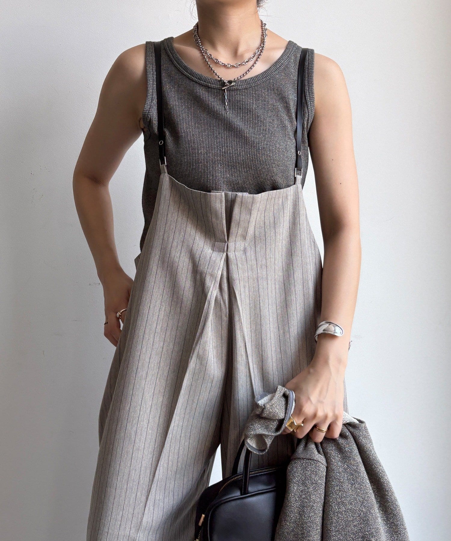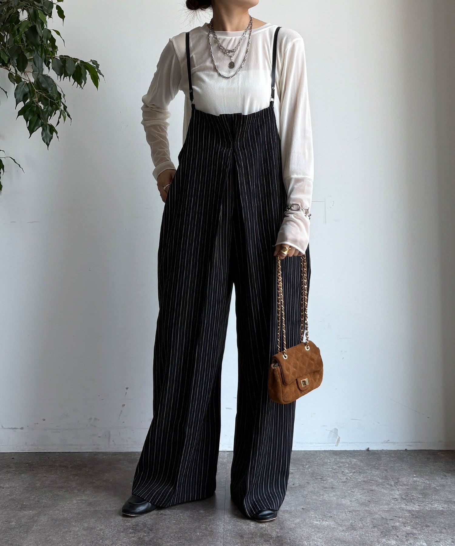 細めのお洒落なサスペンダーは、カジュアルになりすぎず、上品な印象。