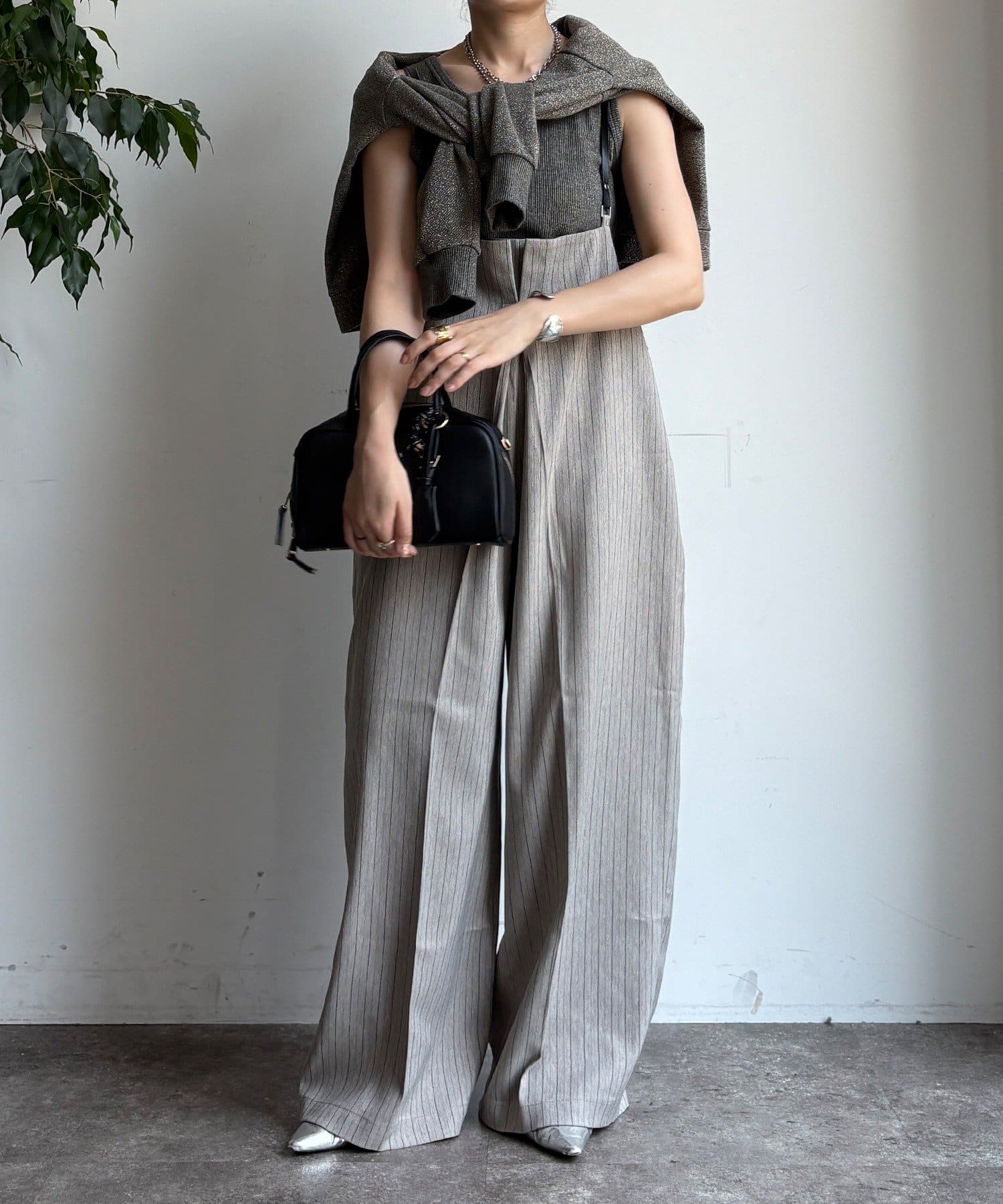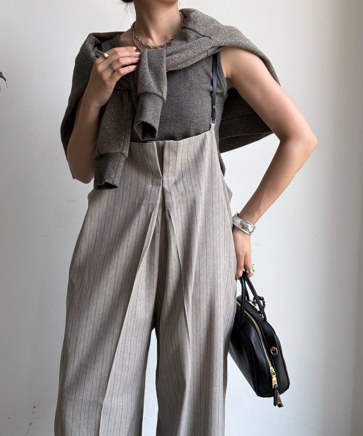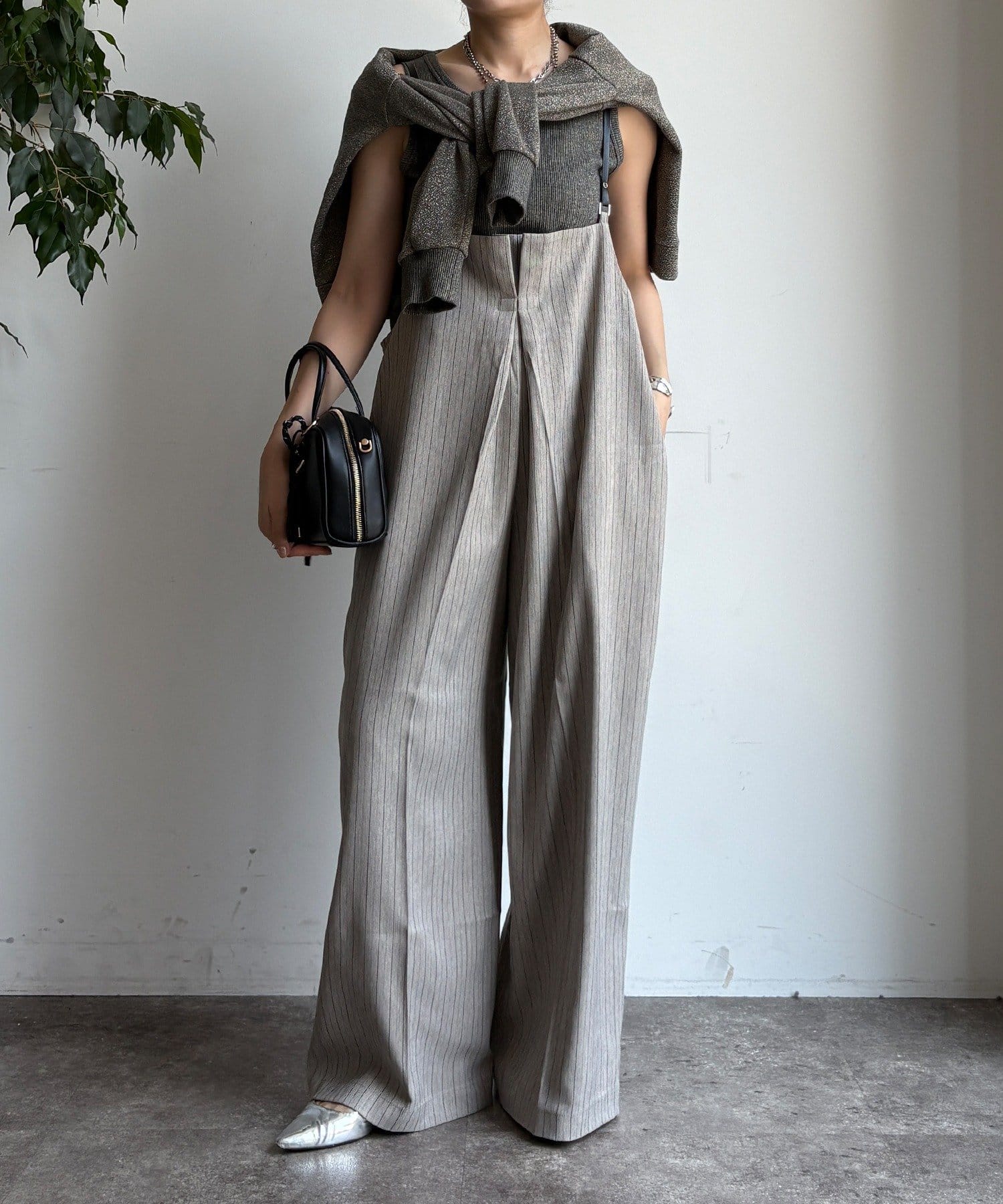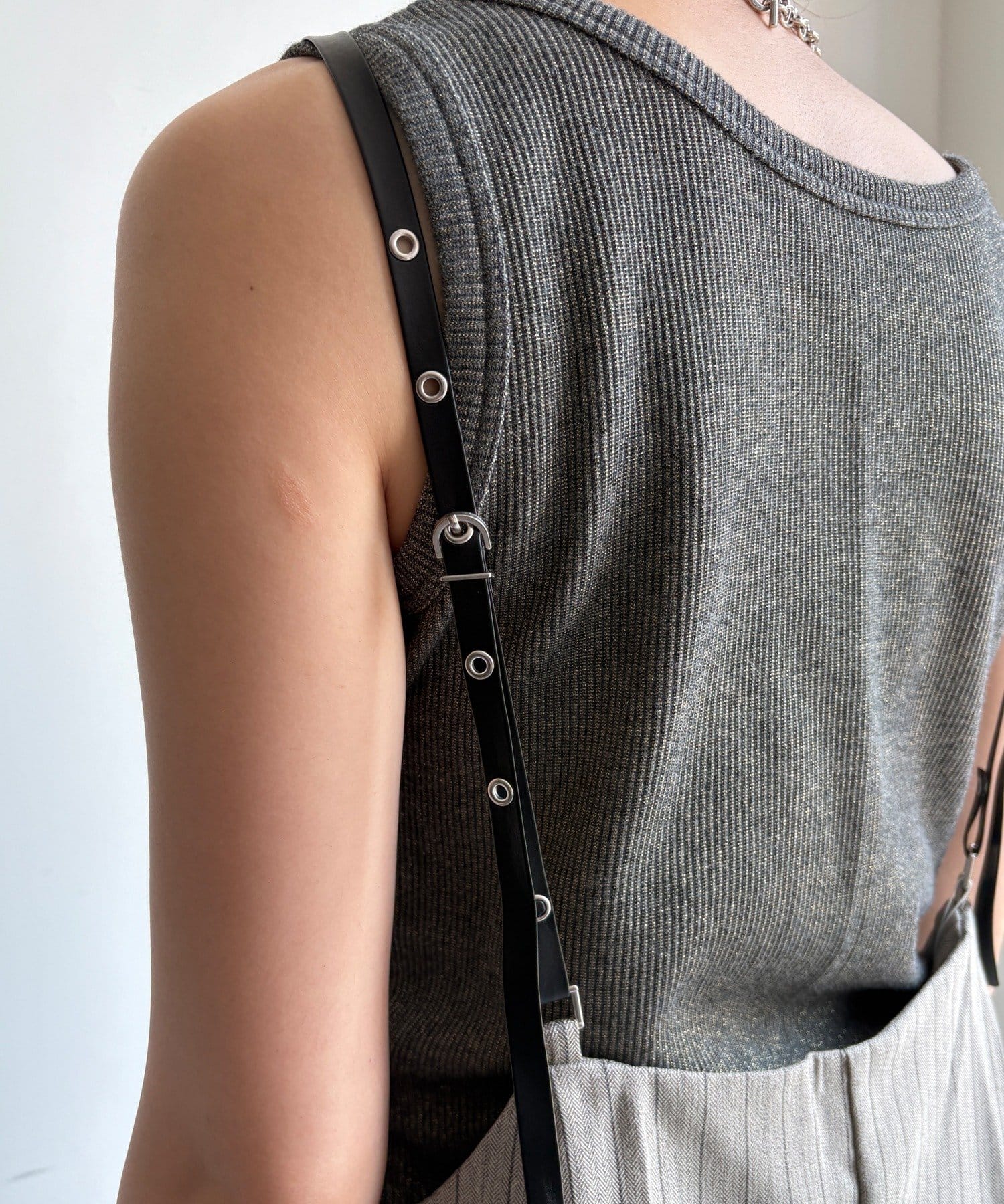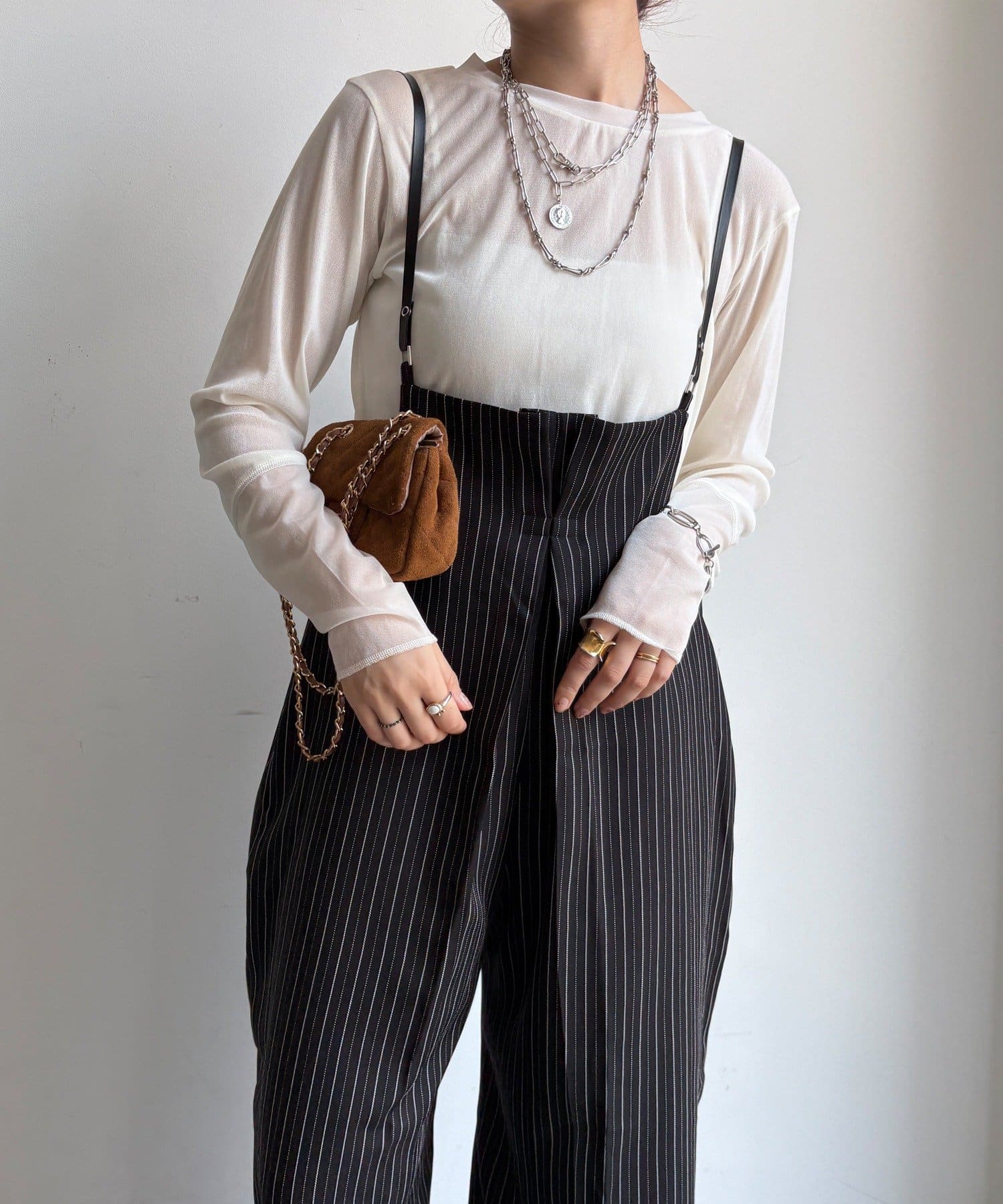 細めのお洒落なサスペンダーは、カジュアルになりすぎず、上品な印象。