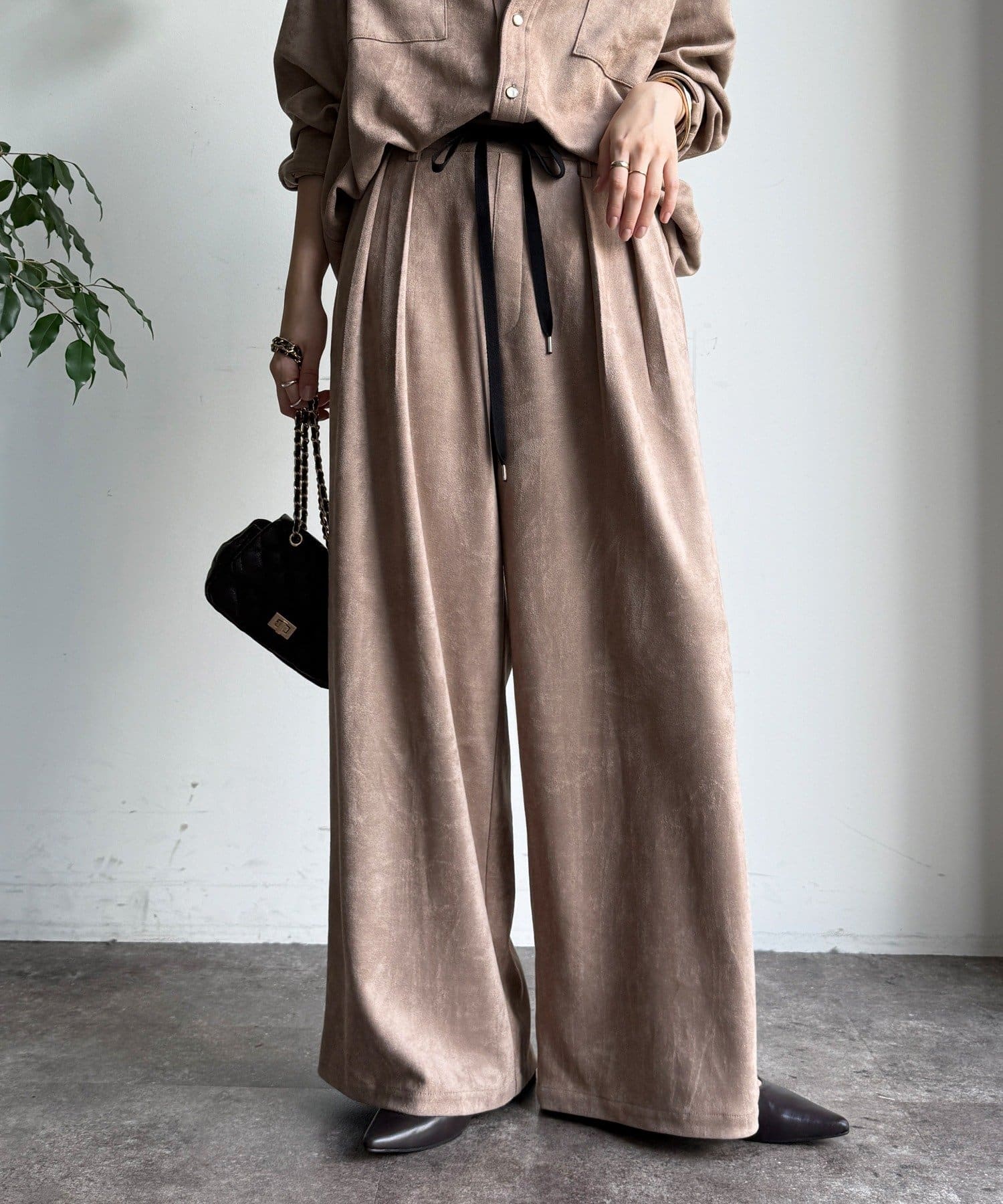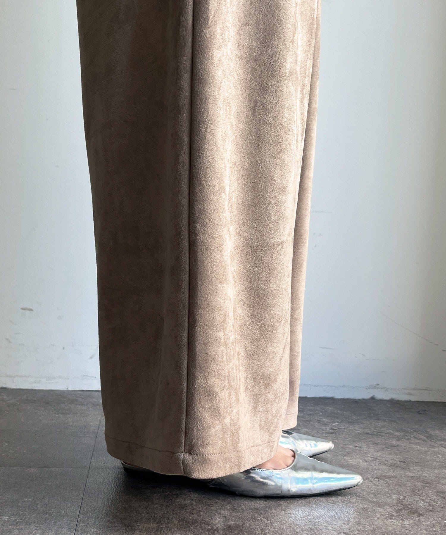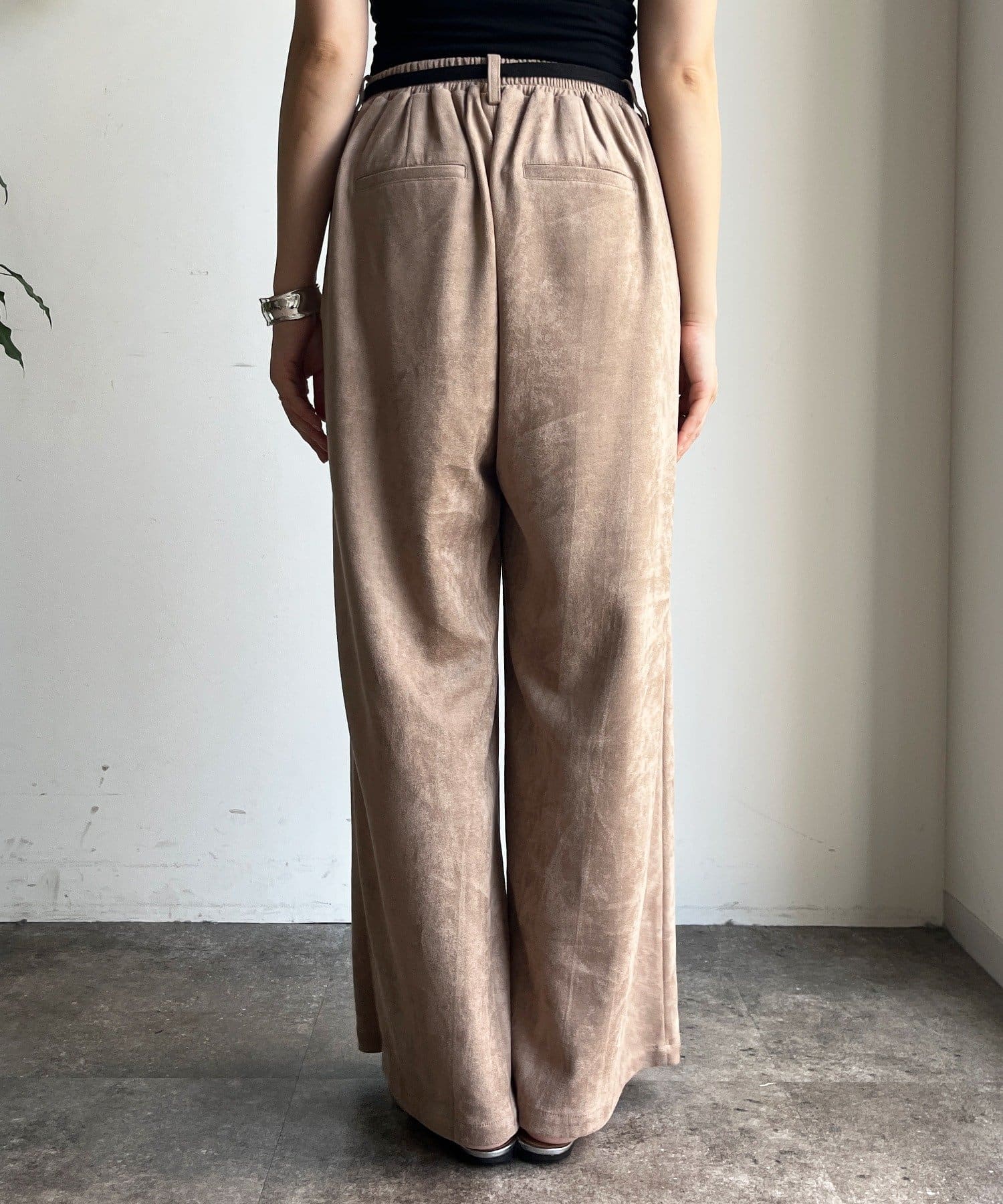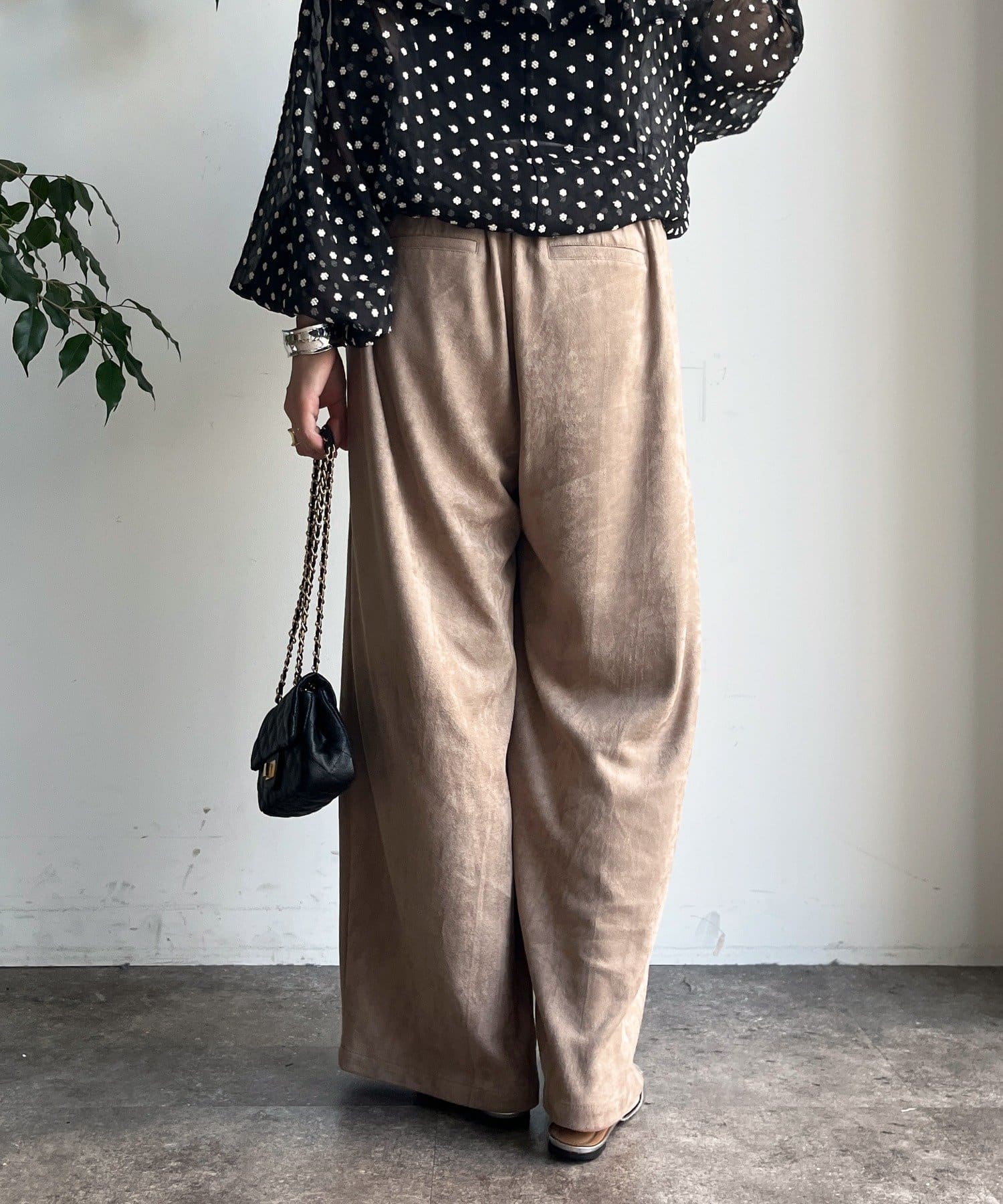 今季トレンドのスウェード素材を使用したタックパンツ。