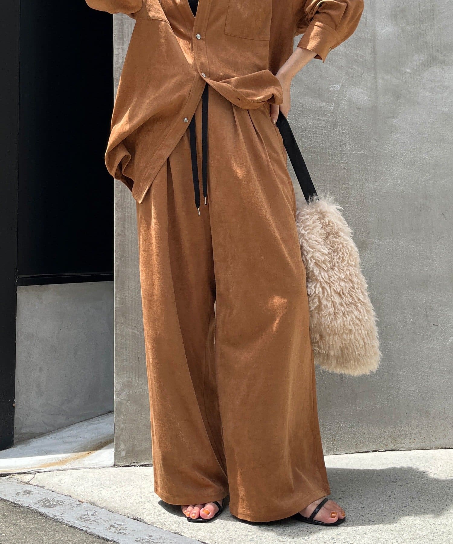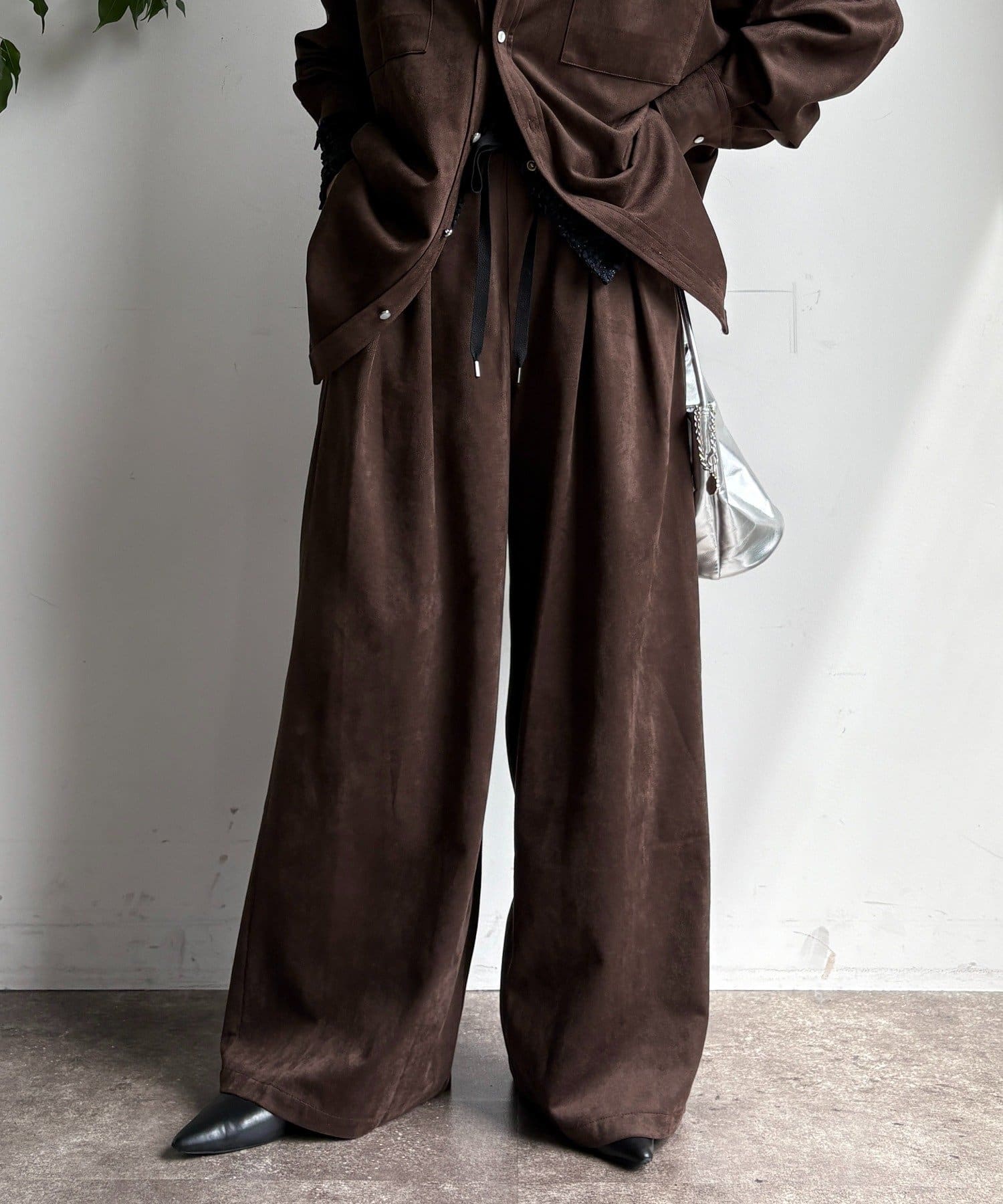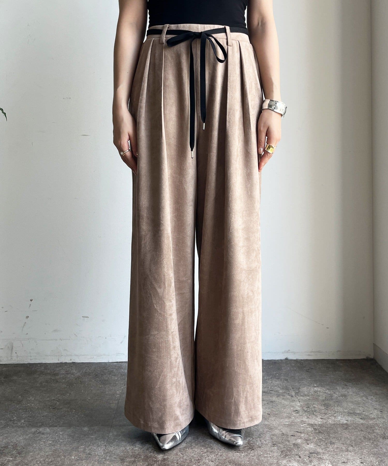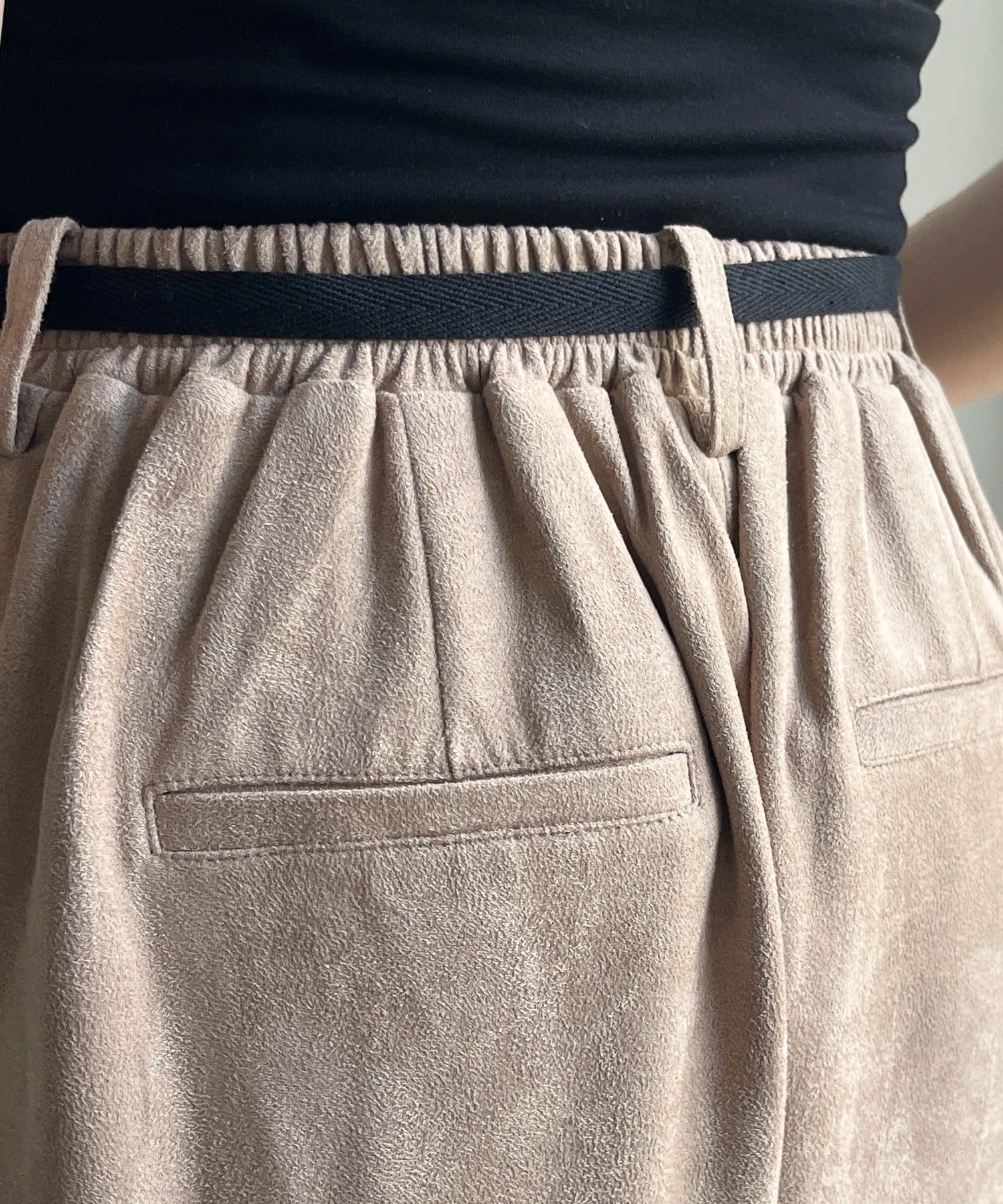 今季トレンドのスウェード素材を使用したタックパンツ。