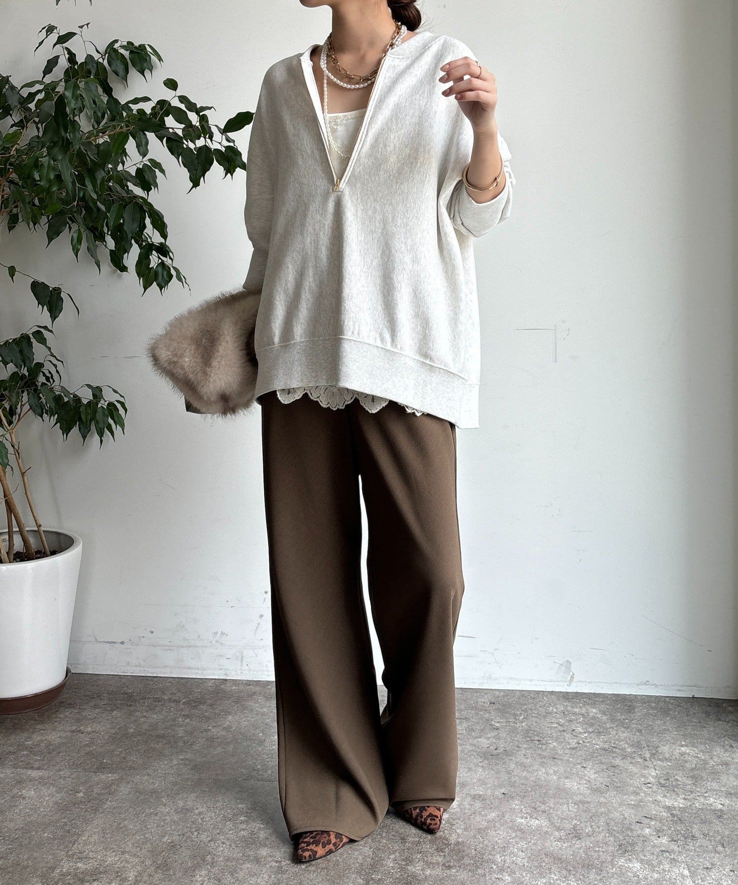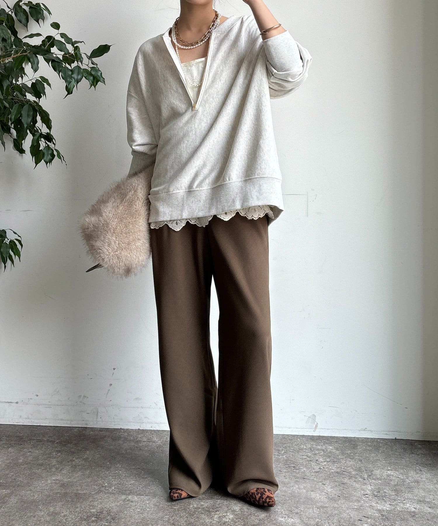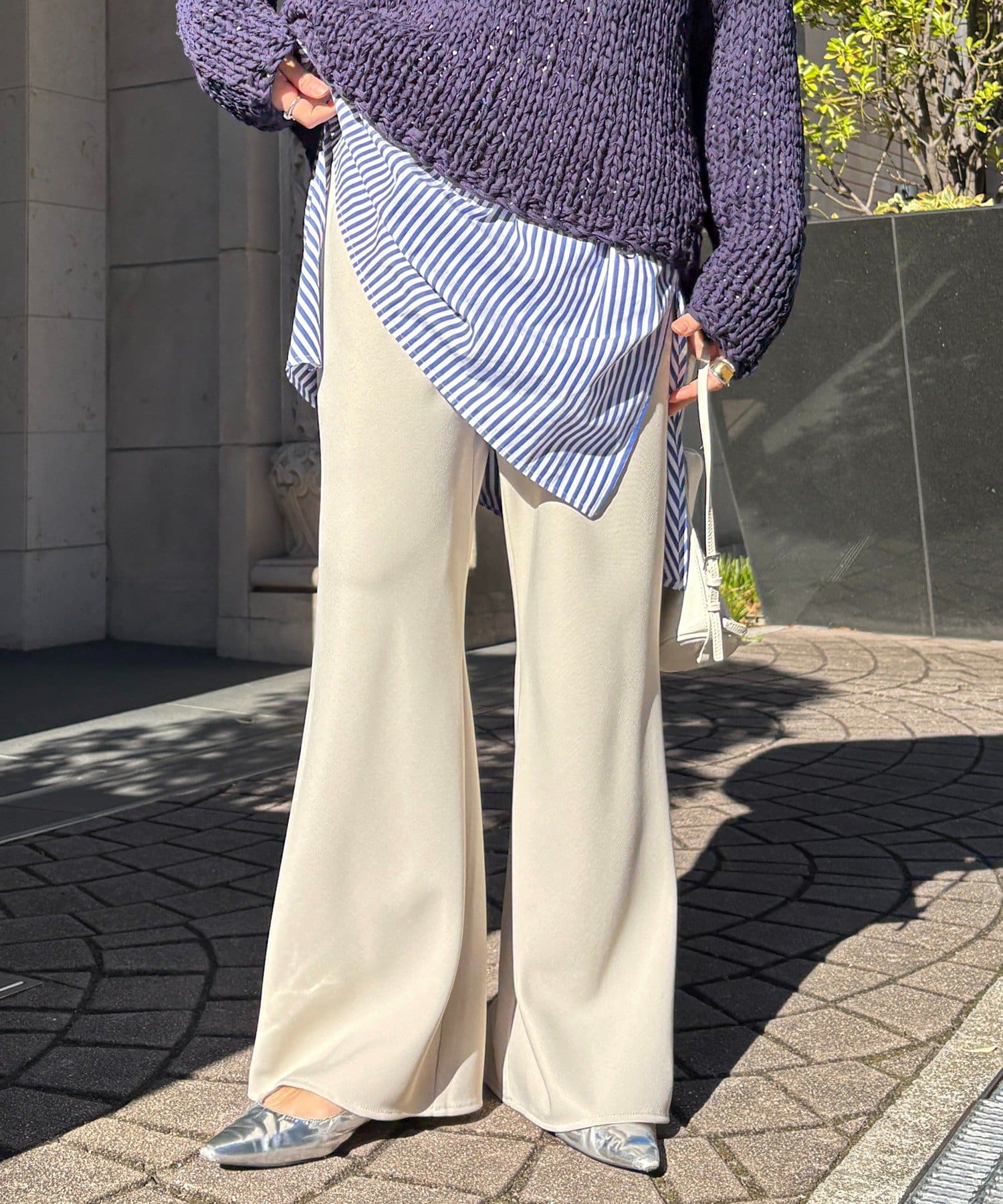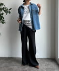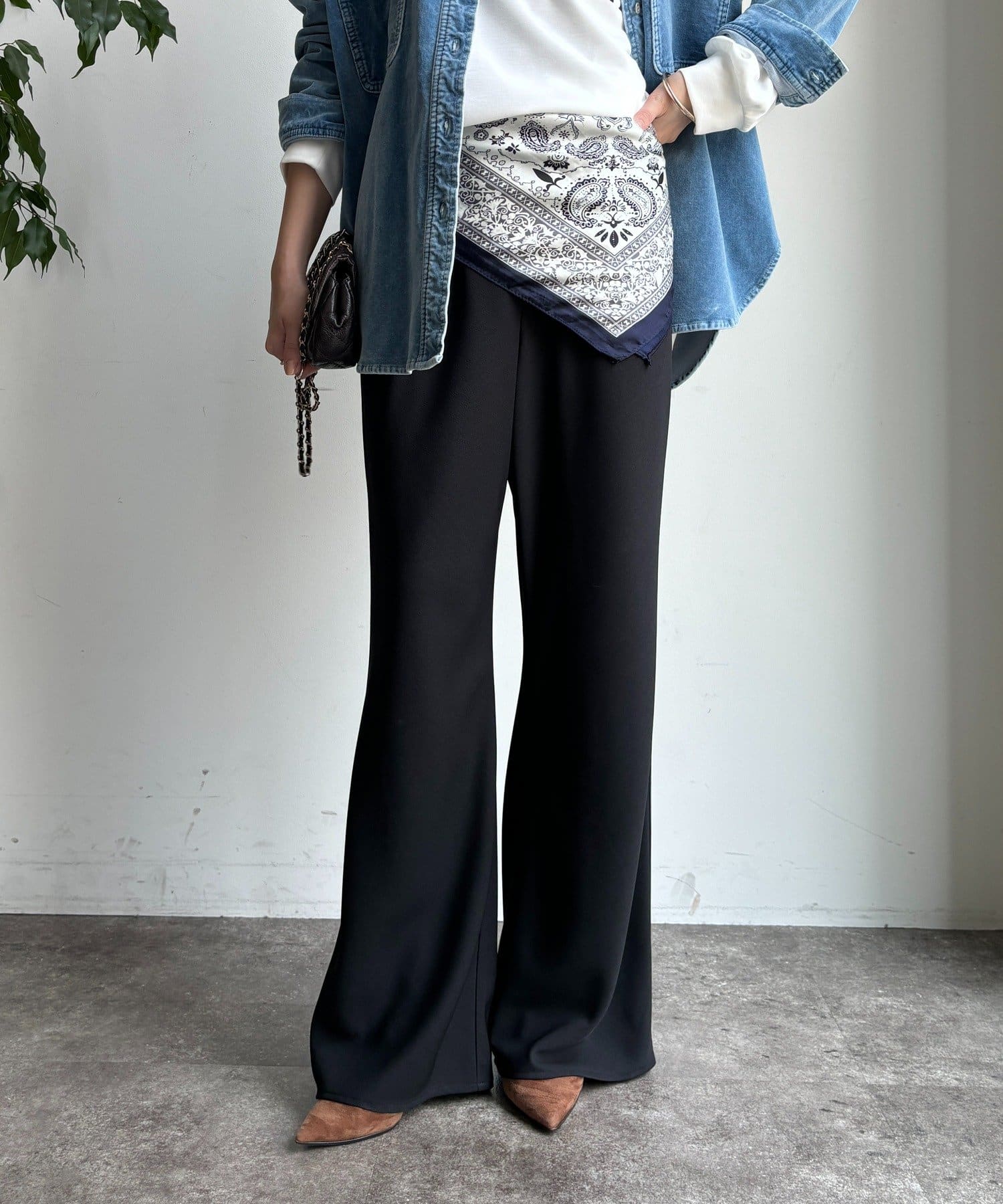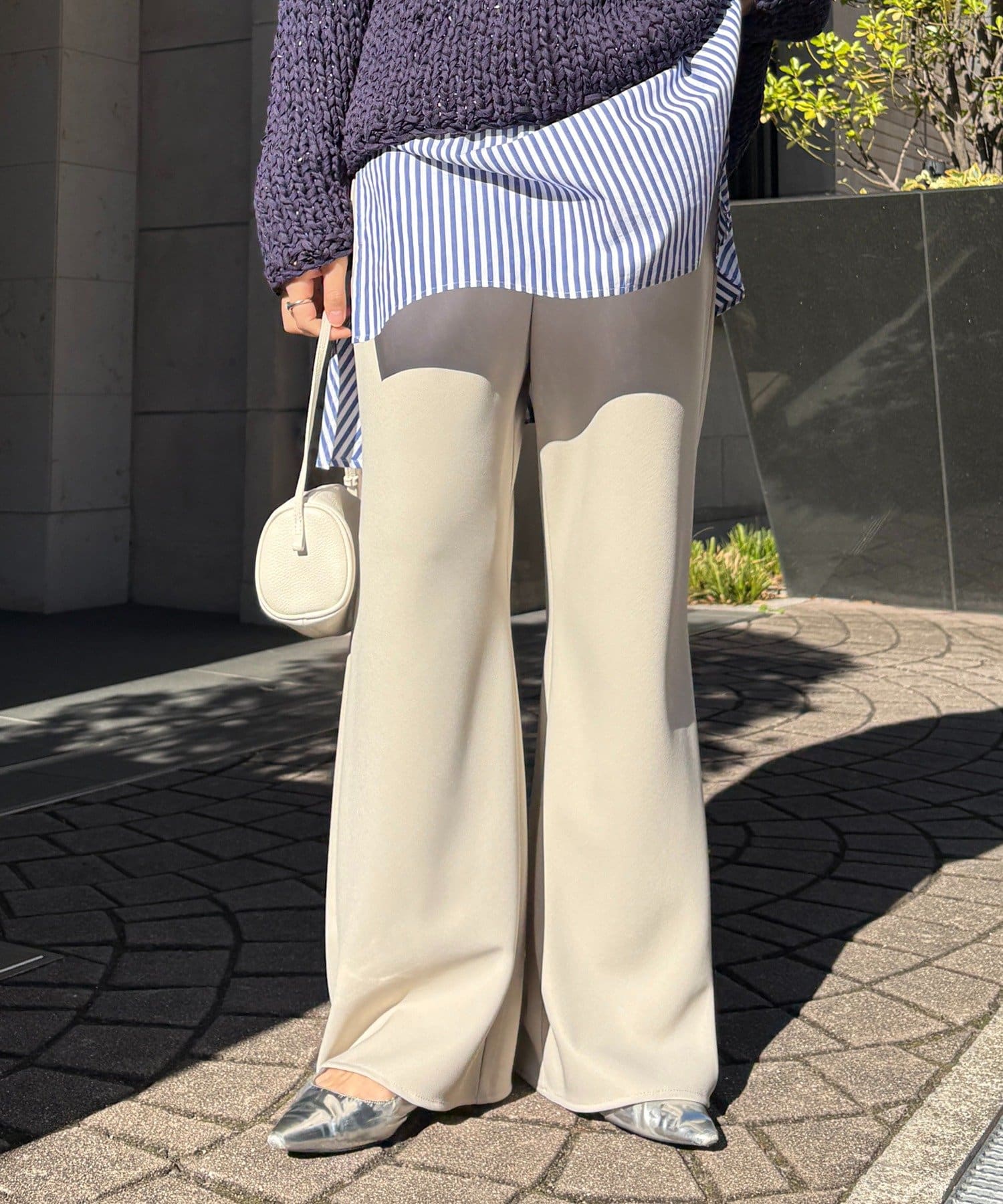 フレアに広がるシルエットで、細見えが叶うパンツ。