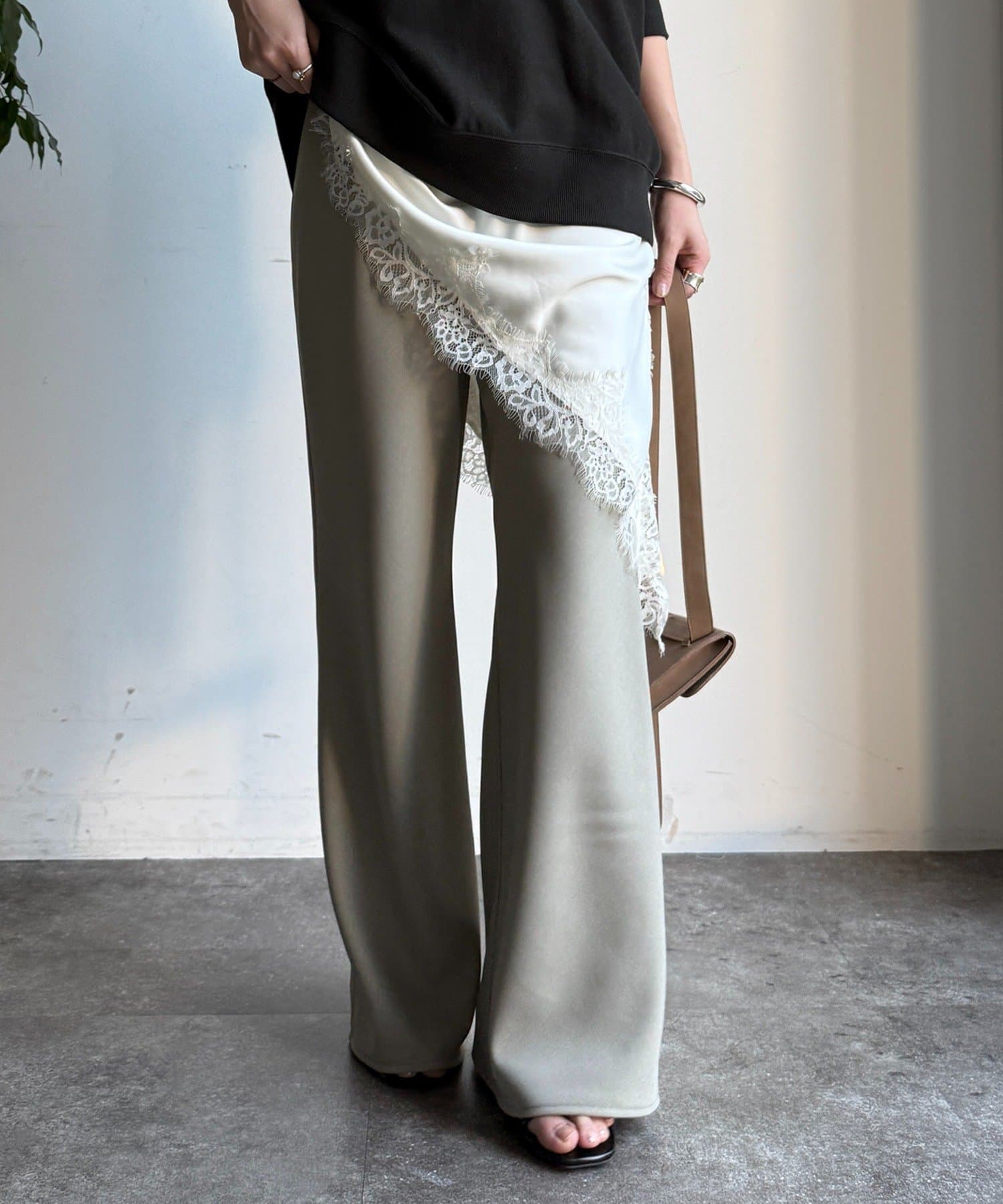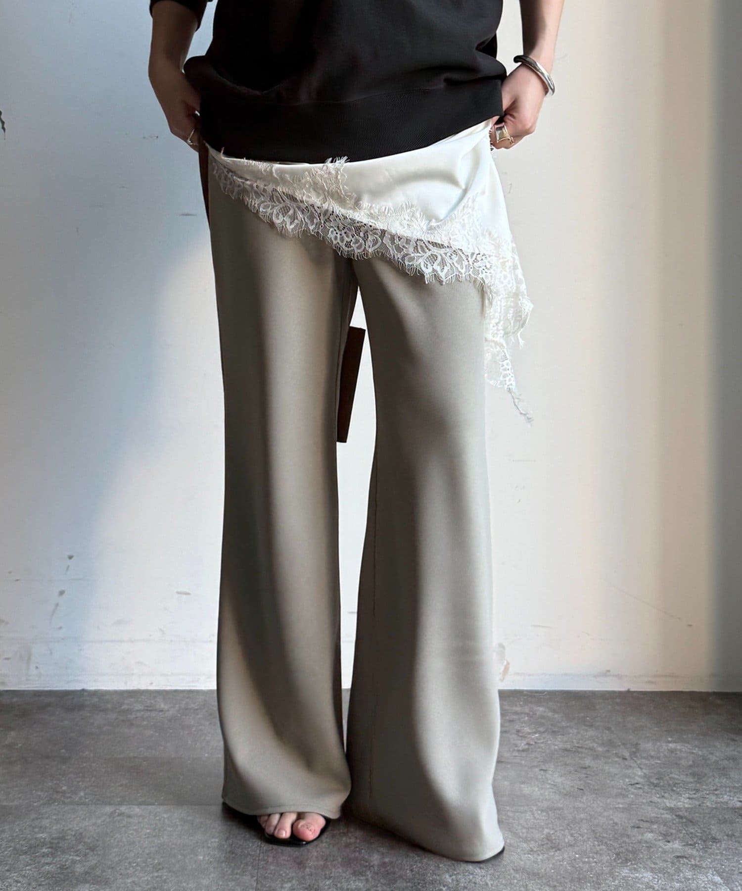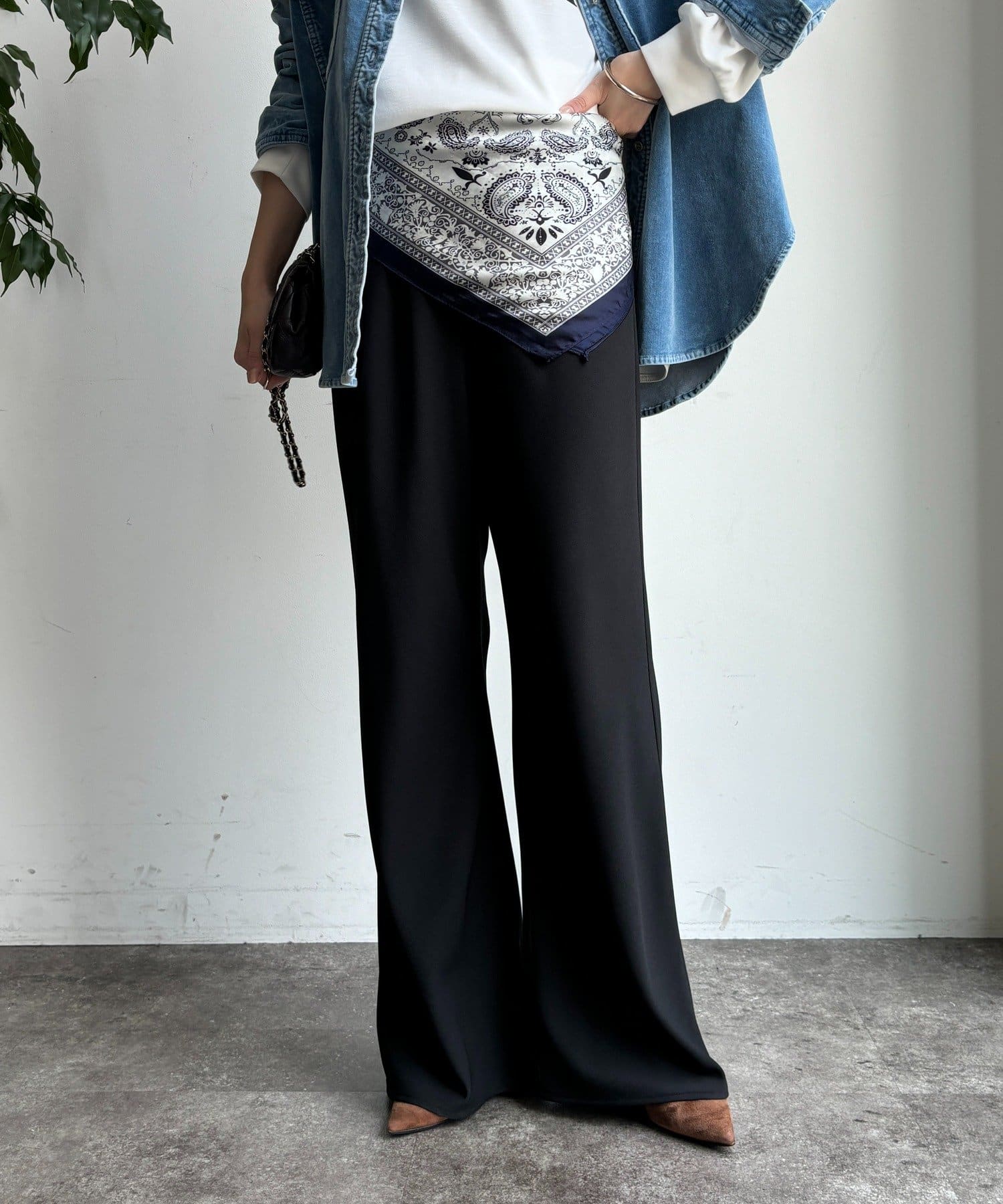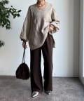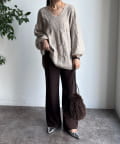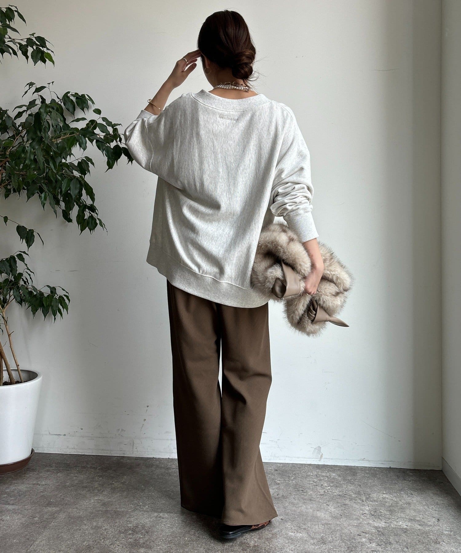 フレアに広がるシルエットで、細見えが叶うパンツ。