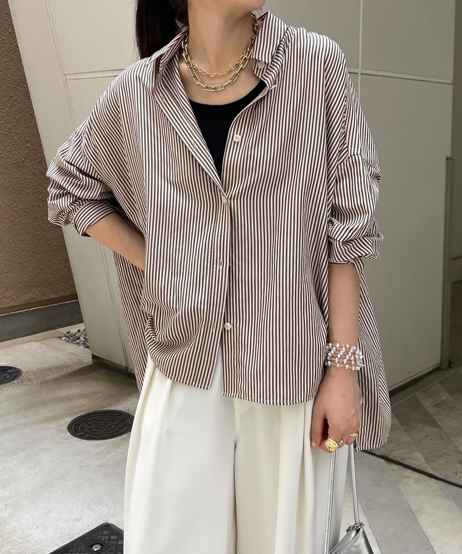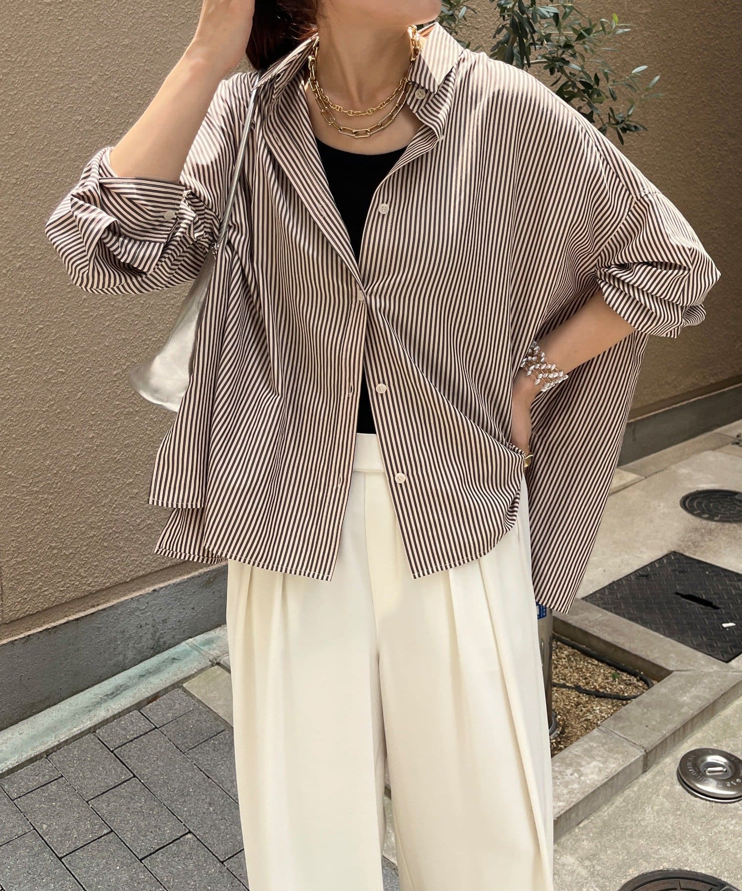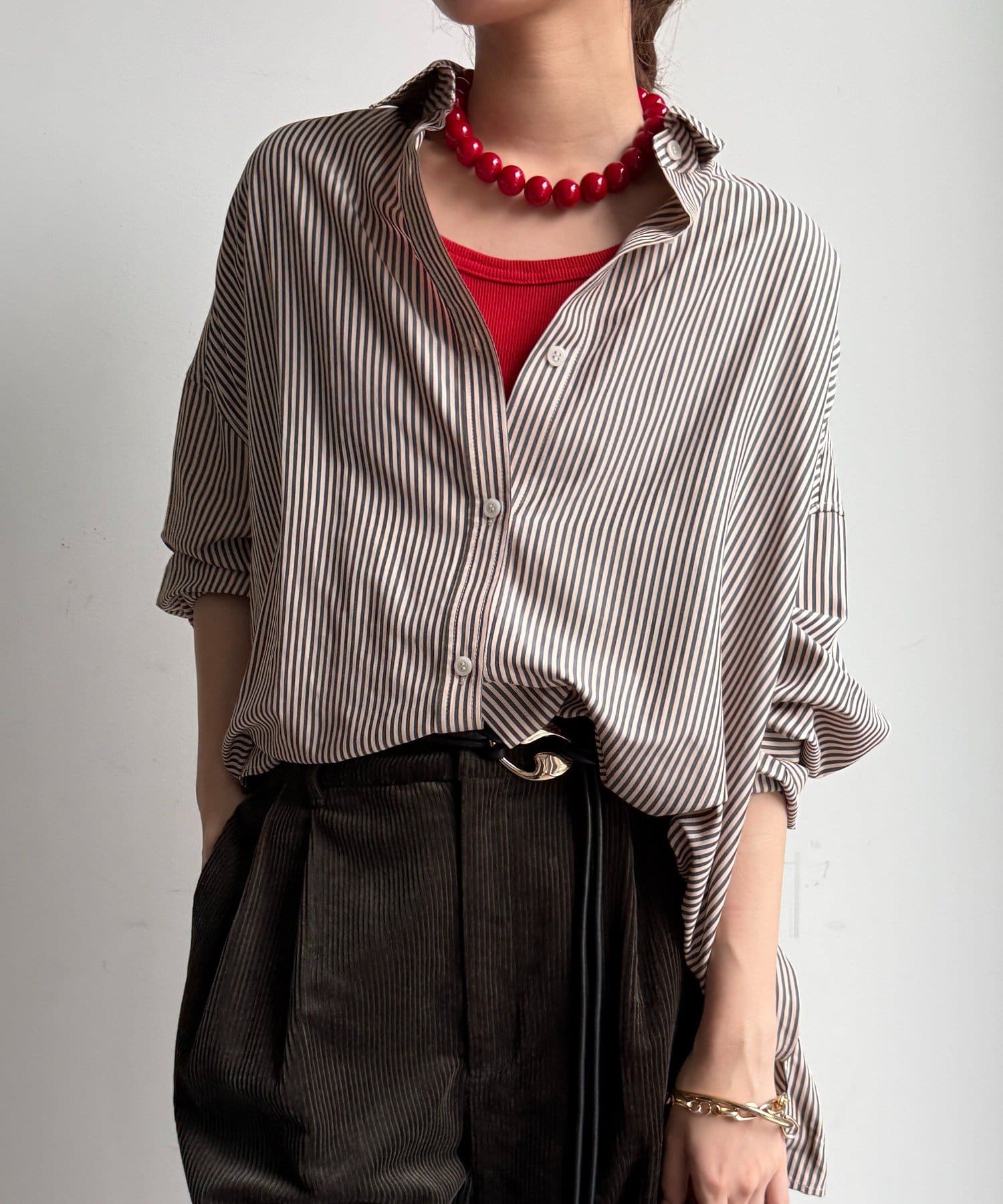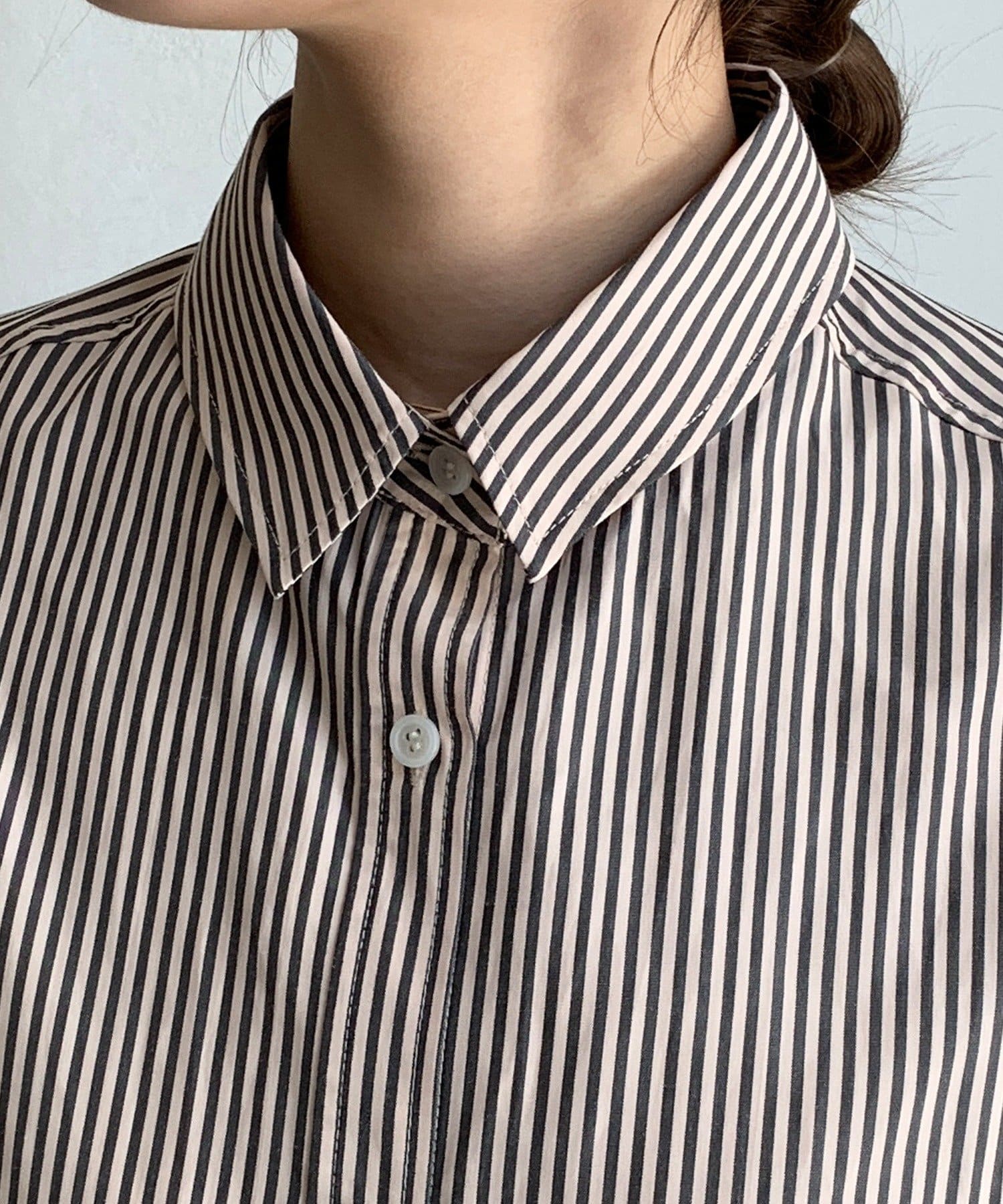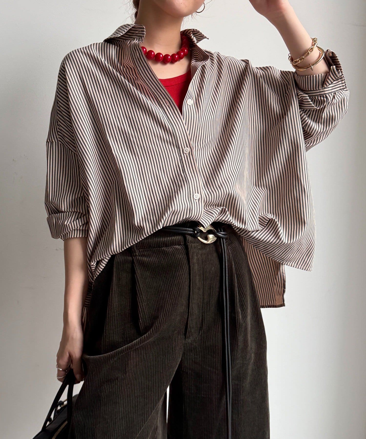 コーディネートに取り込みやすい細ストライプ柄がポイントとなってくれるシャツ。