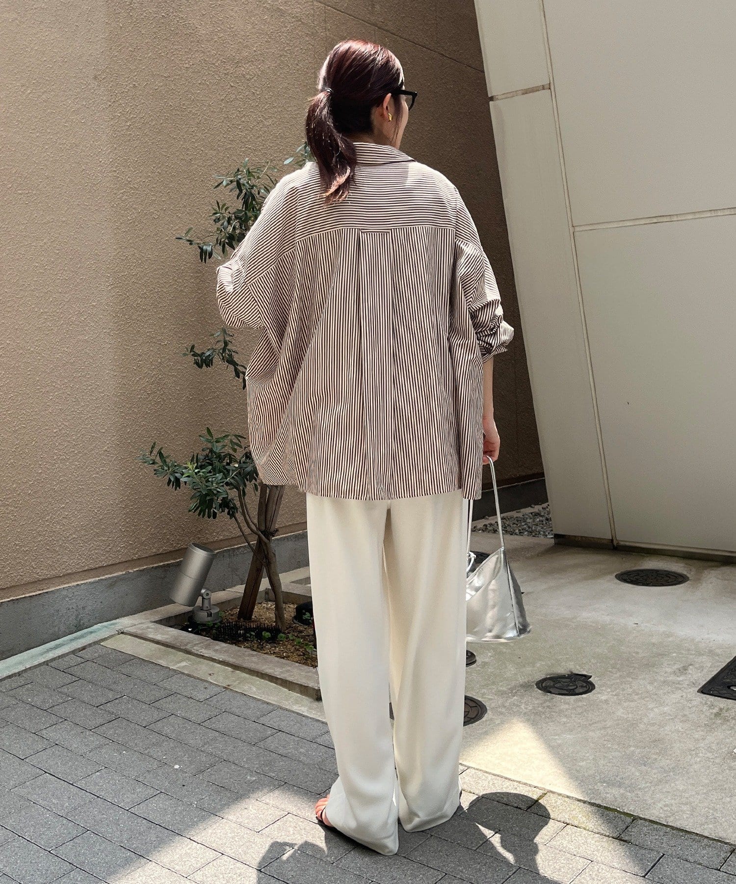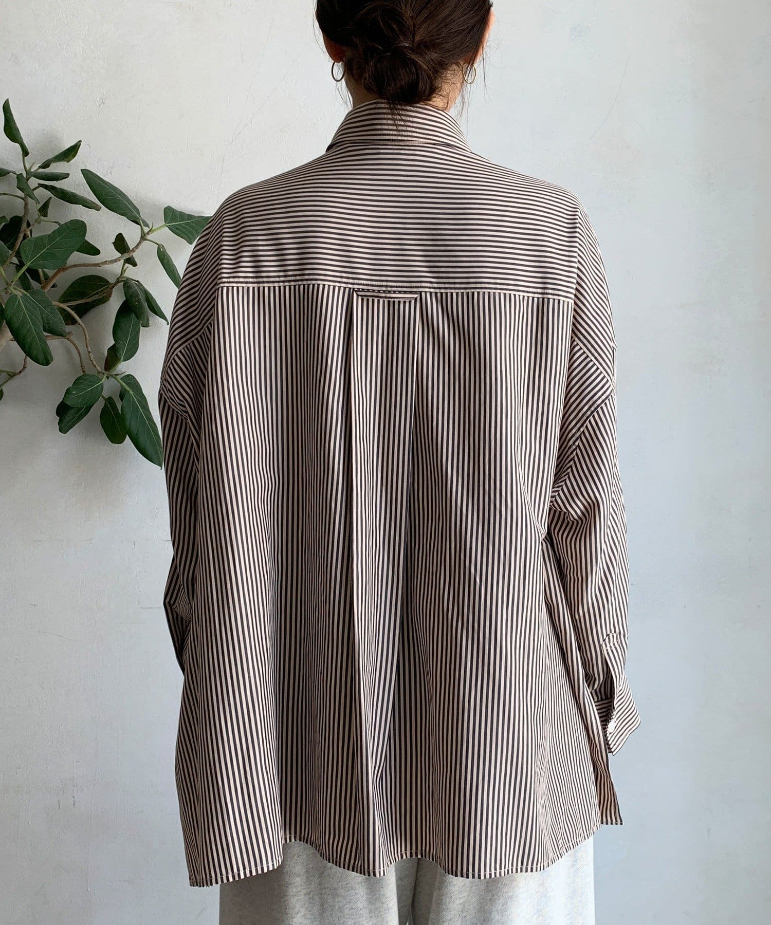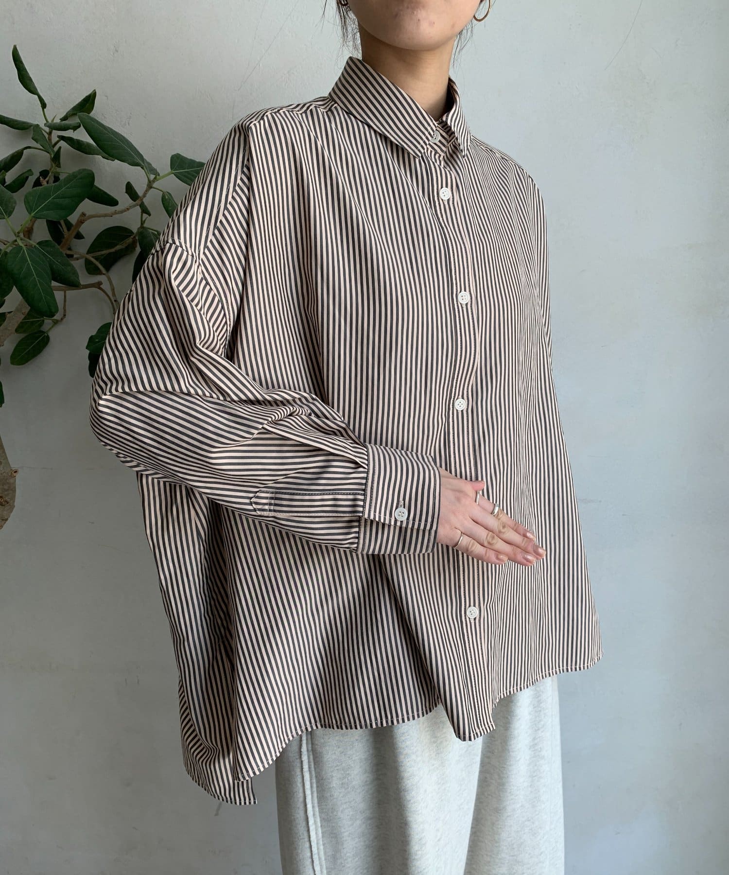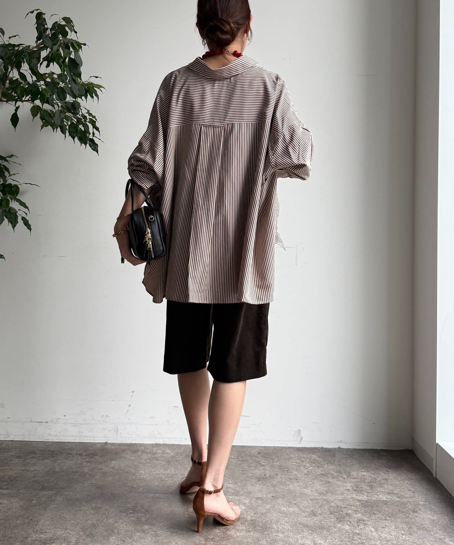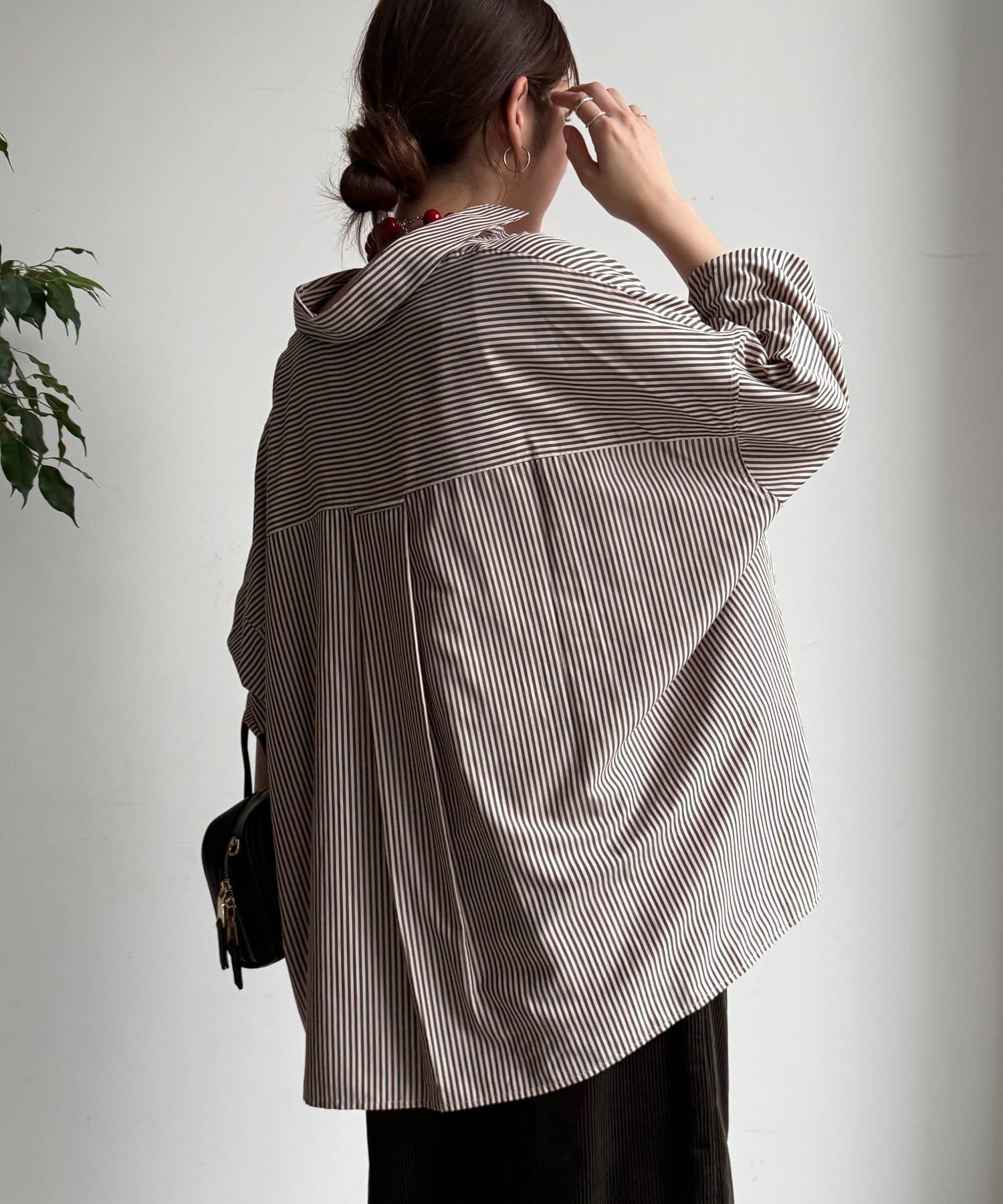 コーディネートに取り込みやすい細ストライプ柄がポイントとなってくれるシャツ。