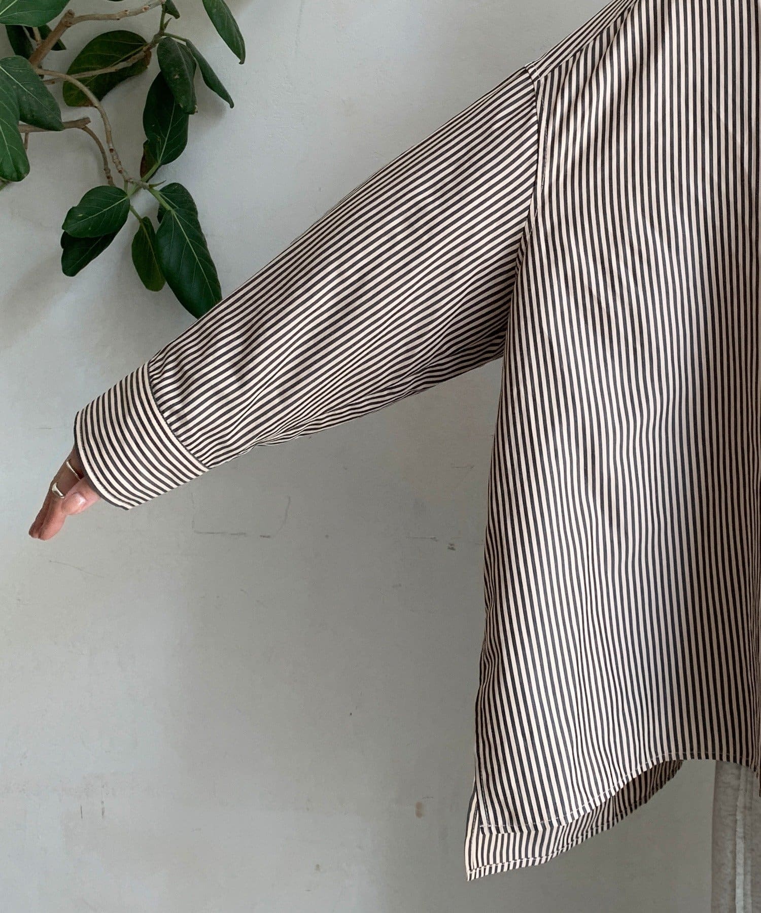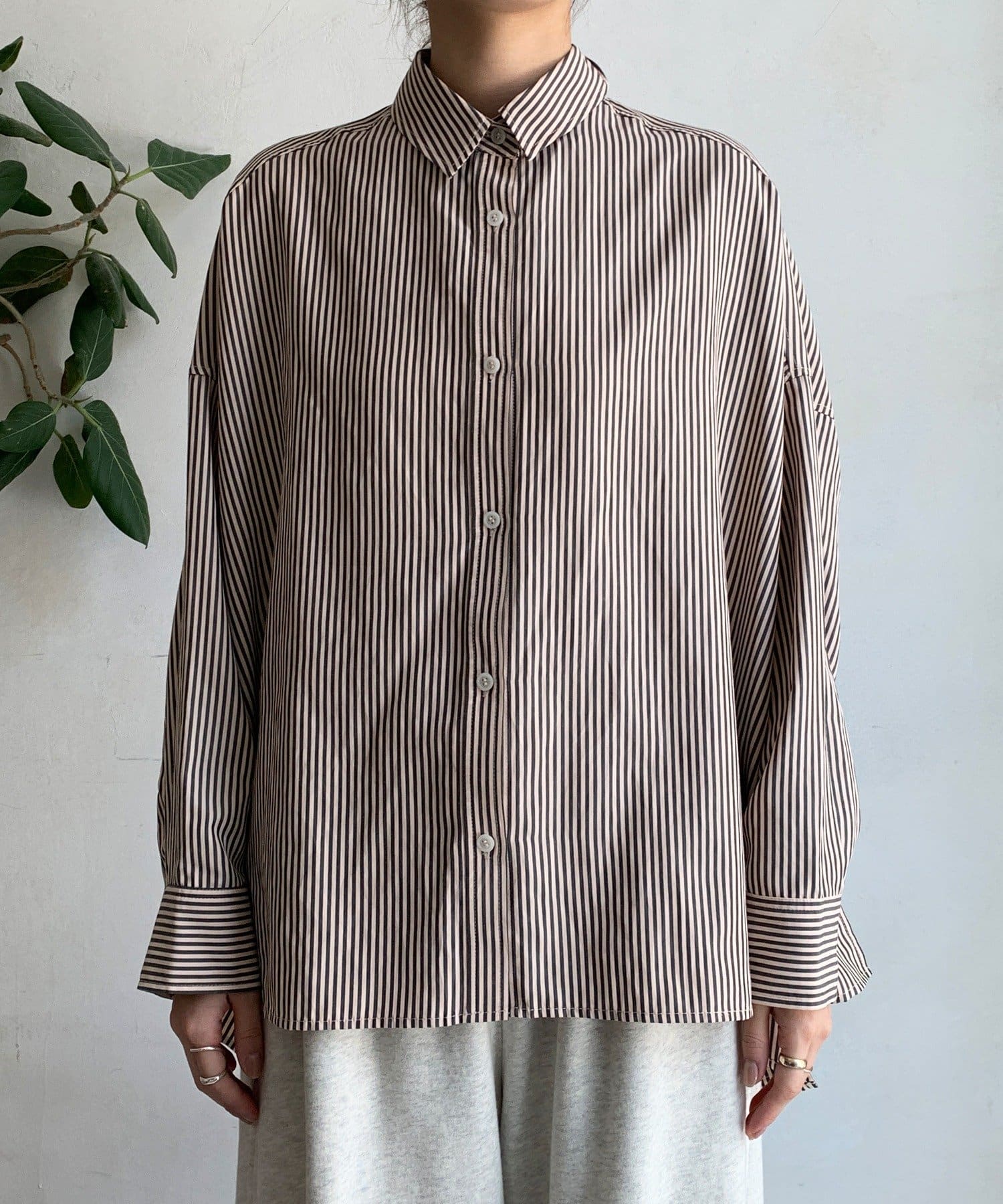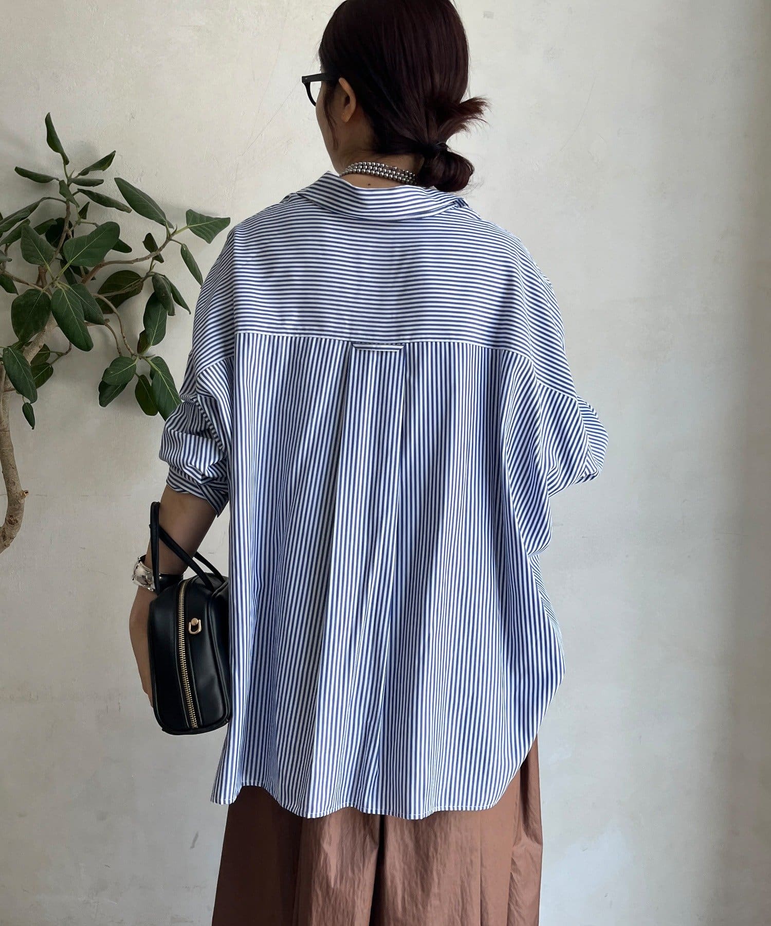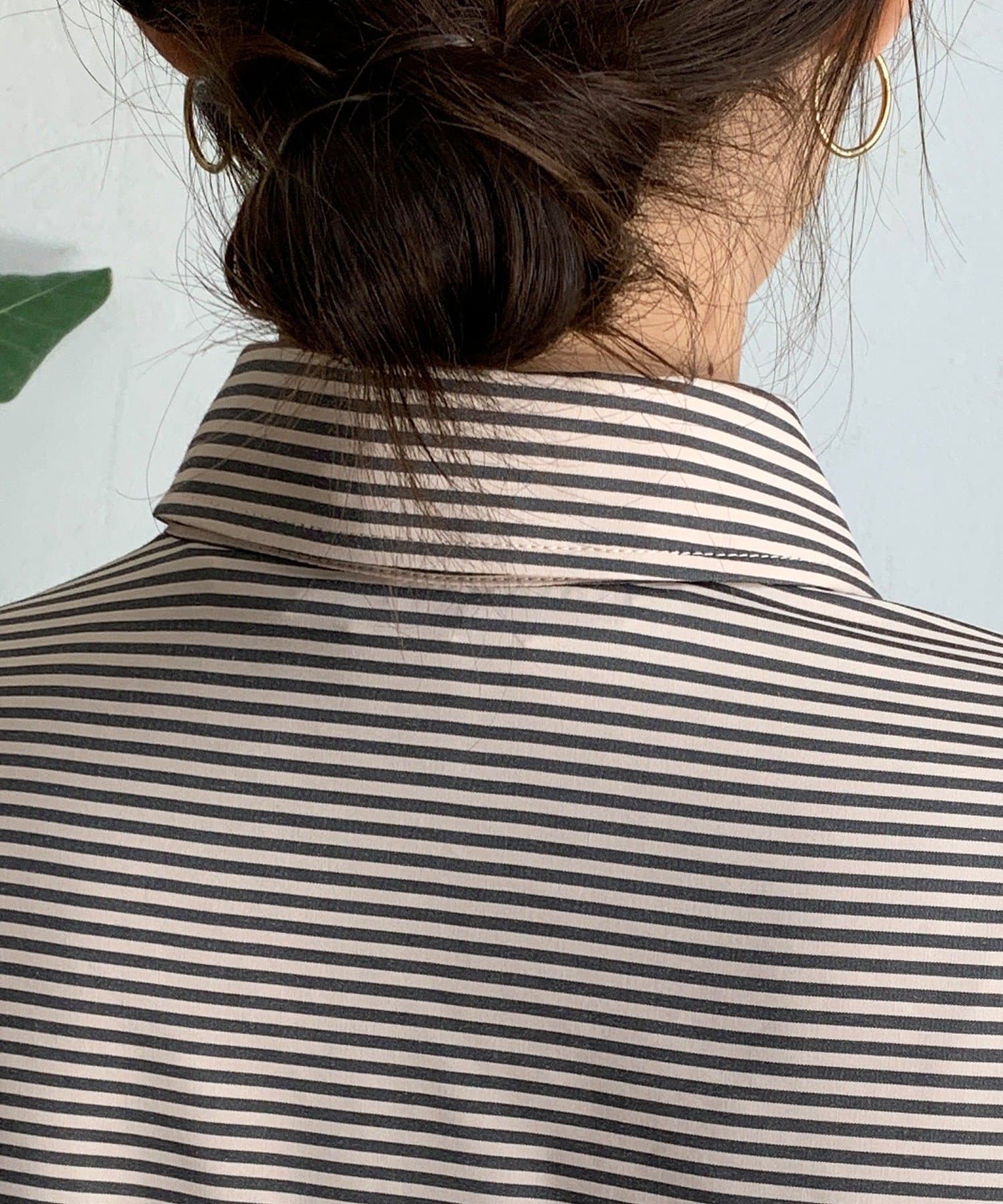 コーディネートに取り込みやすい細ストライプ柄がポイントとなってくれるシャツ。