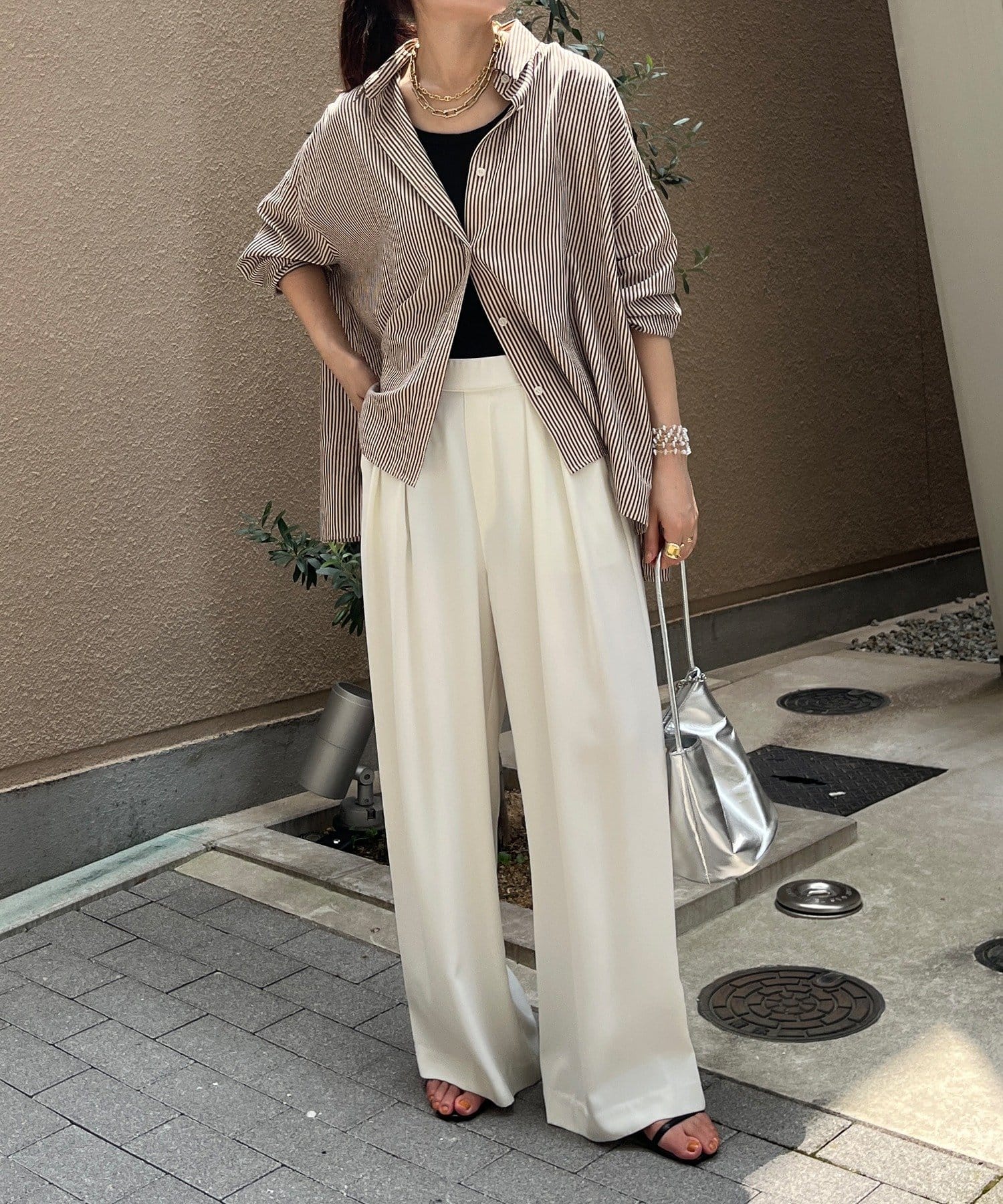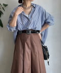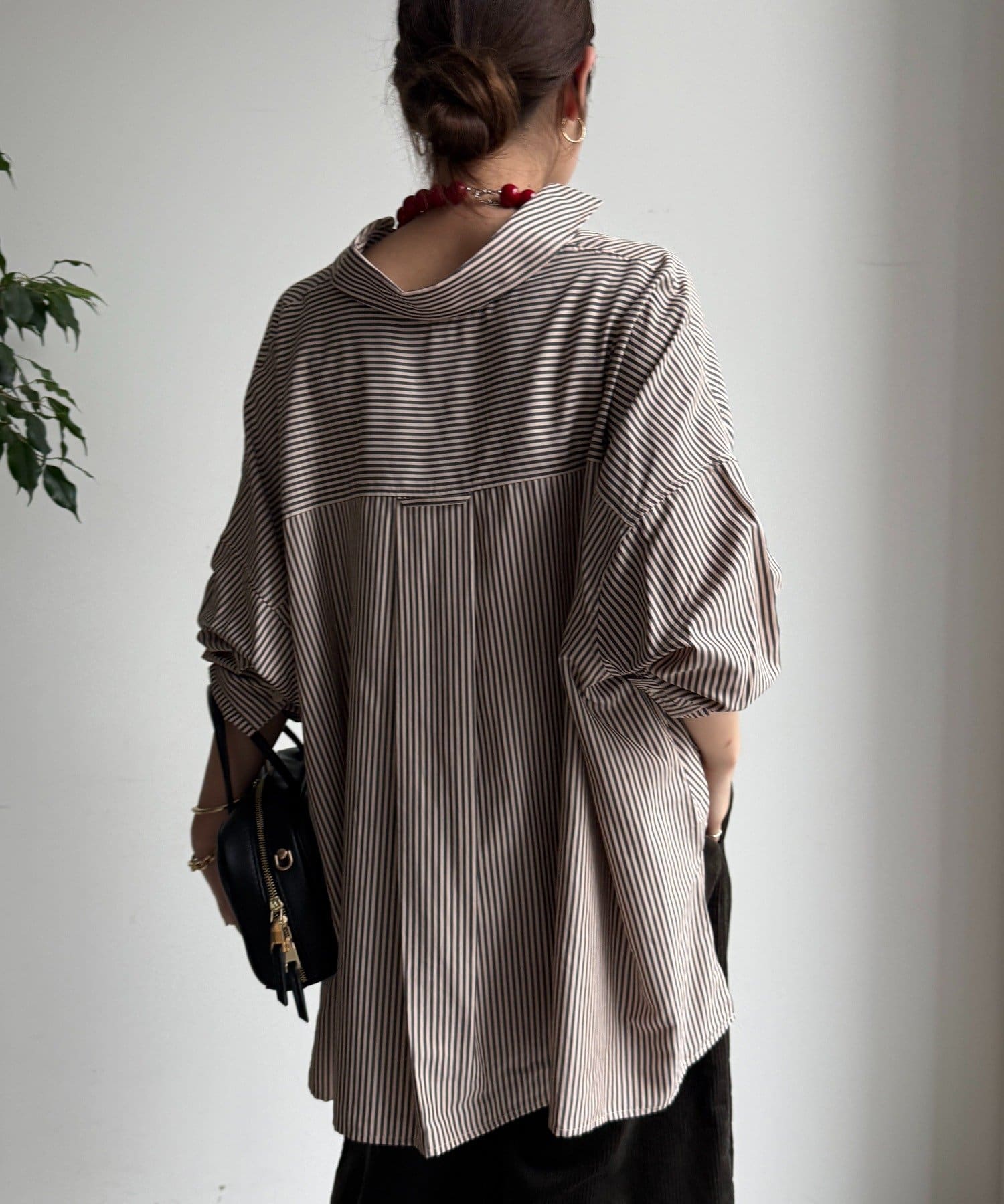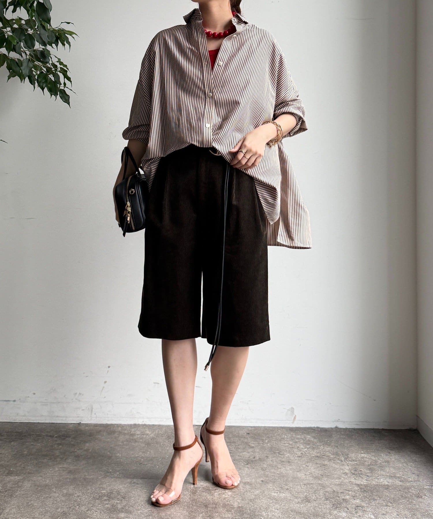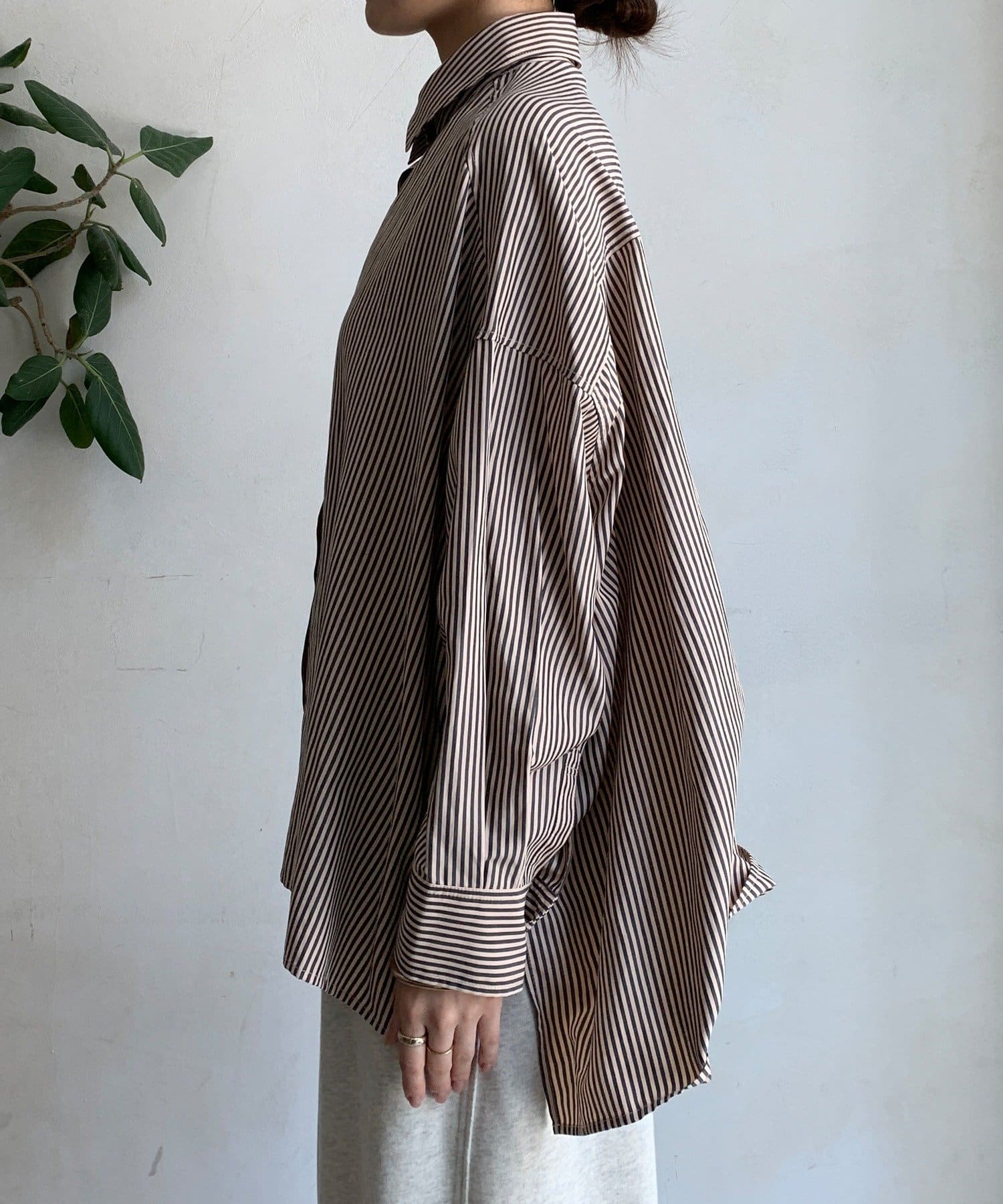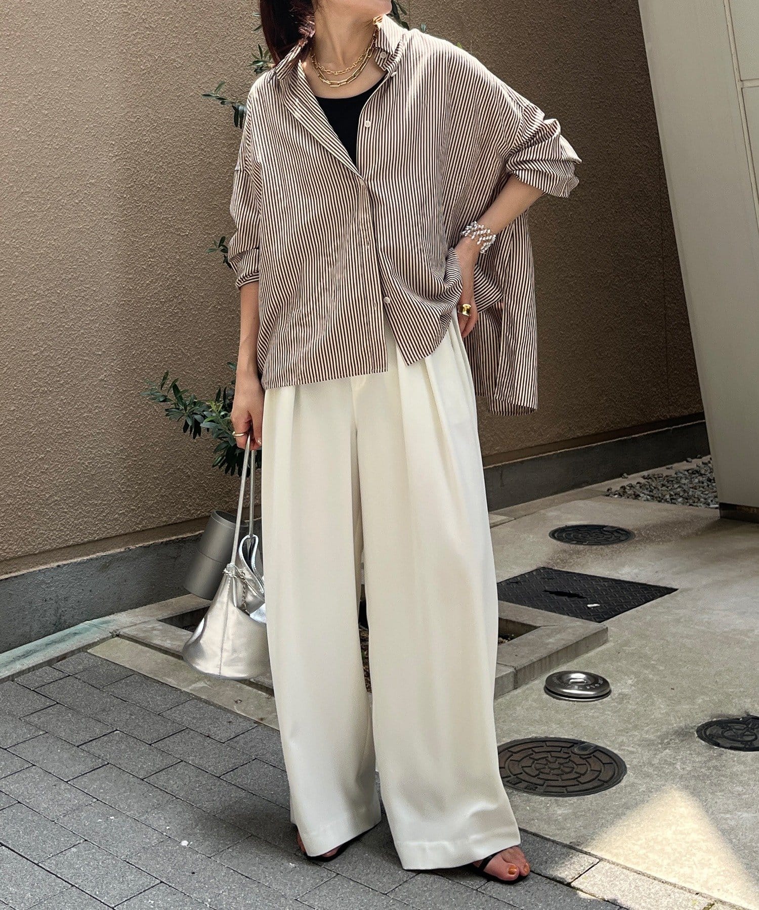 コーディネートに取り込みやすい細ストライプ柄がポイントとなってくれるシャツ。
