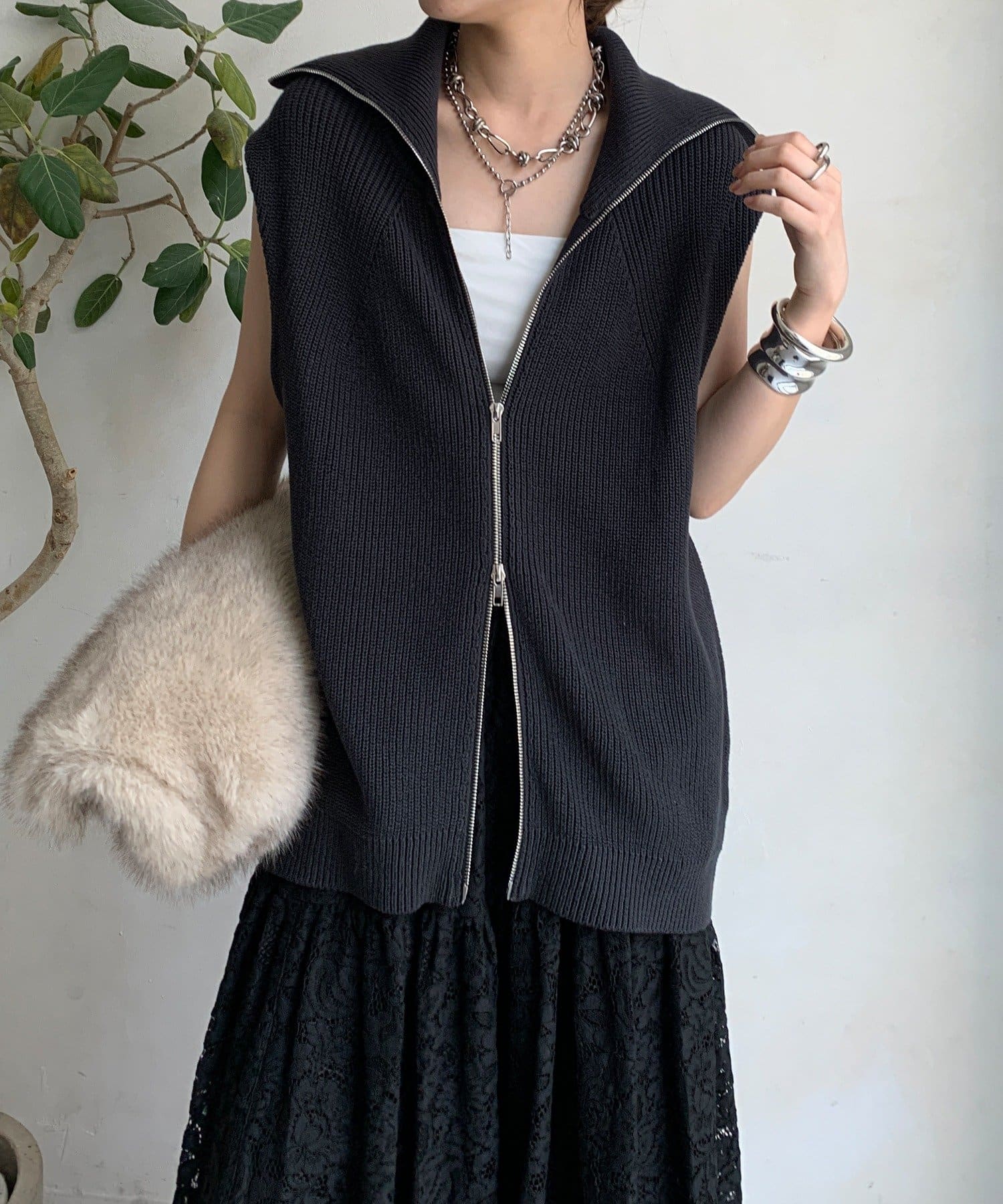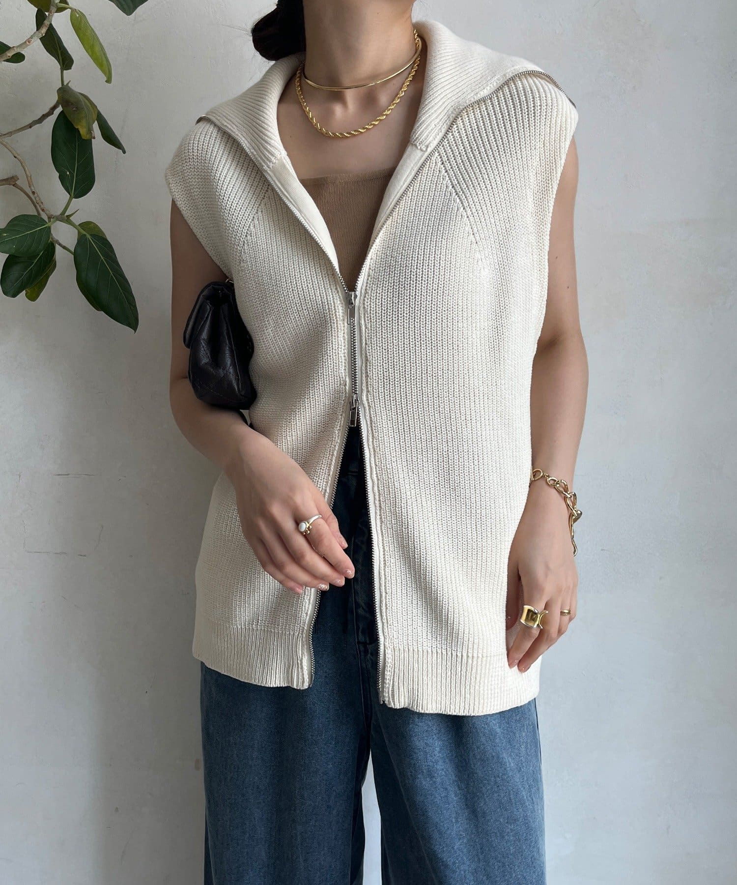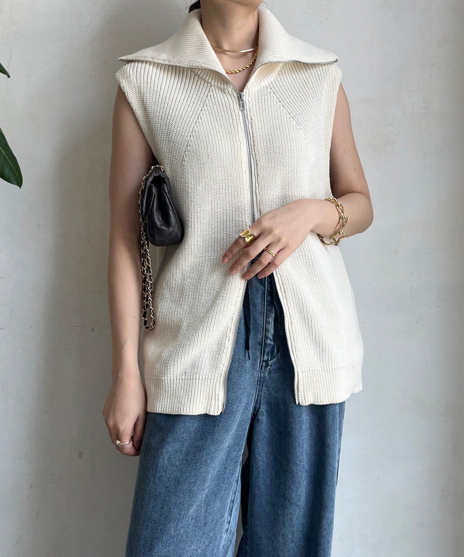 いつものコーデにプラスするだけで、旬なレイヤードスタイルが完成するニットジップアップベスト。