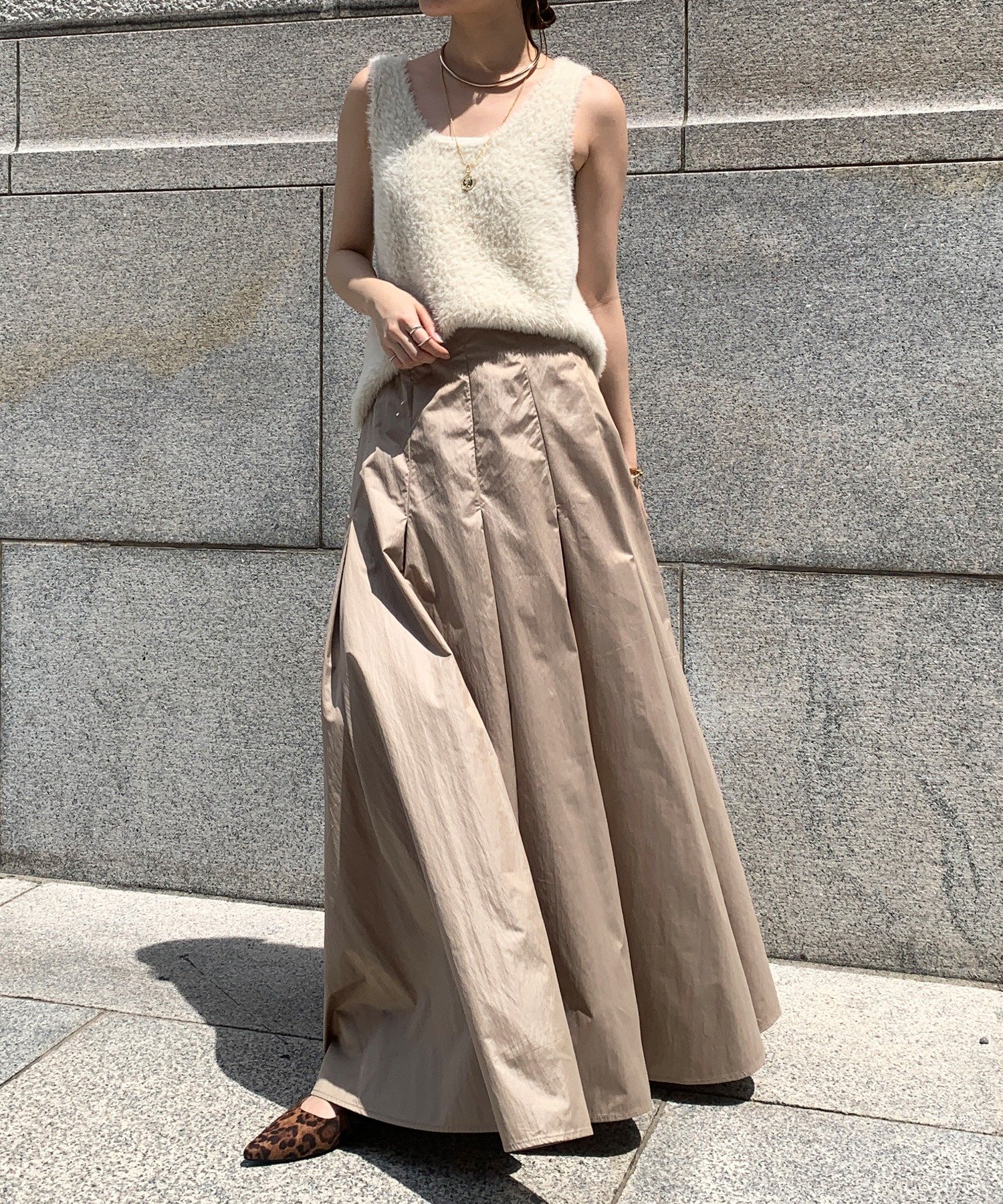 ざっくりと深めのネックラインのため、お手持ちのカットソーやキャミなどインナーとのレイヤードがおすすめです。