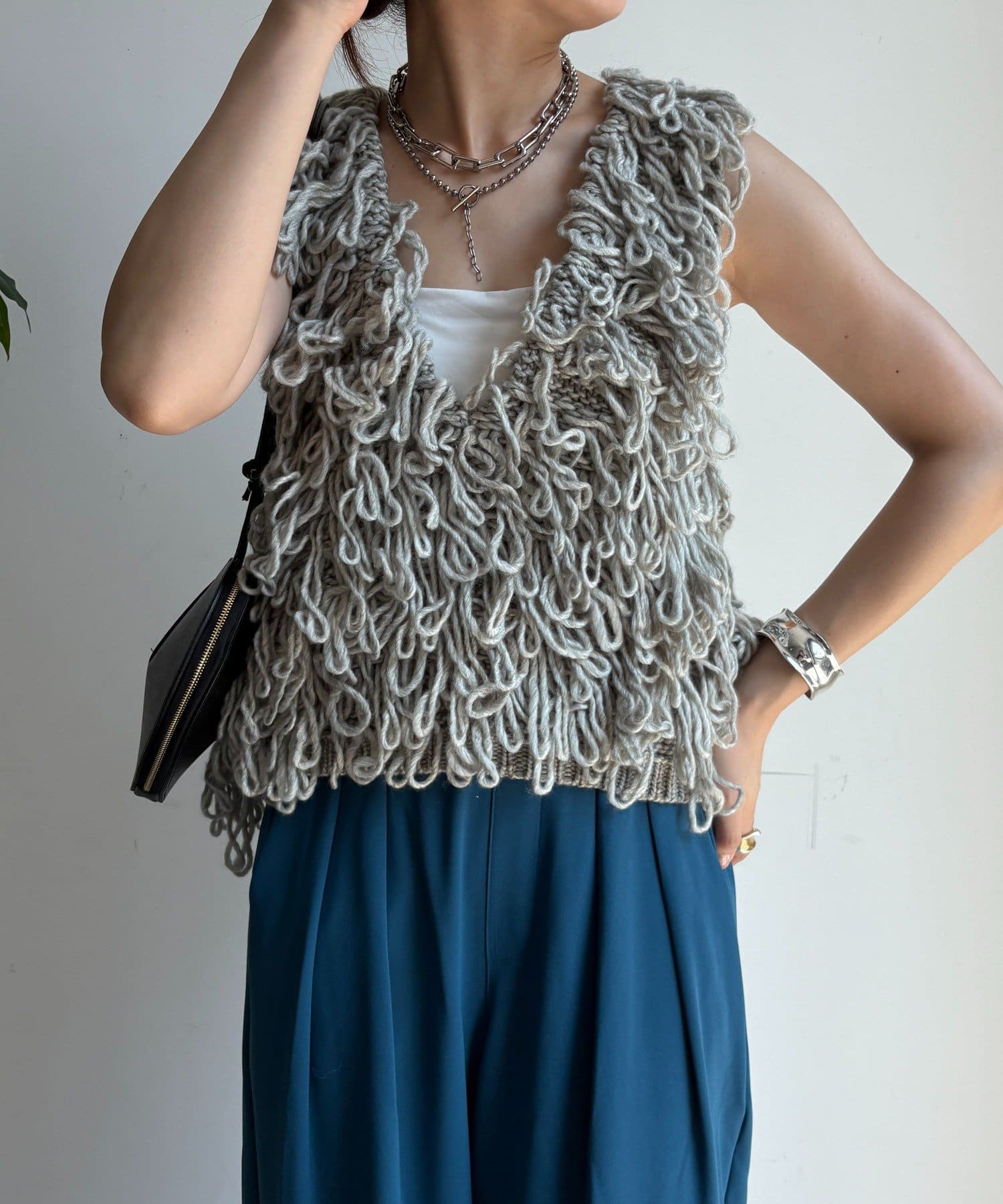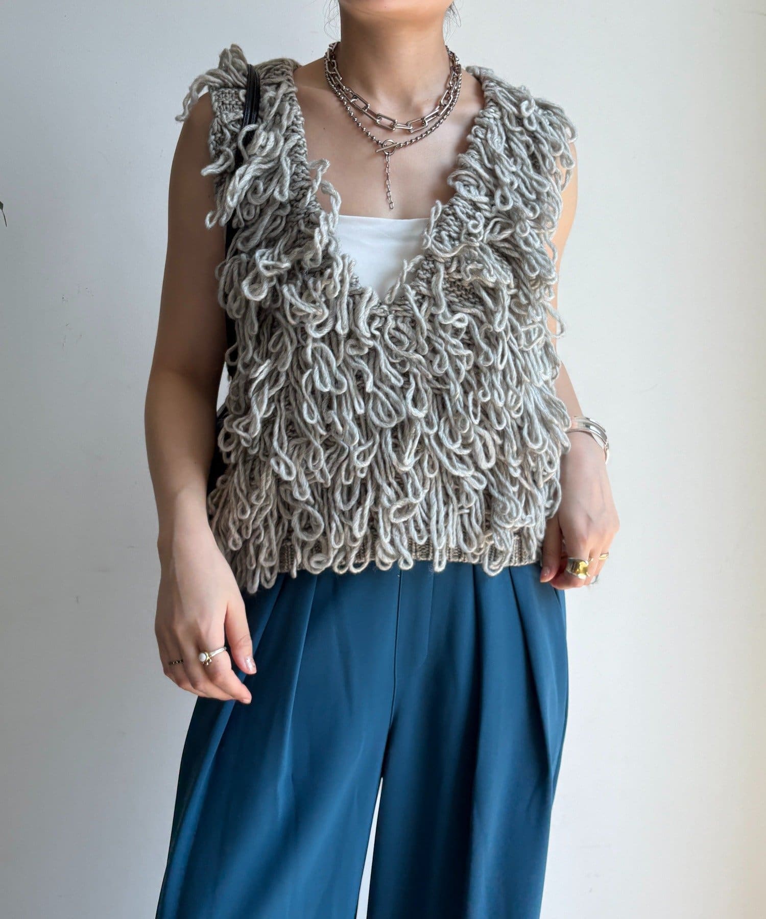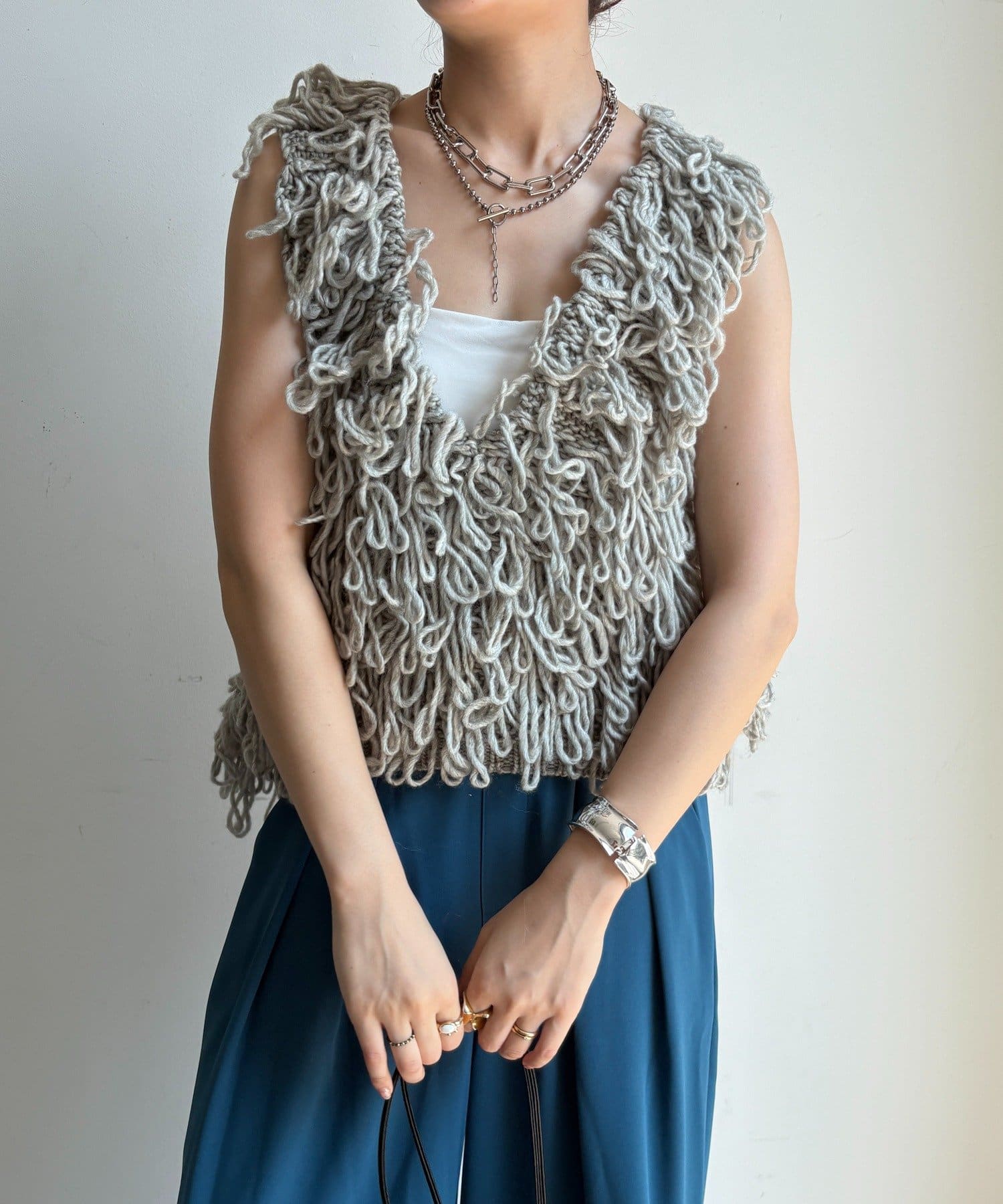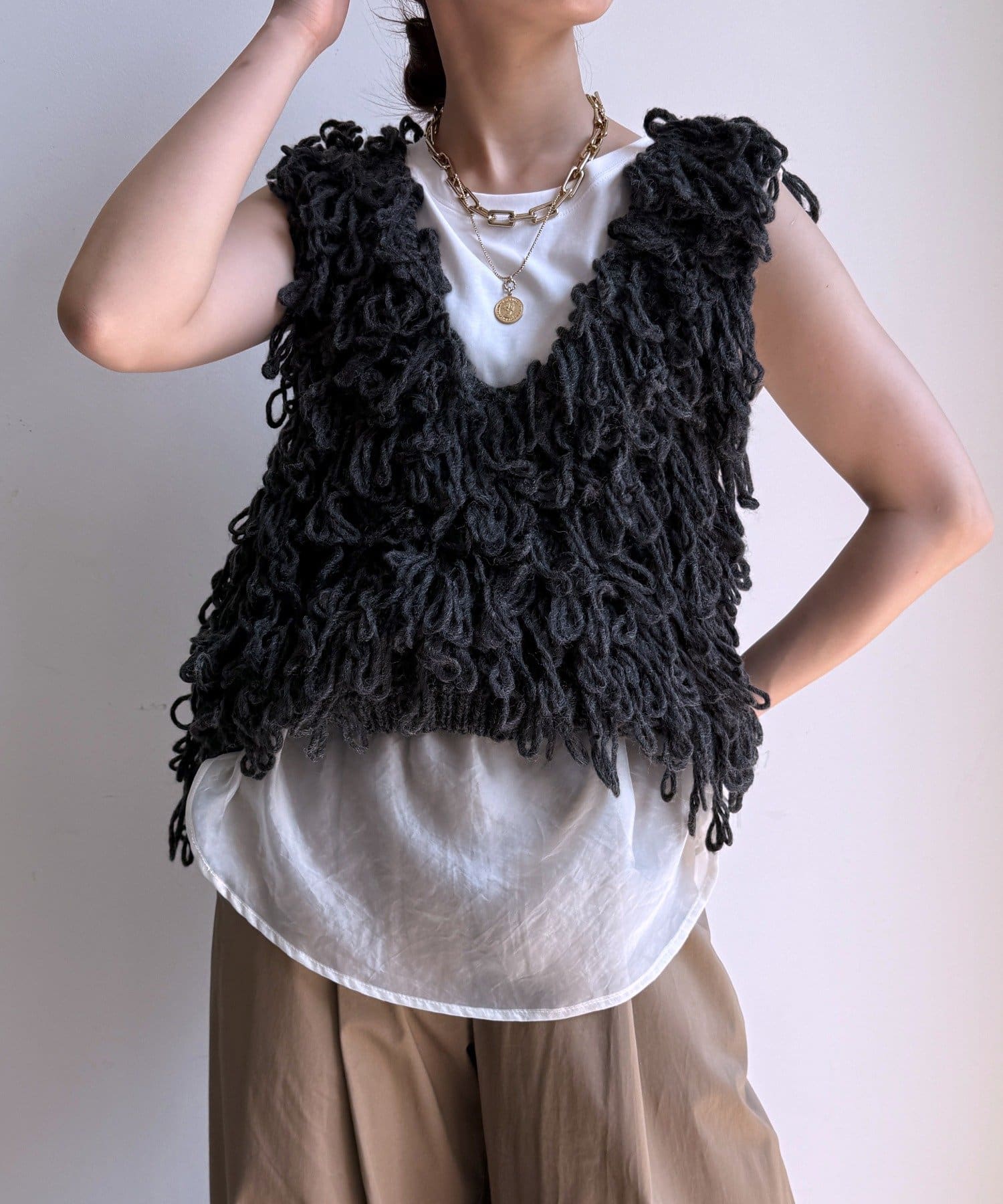 ループ状の生地を贅沢あしらったデザインは、身にまとうだけで華やかに!