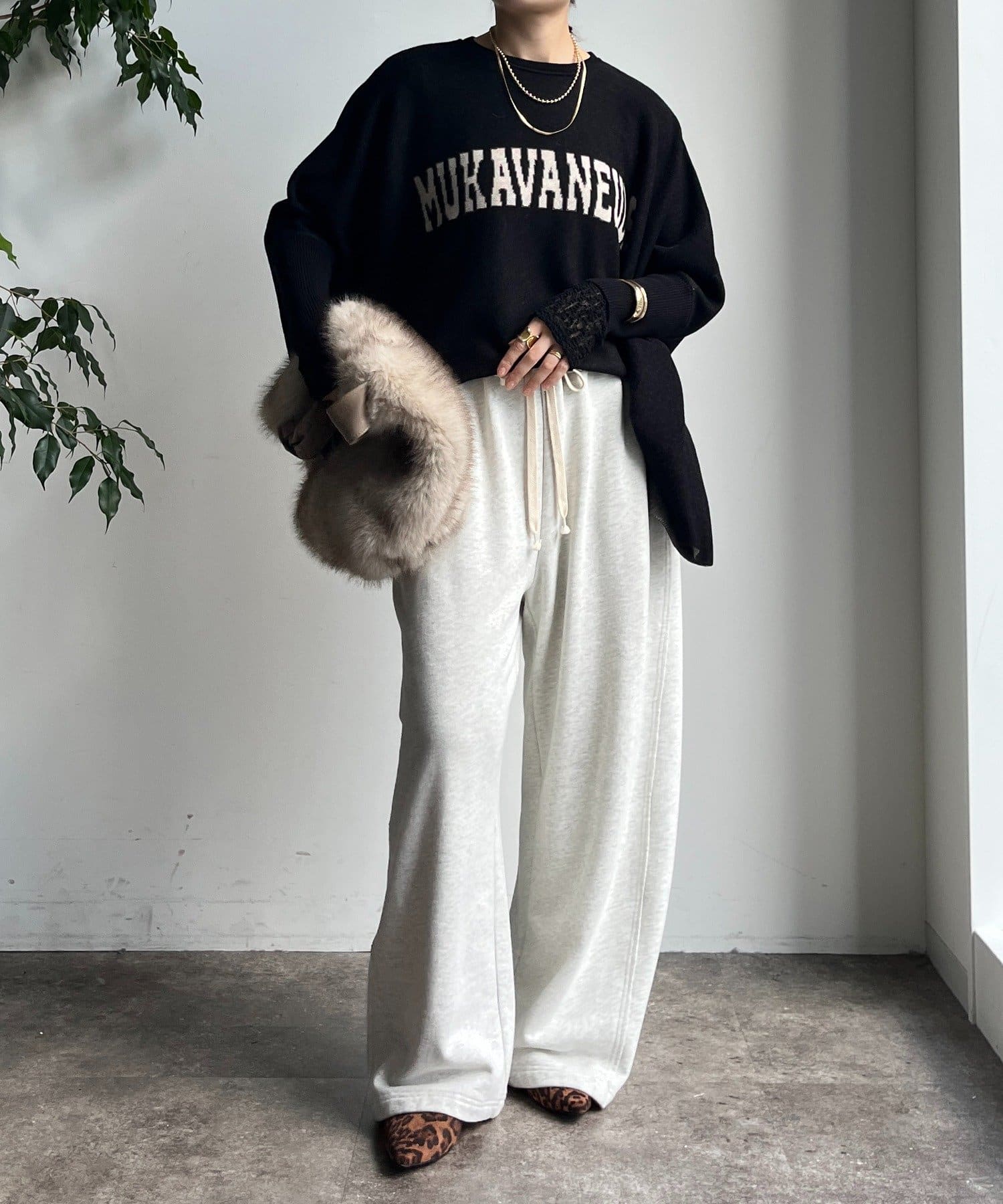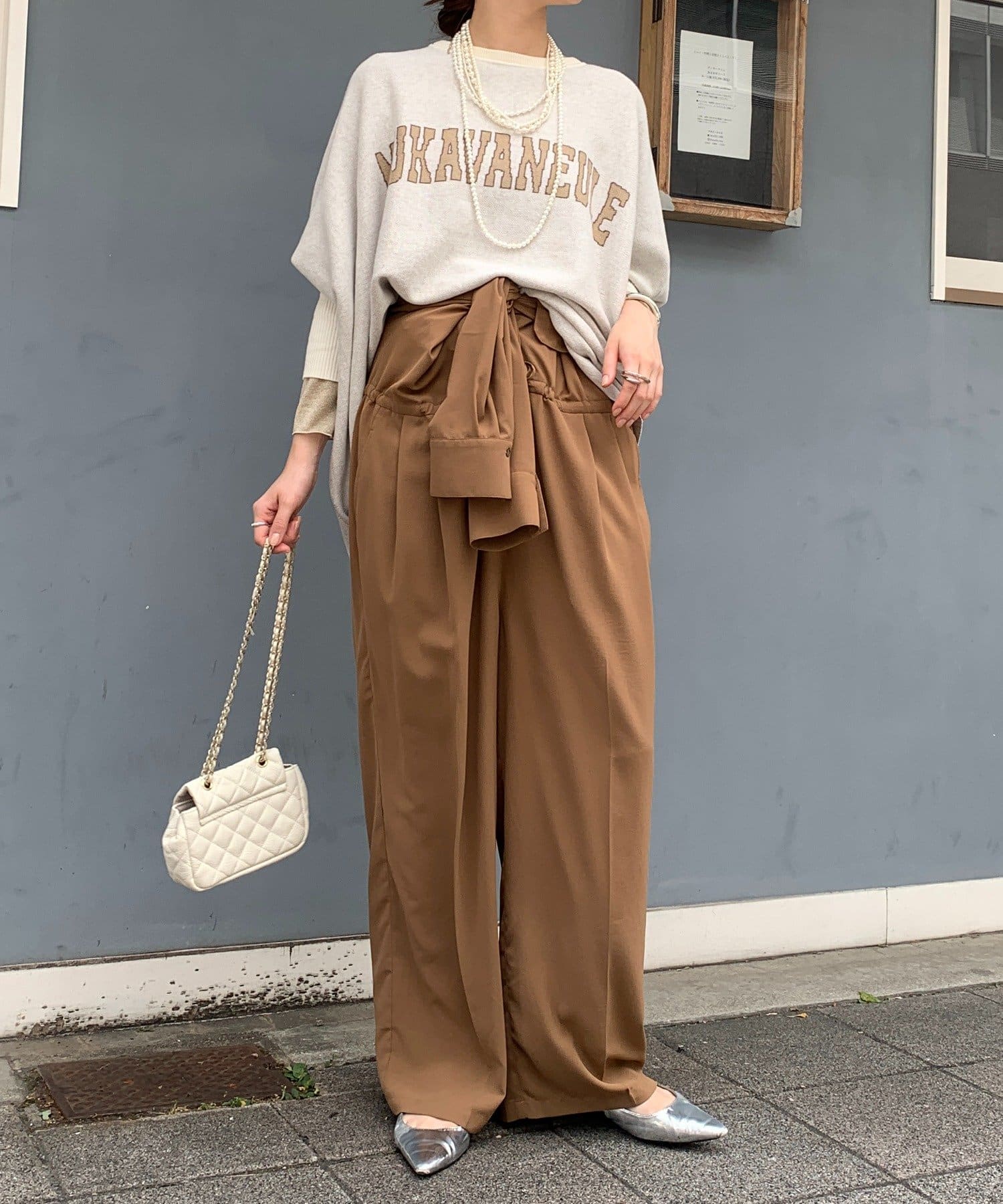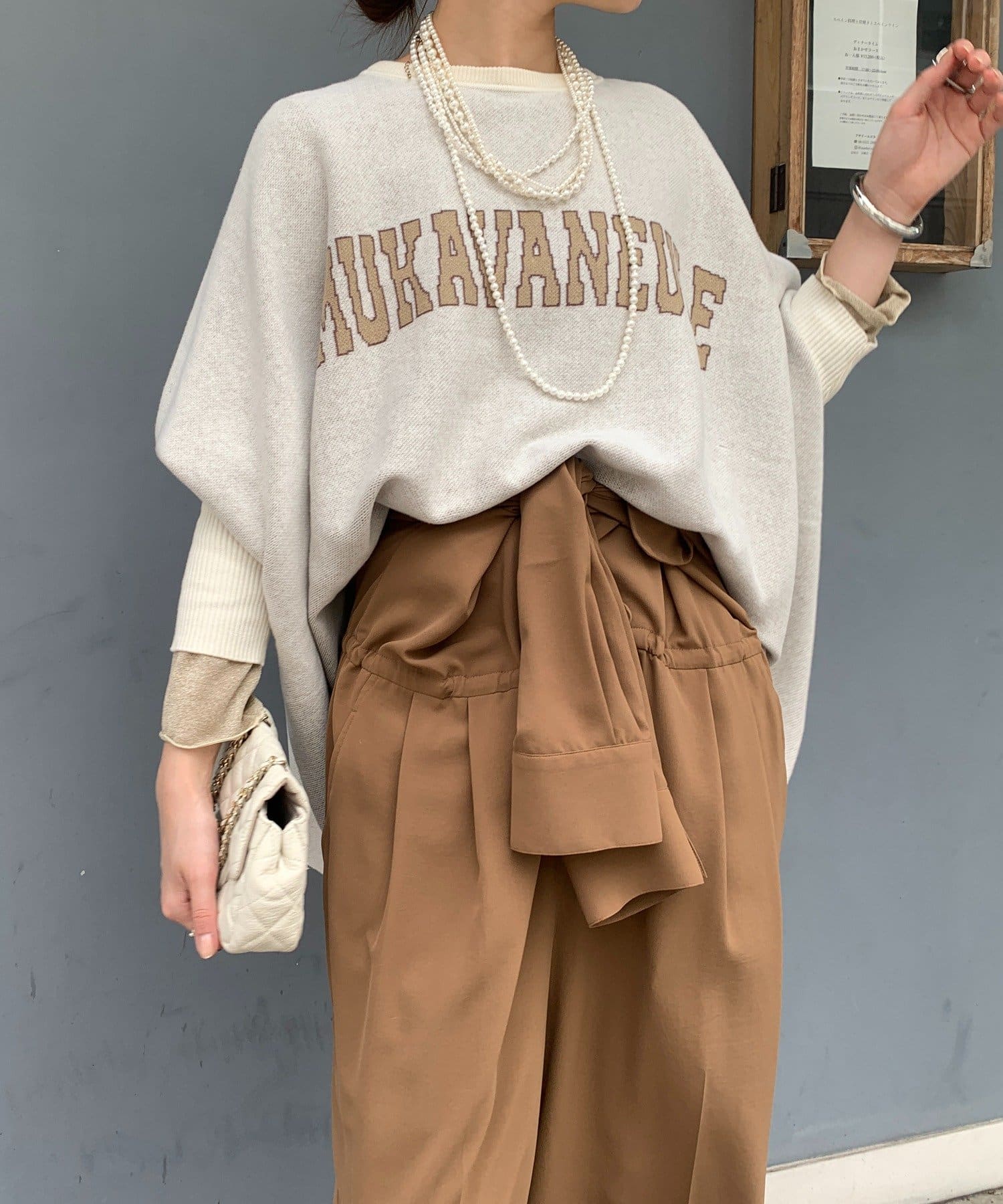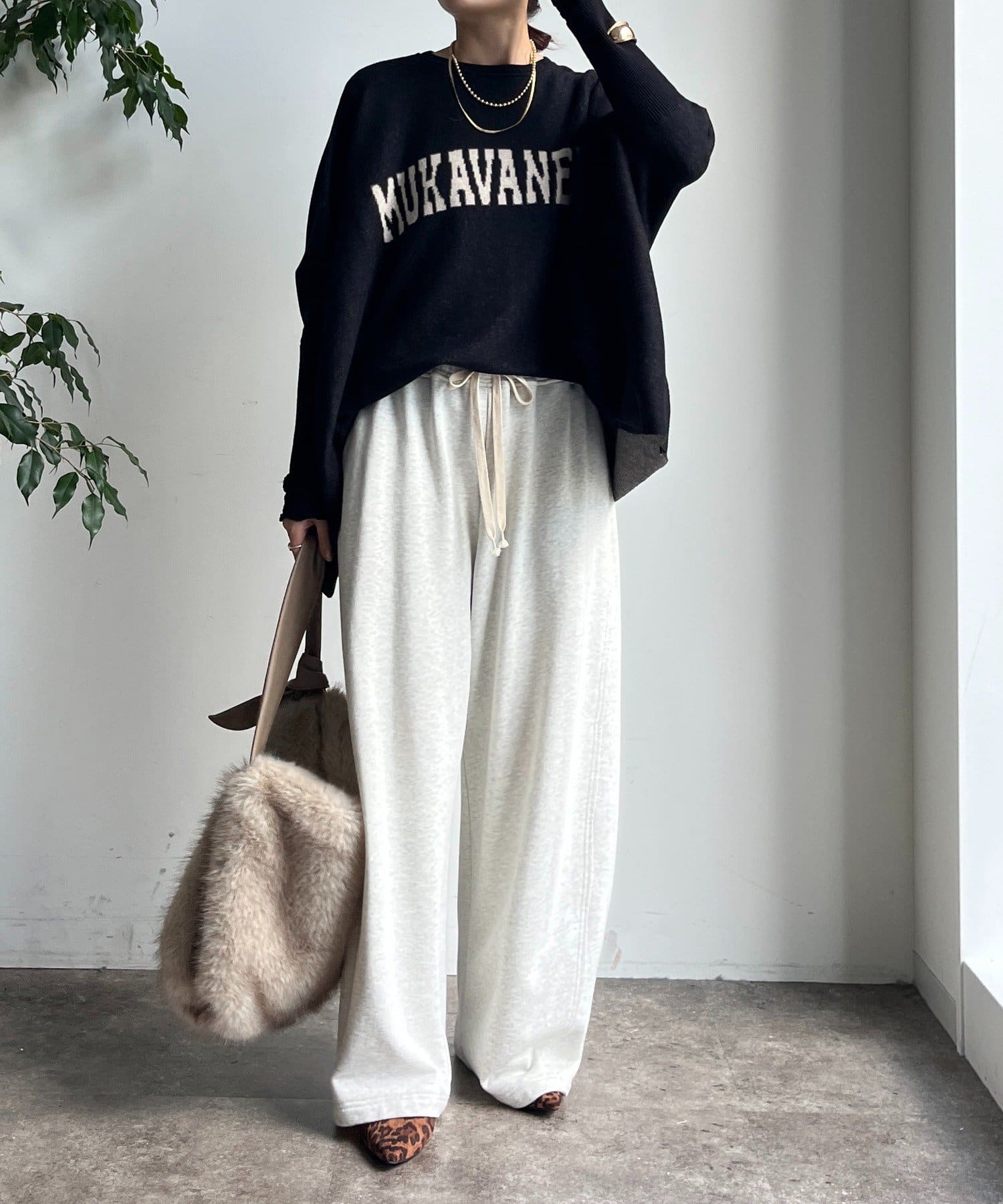インターシャ編みでコーディネートしやすいニットはスウェットほどカジュアルにはなりすぎず、大人らしく着られるのがポイント。