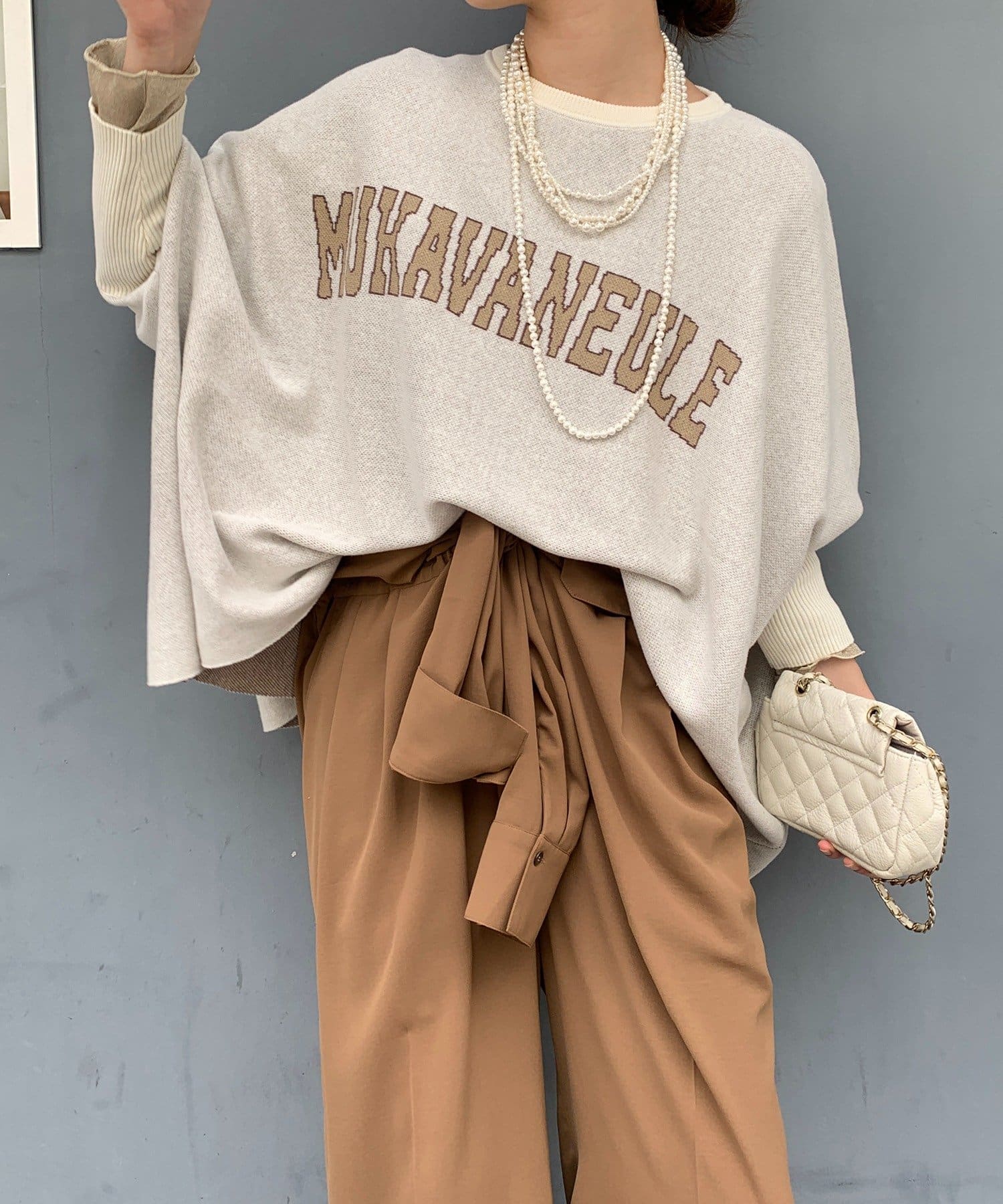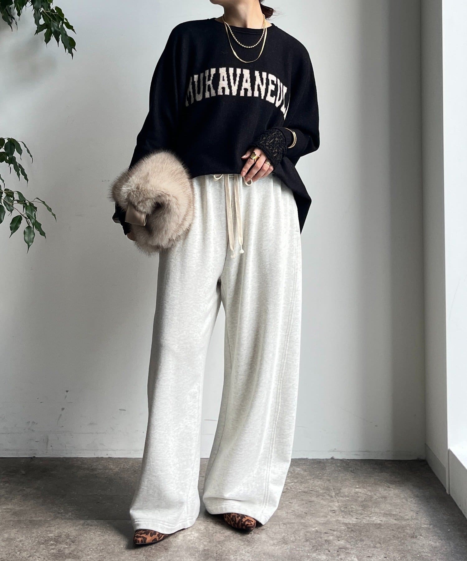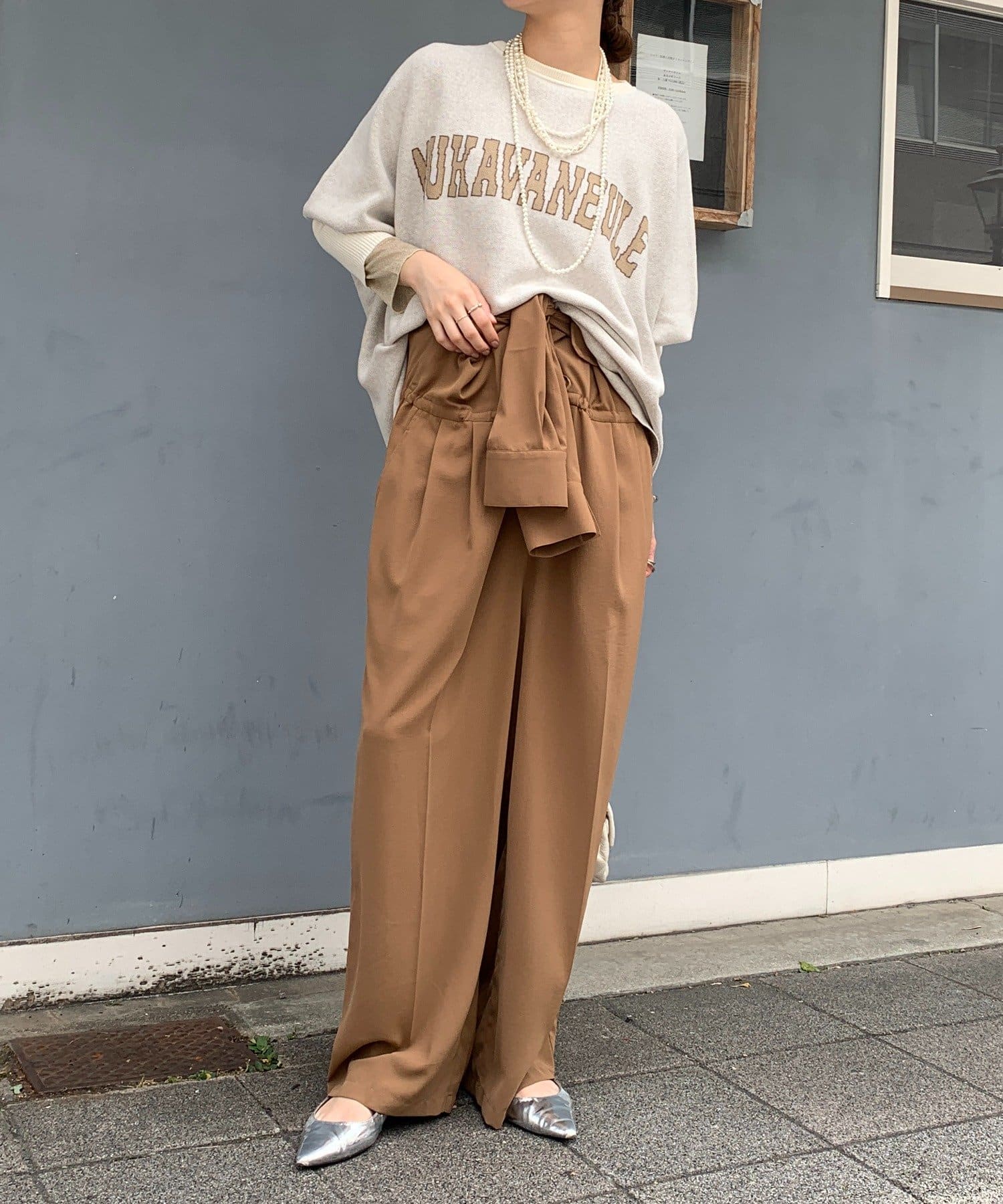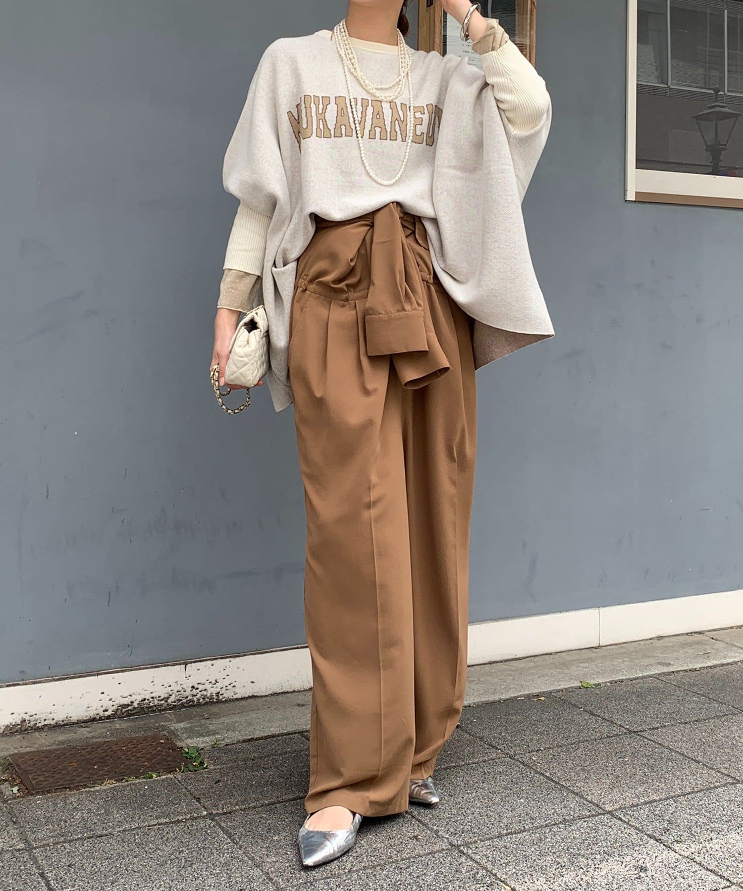 インターシャ編みでコーディネートしやすいニットはスウェットほどカジュアルにはなりすぎず、大人らしく着られるのがポイント。