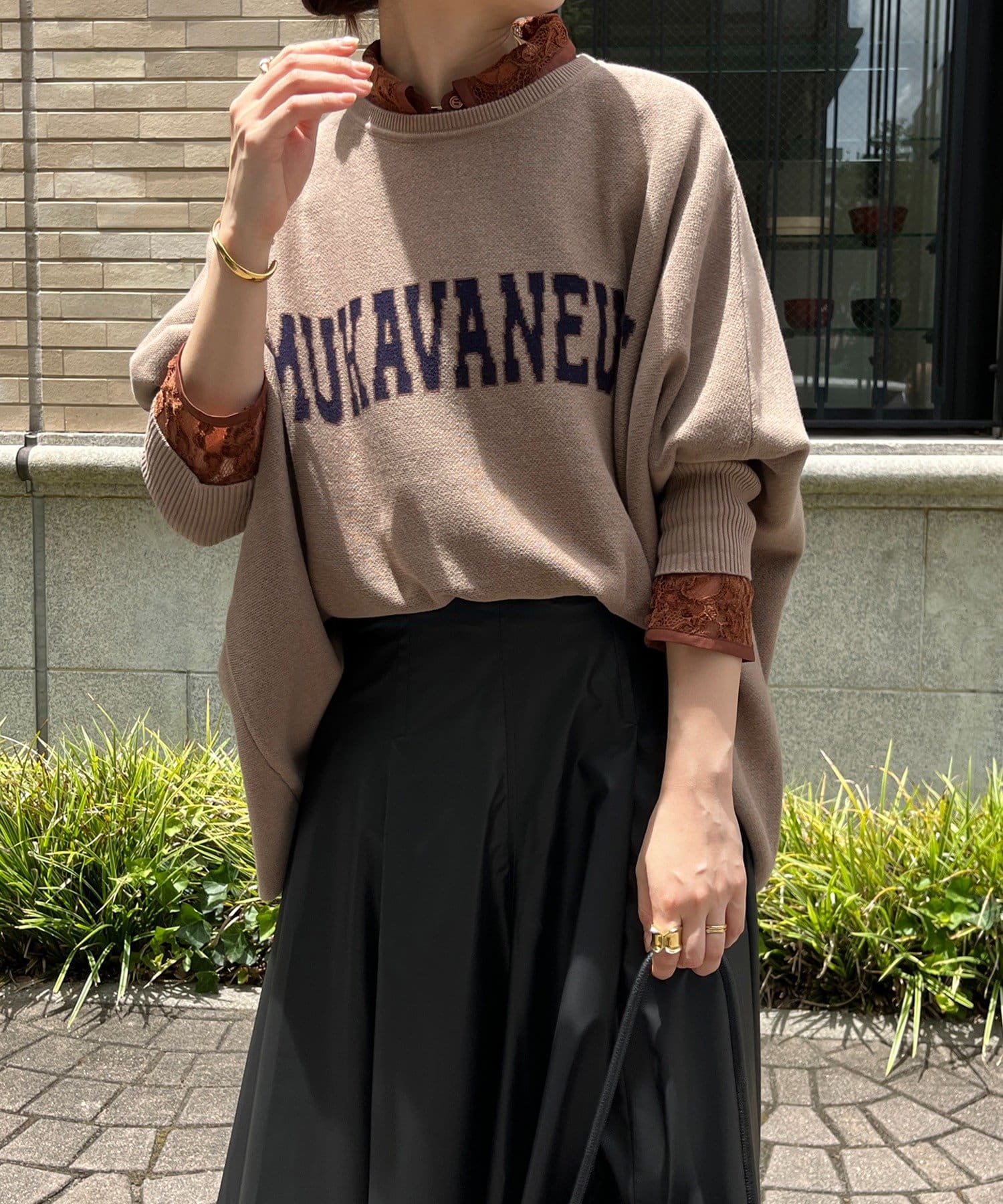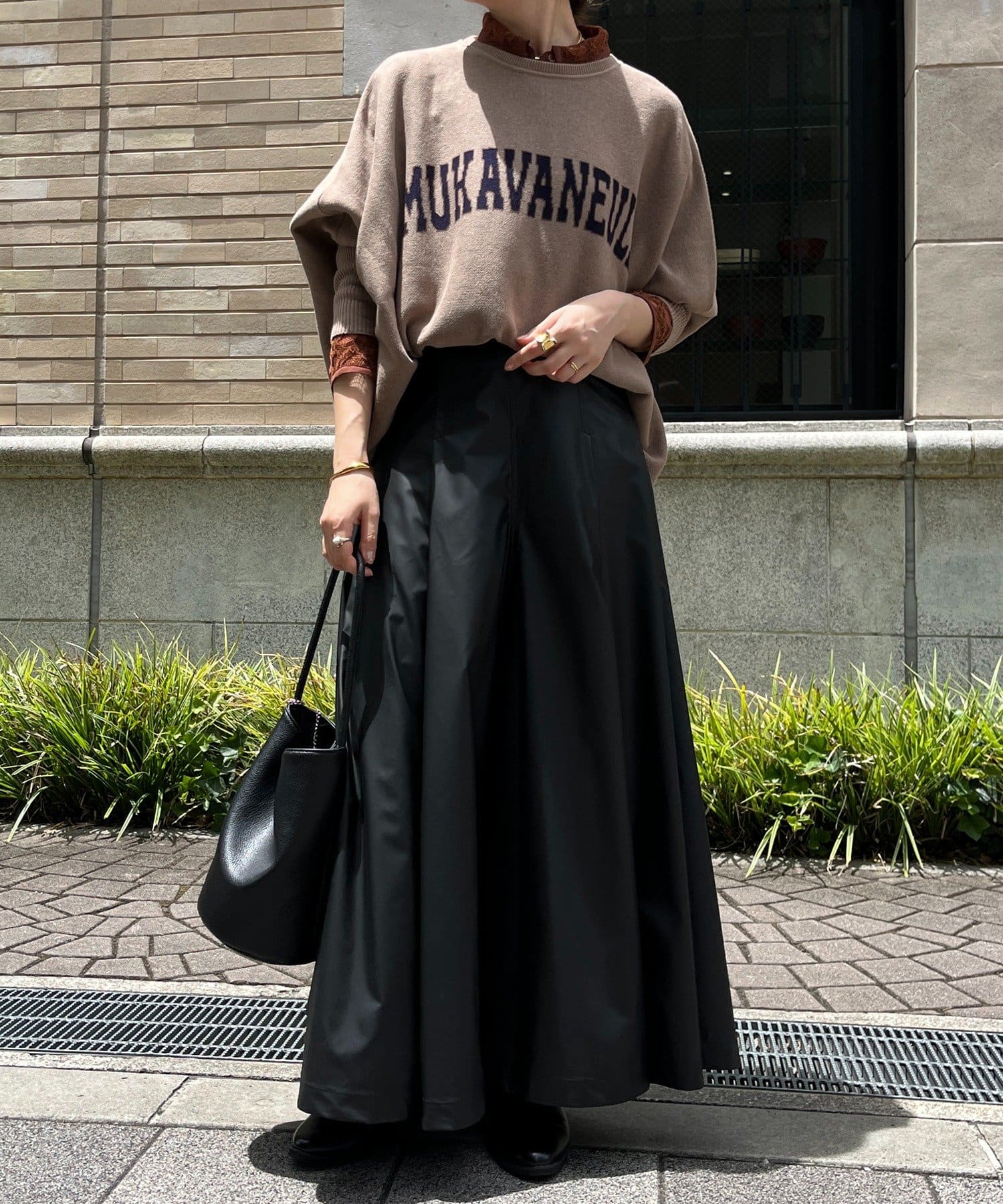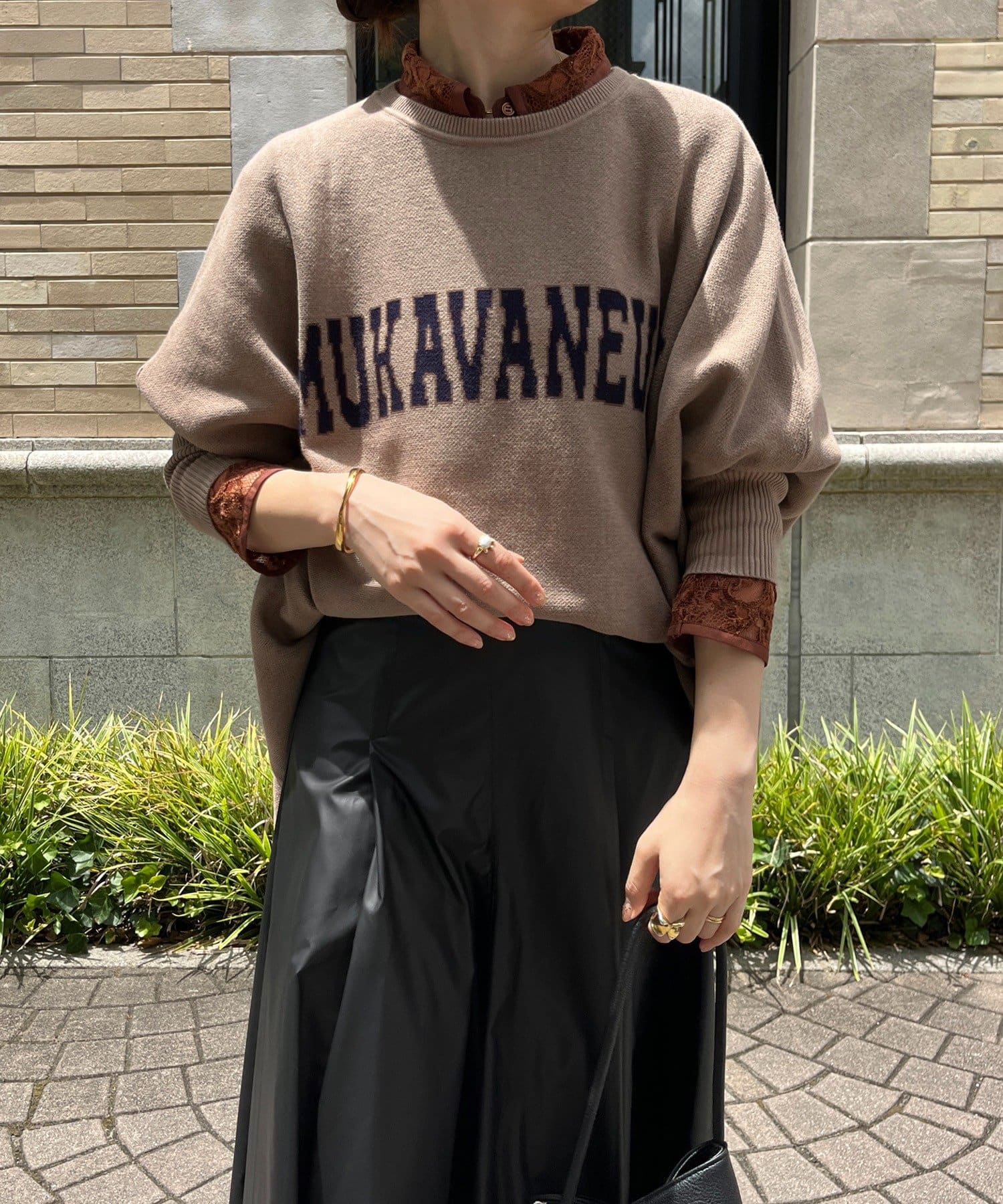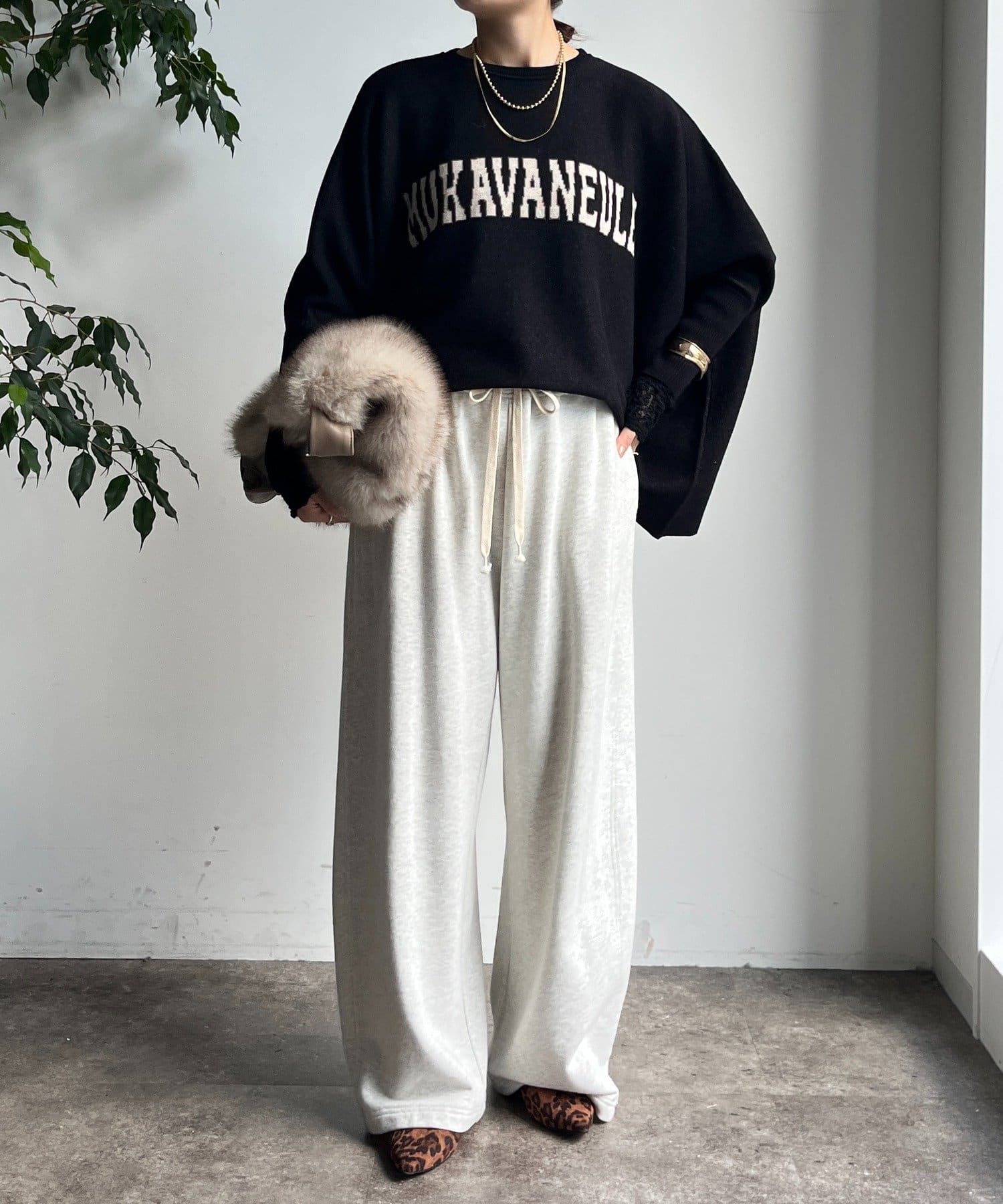 インターシャ編みでコーディネートしやすいニットはスウェットほどカジュアルにはなりすぎず、大人らしく着られるのがポイント。