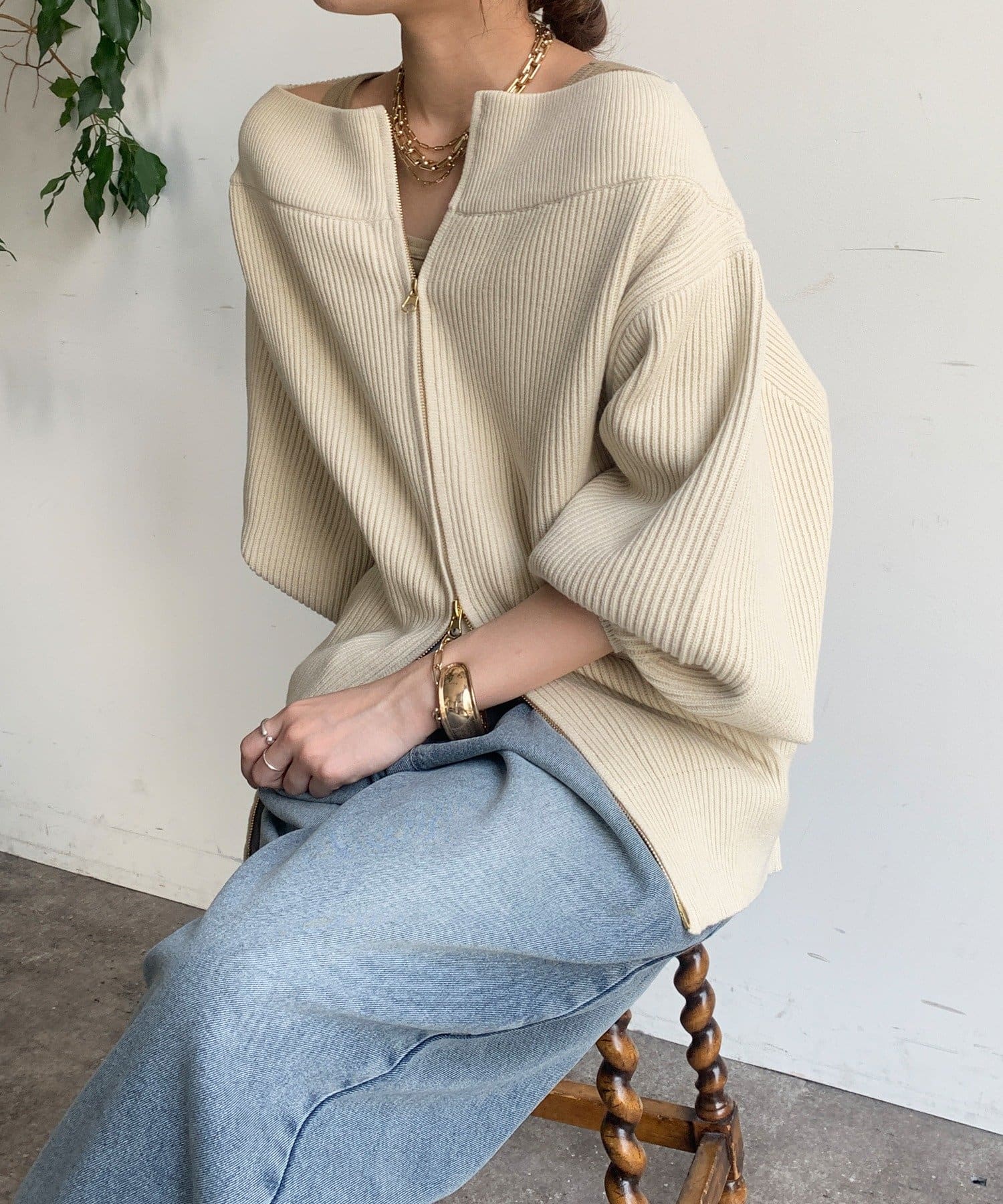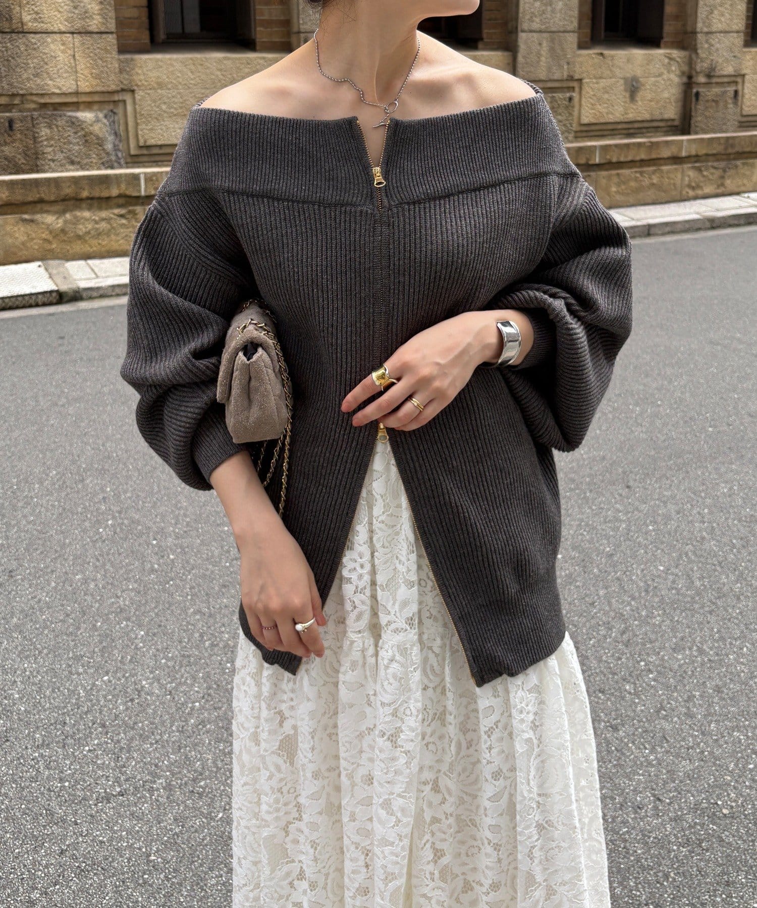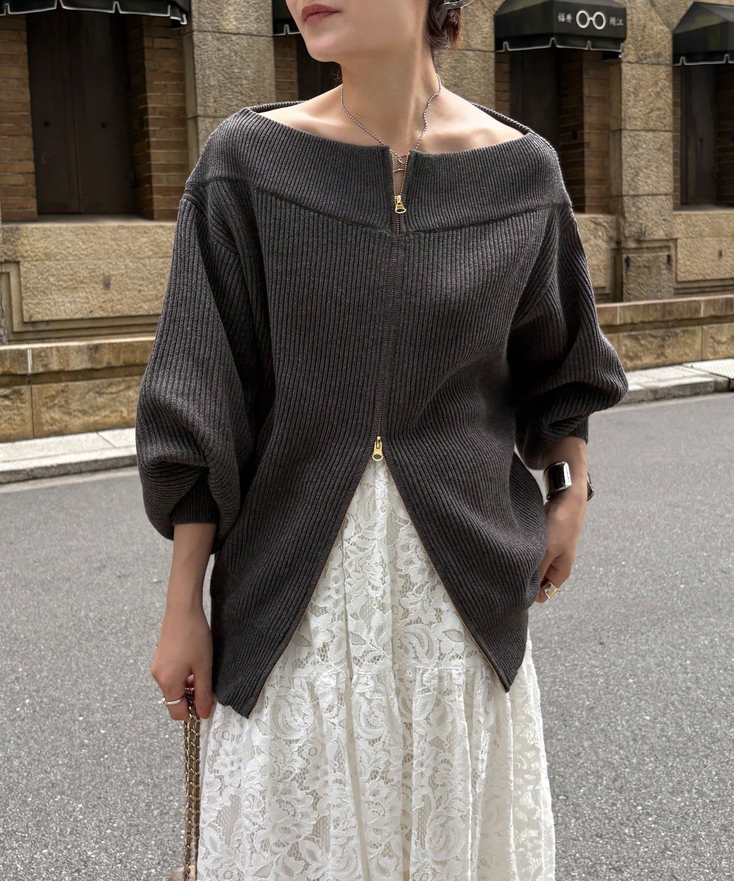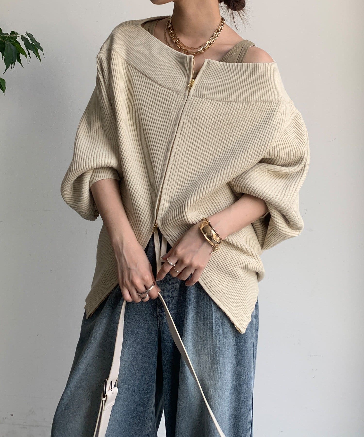 フロントにジップのデザインを施した新鮮な1着。ネックラインを広く取っているため、オフショルとして着用していただけます。
