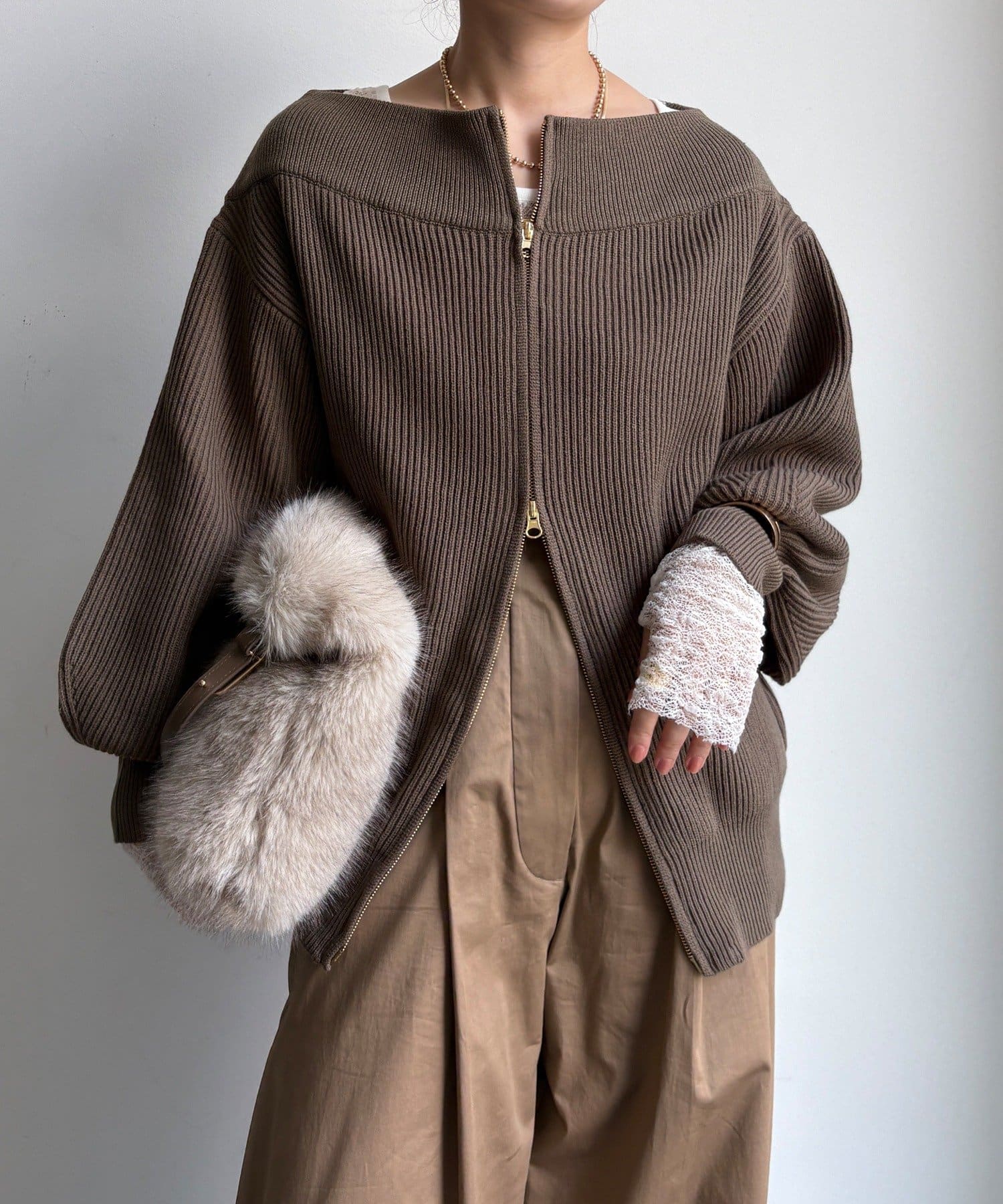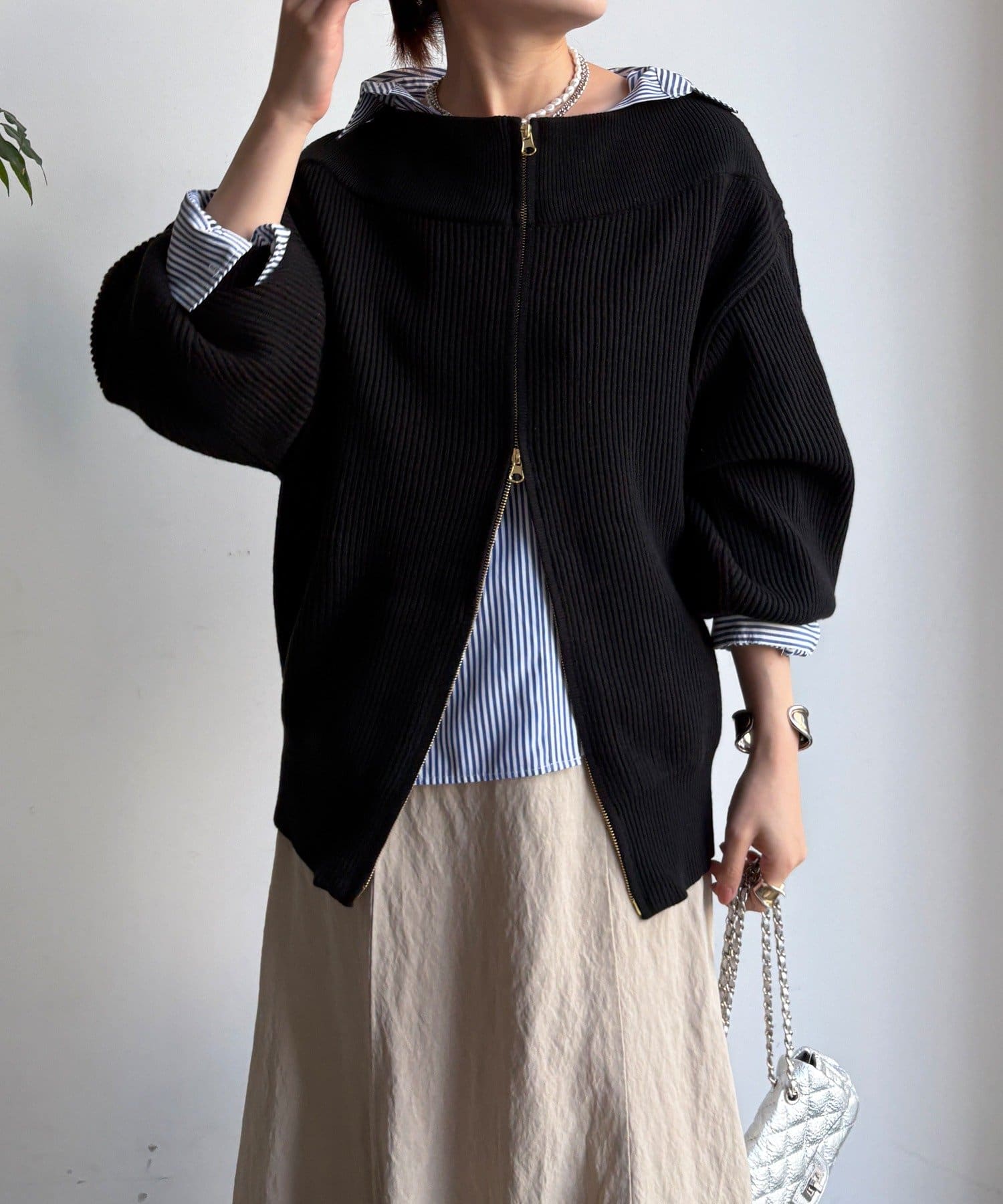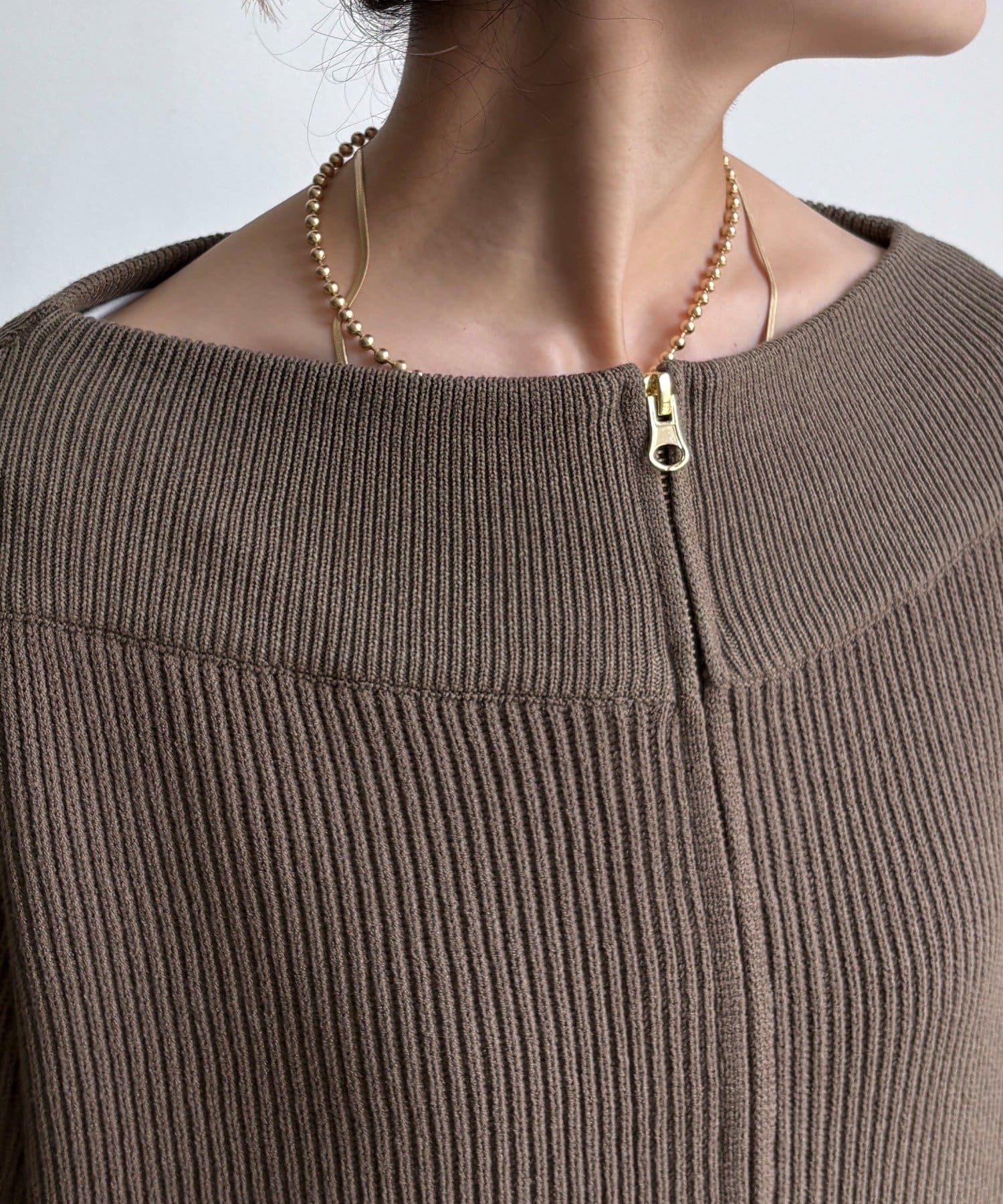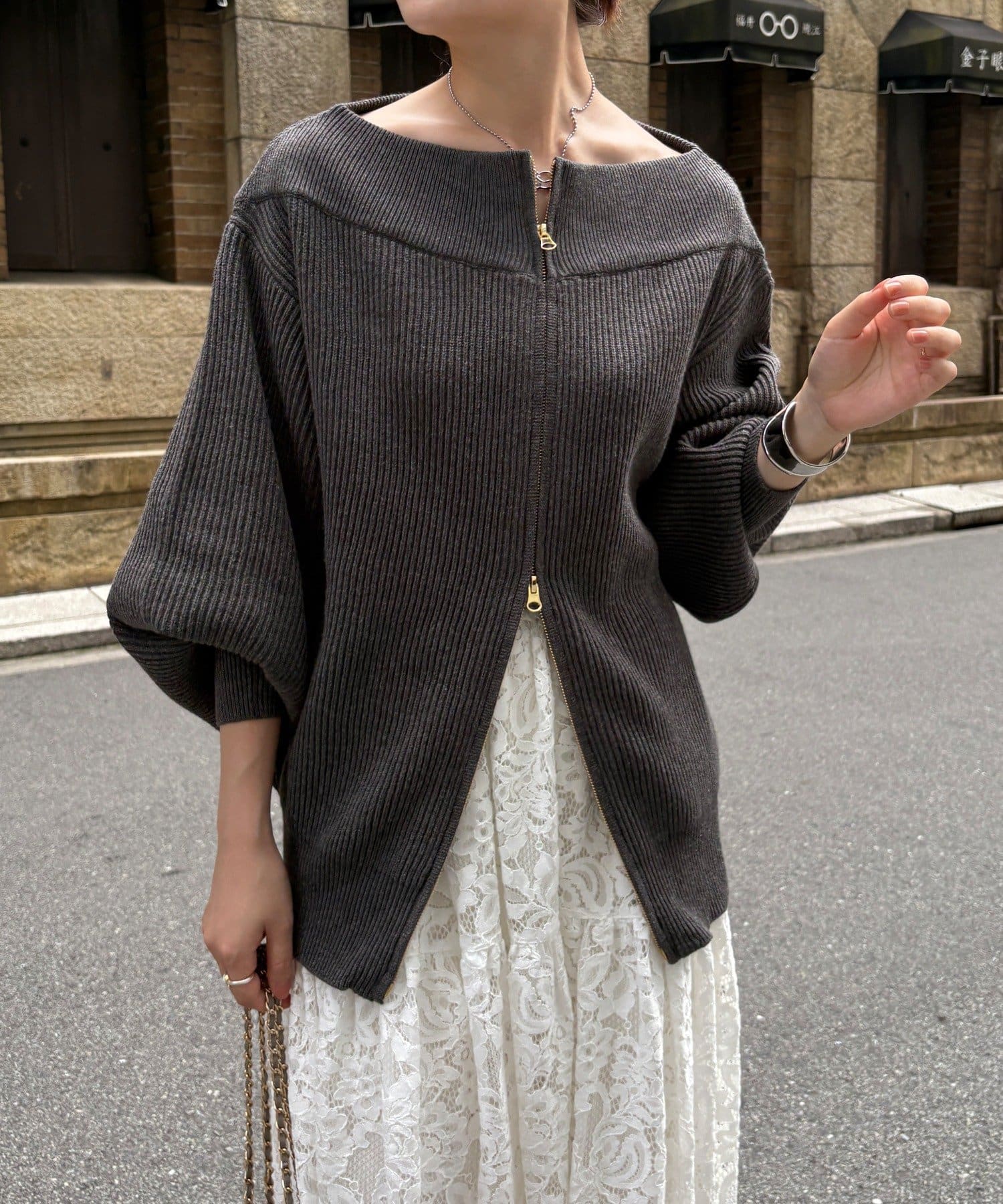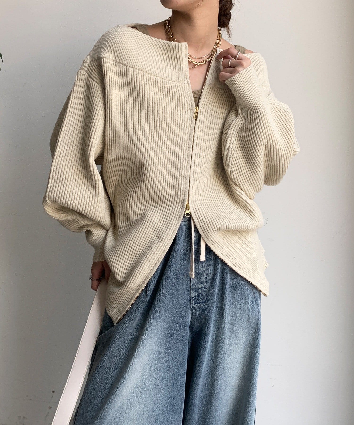 フロントにジップのデザインを施した新鮮な1着。ネックラインを広く取っているため、オフショルとして着用していただけます。