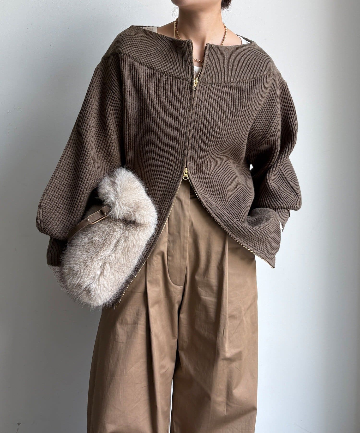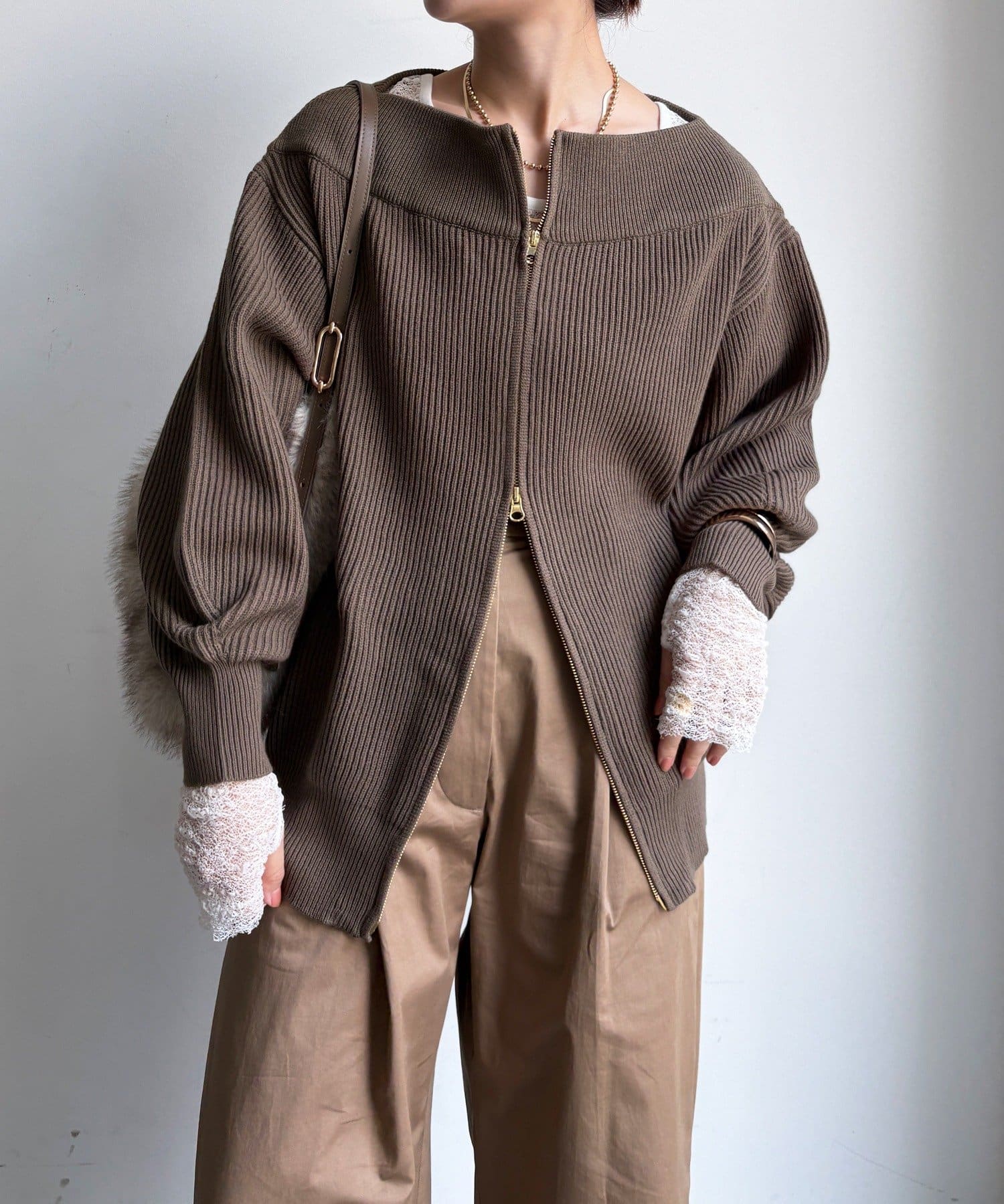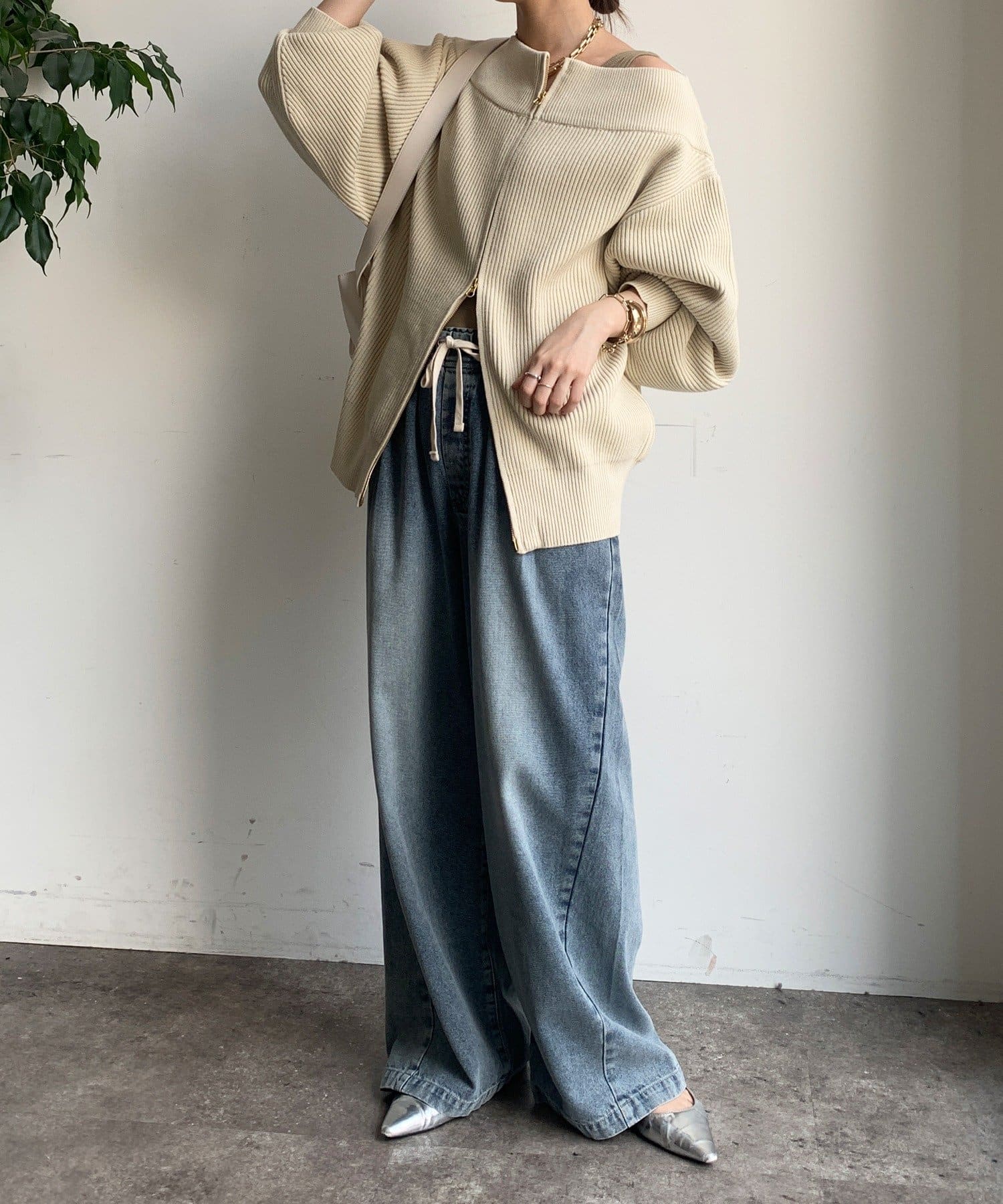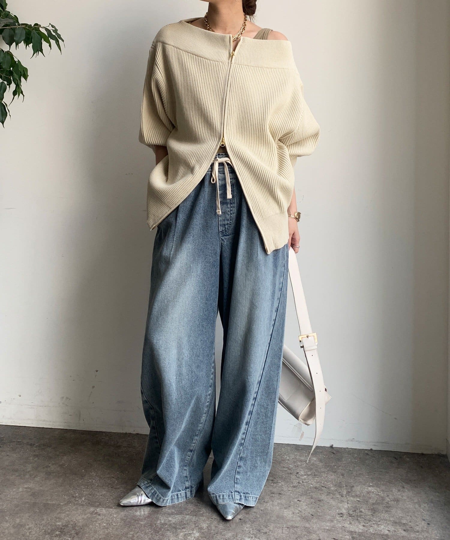 フロントにジップのデザインを施した新鮮な1着。ネックラインを広く取っているため、オフショルとして着用していただけます。