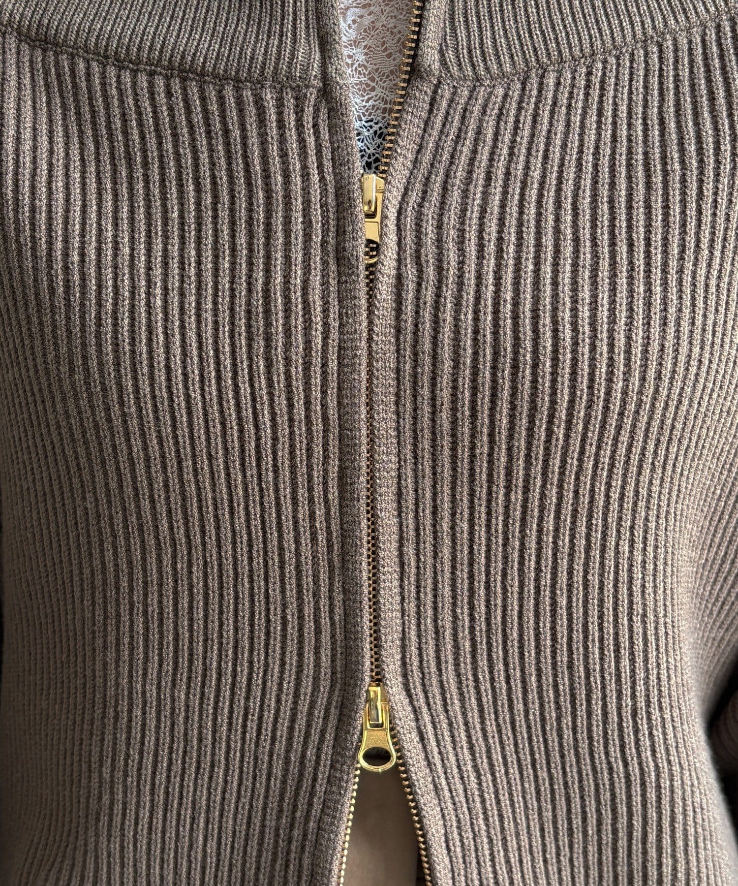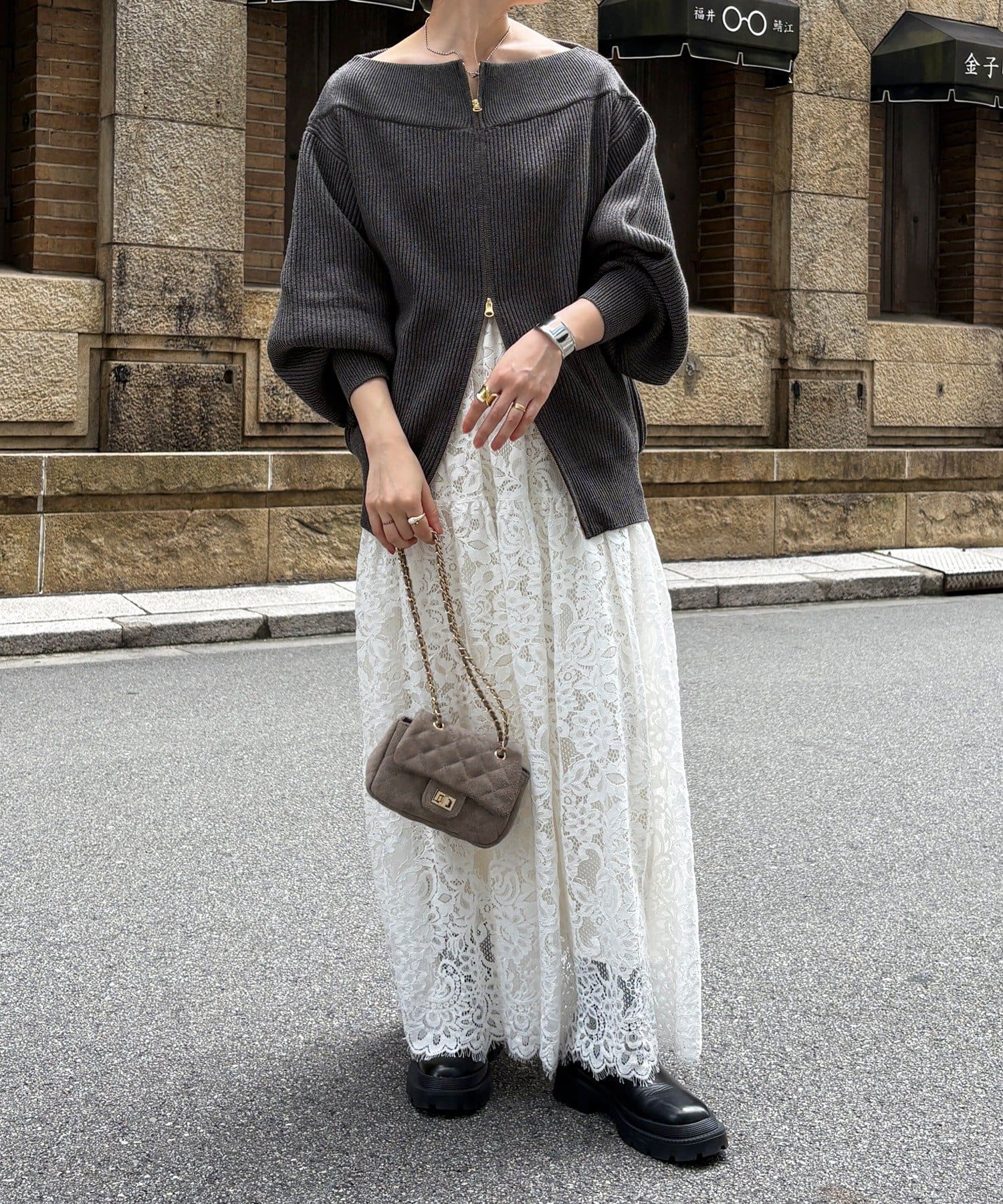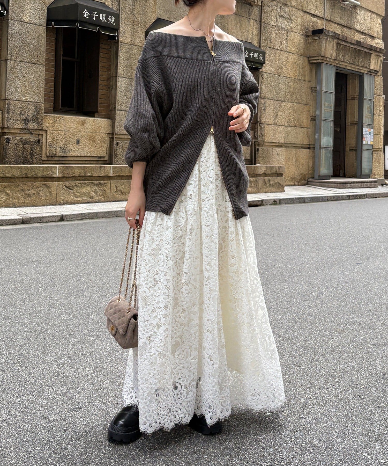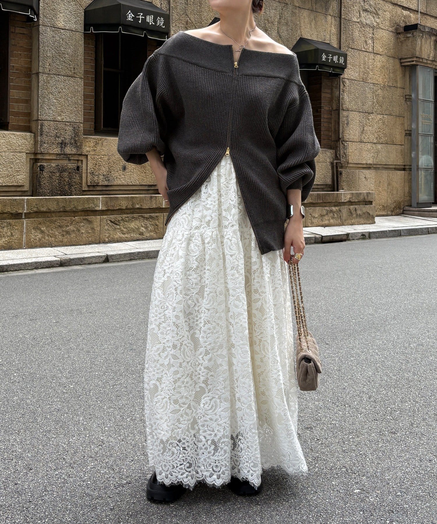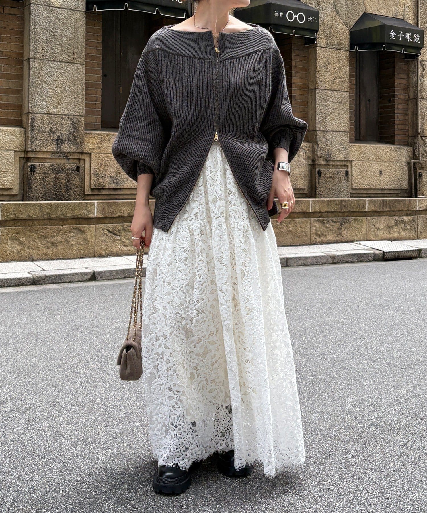 フロントにジップのデザインを施した新鮮な1着。ネックラインを広く取っているため、オフショルとして着用していただけます。