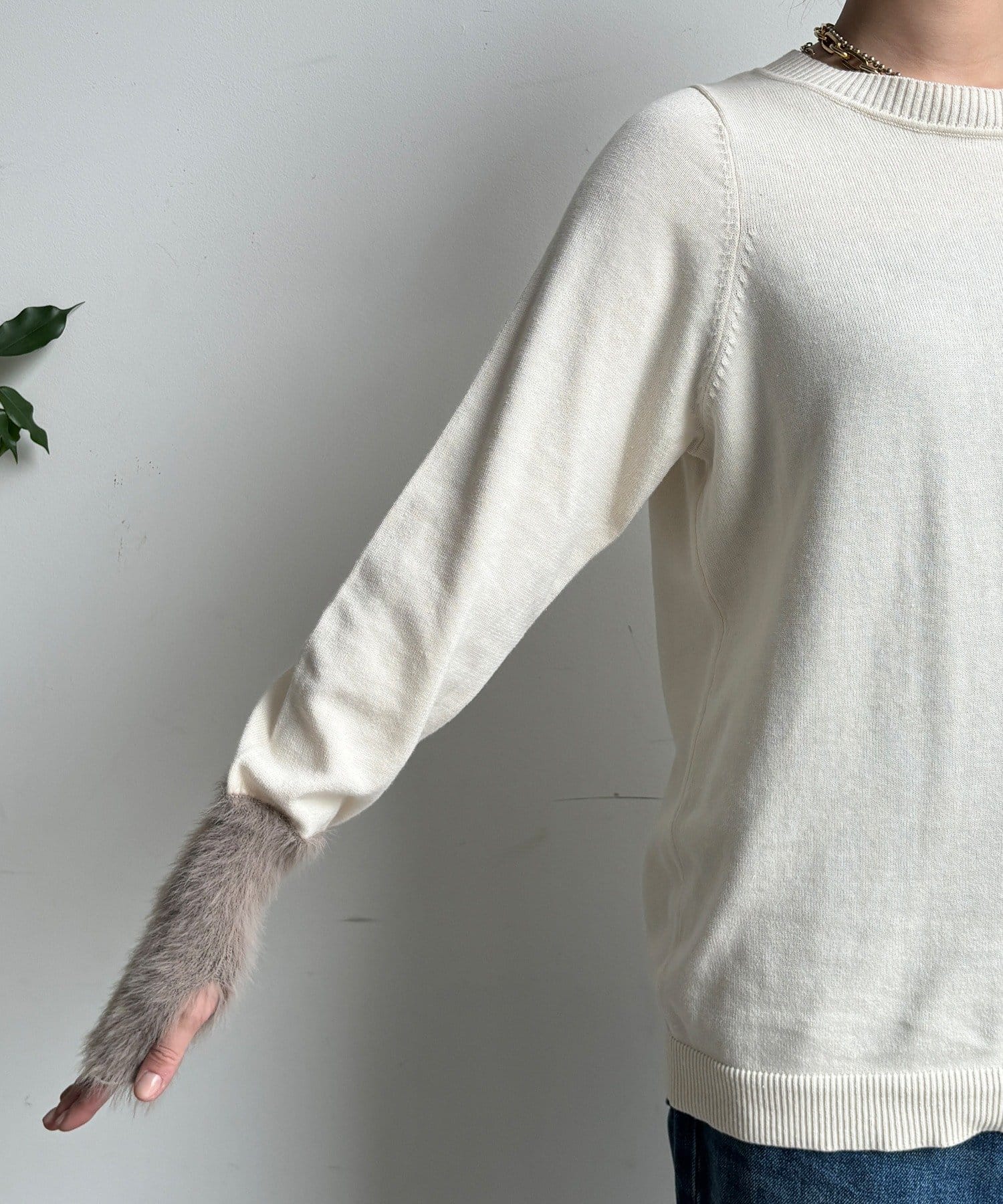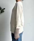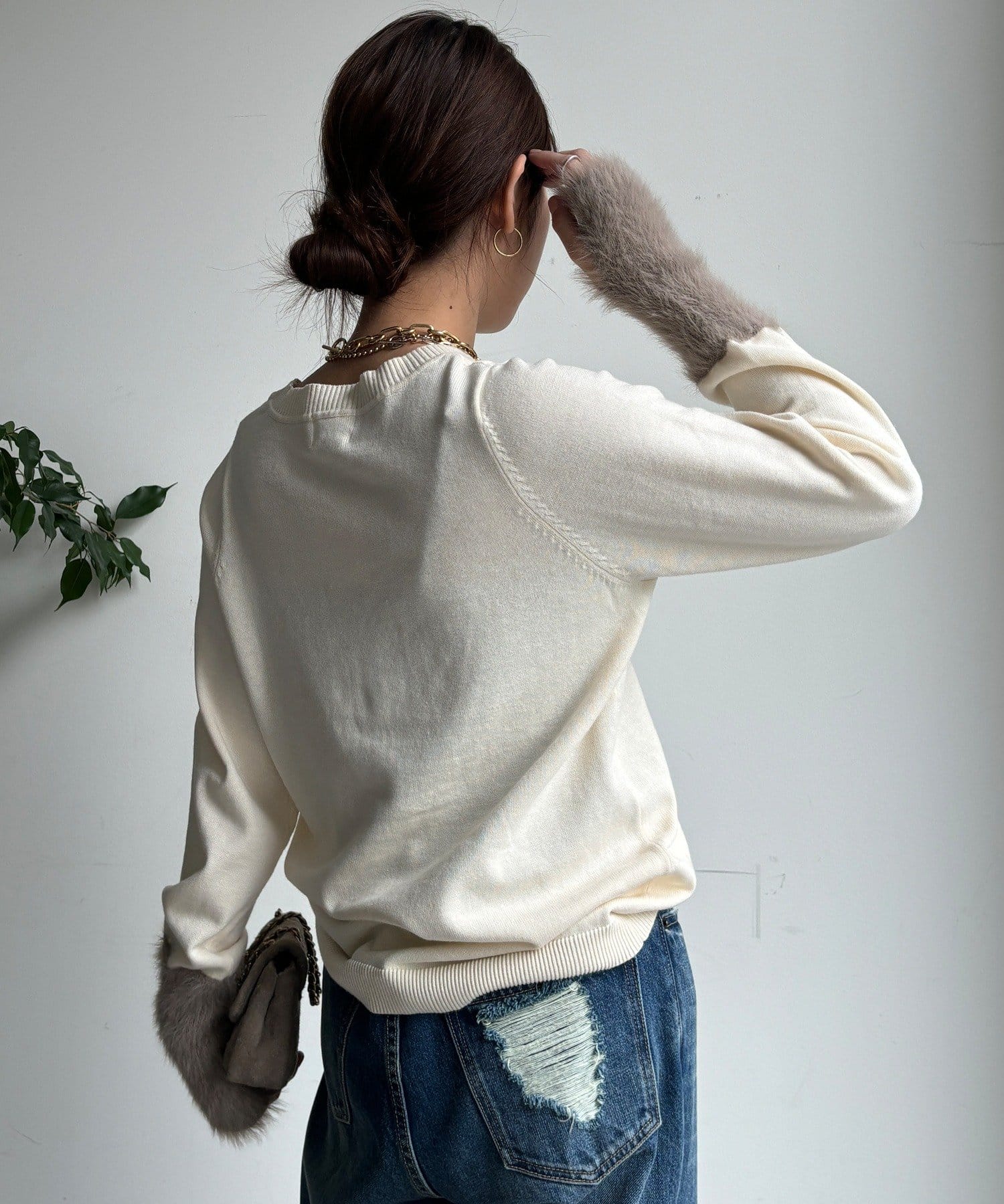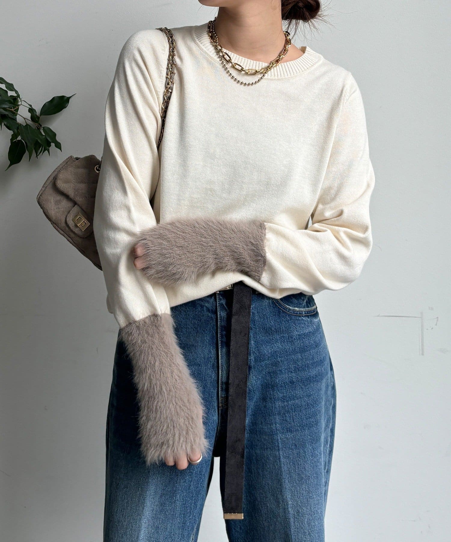 ふんわりとしたシャギー素材の袖が、シンプルな中にも程よいアクセントをプラスし、デザイン性はありながらも奇抜すぎない、上品な印象を与えます。袖口は親指を通せるホールデザインになっており、手元まで暖かく、見た目も可愛いです◎