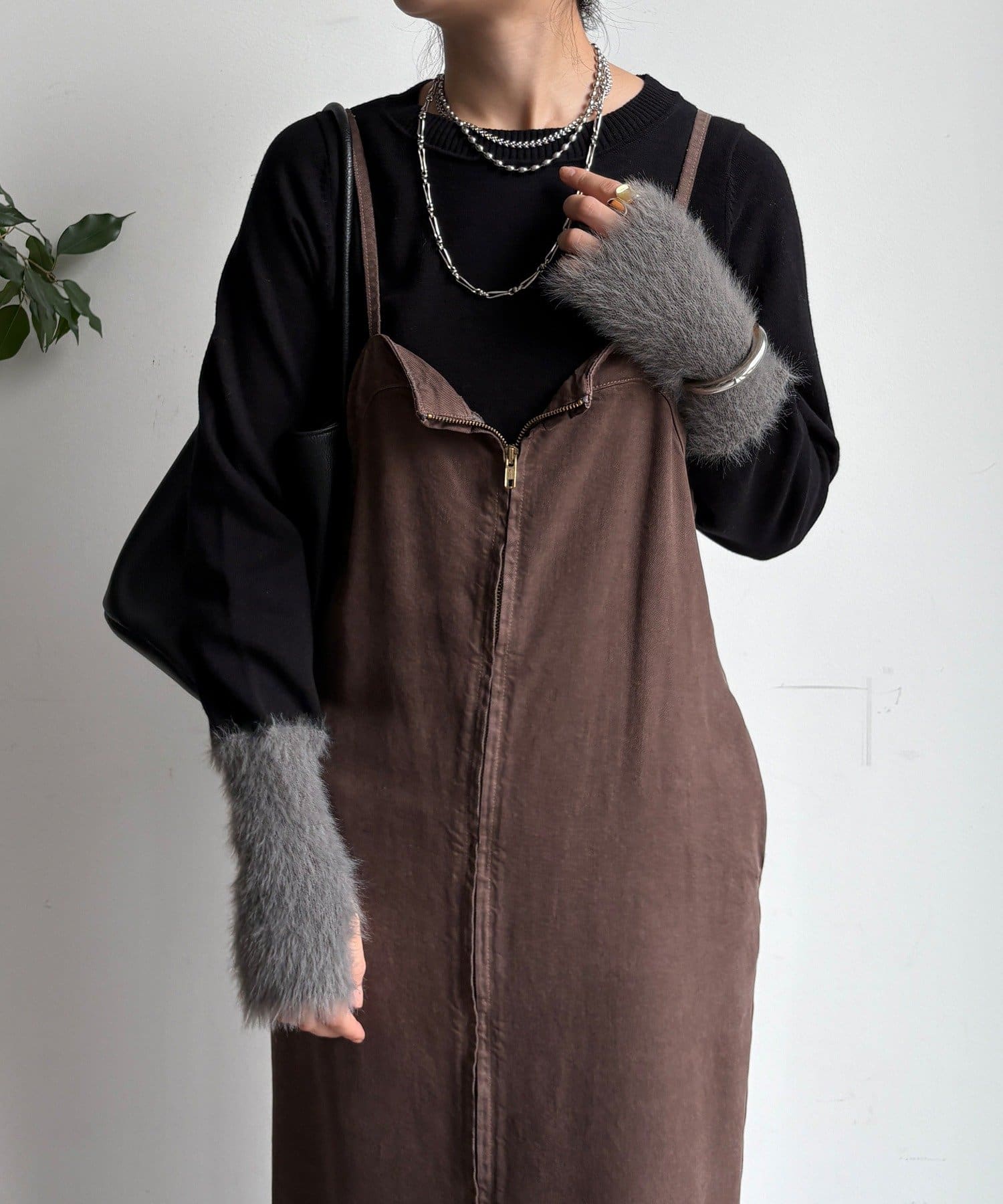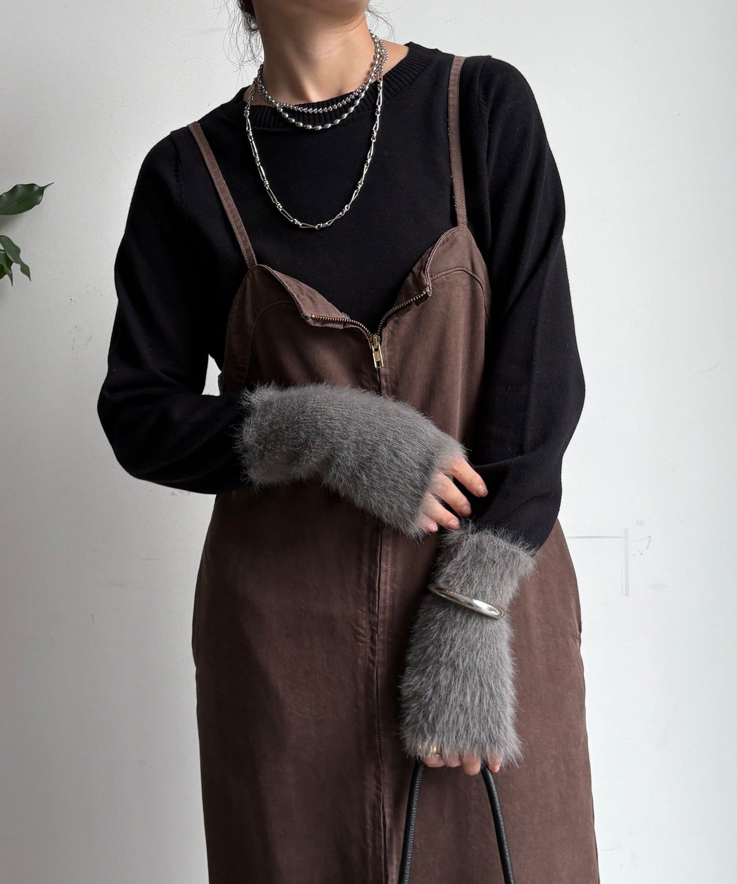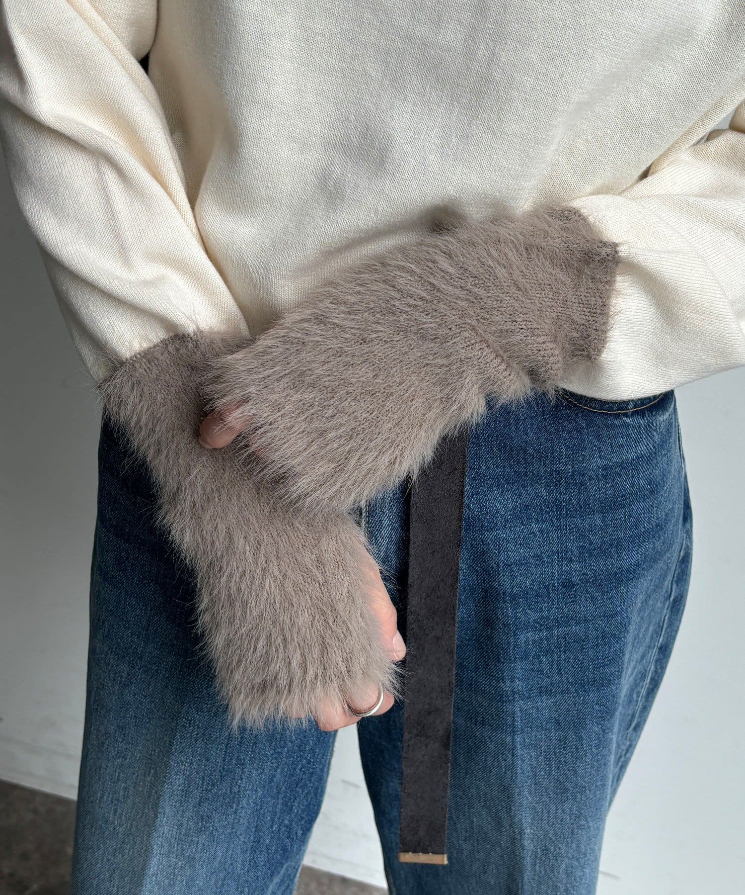 ふんわりとしたシャギー素材の袖が、シンプルな中にも程よいアクセントをプラスし、デザイン性はありながらも奇抜すぎない、上品な印象を与えます。袖口は親指を通せるホールデザインになっており、手元まで暖かく、見た目も可愛いです◎