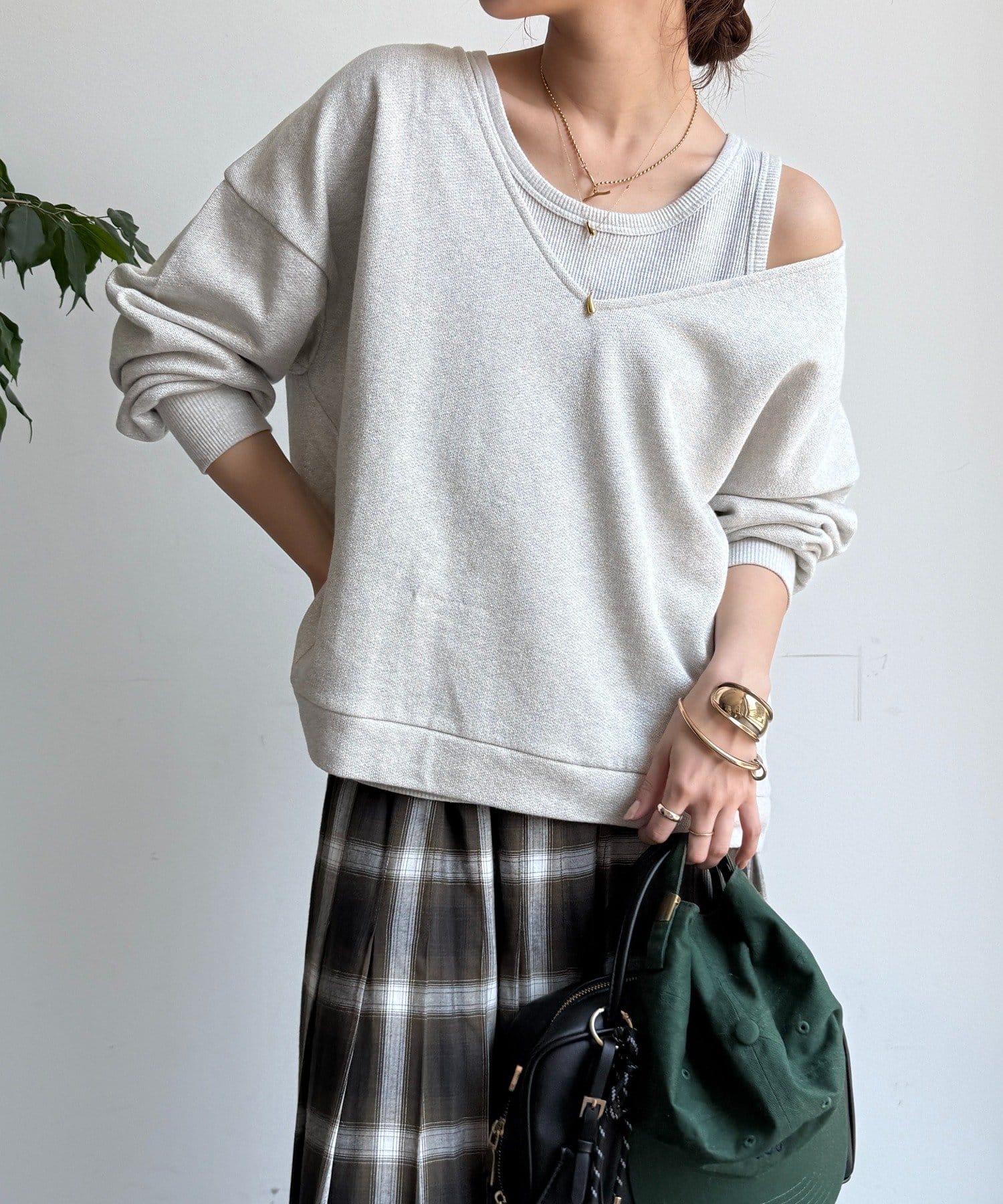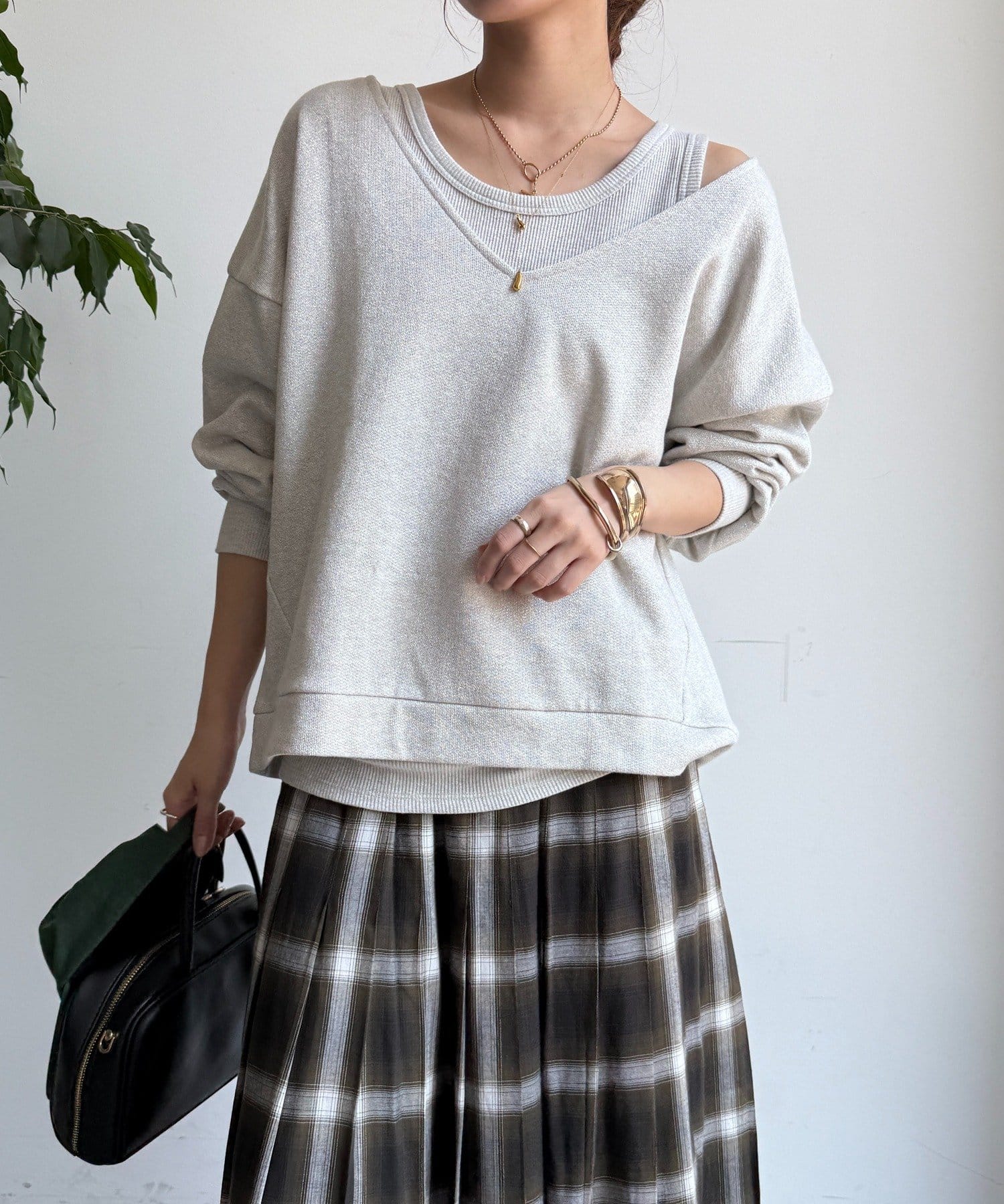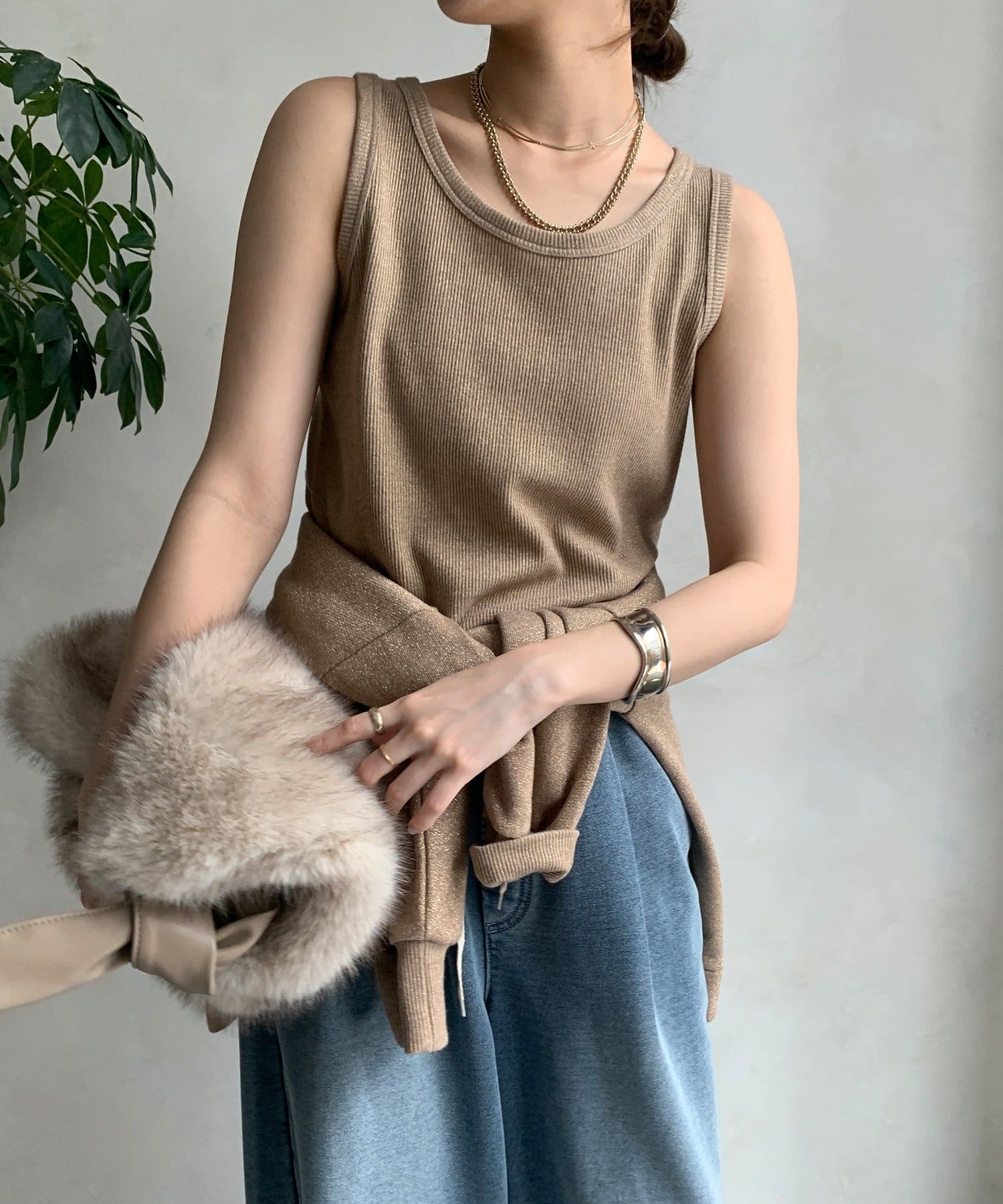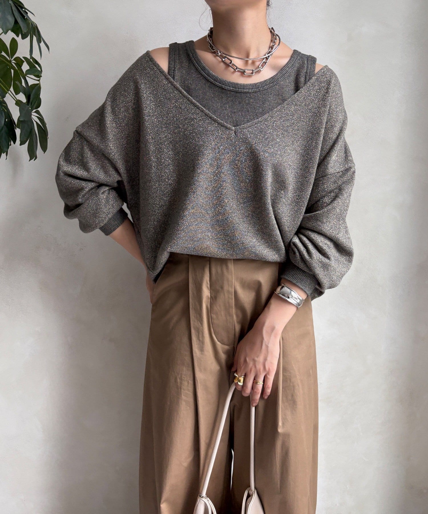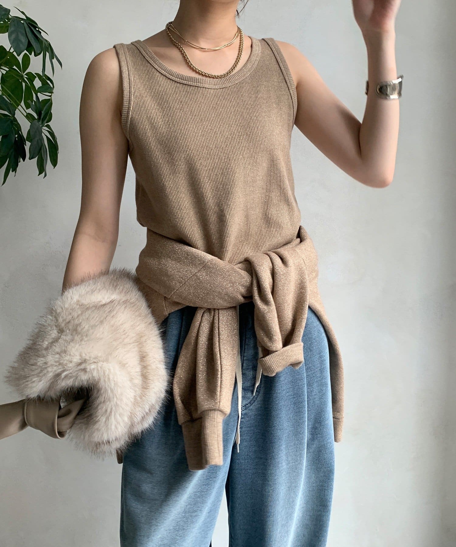 丈が長めのリブタンクトップと深く開きすぎていないVネックのスウェット。