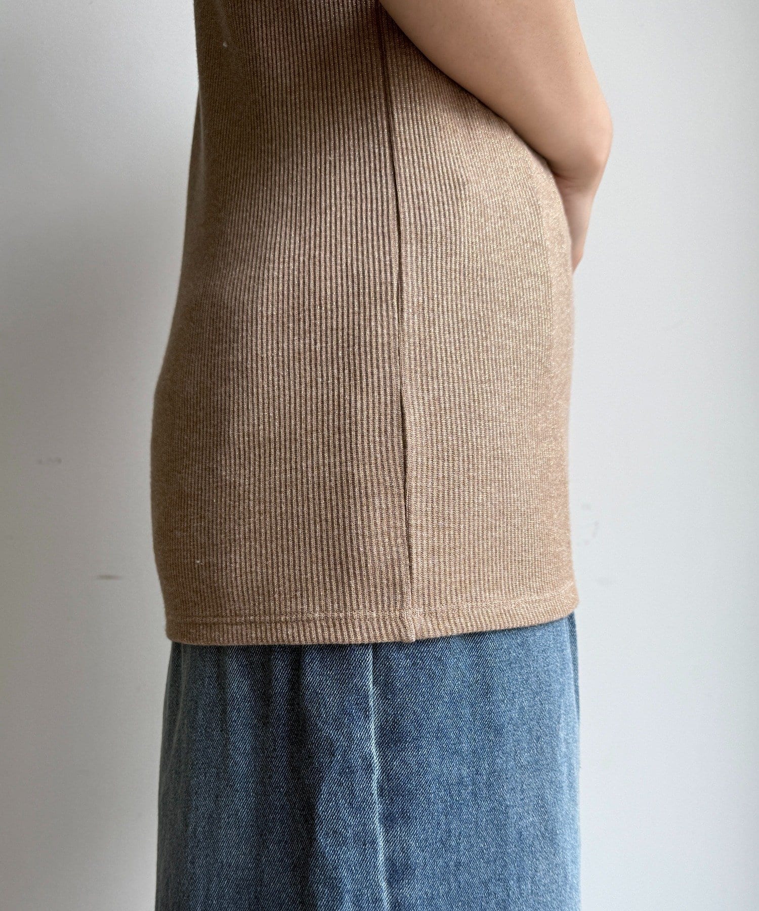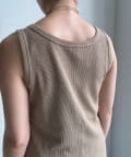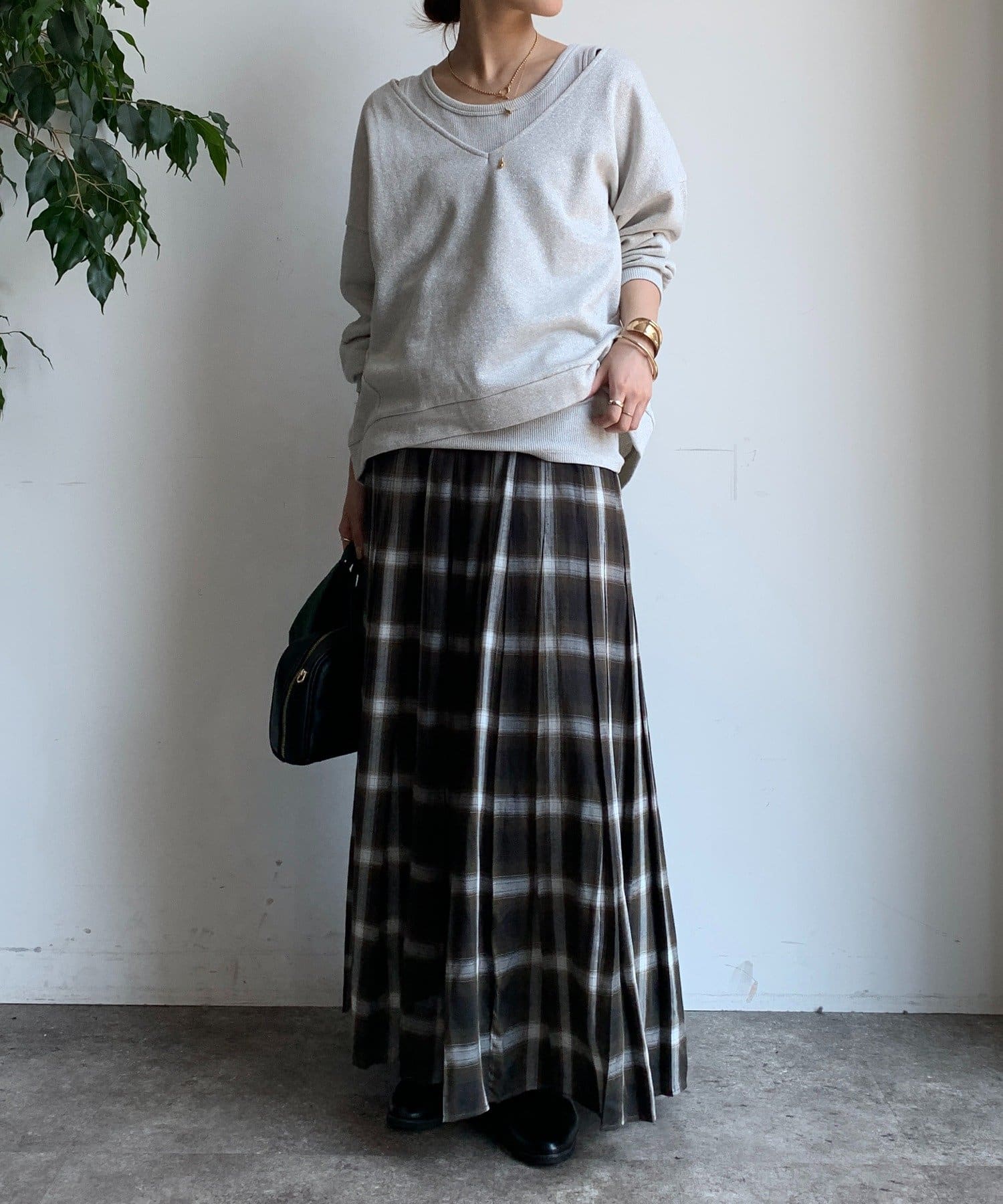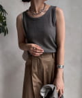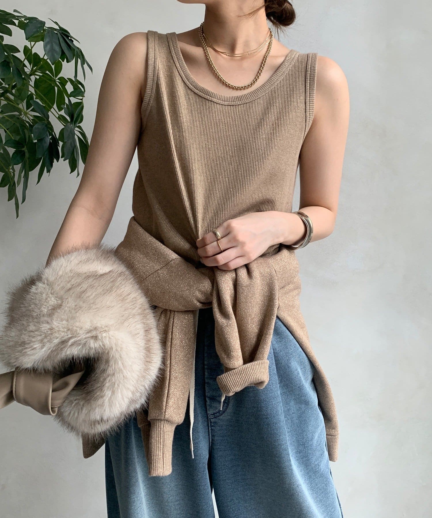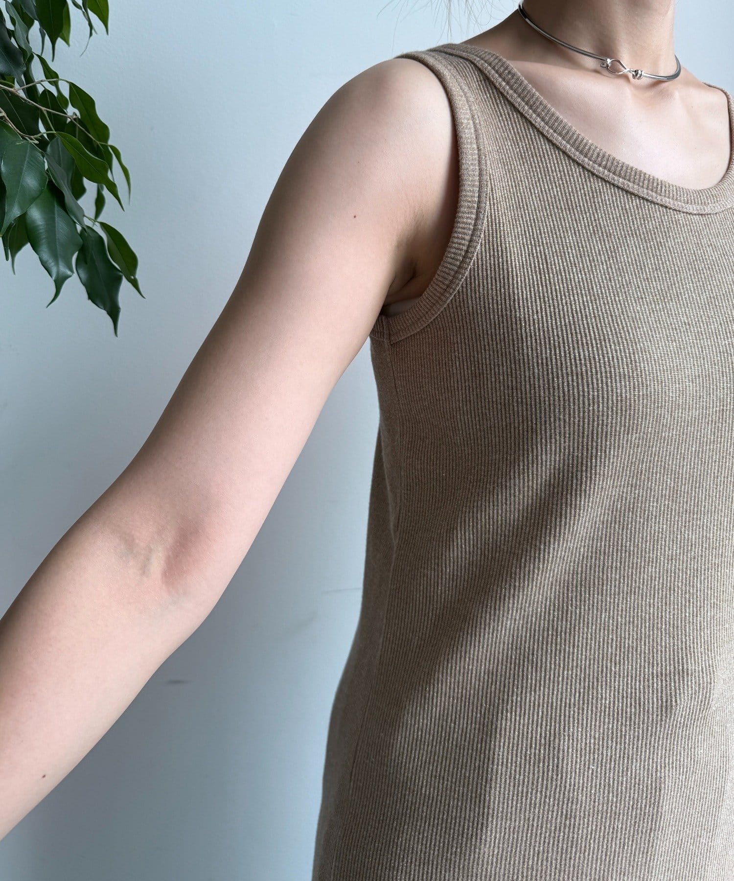 丈が長めのリブタンクトップと深く開きすぎていないVネックのスウェット。