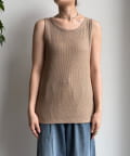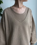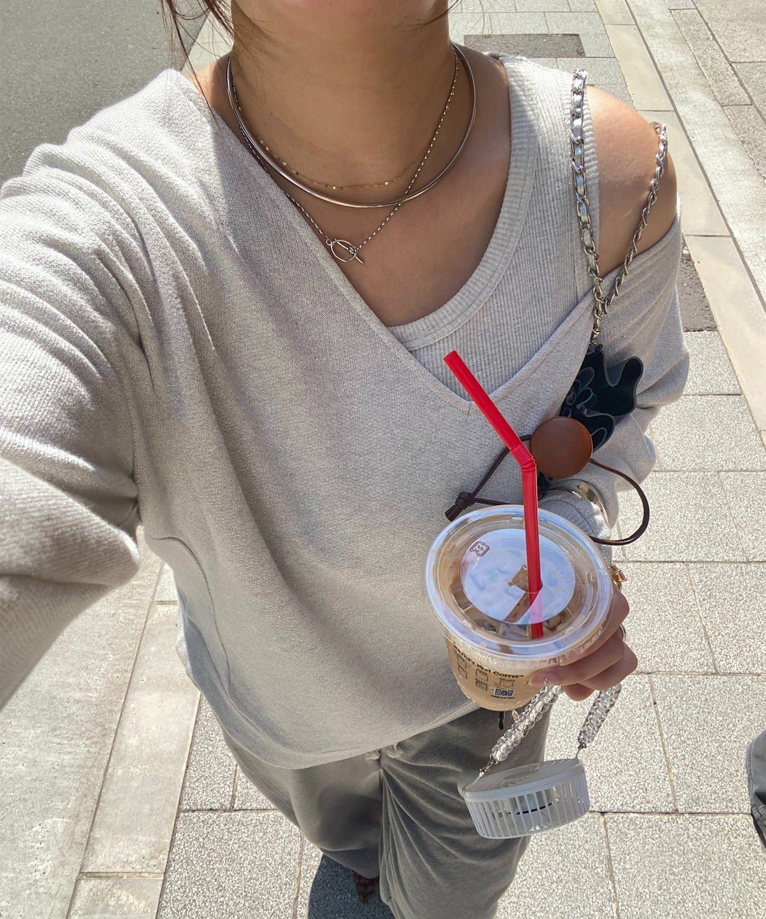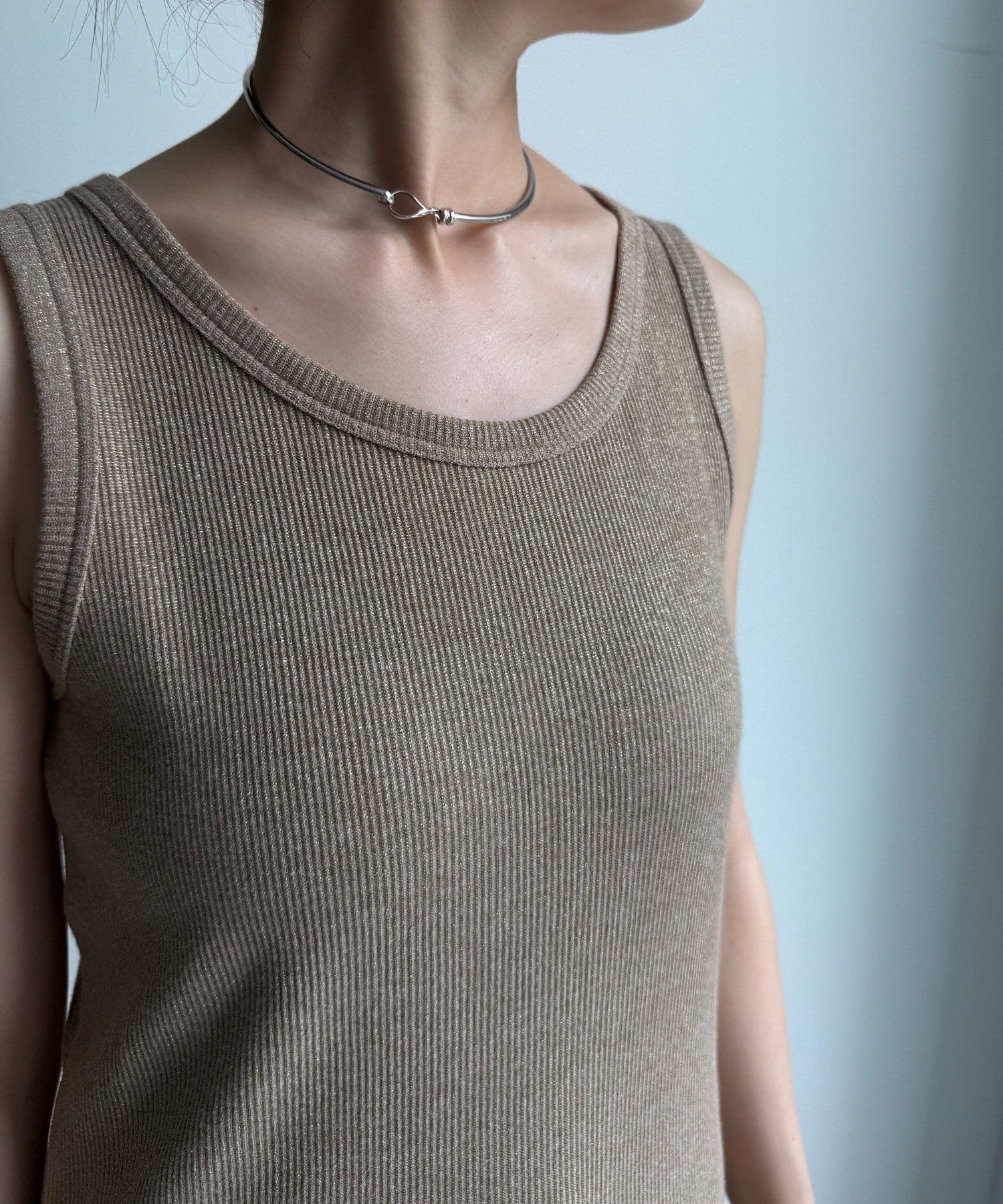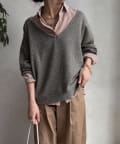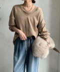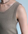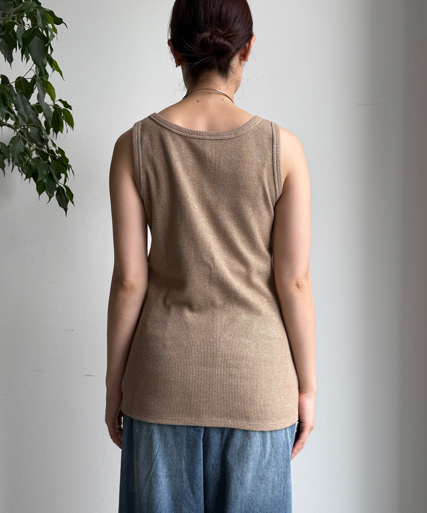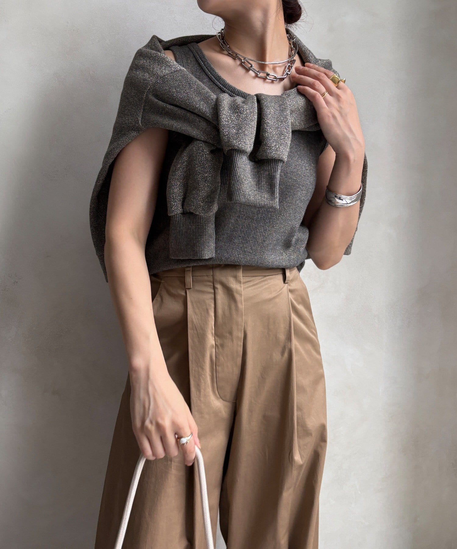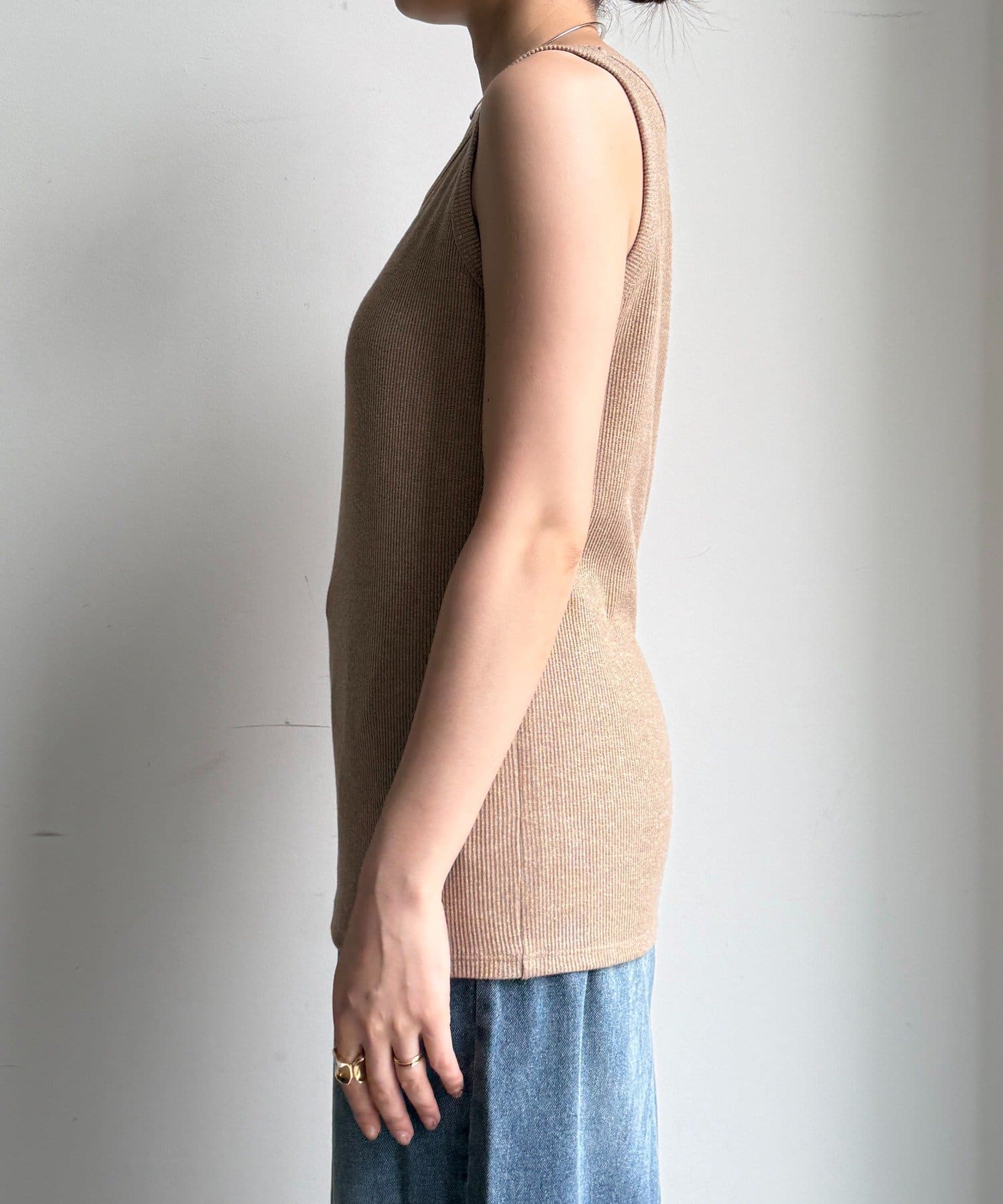 丈が長めのリブタンクトップと深く開きすぎていないVネックのスウェット。