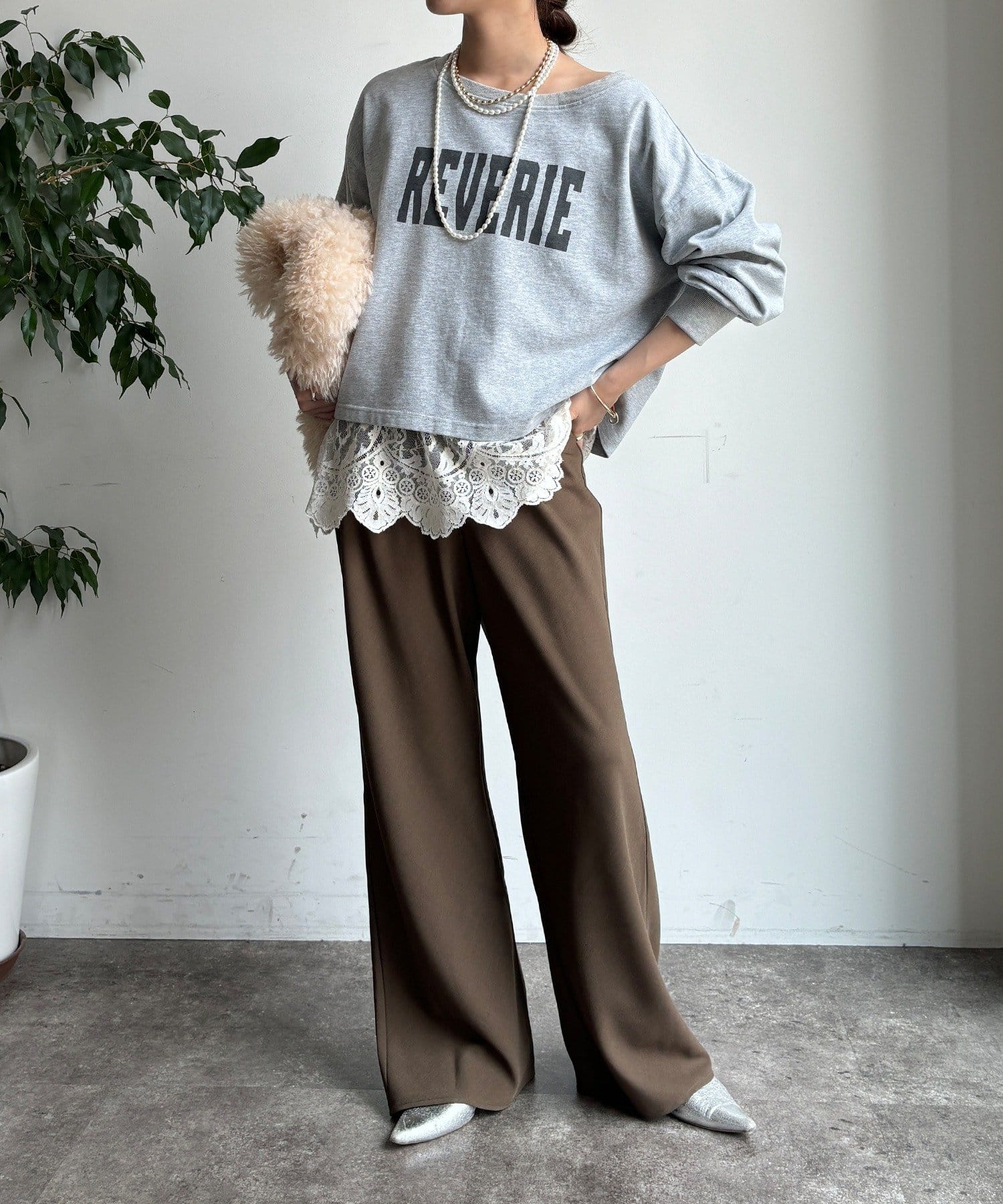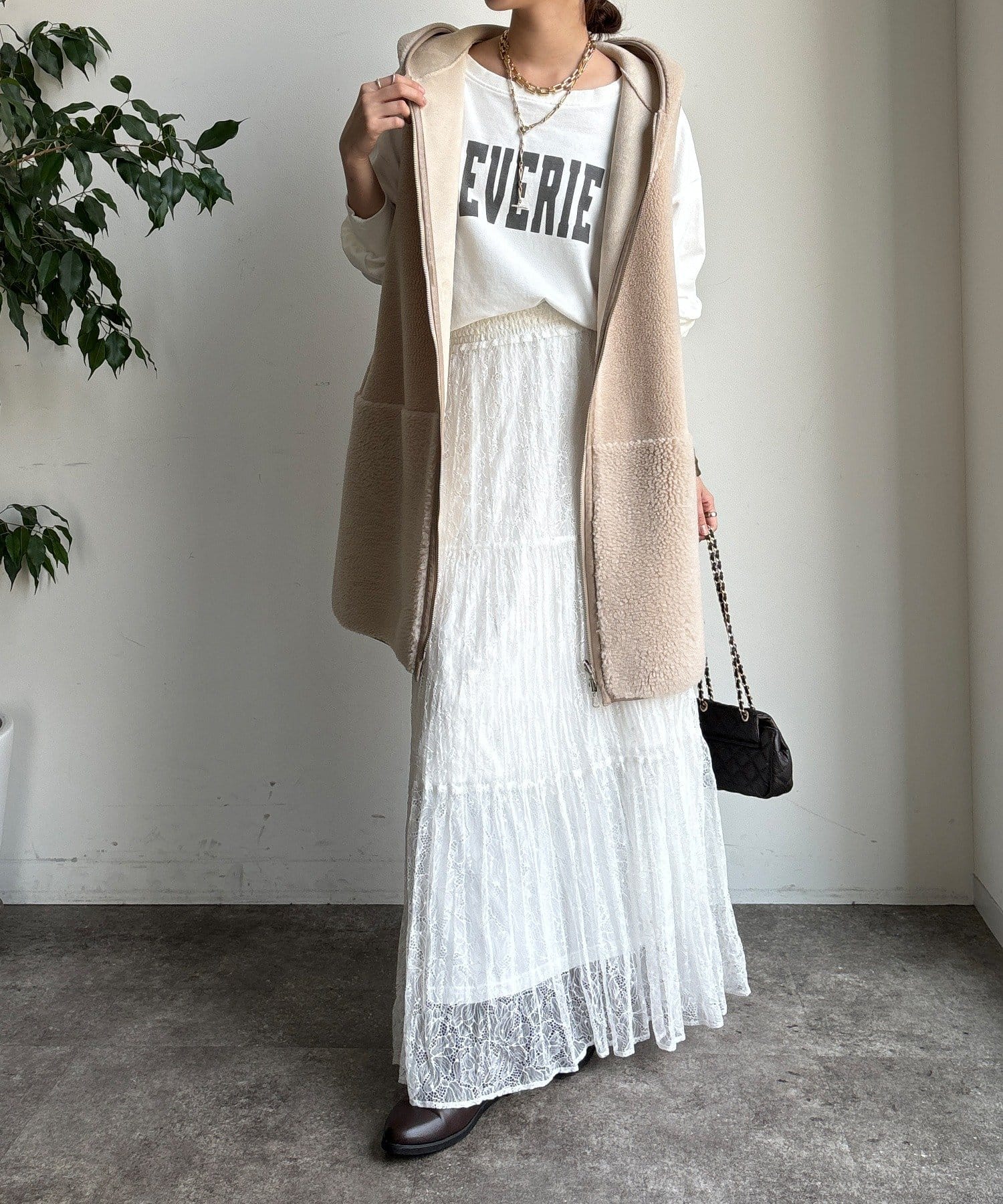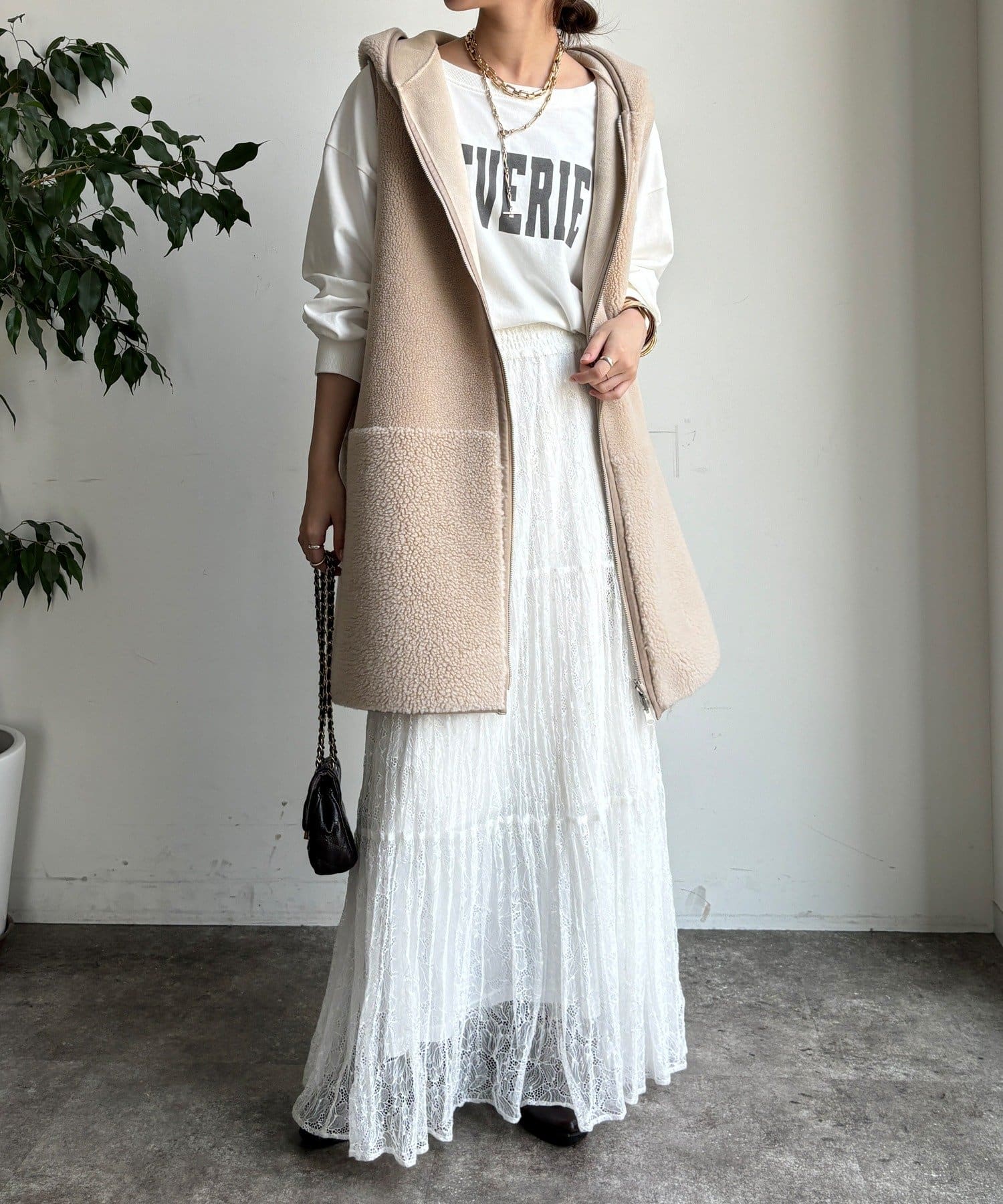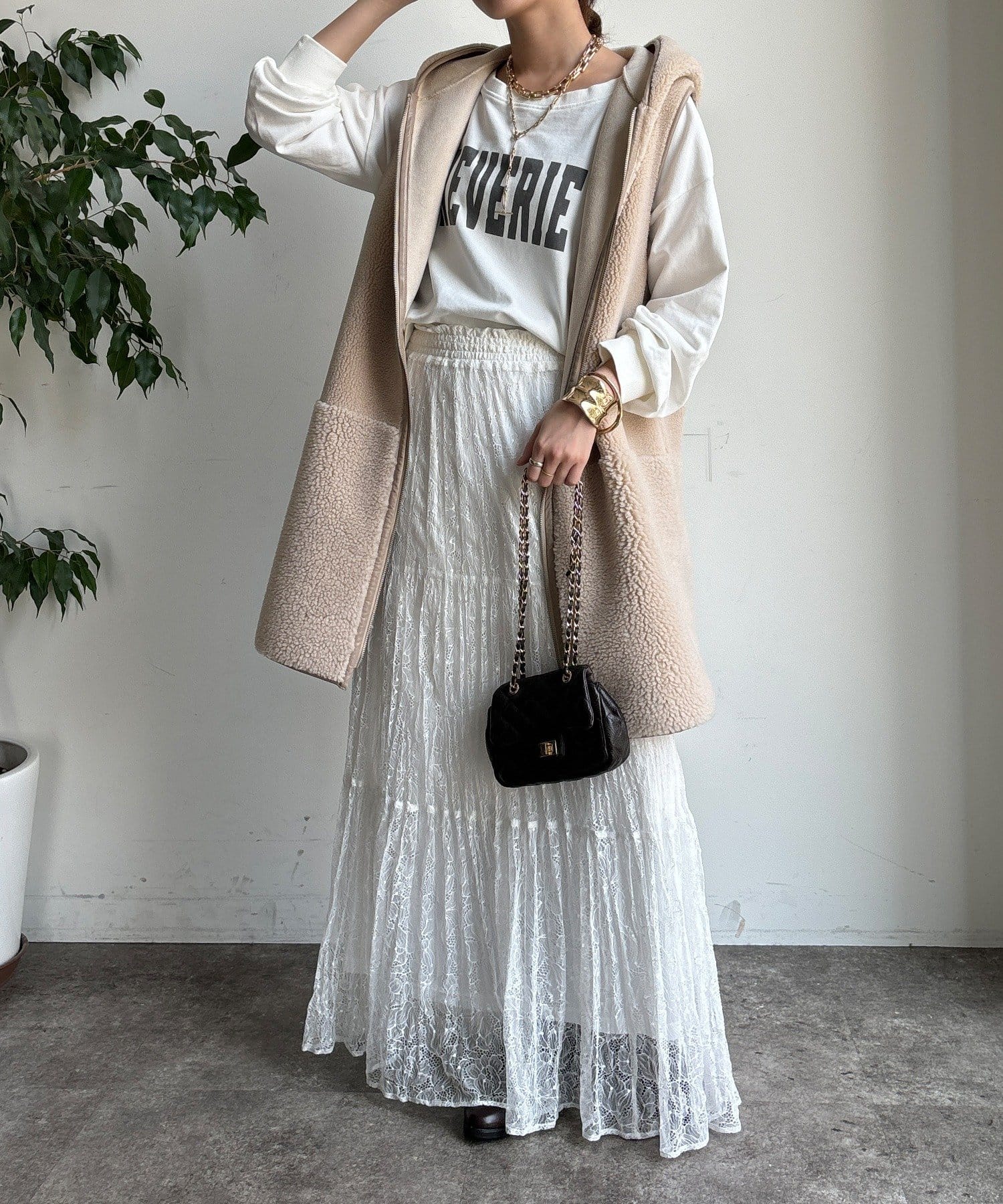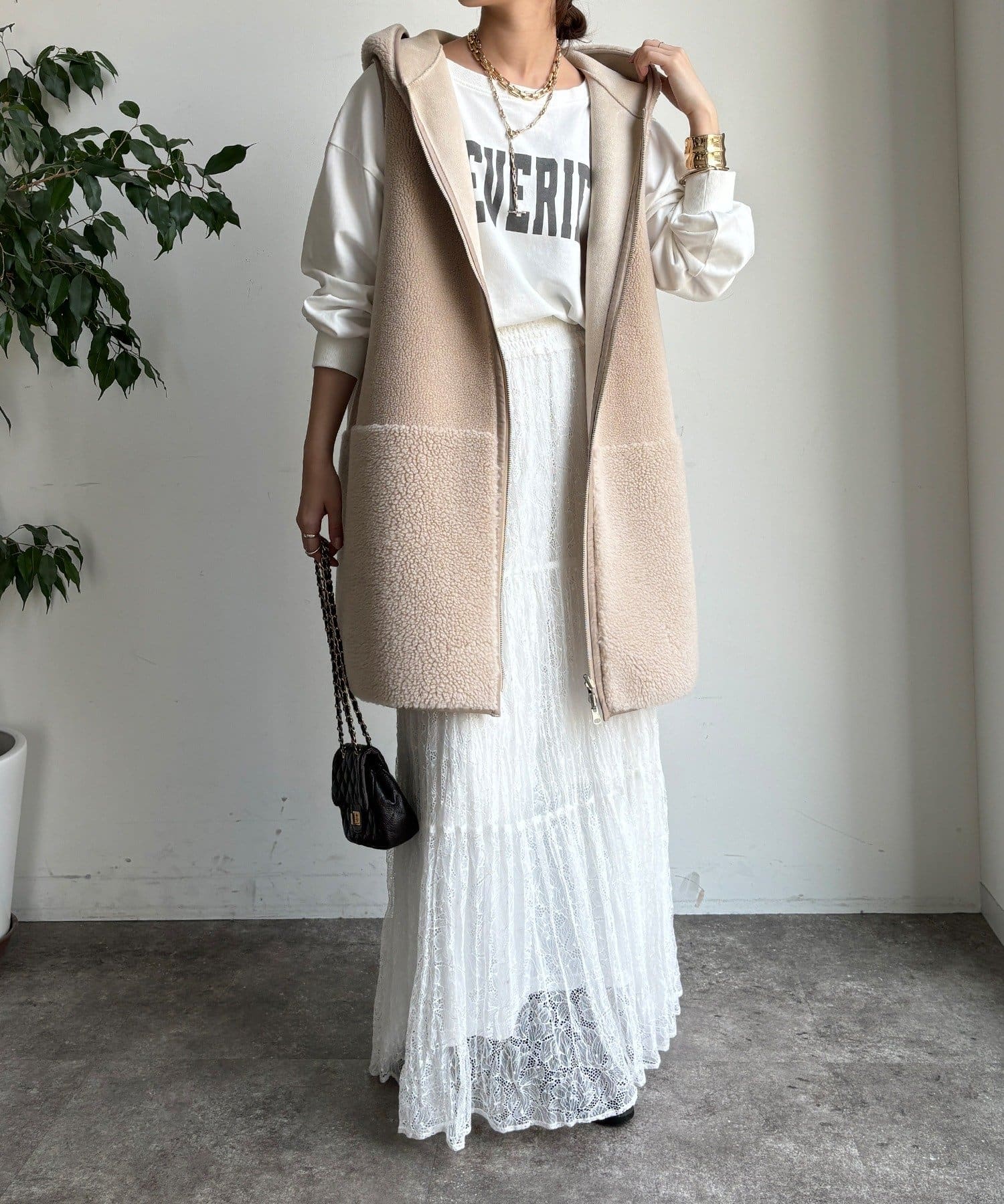 レーストップスなどをインナーに重ねて、レイヤードスタイルを楽しめます。