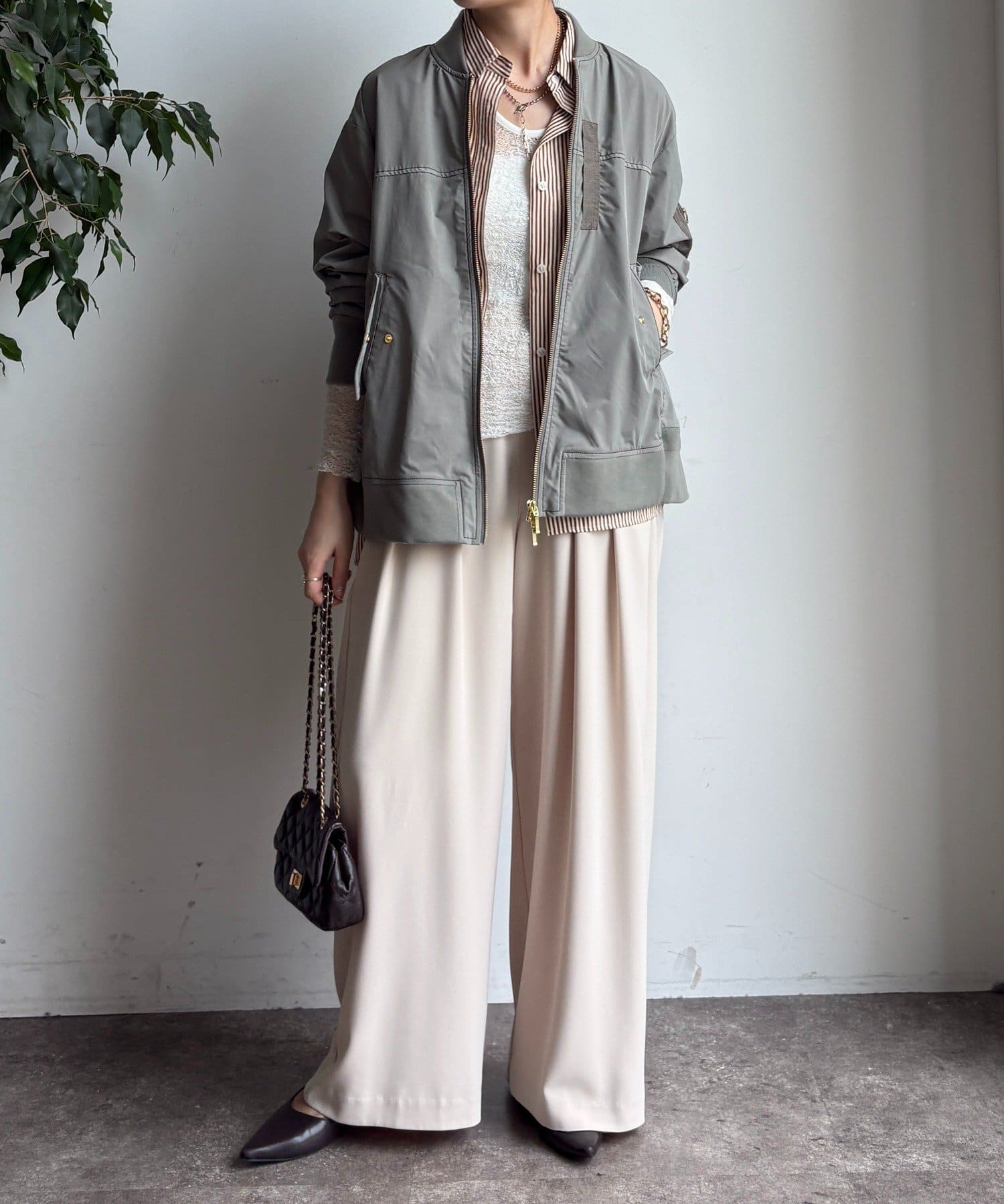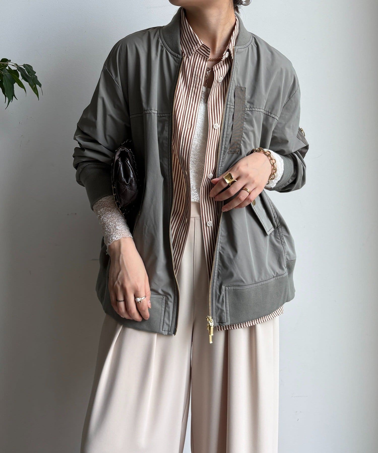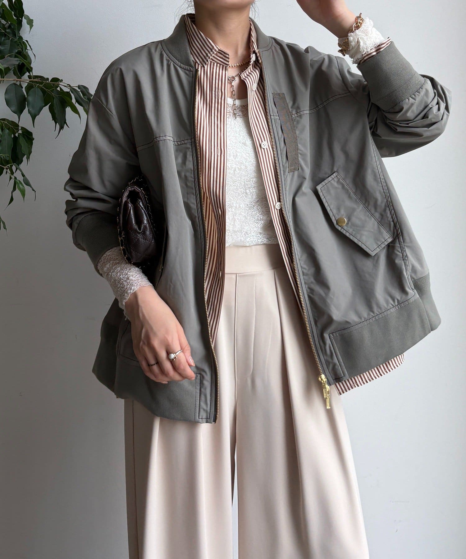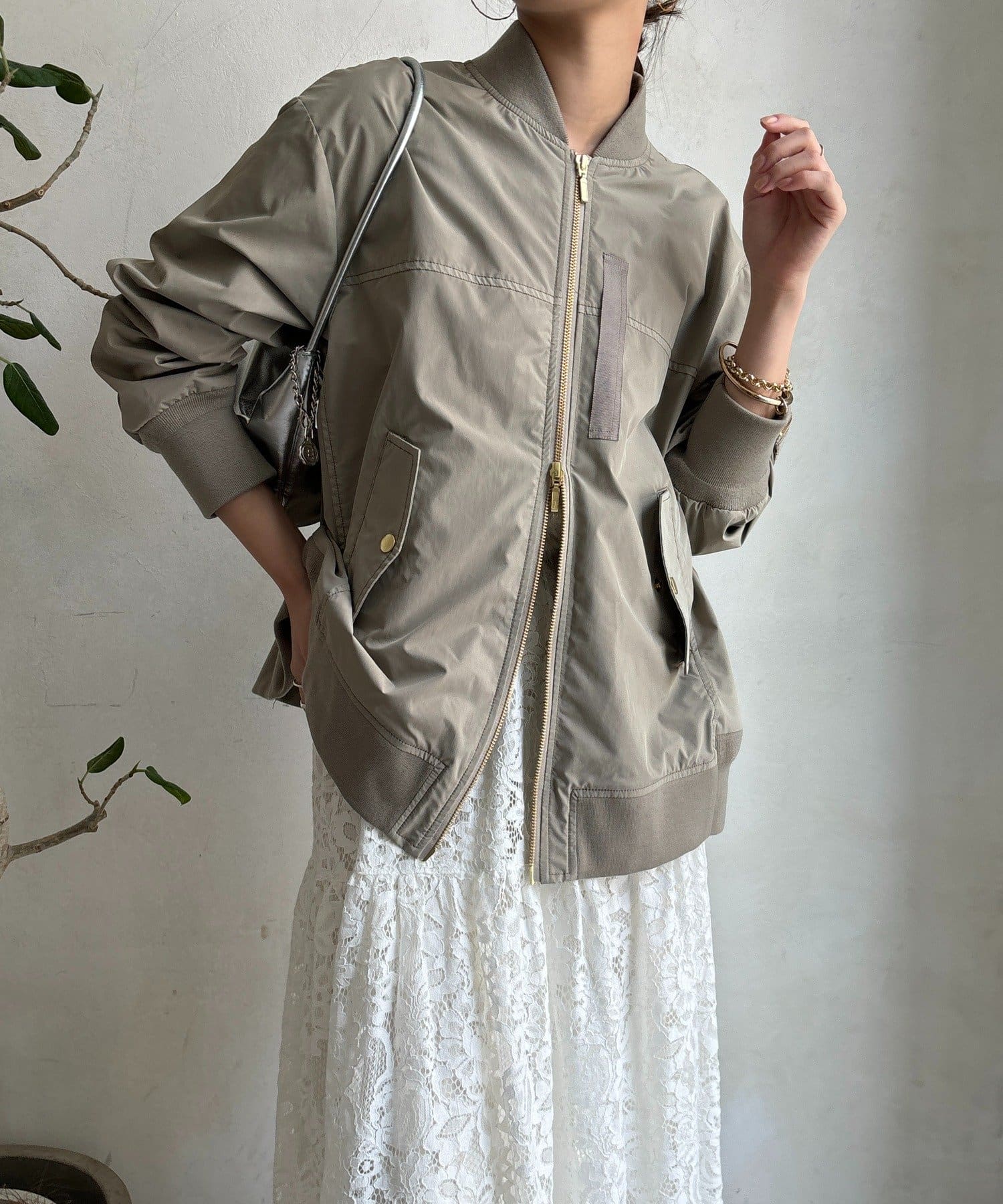 店舗で試着して気に入り購入しました。スカートやワイドパンツ とも合わせやすい丈感で、ダブルジップなのもアレンジしやすくて嬉しいです。カーキと言っても、淡い色合いなのでミリタリーっぽくならず、春でも使えそう!