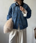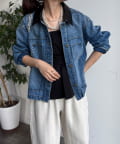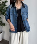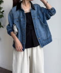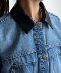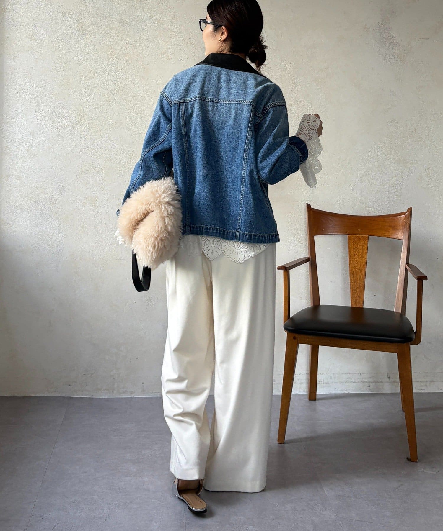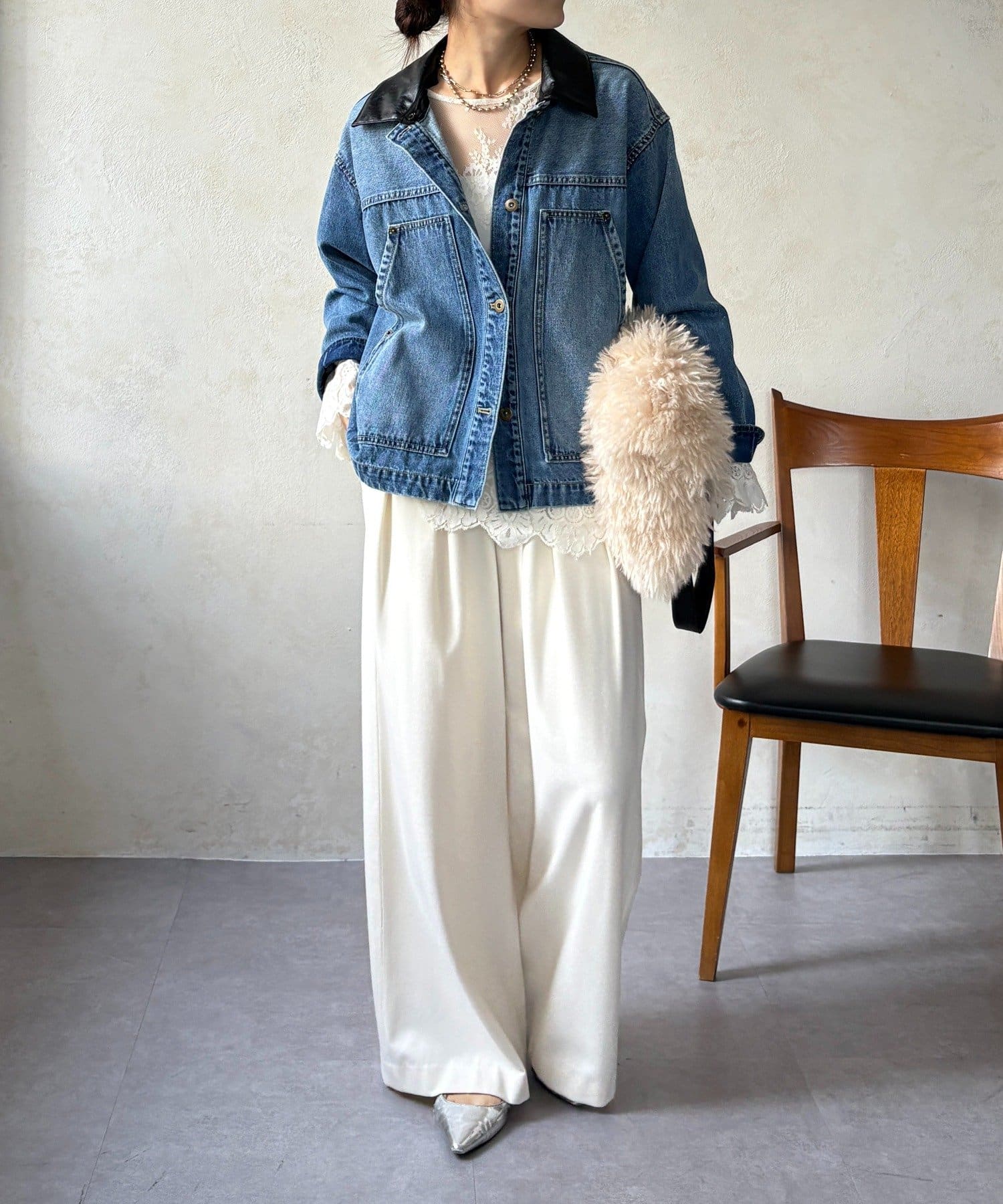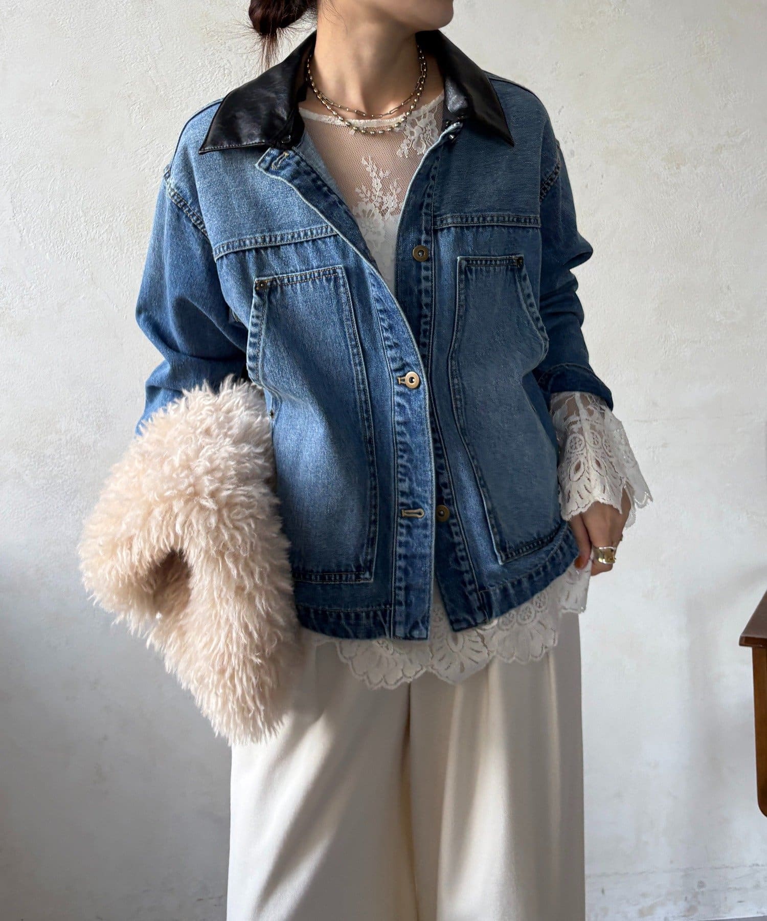 クラシカルなデニムジャケットに、ブラックのフェイクレザーカラーを組み合わせた、シーズンムード高まる1着。