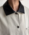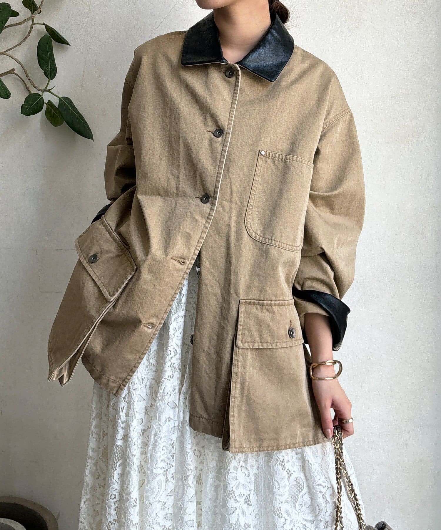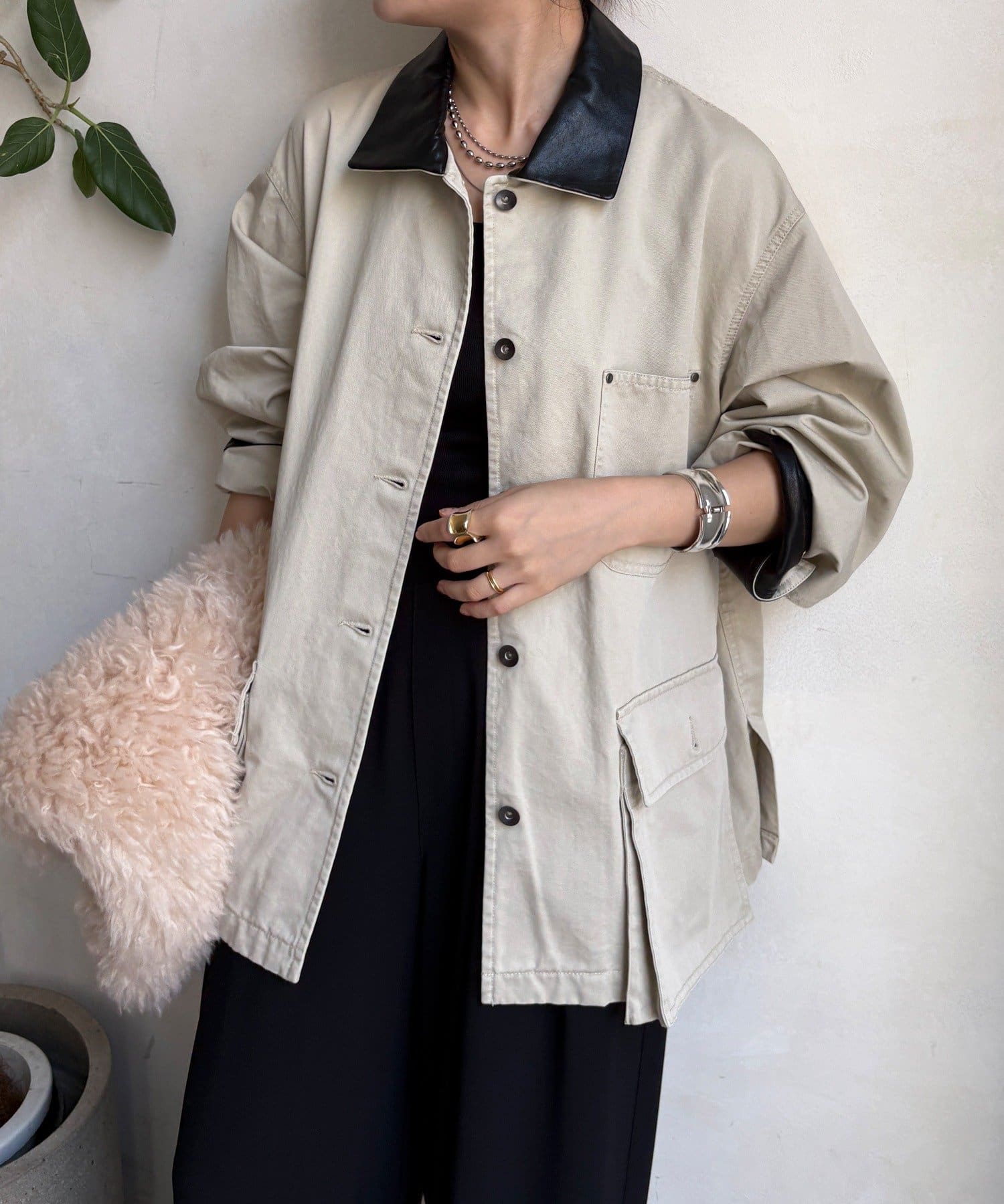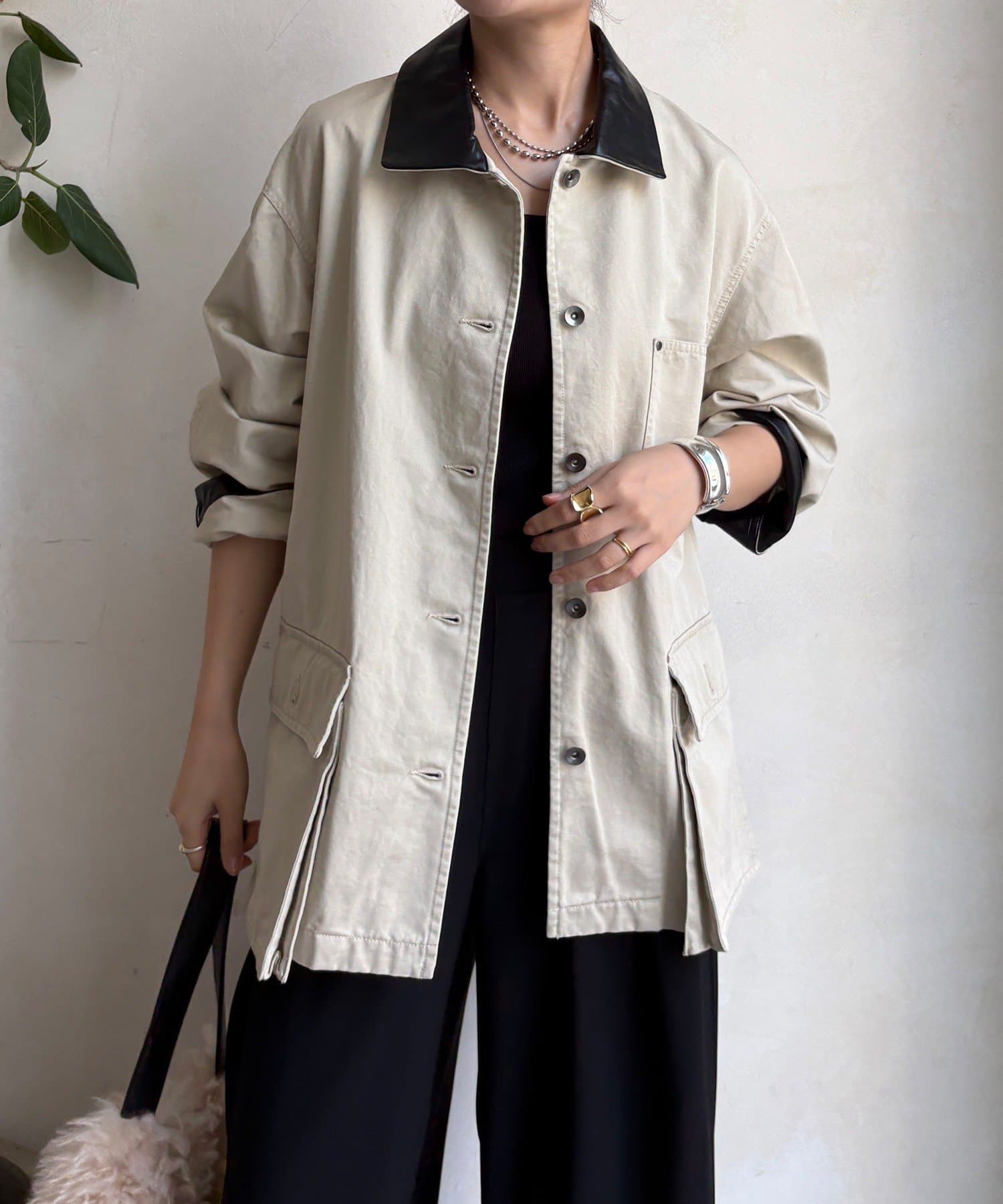 落ち着いたナチュラルカラーと、上品見えをプラスする合皮のバイカラーが魅力のワークジャケット。