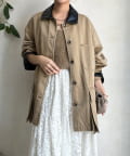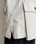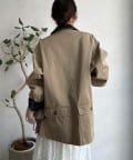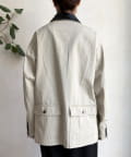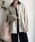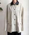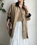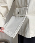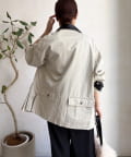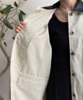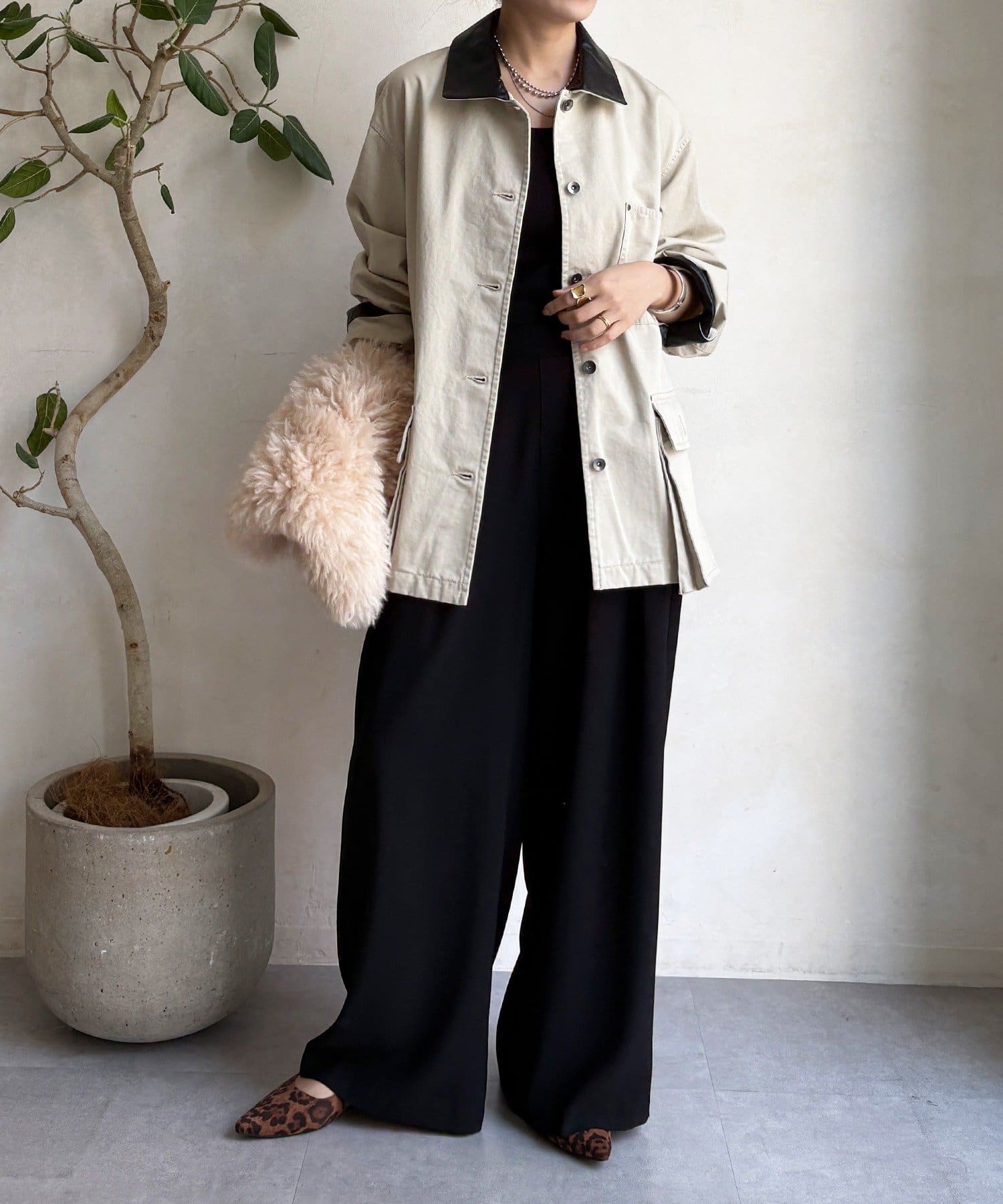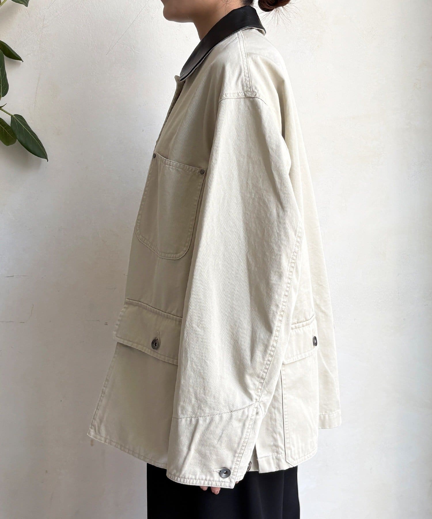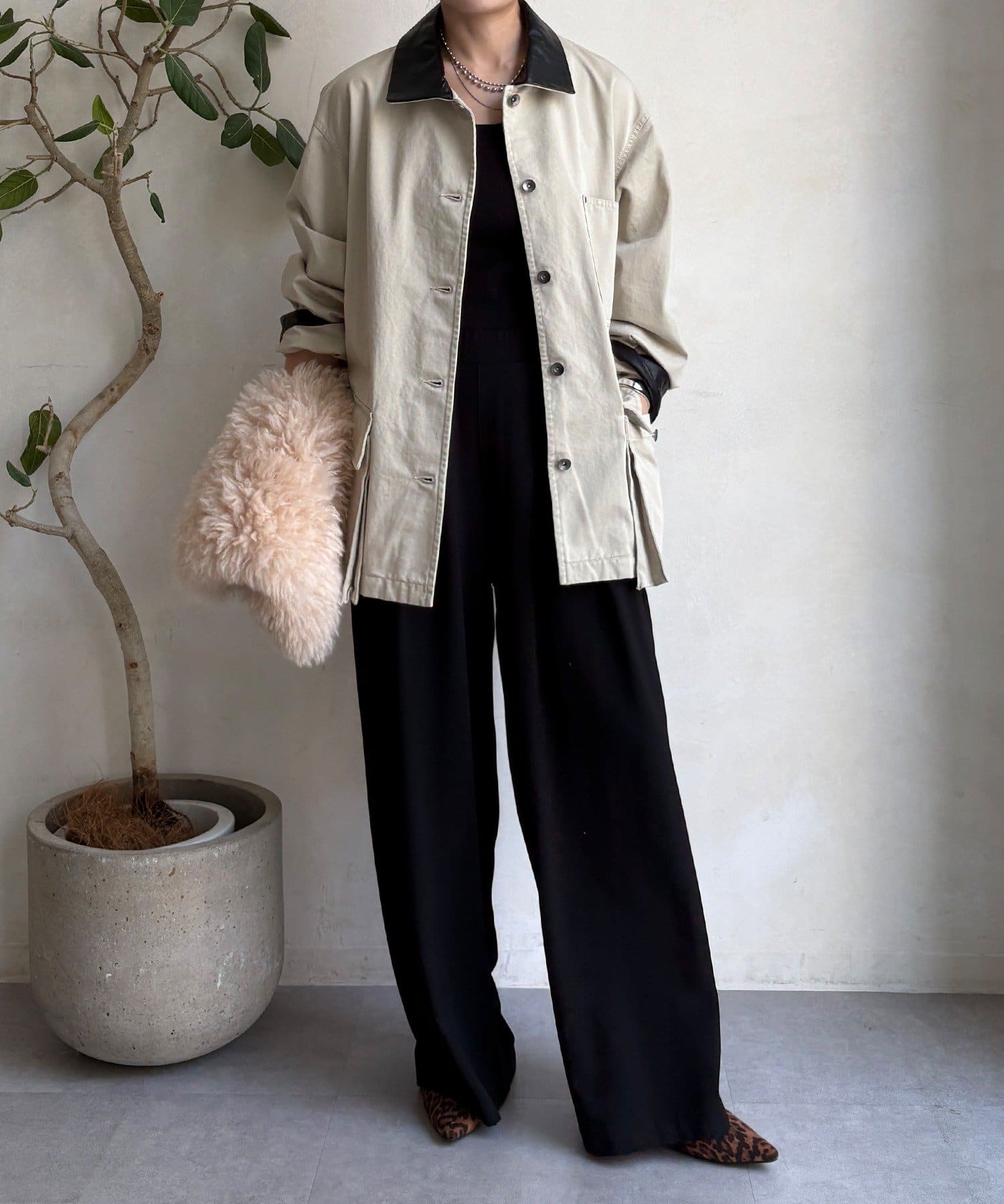 落ち着いたナチュラルカラーと、上品見えをプラスする合皮のバイカラーが魅力のワークジャケット。