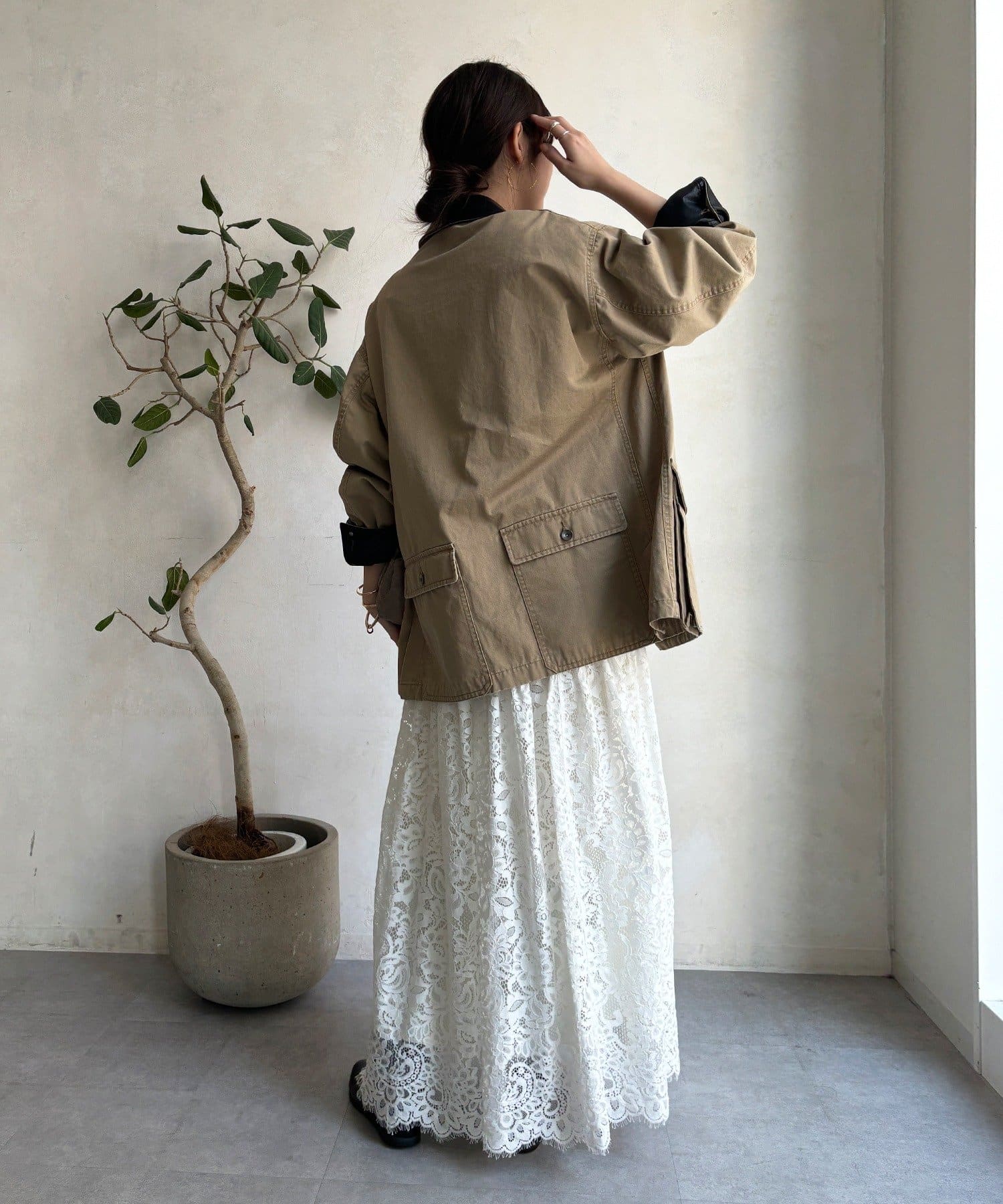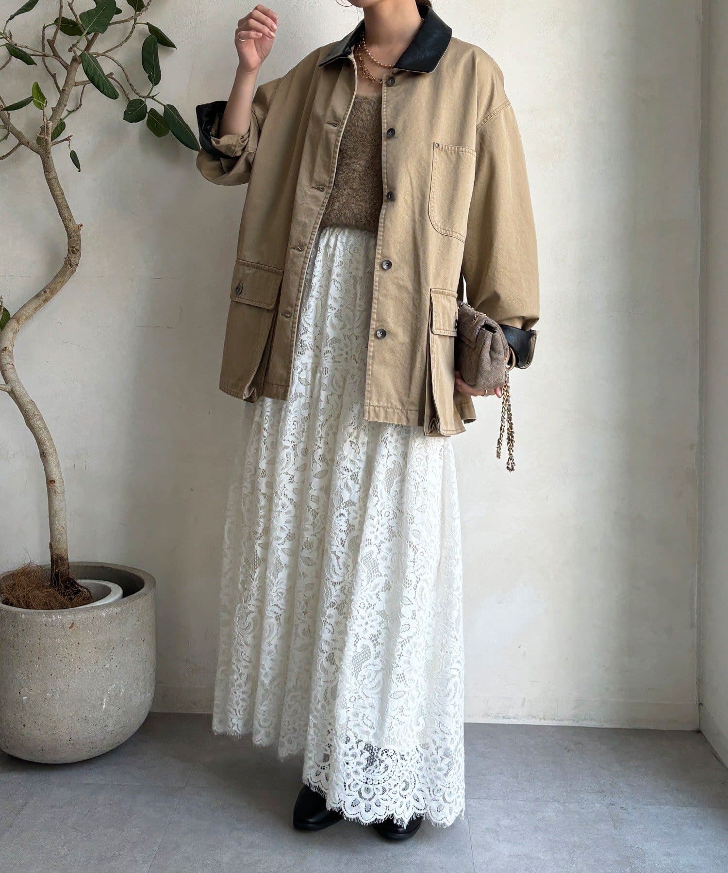 カジュアルに合わせるのはもちろん、スカートと合わせたフェミニンMIXのスタイルもおすすめ。