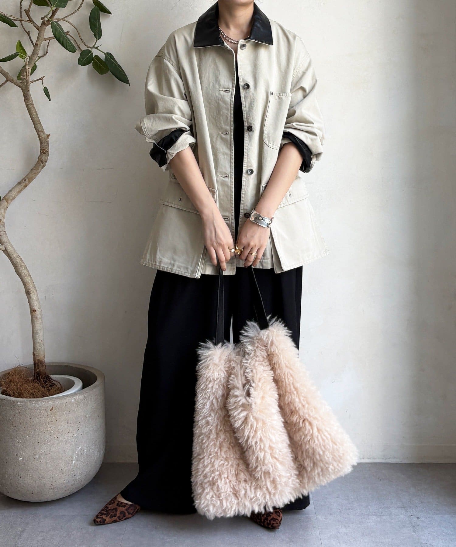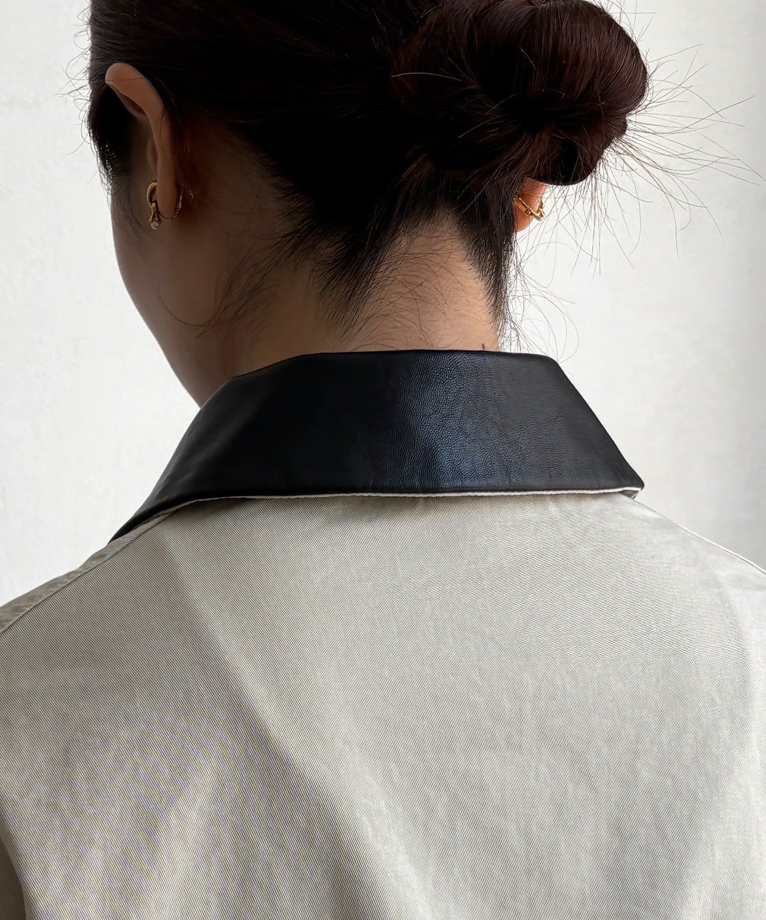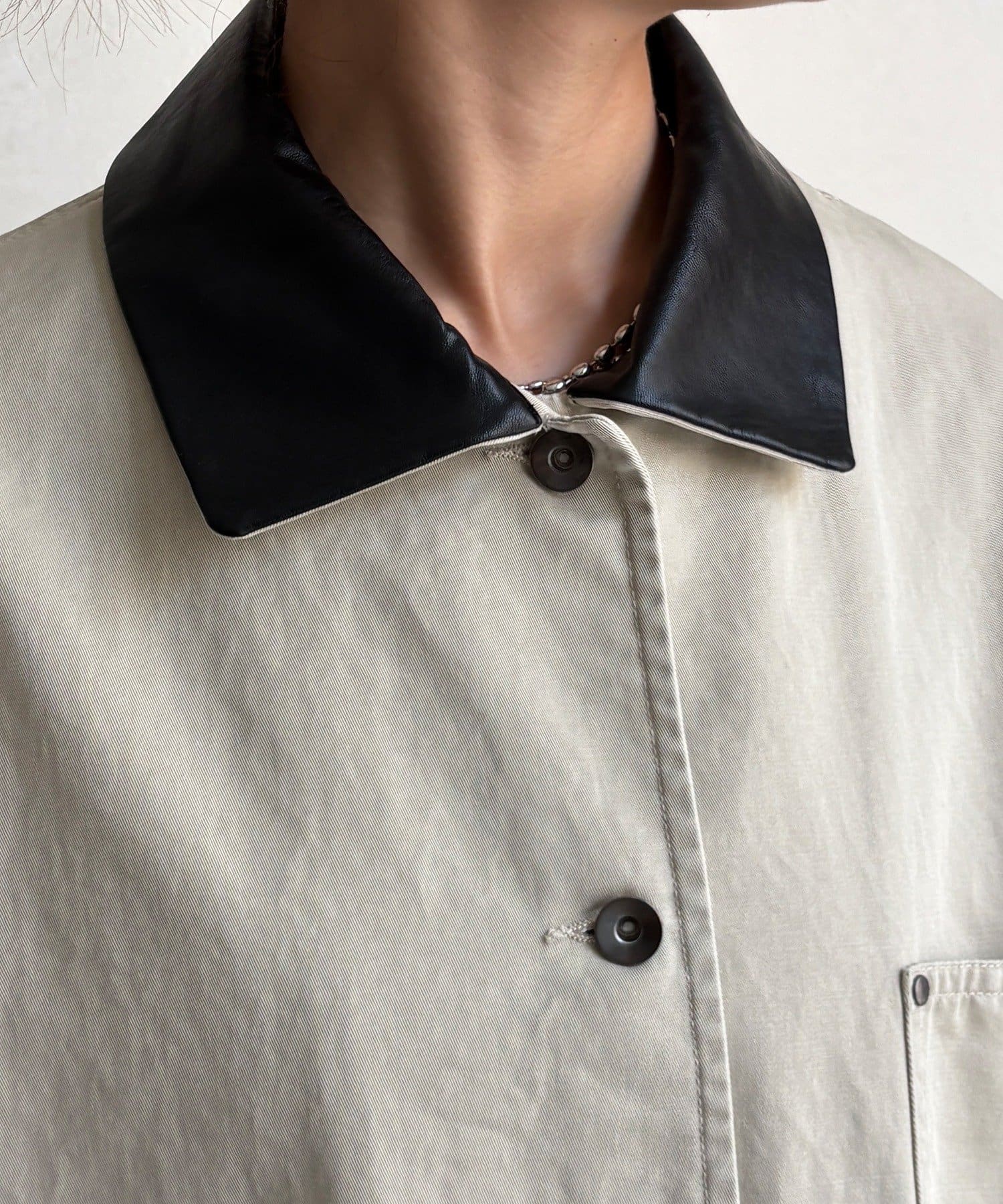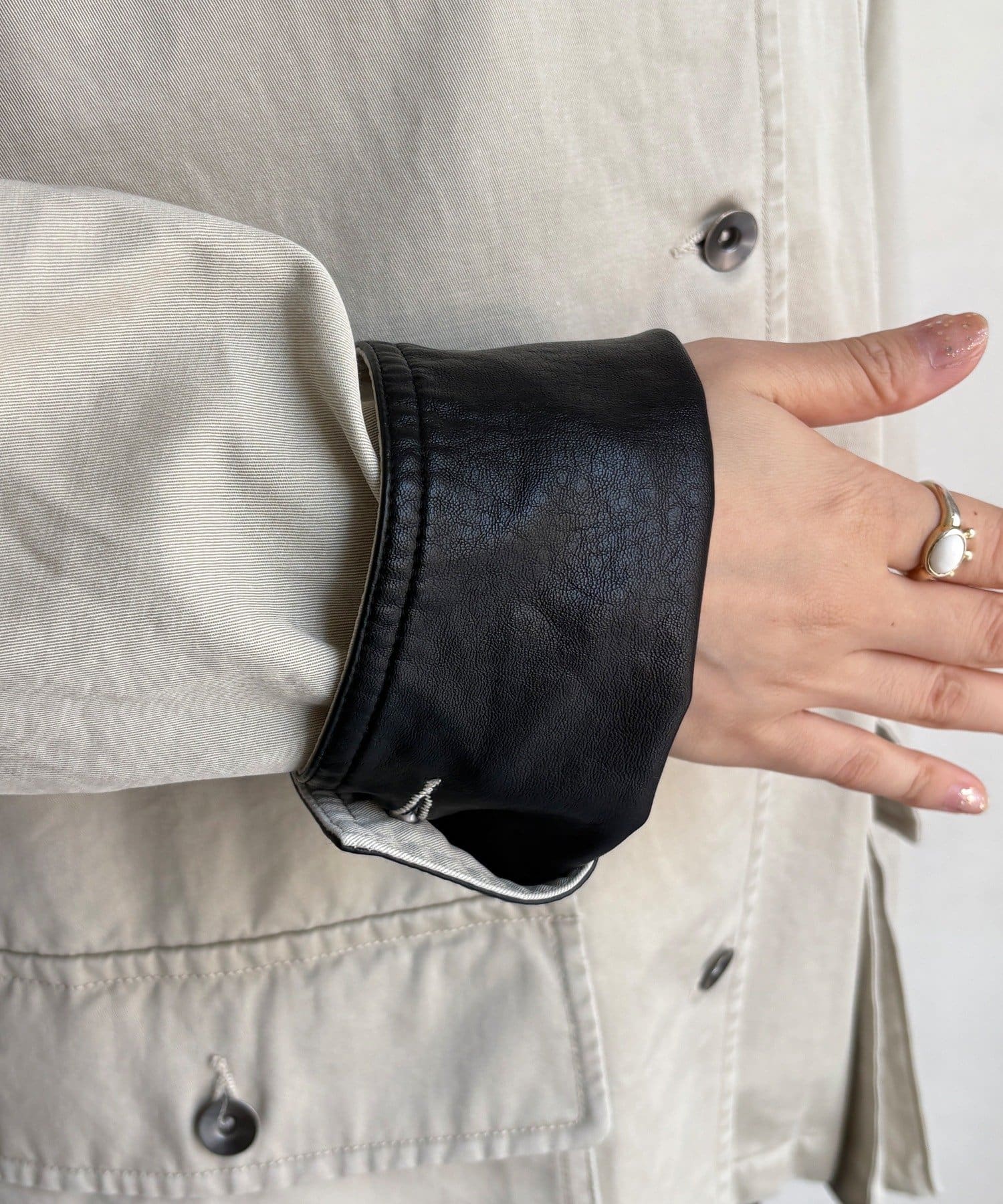 襟・折り返した袖口はフェイクレザーの素材に切り替えることで、ぴりっとアクセントをプラスしてくれます。