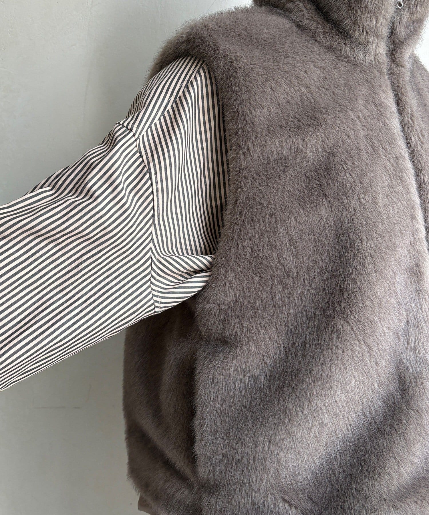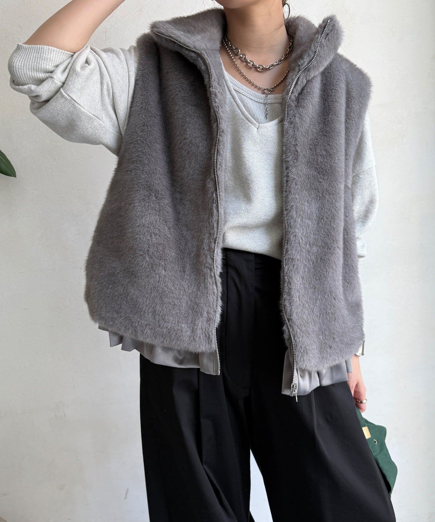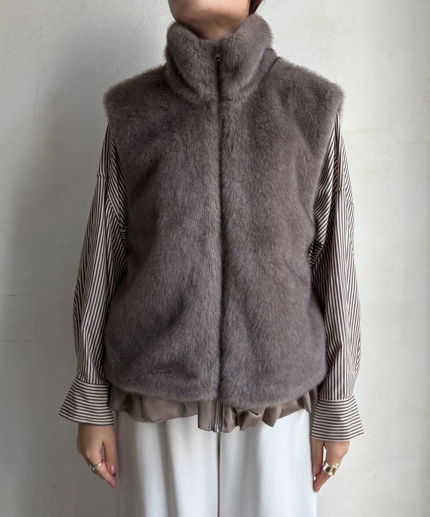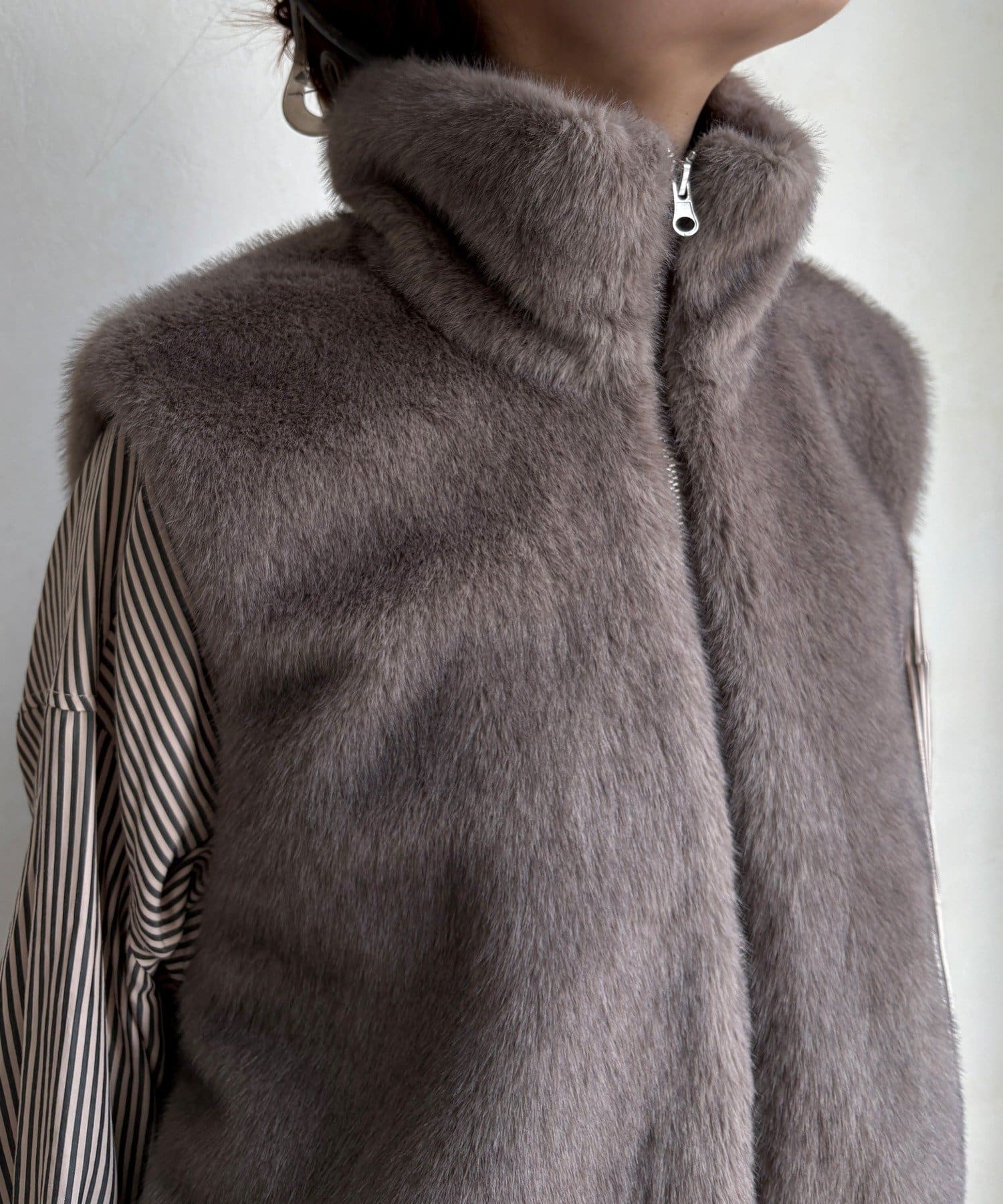 リアルファーのような上質なエコミンクを使用した、ジップアップタイプのファーベスト。