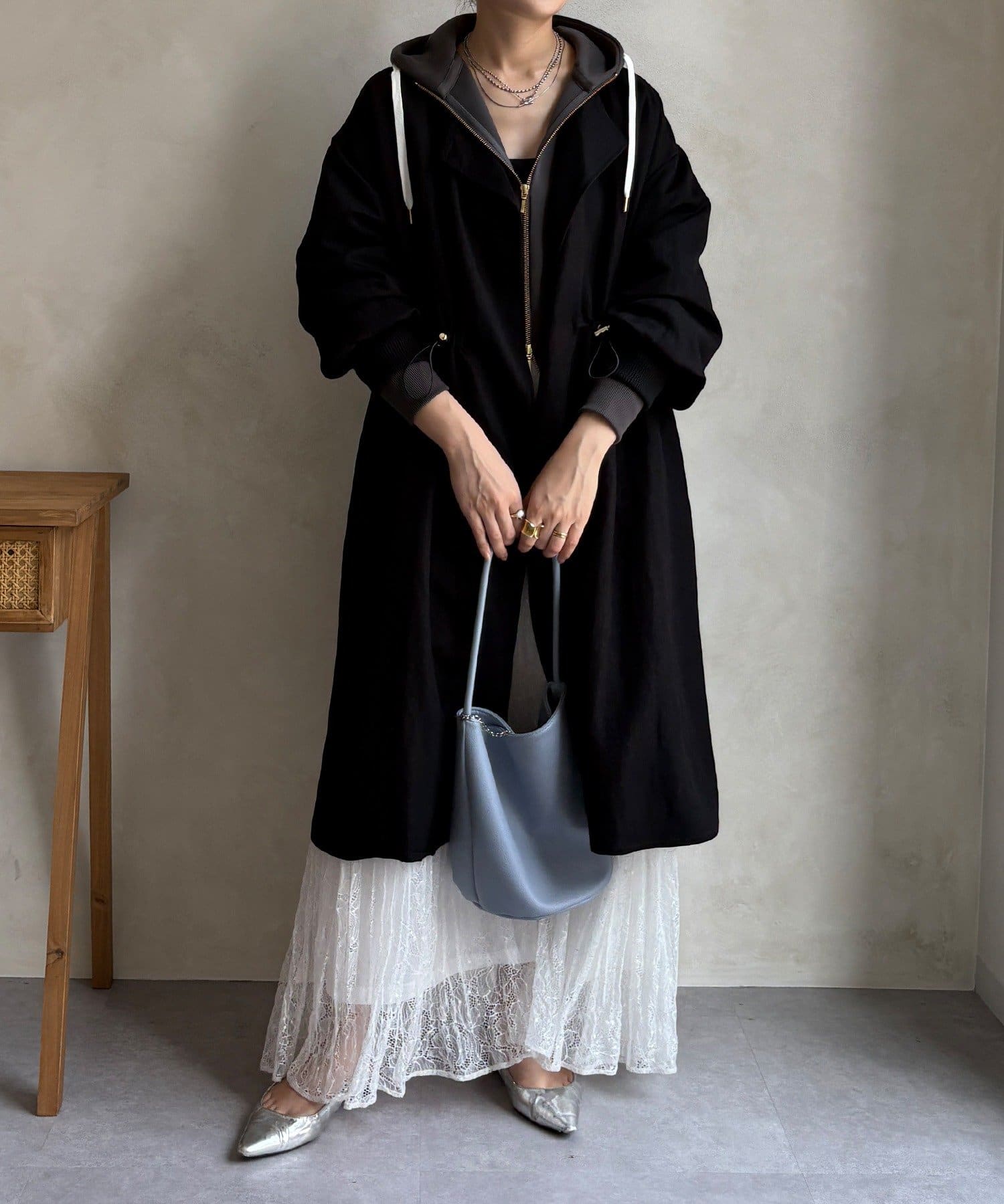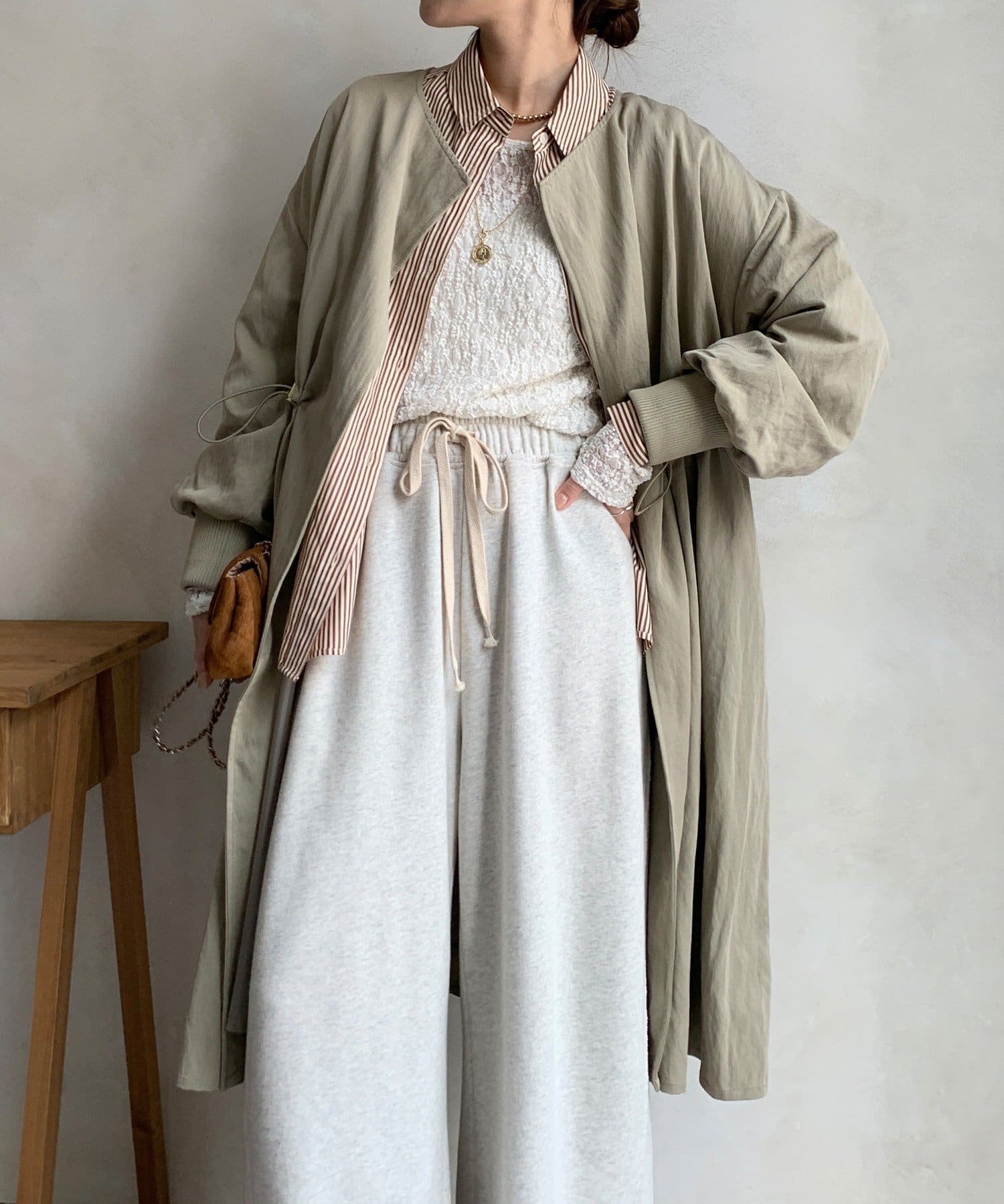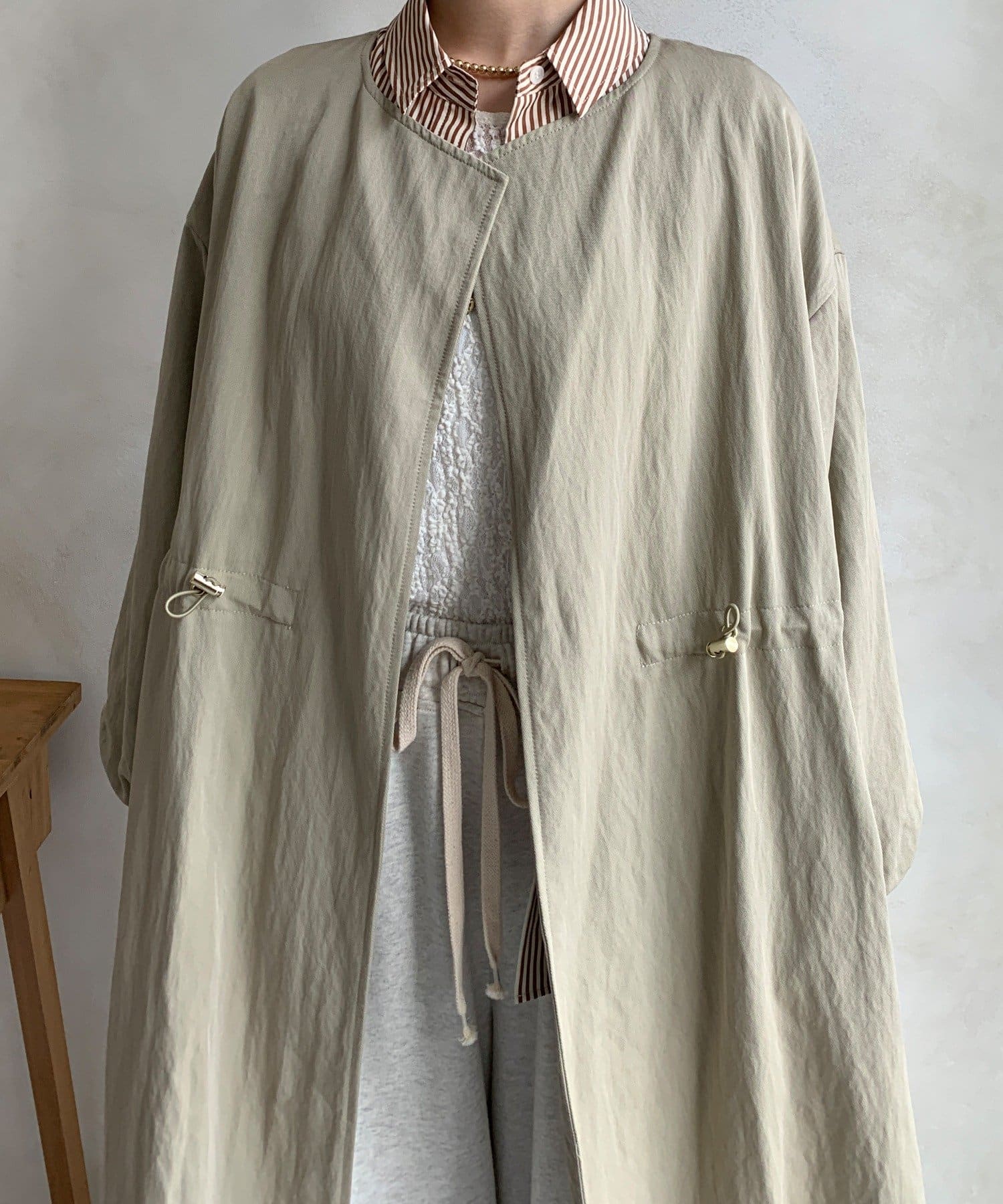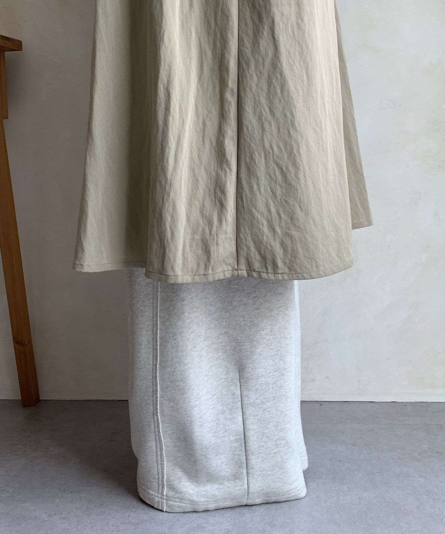 スウェットパンツやスカートなど幅広いスタイルに合わせやすいロングコートです。